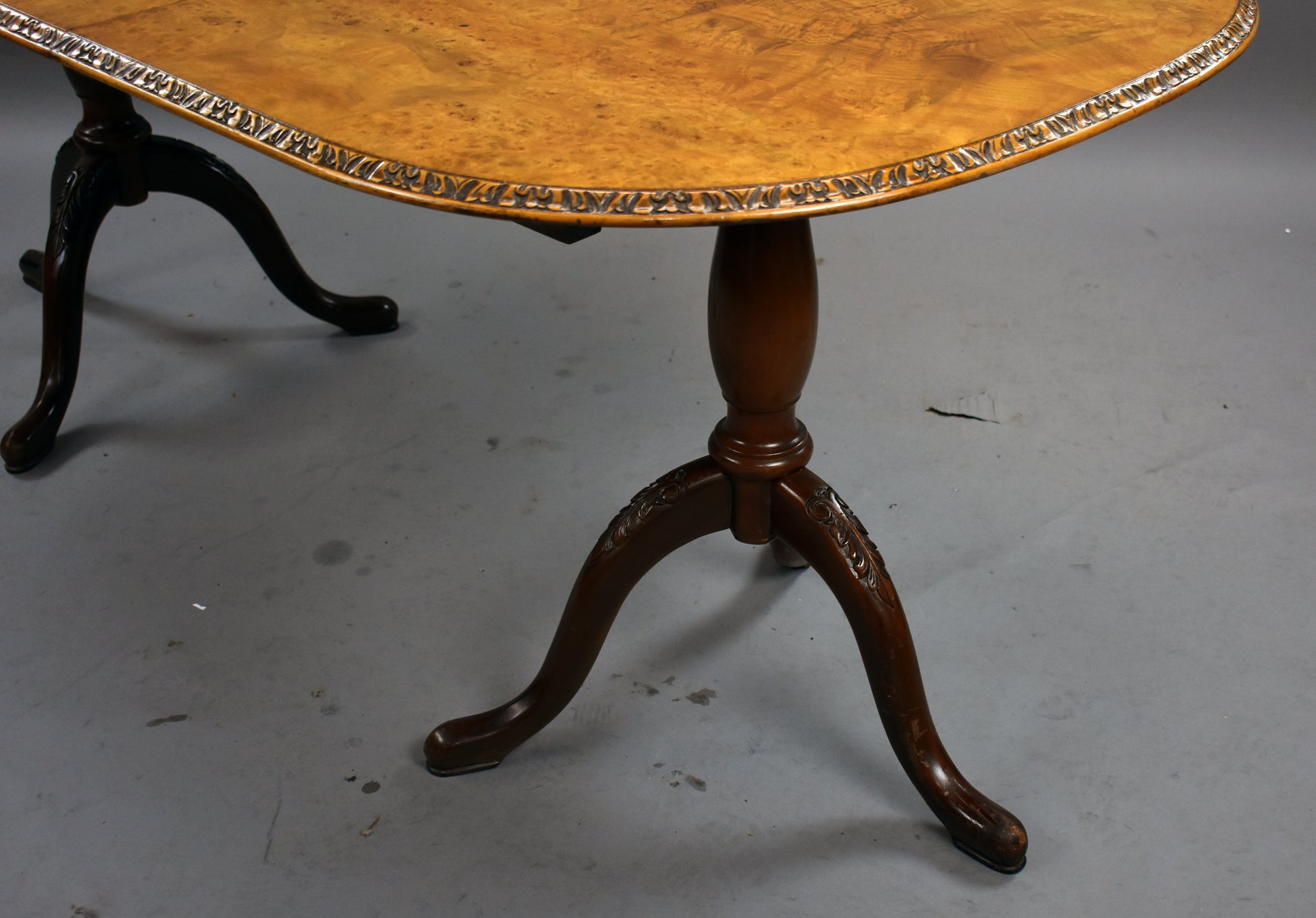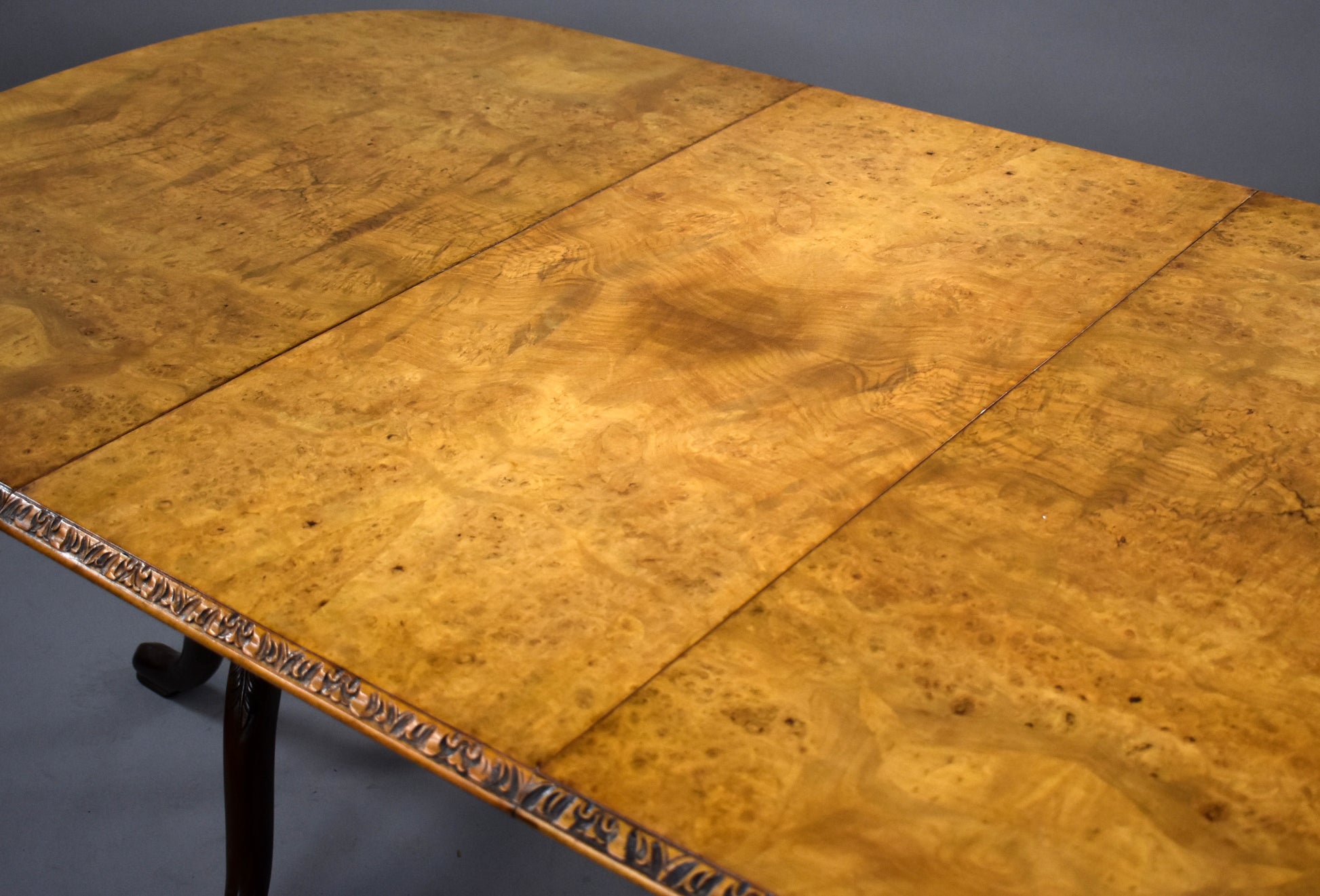 The set features a finely figured walnut finish, carved detailing, and elegant curved legs. The table extends for larger gatherings, while the sideboard offers generous storage with drawers and cupboards fitted with brass handles.