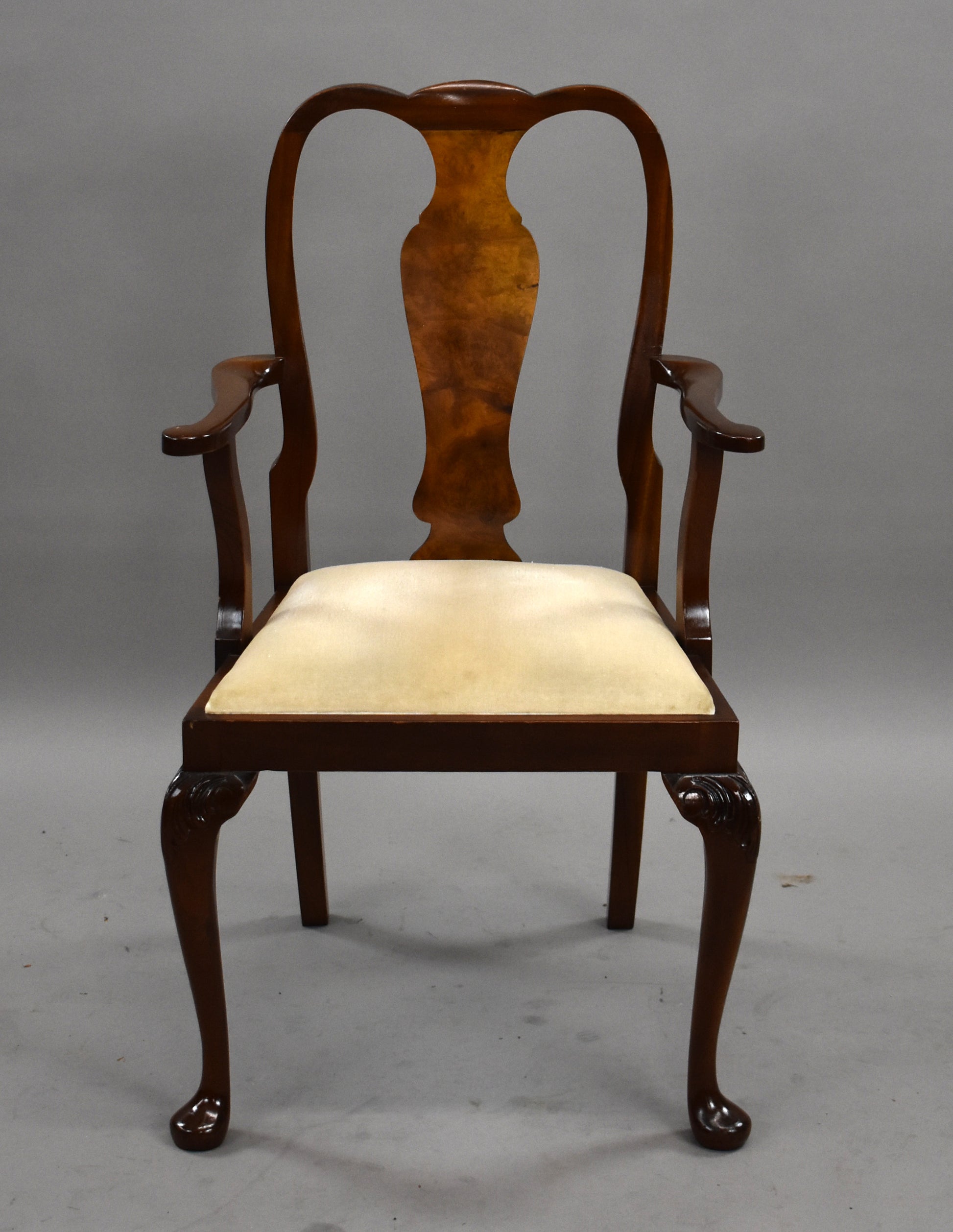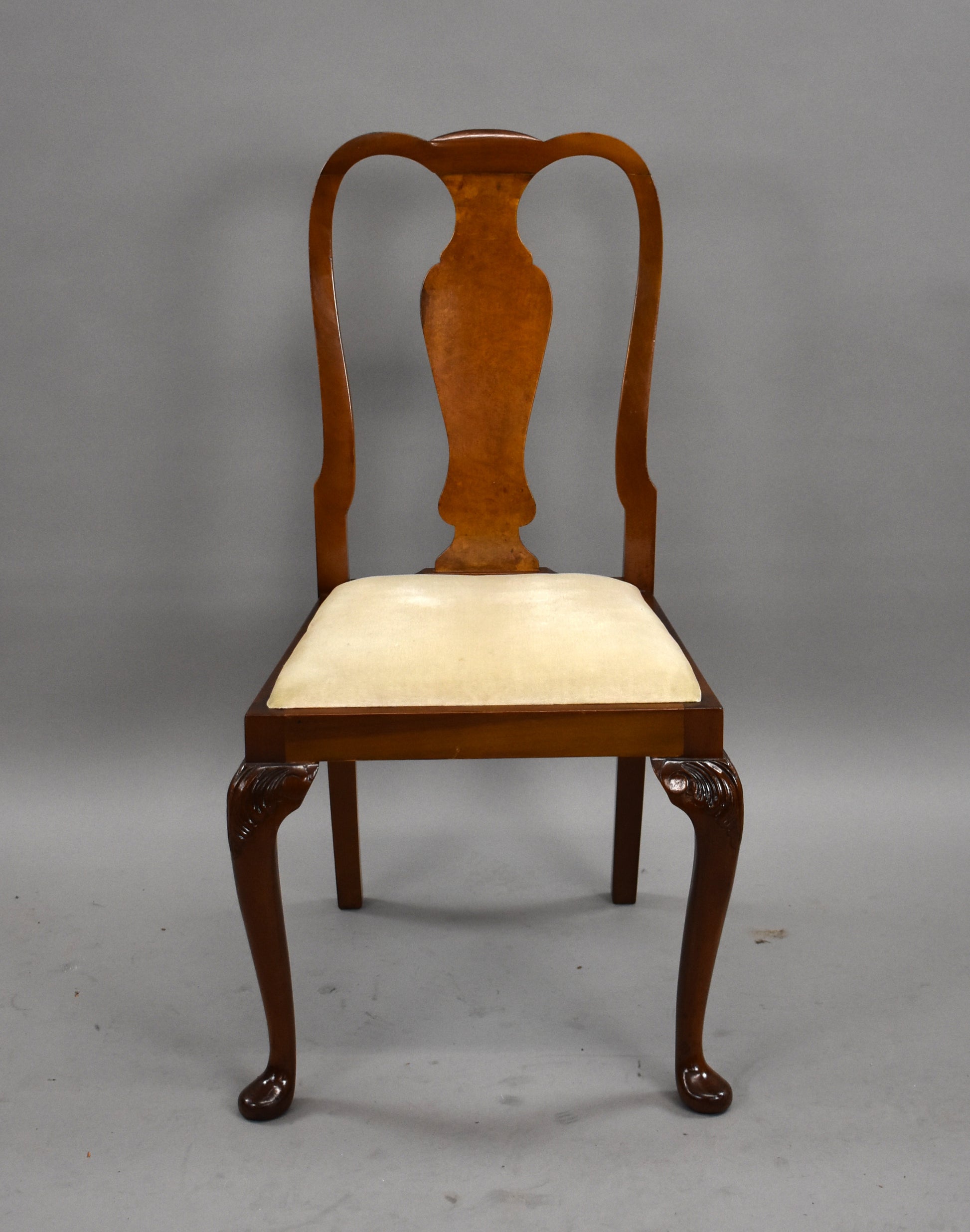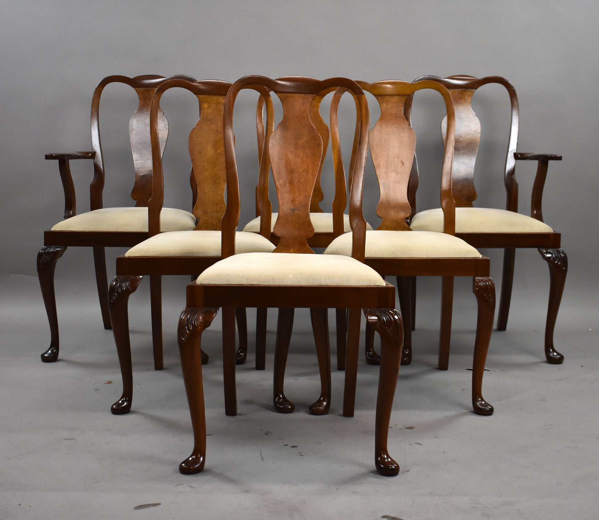 Beautiful 1930s Queen Anne–style walnut dining suite comprising an extending table with one leaf, six matching upholstered chairs, and a coordinating sideboard.