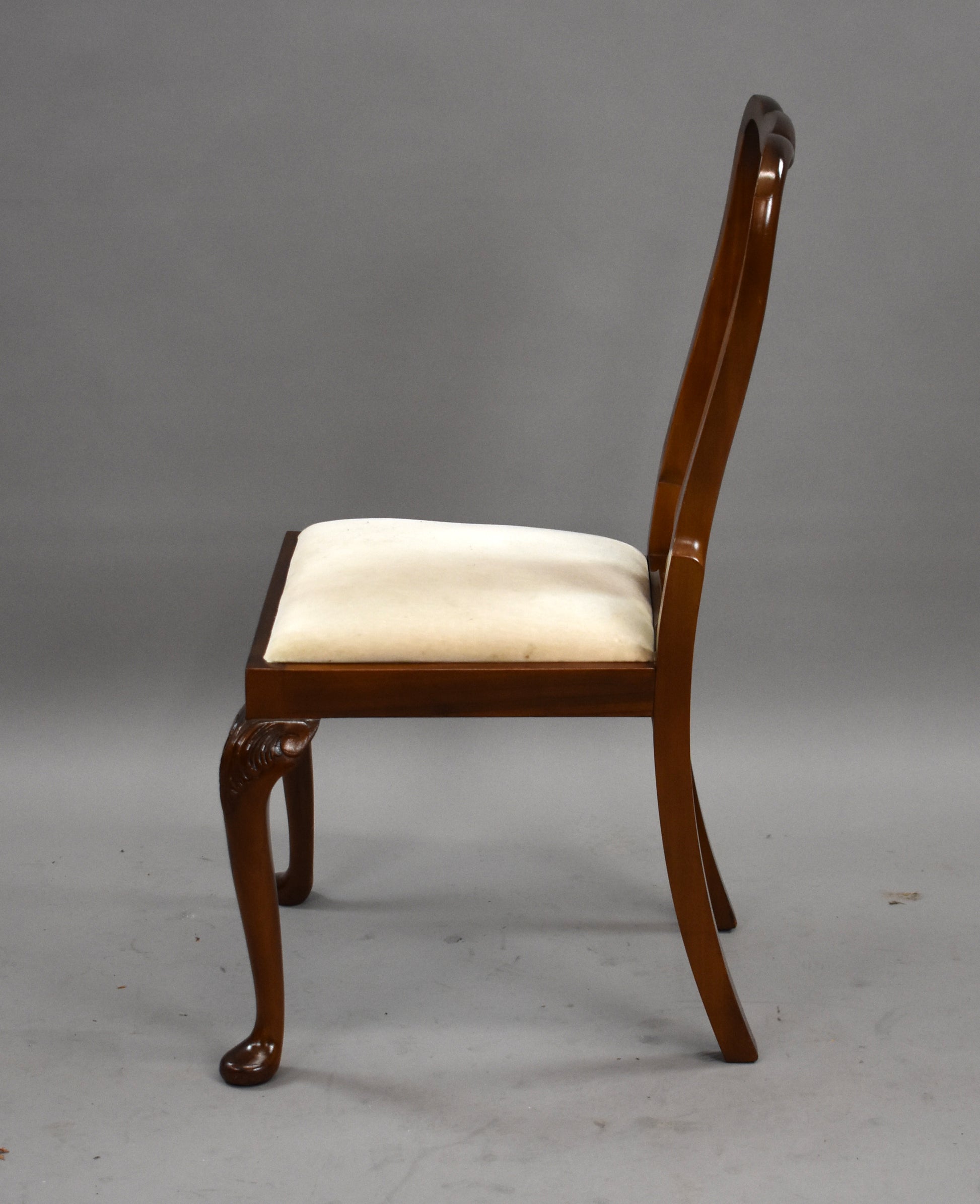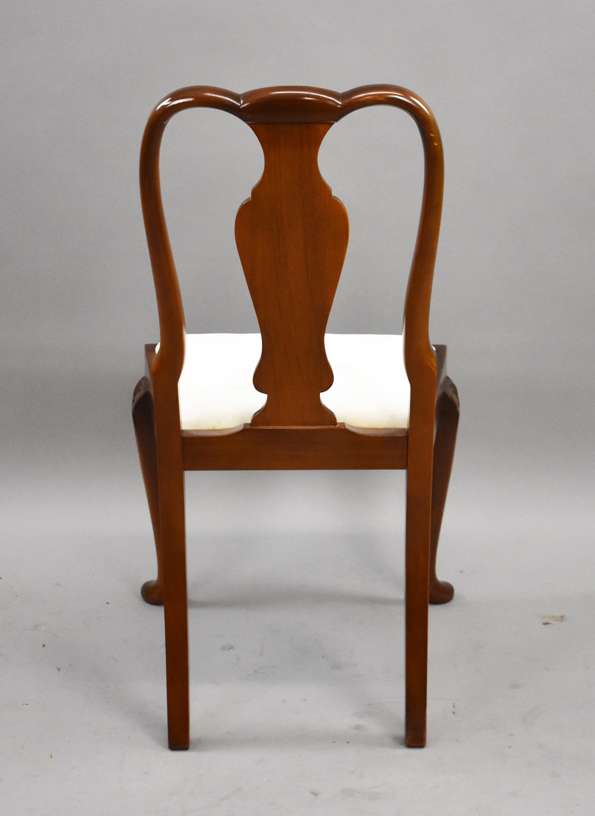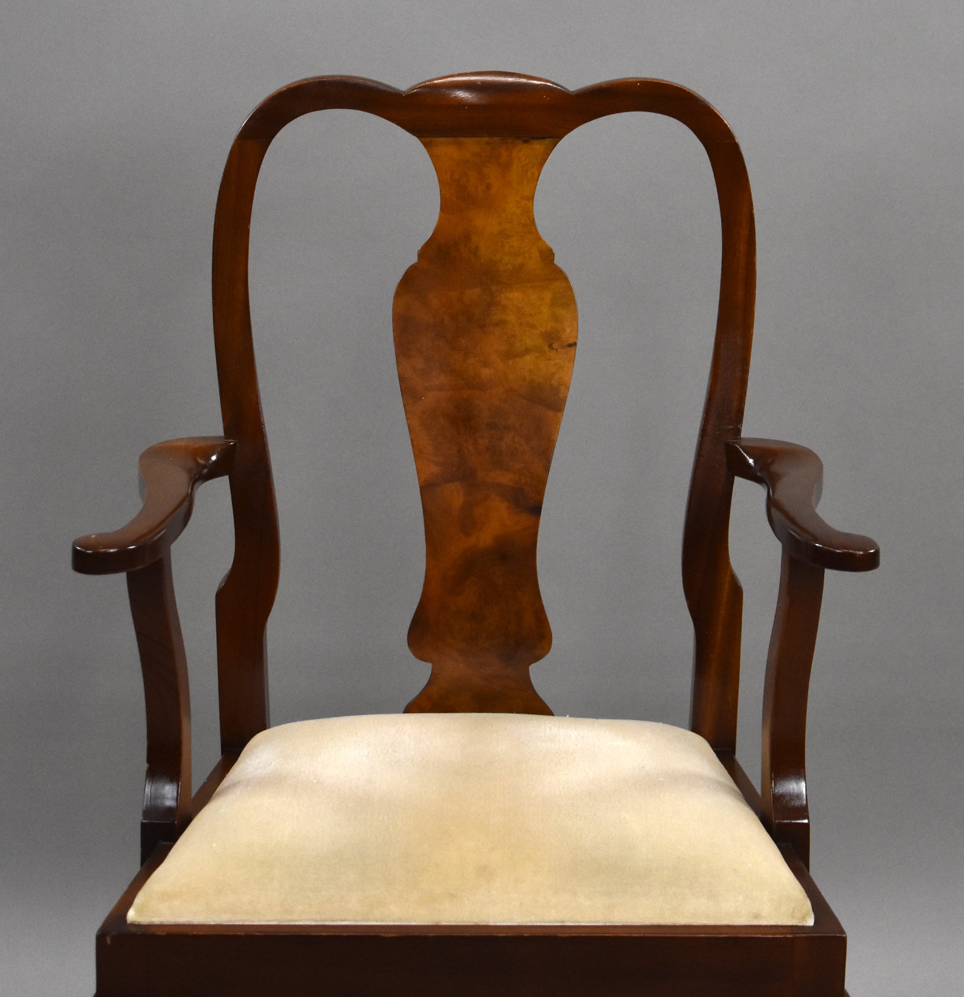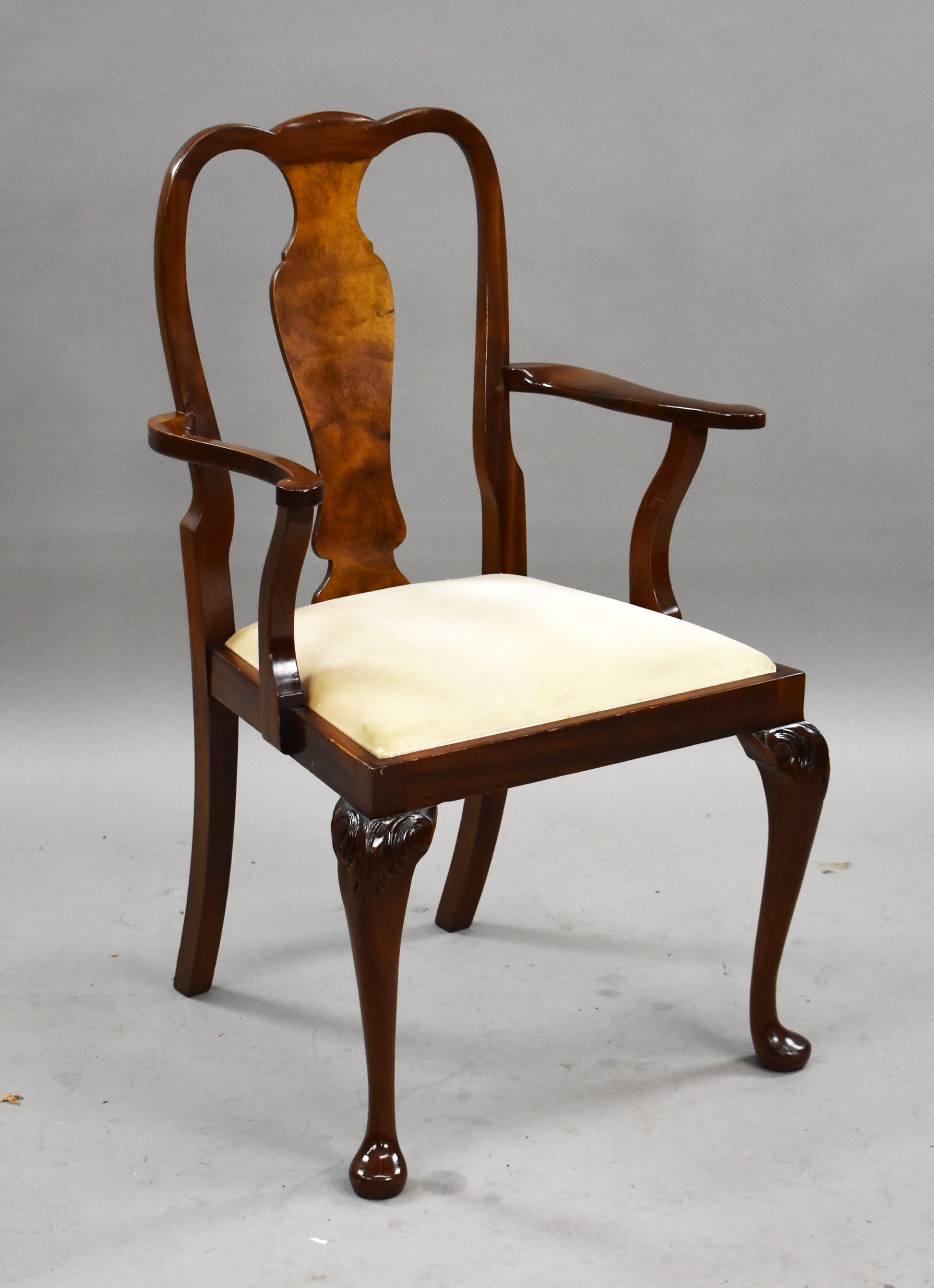 Beautiful 1930s Queen Anne–style walnut dining suite comprising an extending table with one leaf, six matching upholstered chairs, and a coordinating sideboard.