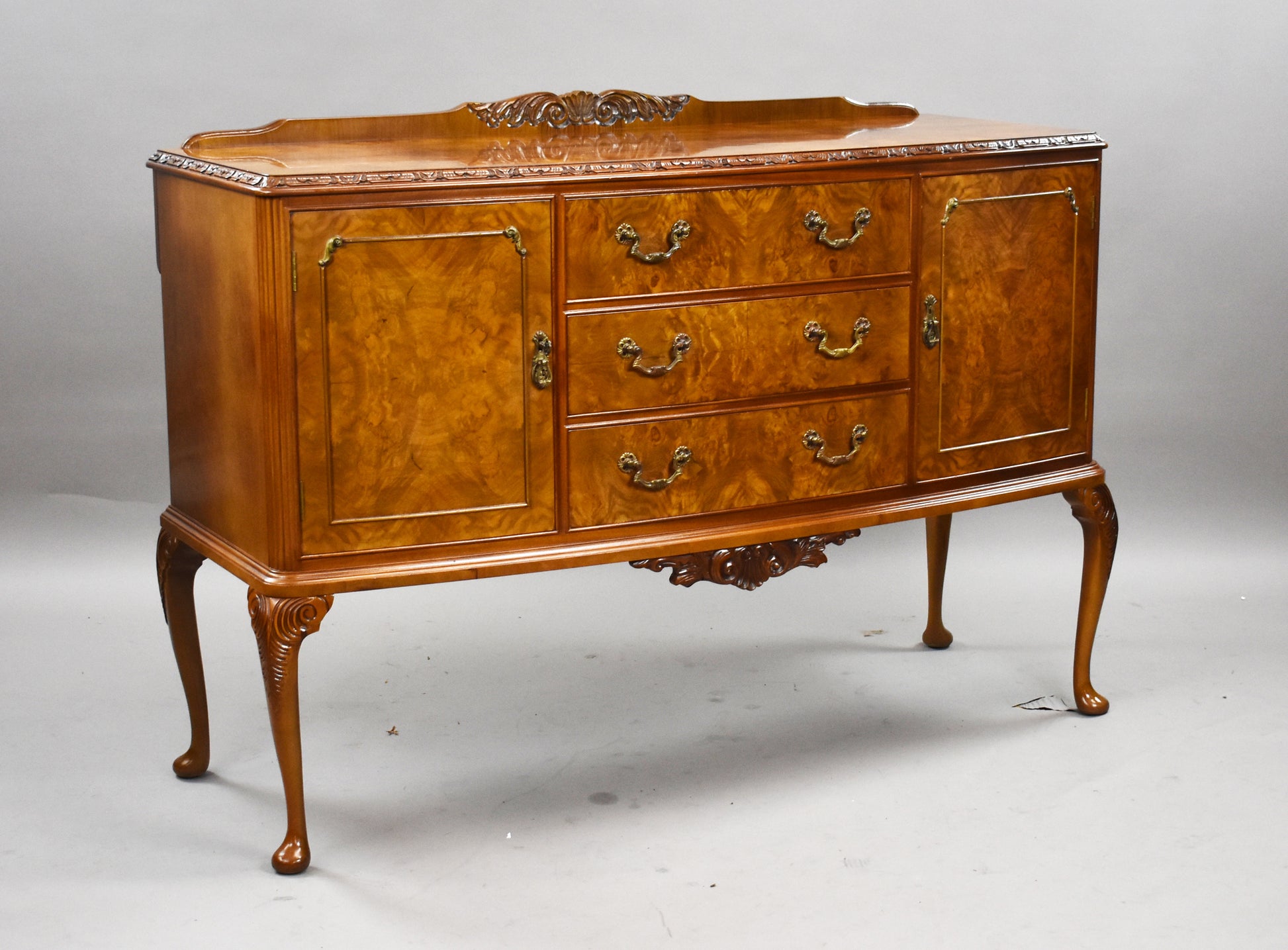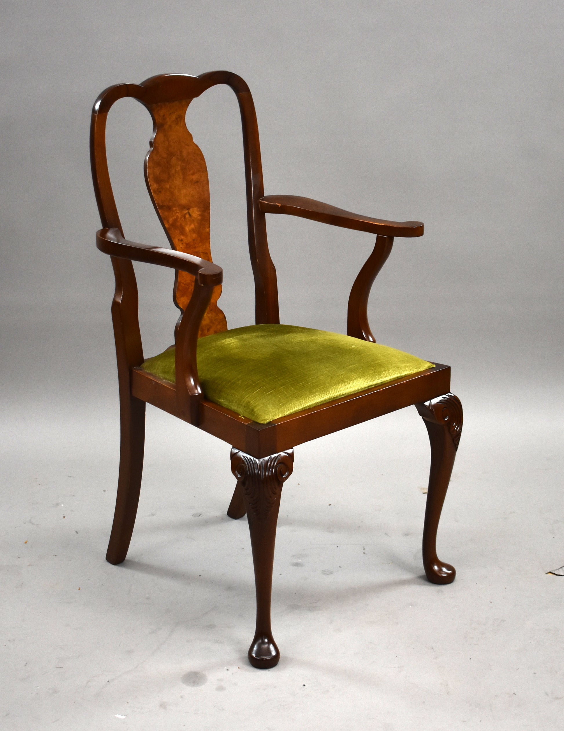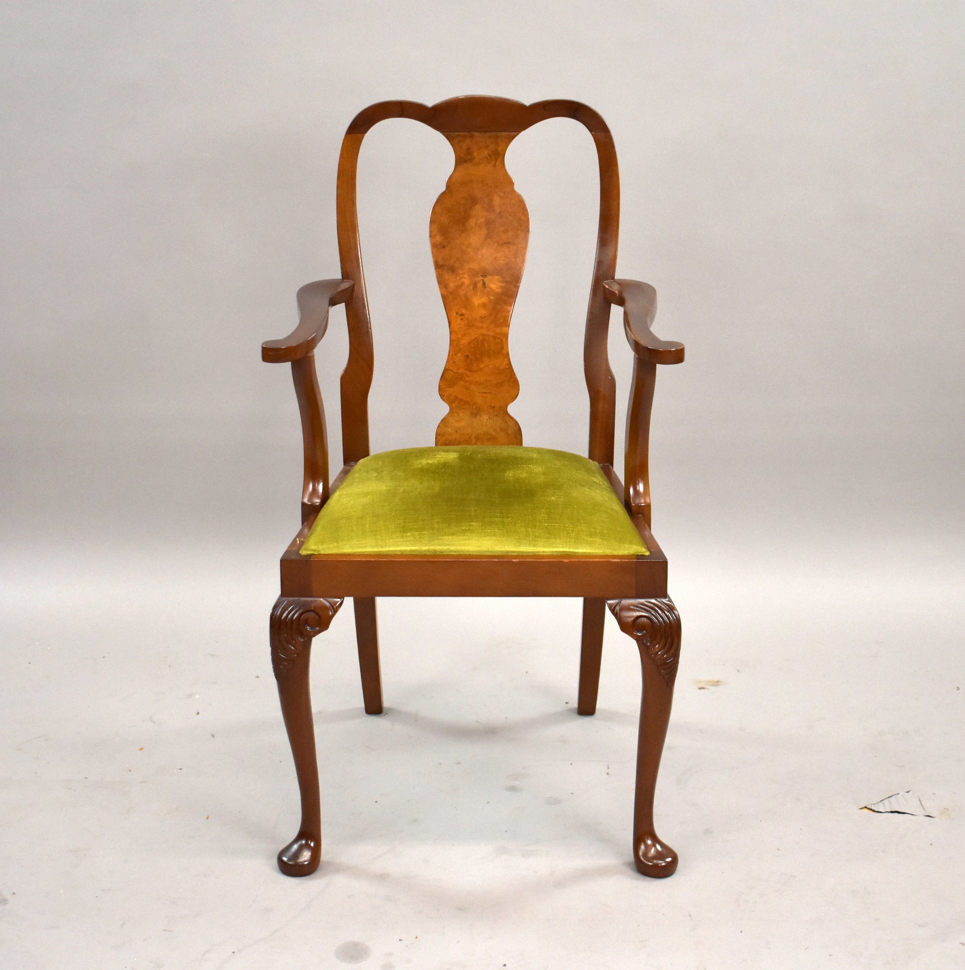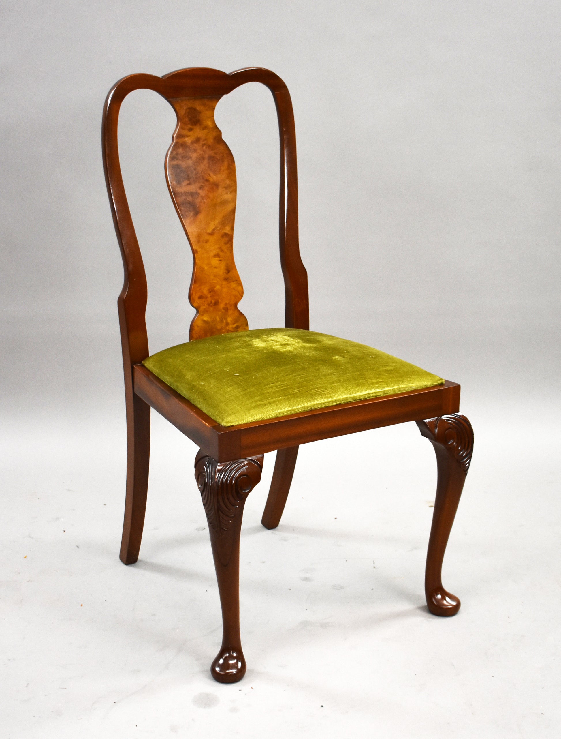 The set features beautifully figured walnut veneers, carved detailing, and Queen Anne–style cabriole legs. The chairs are upholstered in a fresh light green fabric, adding a stylish contrast to the warm walnut tones. The sideboard offers ample storage with two cupboards and three drawers, complete with brass handles.