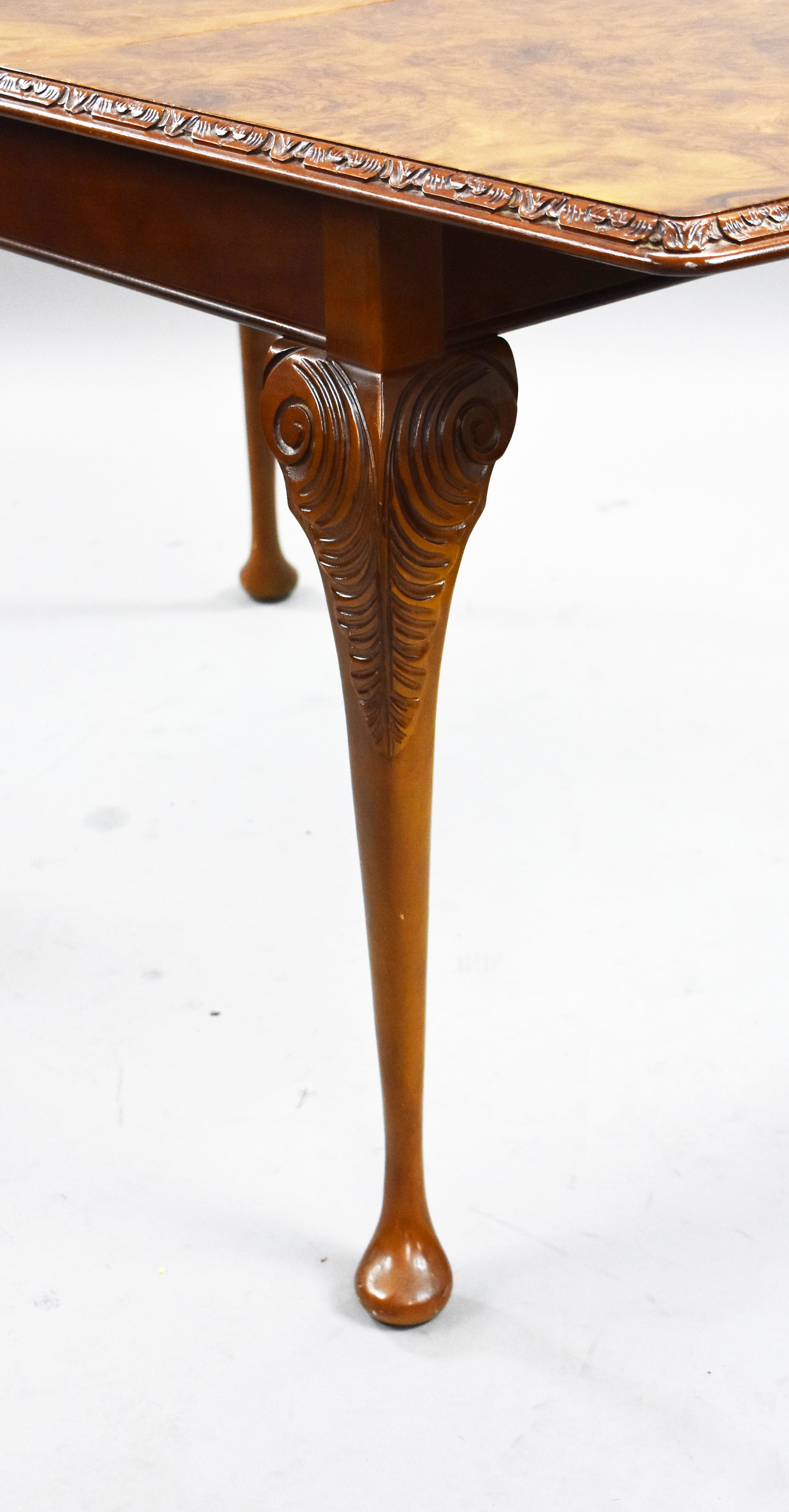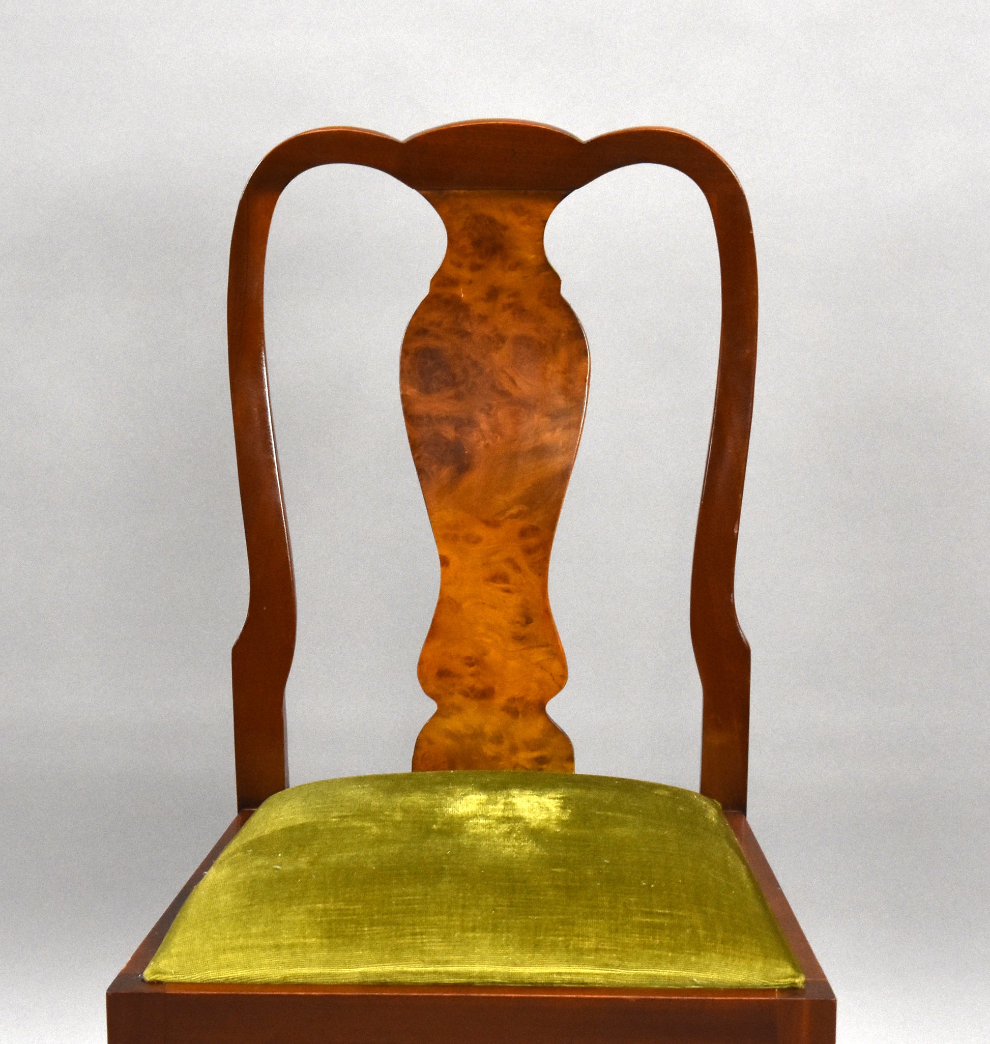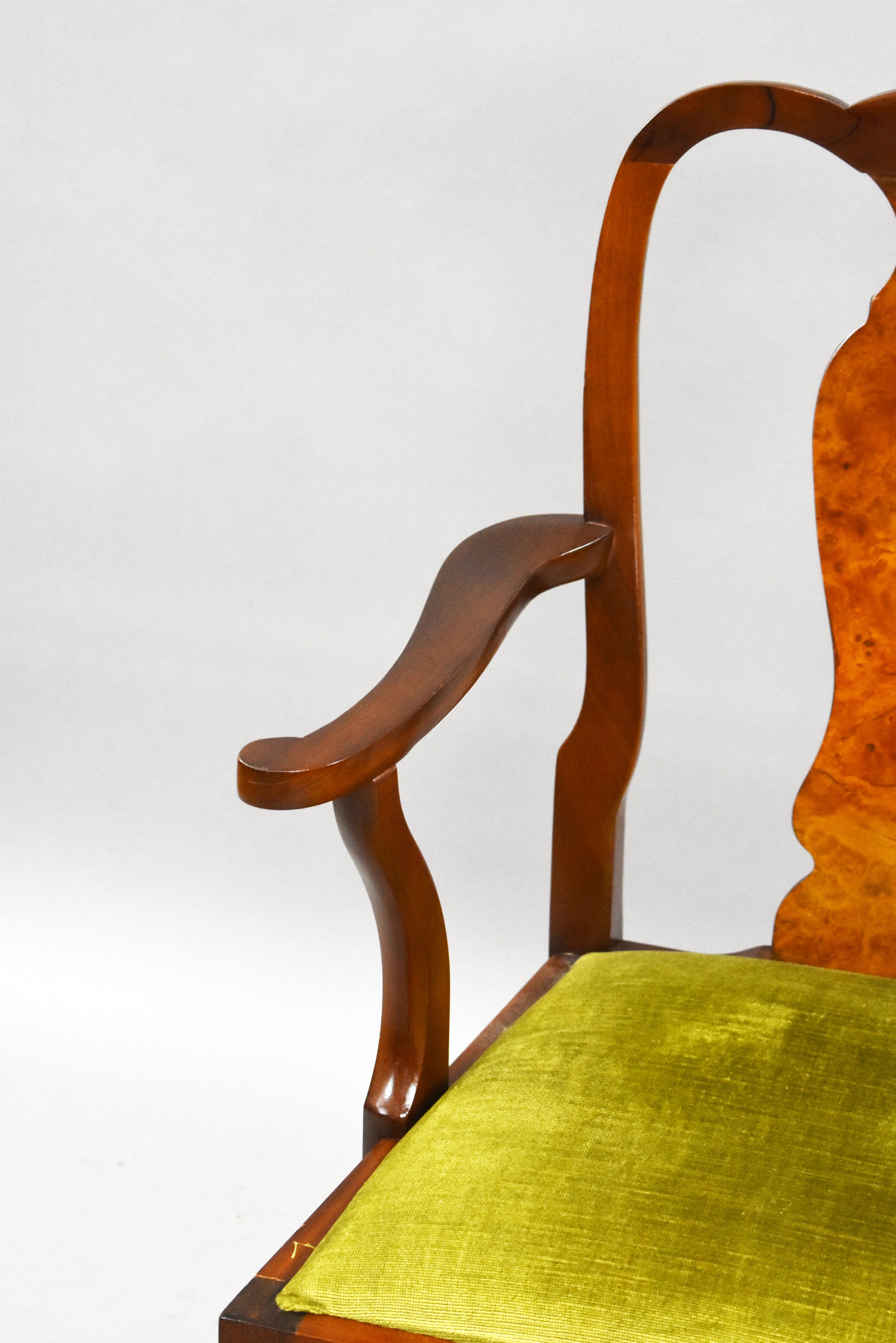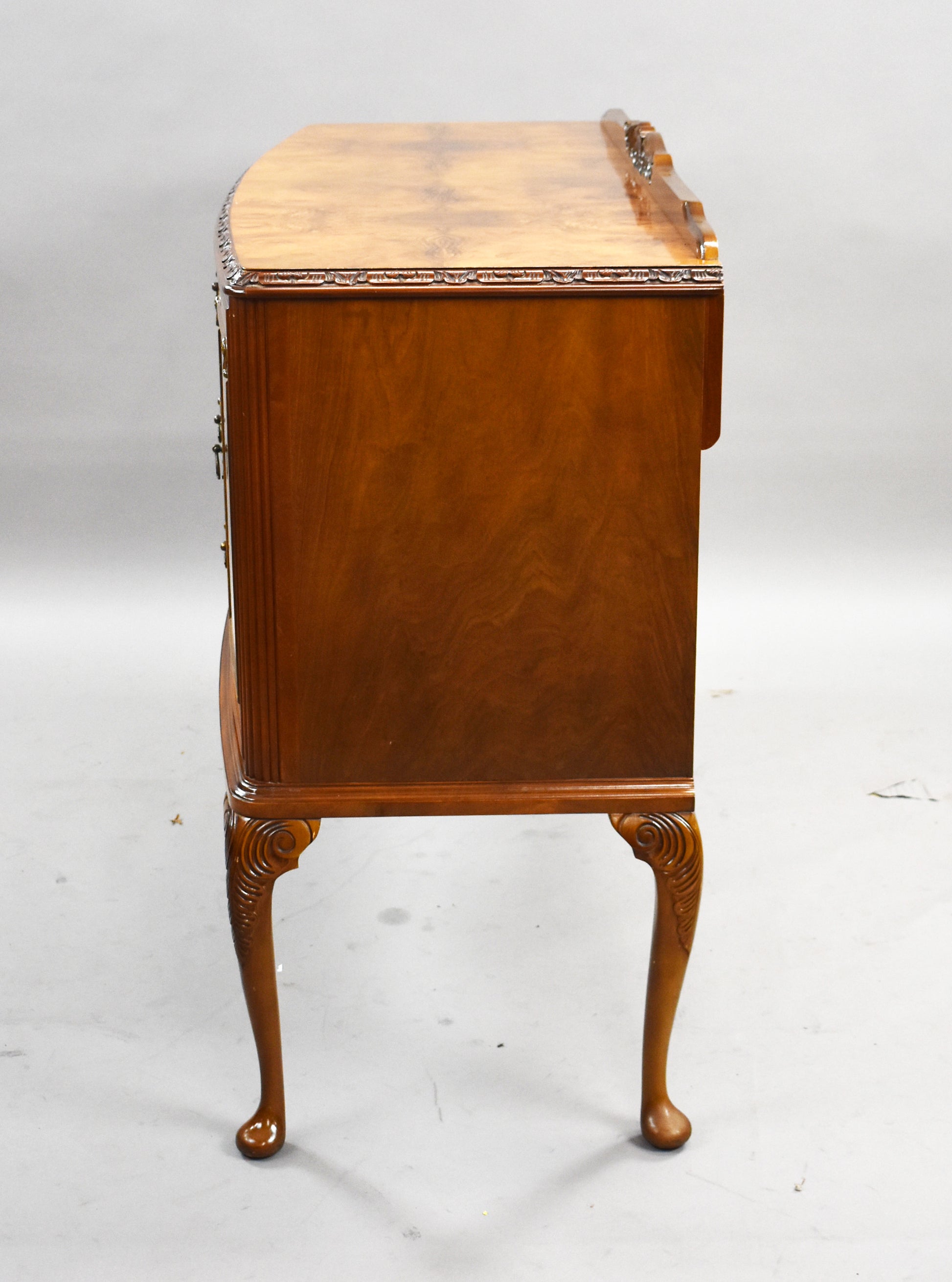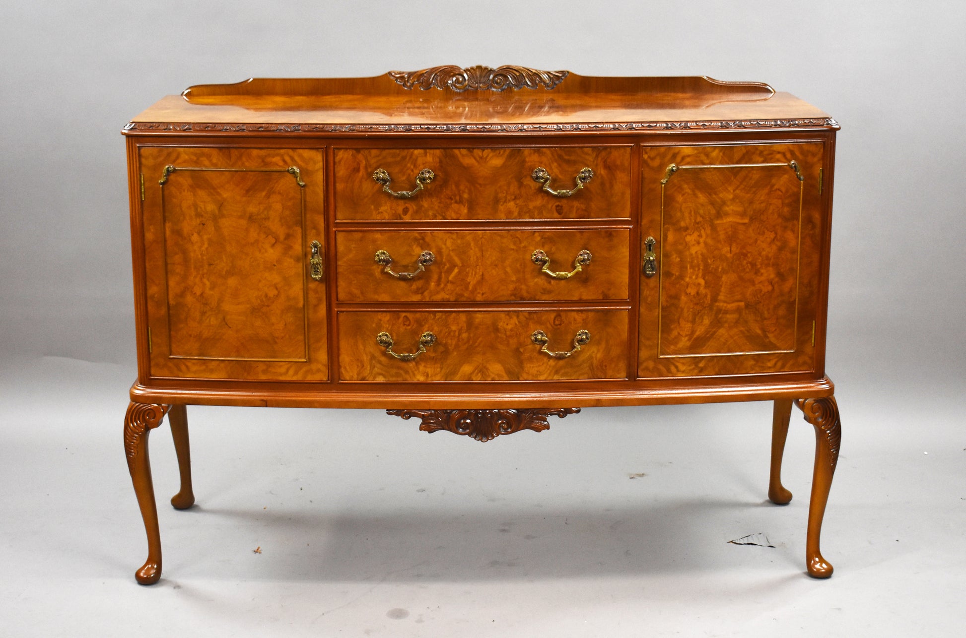 The set features beautifully figured walnut veneers, carved detailing, and Queen Anne–style cabriole legs. The chairs are upholstered in a fresh light green fabric, adding a stylish contrast to the warm walnut tones. The sideboard offers ample storage with two cupboards and three drawers, complete with brass handles.
