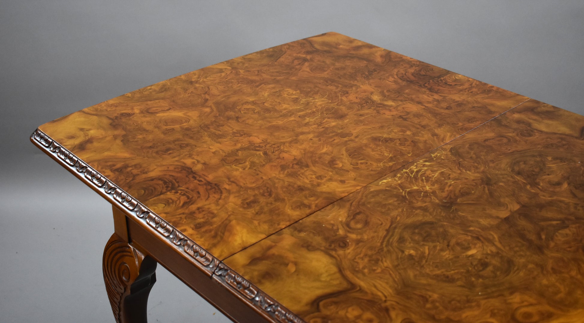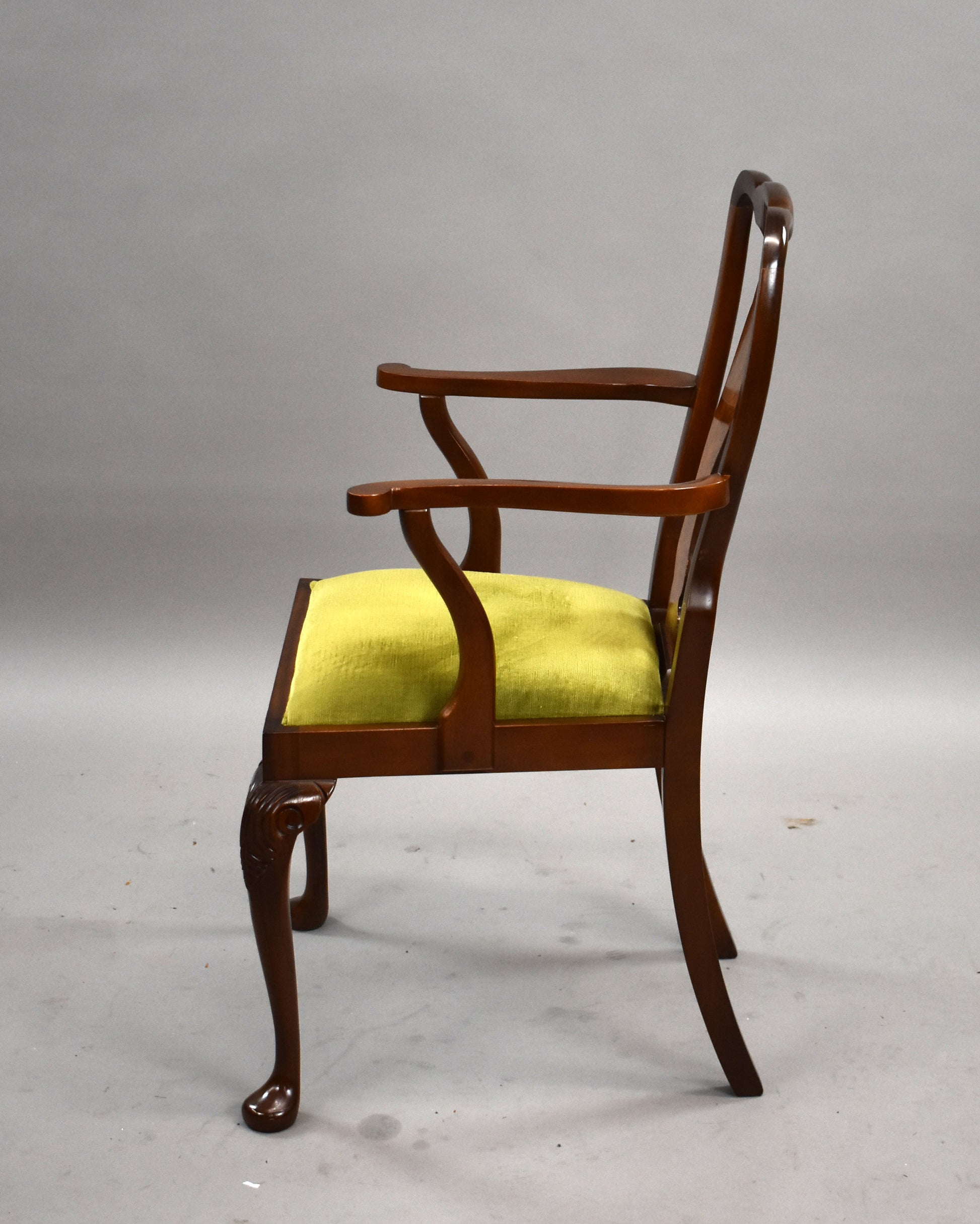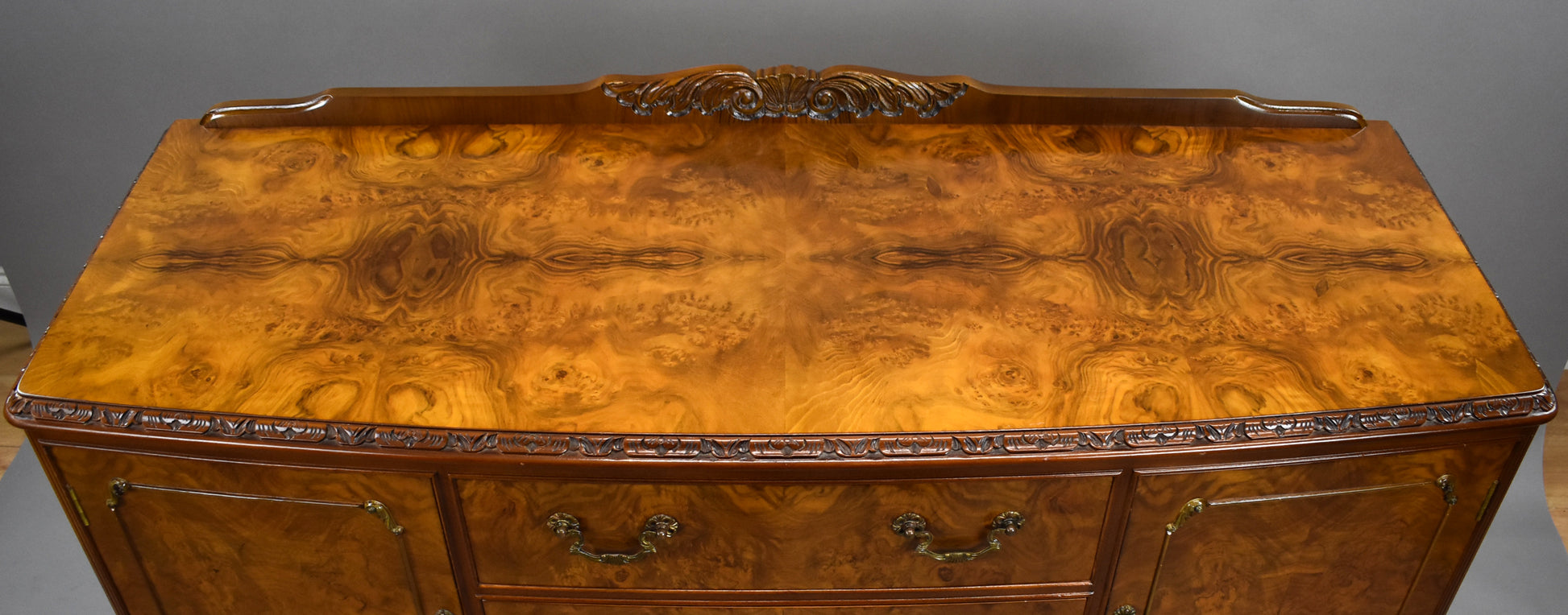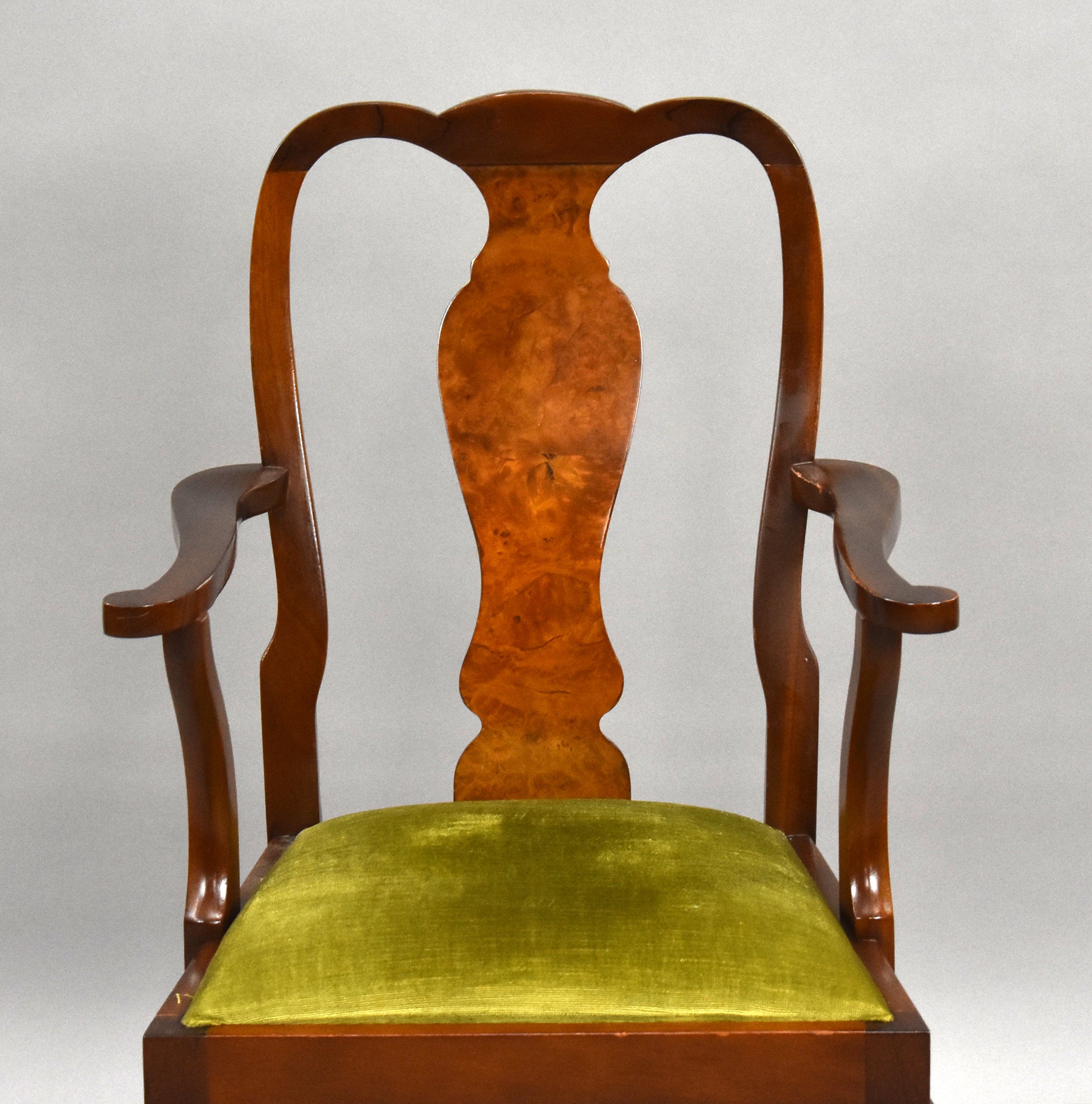 The set features beautifully figured walnut veneers, carved detailing, and Queen Anne–style cabriole legs. The chairs are upholstered in a fresh light green fabric, adding a stylish contrast to the warm walnut tones. The sideboard offers ample storage with two cupboards and three drawers, complete with brass handles.
