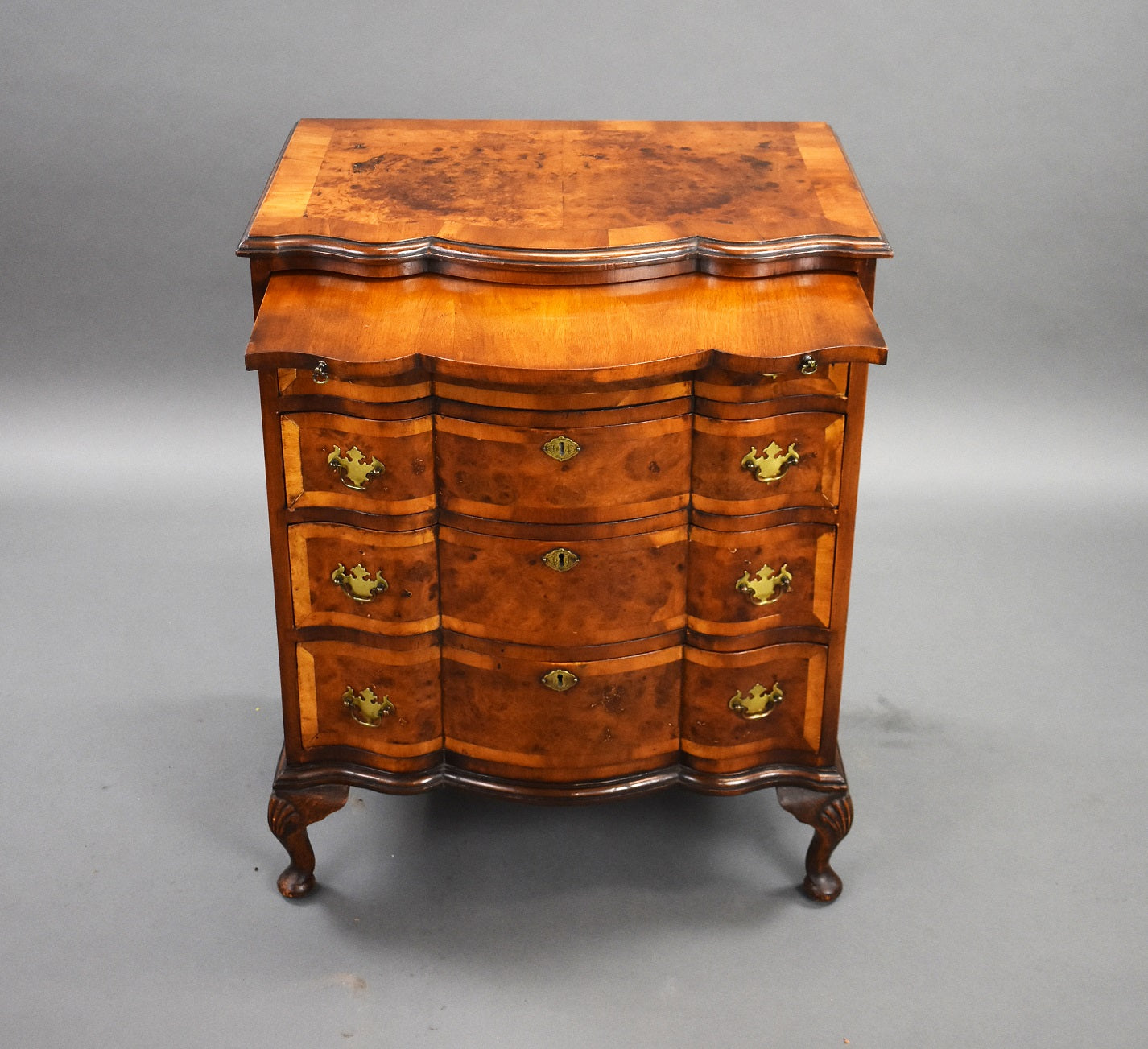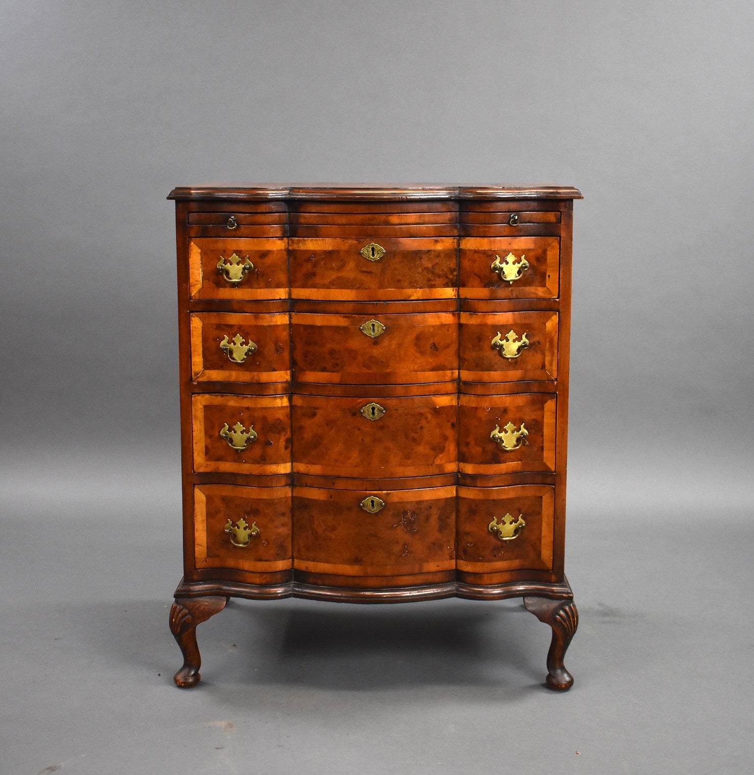 Antique burr walnut batchelors chest drawers in good condition with writing slide above four drawers with brass handles and escucheons, all drawers are oak lined and stands on small elegant cabriole legs.