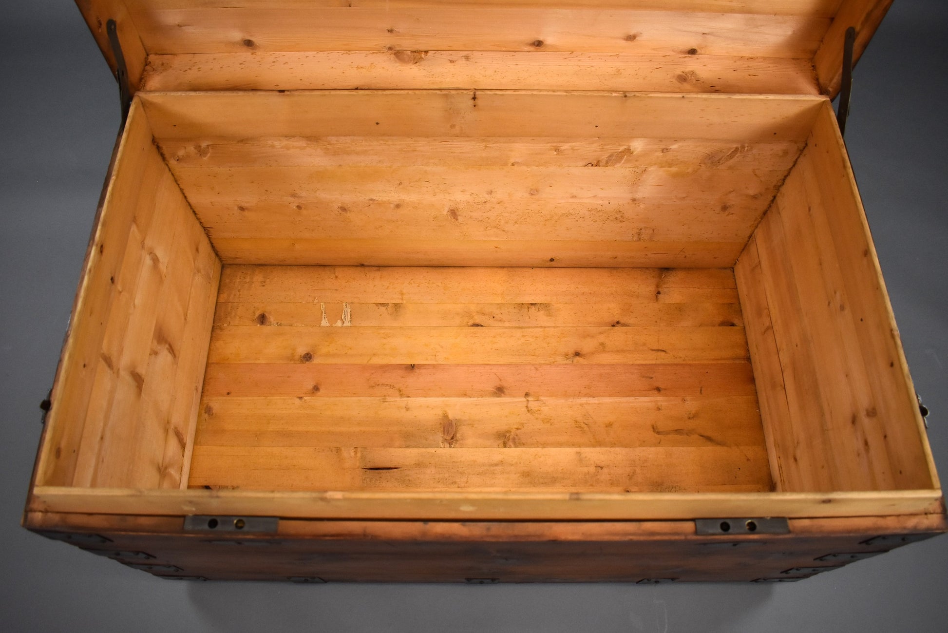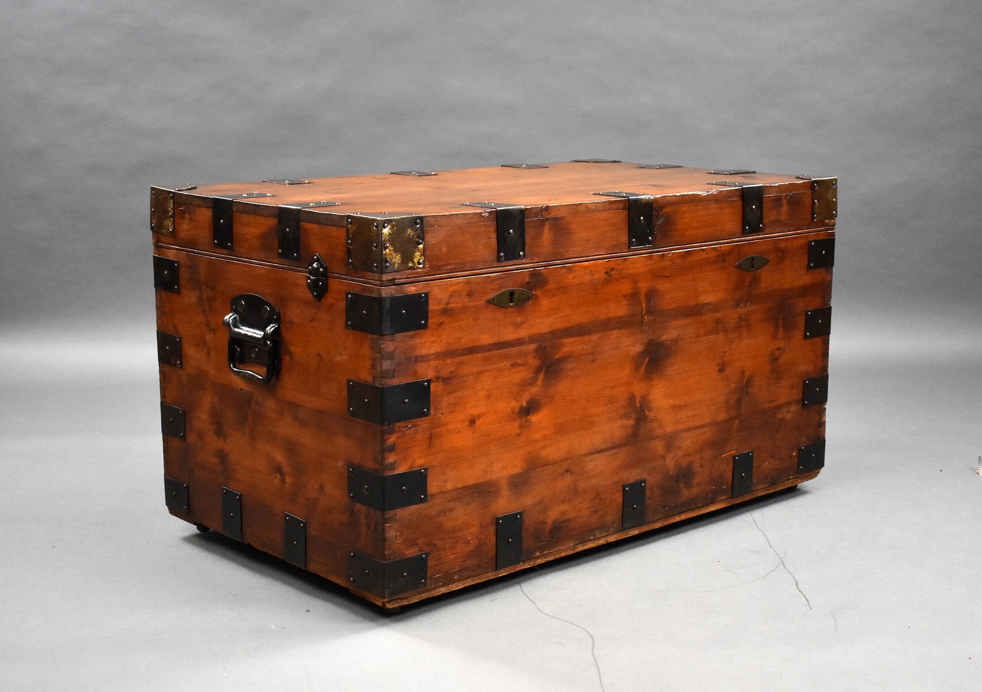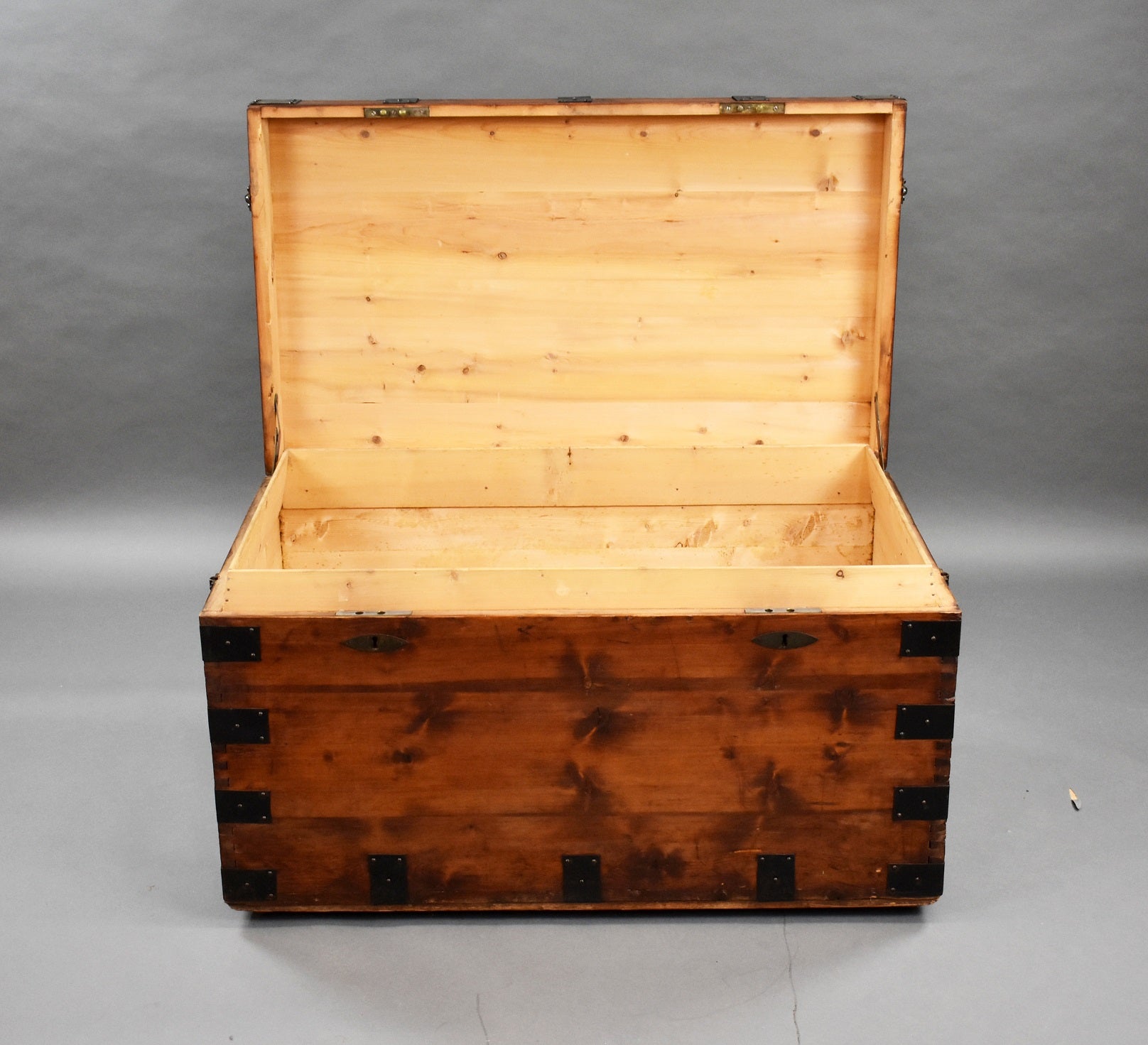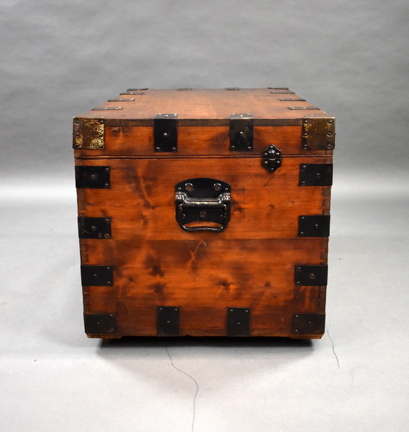 Antique iron bound pine trunk in good condition with carrying handles either side.
