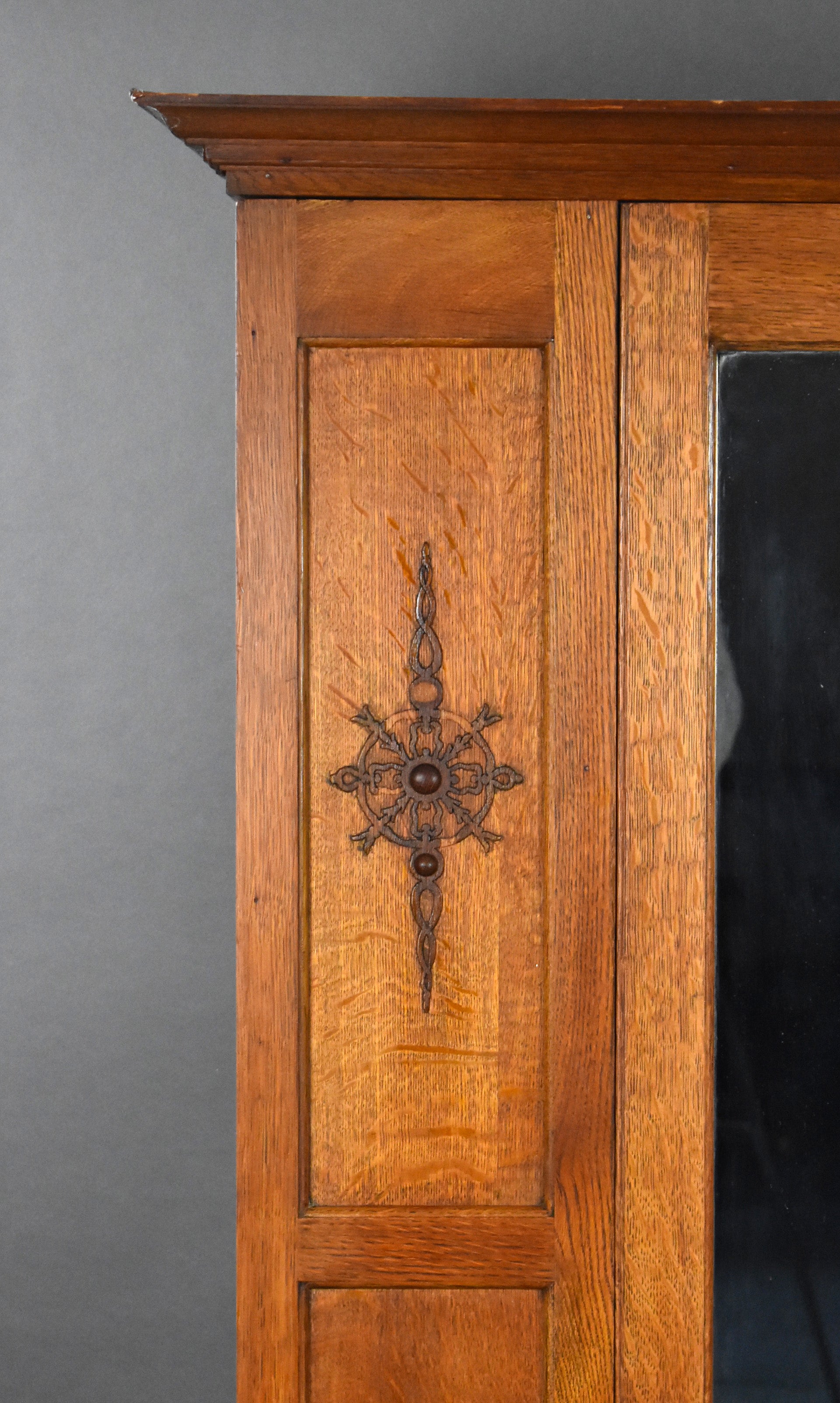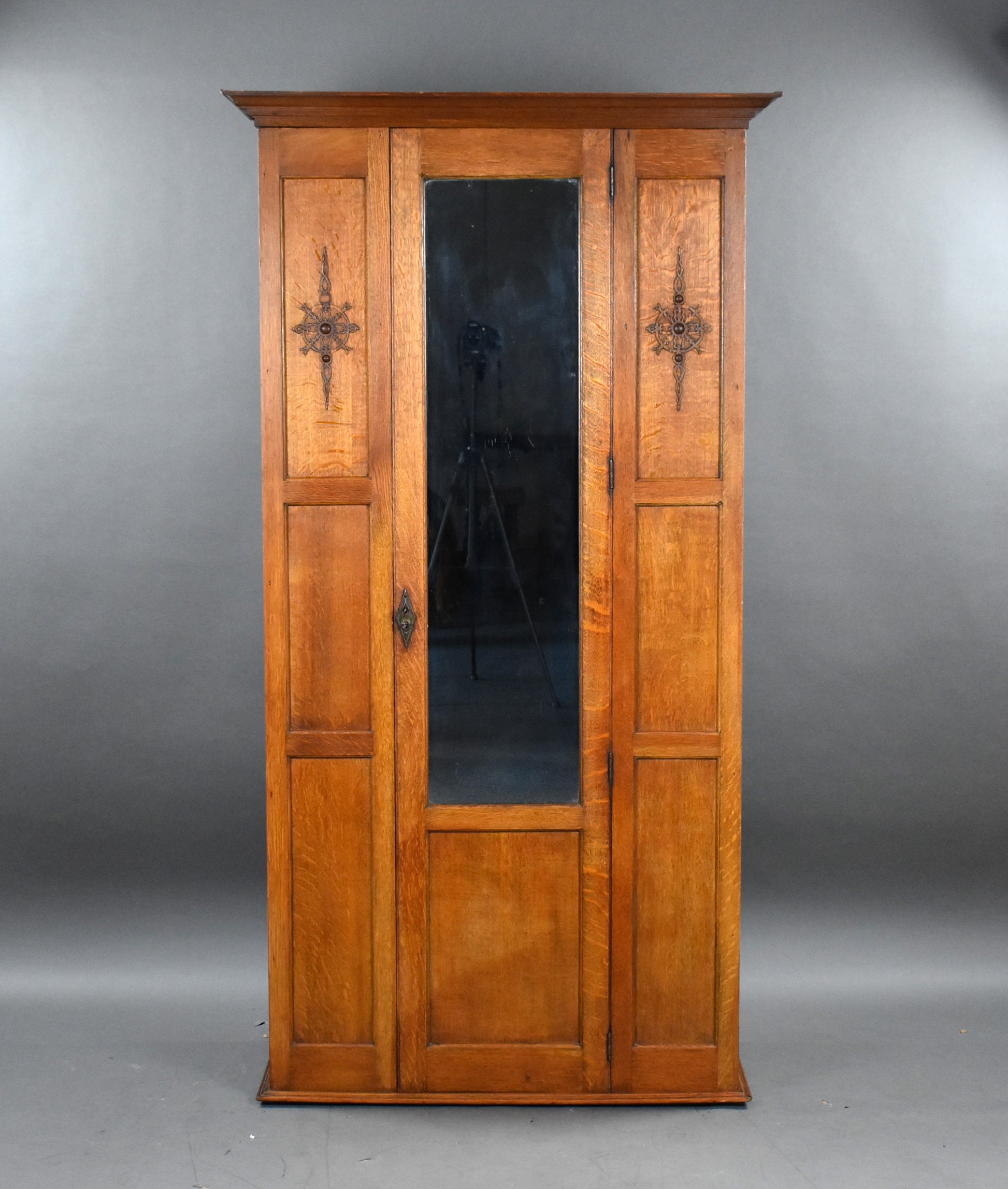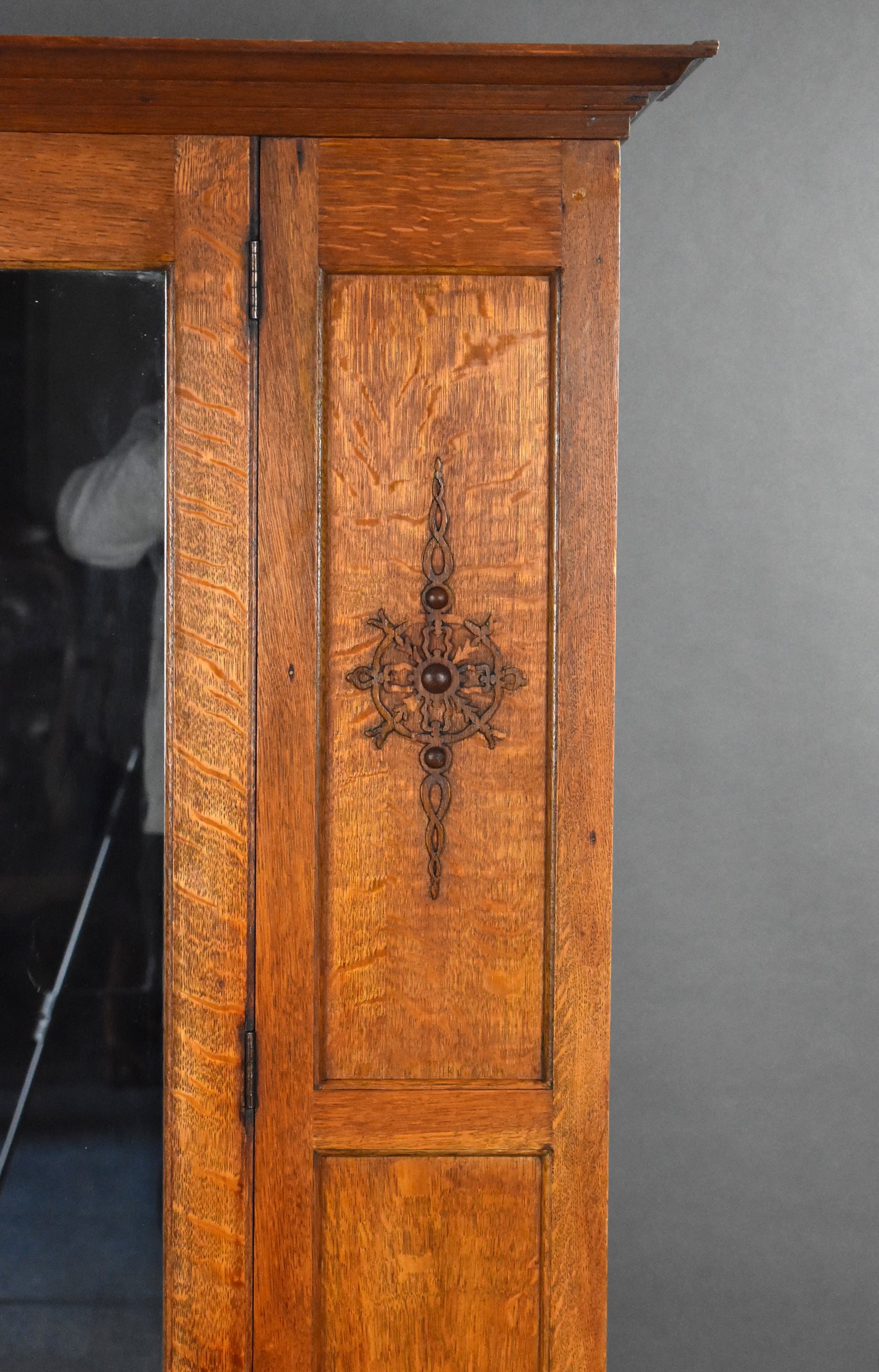 For sale is an antique oak wardrobe, having a flared cornice, above a single door, opening to hanging space, flanked by applied carvings on either side. The wardrobe remains in good condition for its age, having some minor losses to the applied carving.