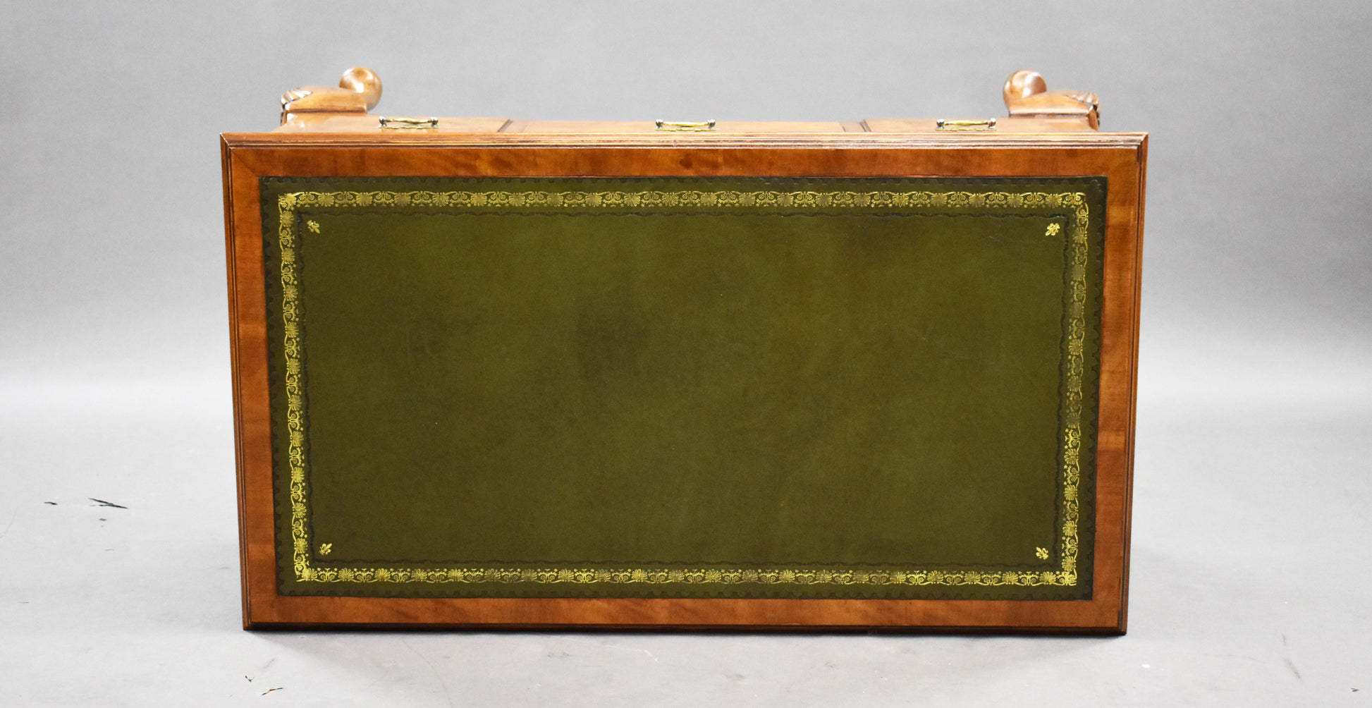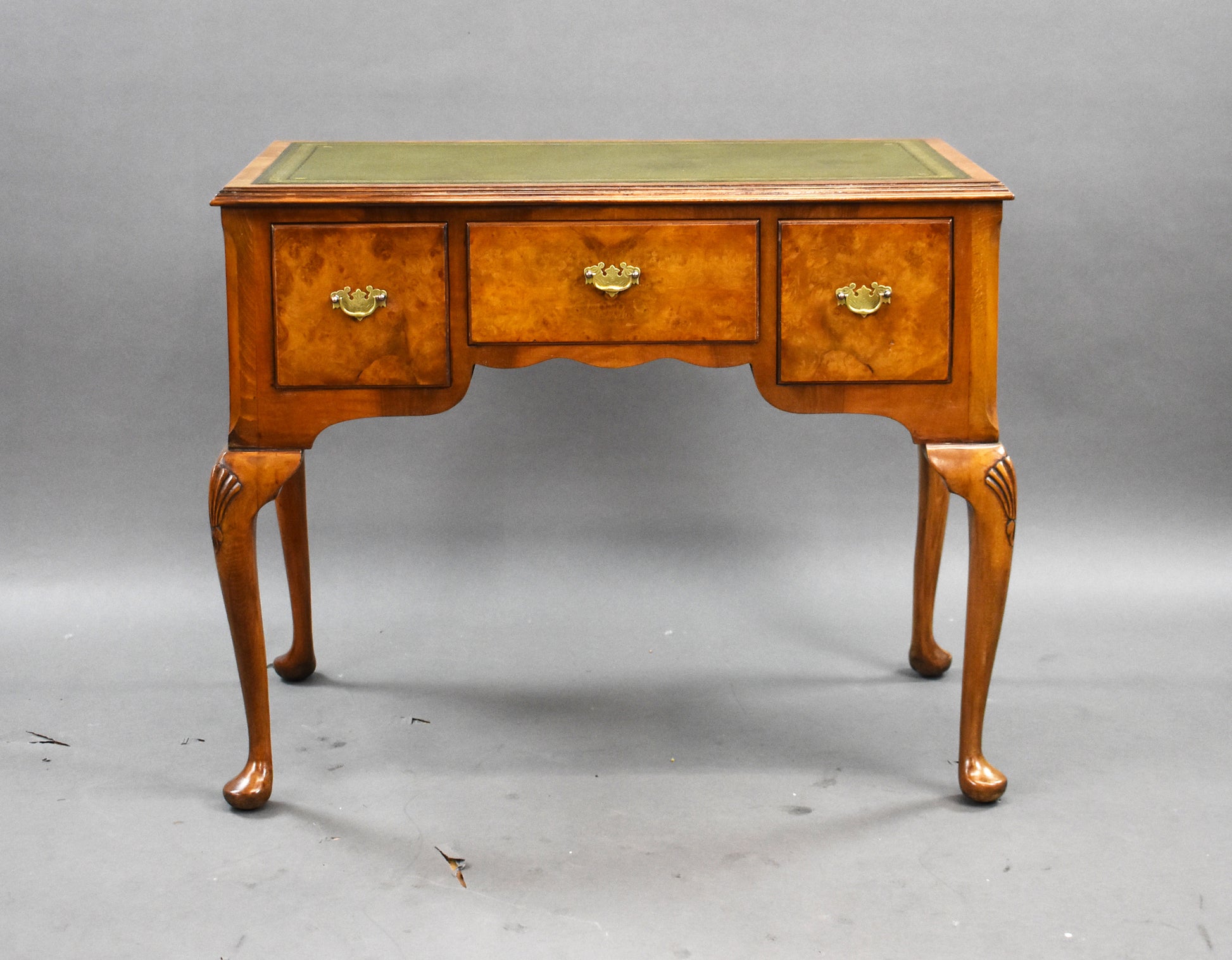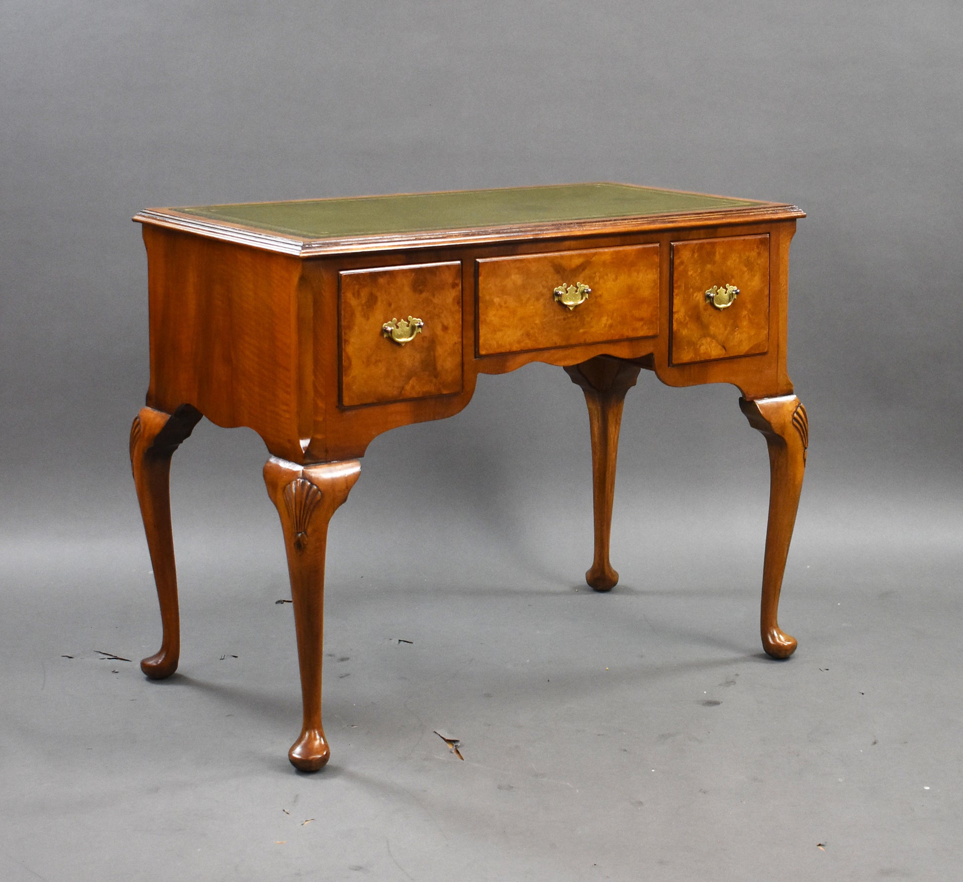 The desk features a rich burr walnut veneer with a warm patina that highlights its natural grain and depth. The green tooled leather writing surface adds a touch of luxury and provides a smooth, practical area for writing or laptop use.