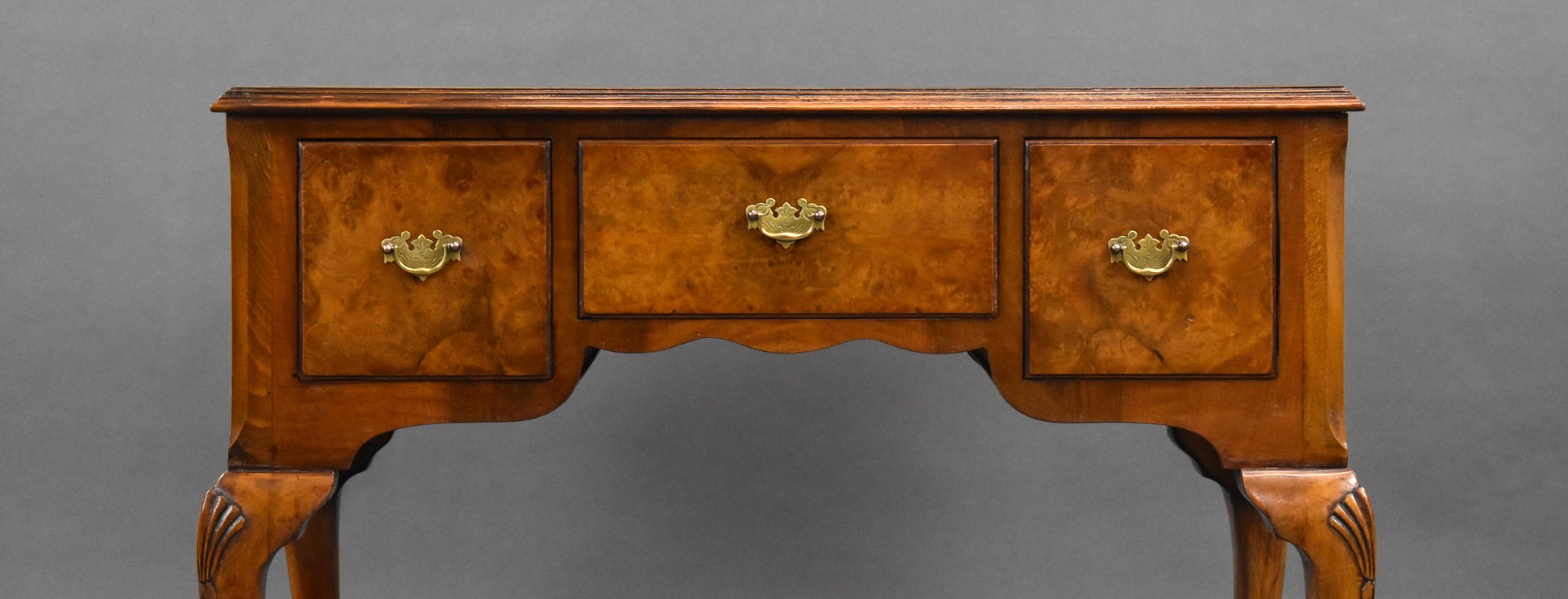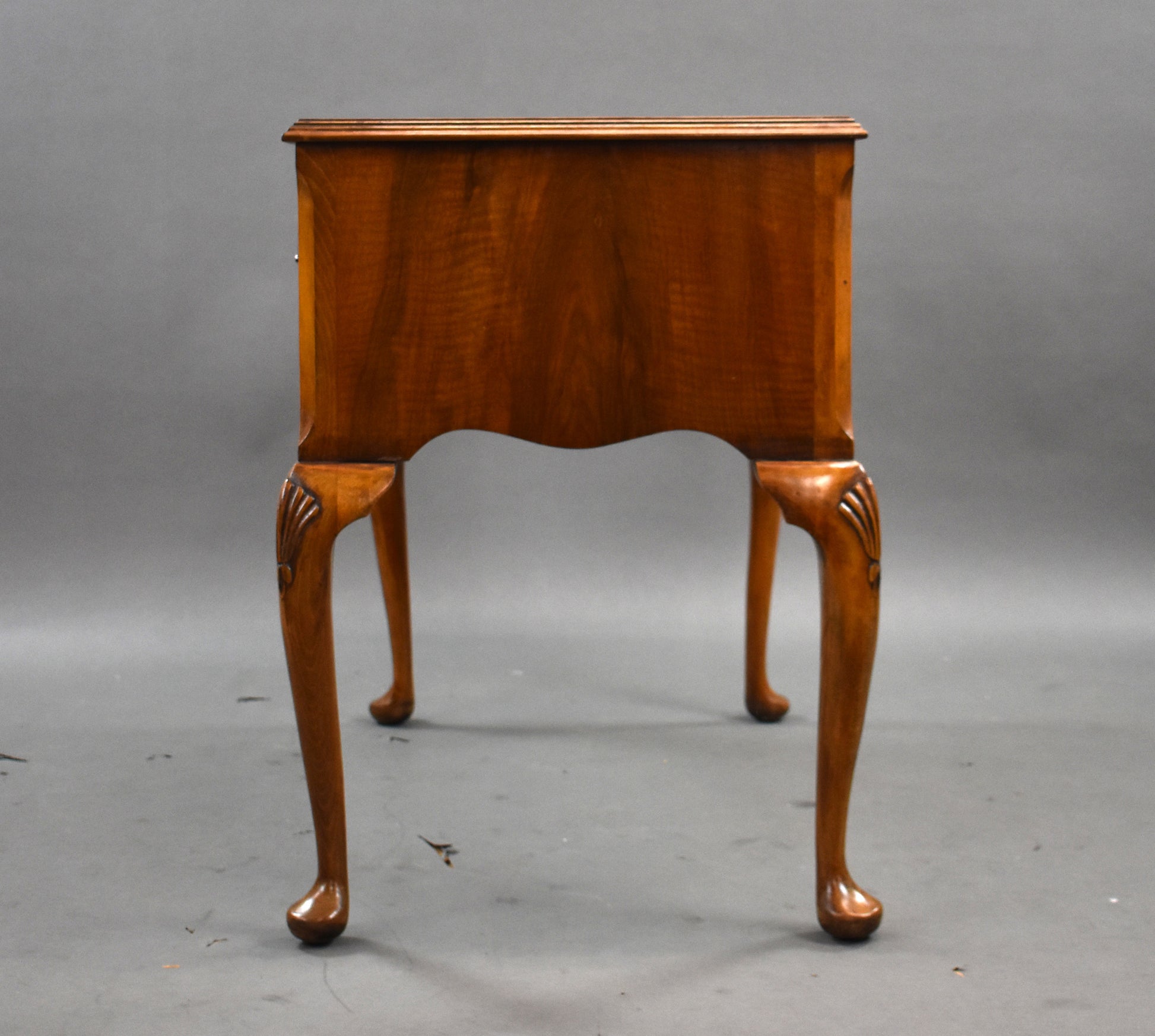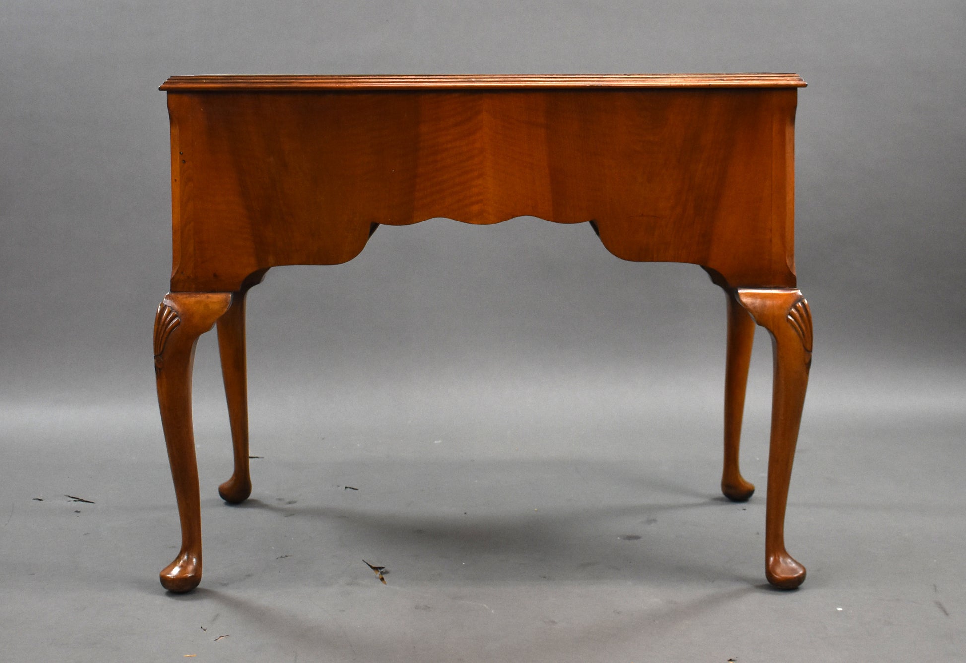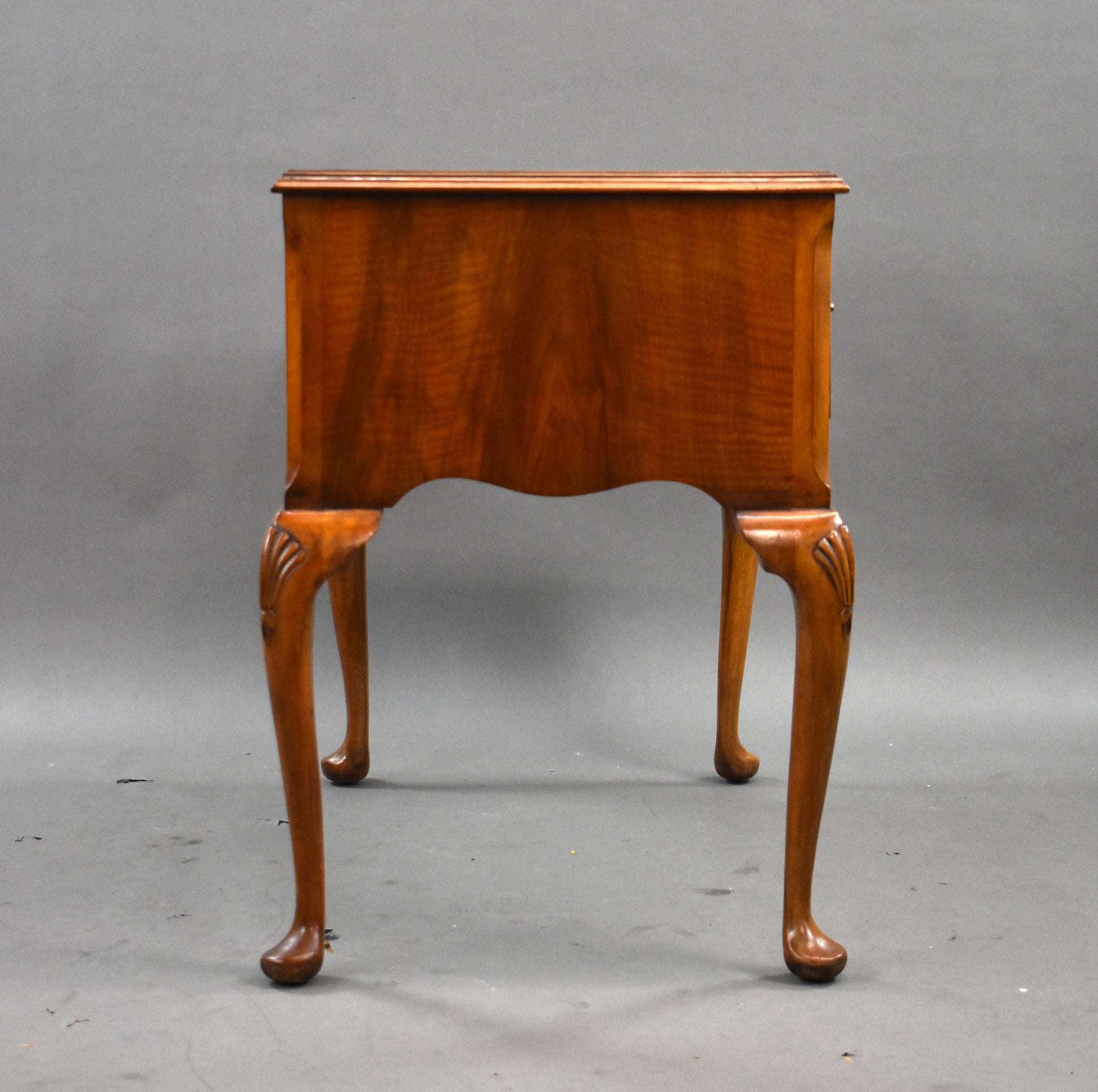 Designed with both style and utility in mind, the desk offers three drawers—two smaller side drawers and a larger central drawer—all adorned with original brass drop handles. The serpentine front and shaped apron are complemented by elegant cabriole legs with shell carvings on the knees and traditional pad feet.