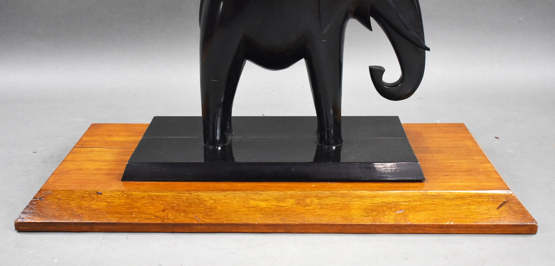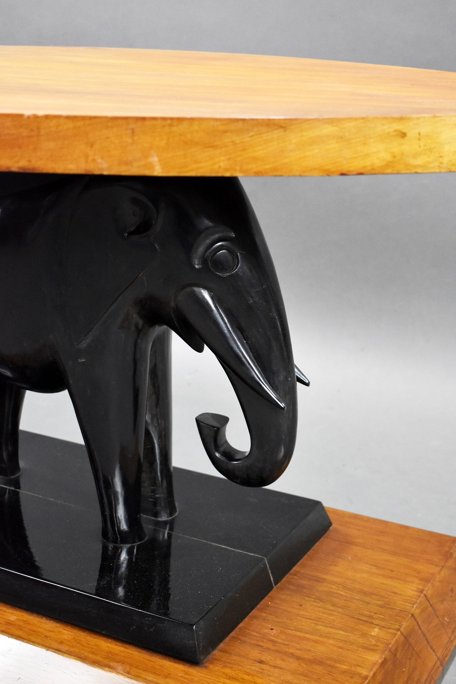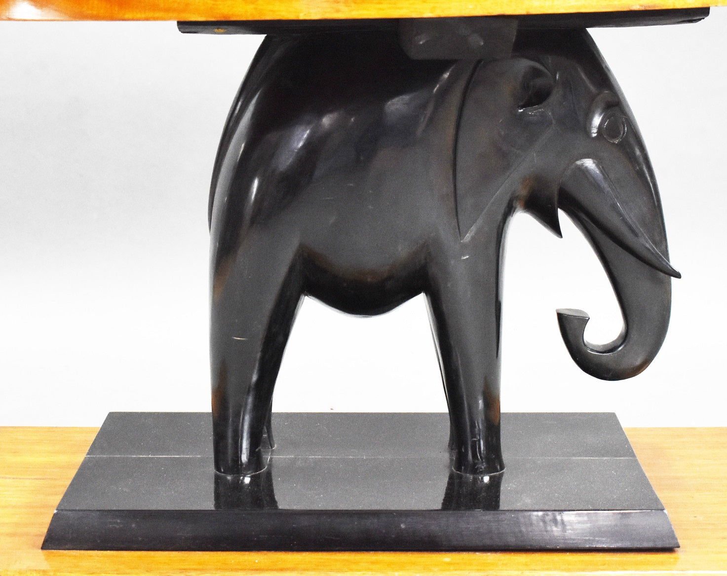 Deco Ebony Elephant walnut coffee table in good condition with oval top sitting on an ebony elephant on walnut base. The table has a glass top for protection.