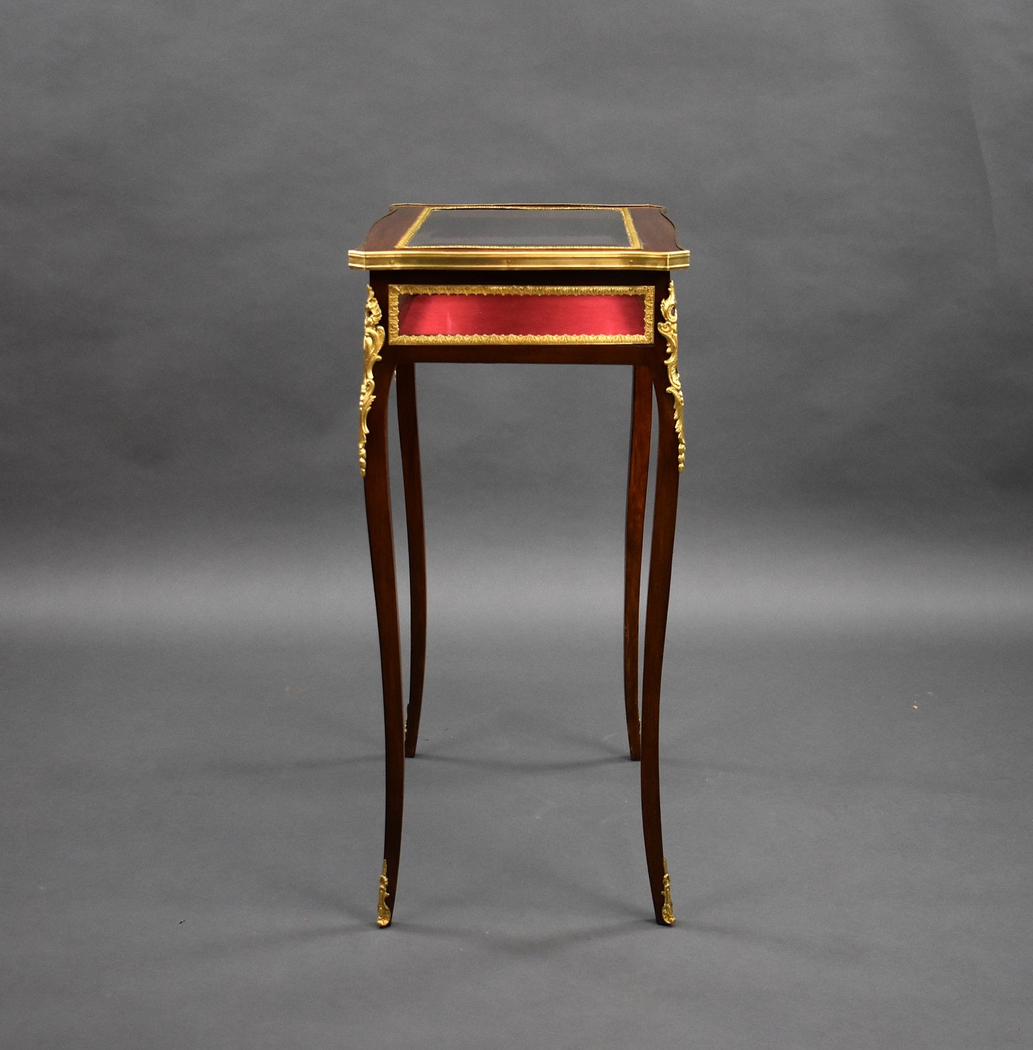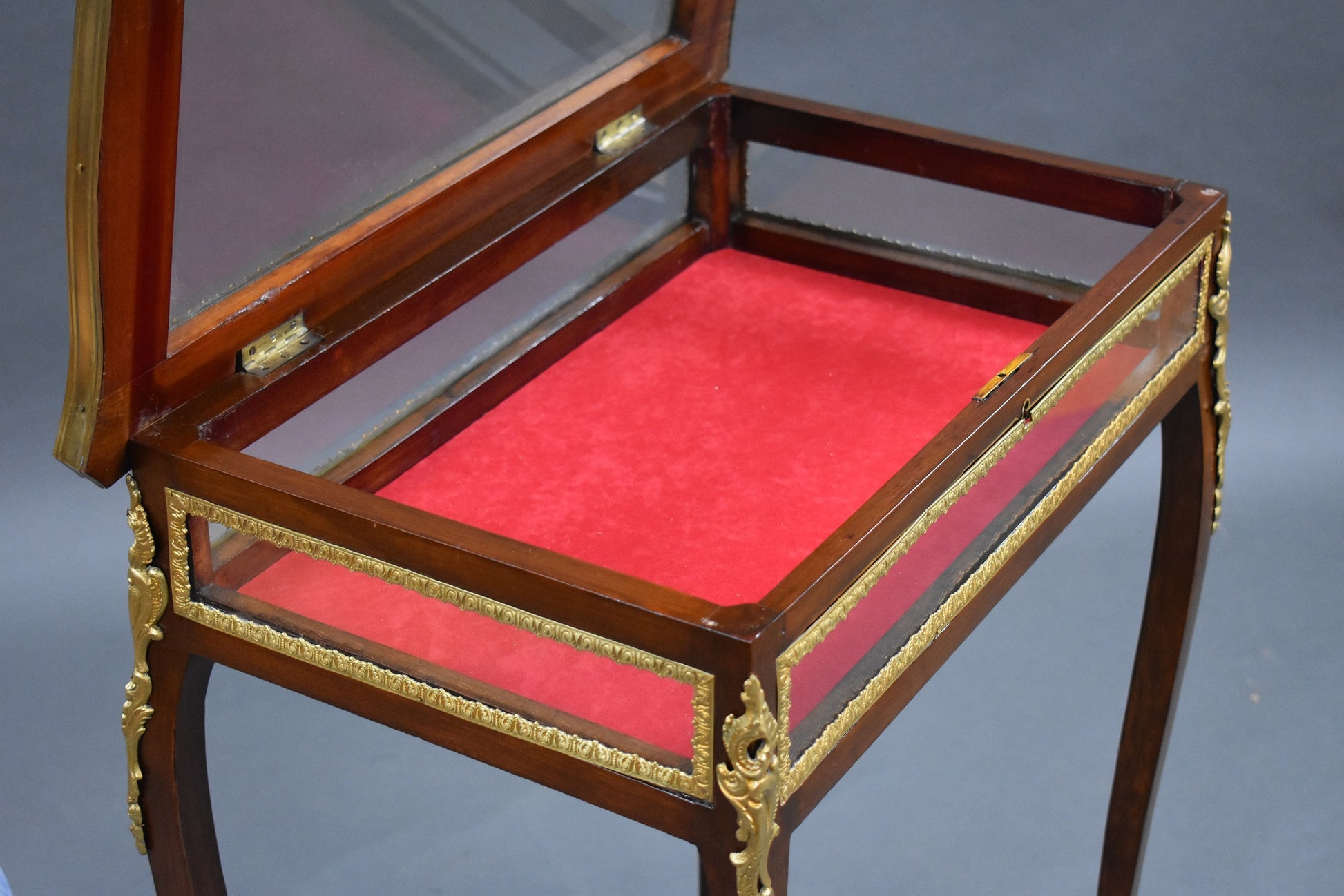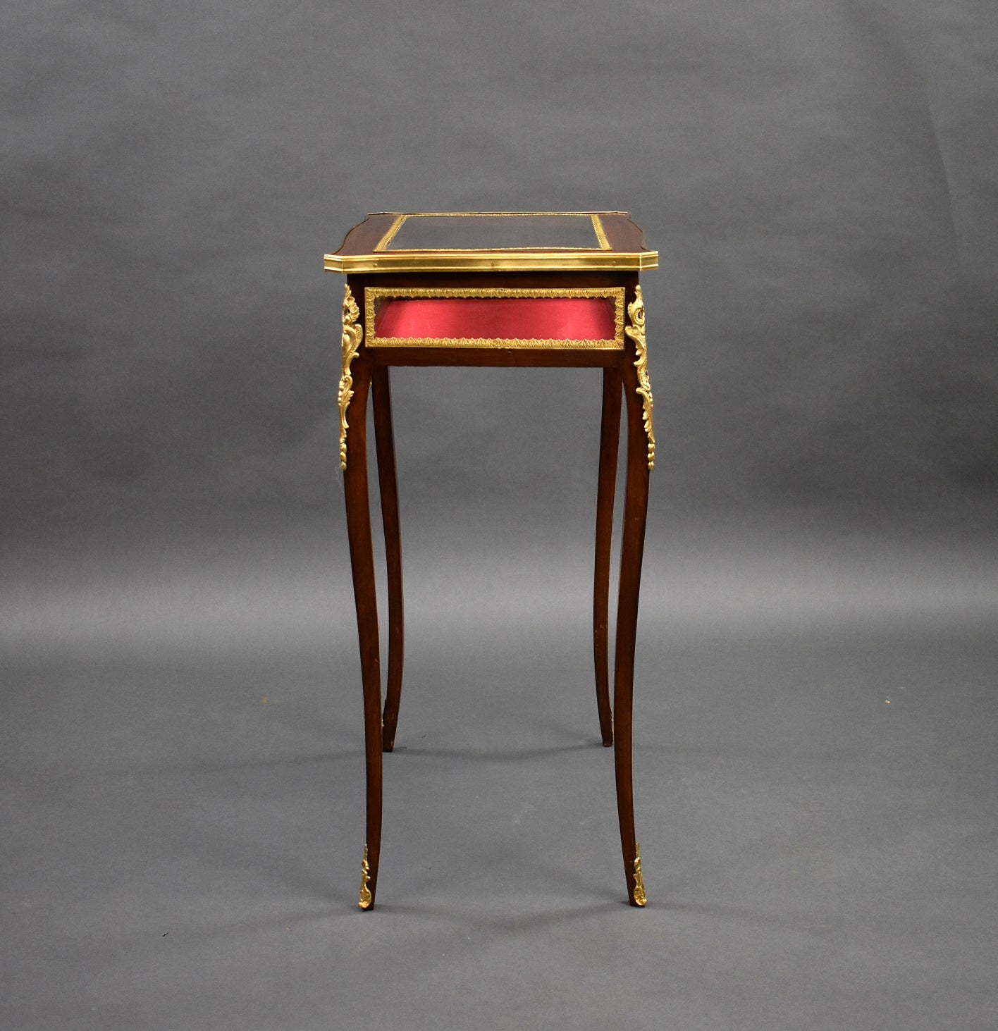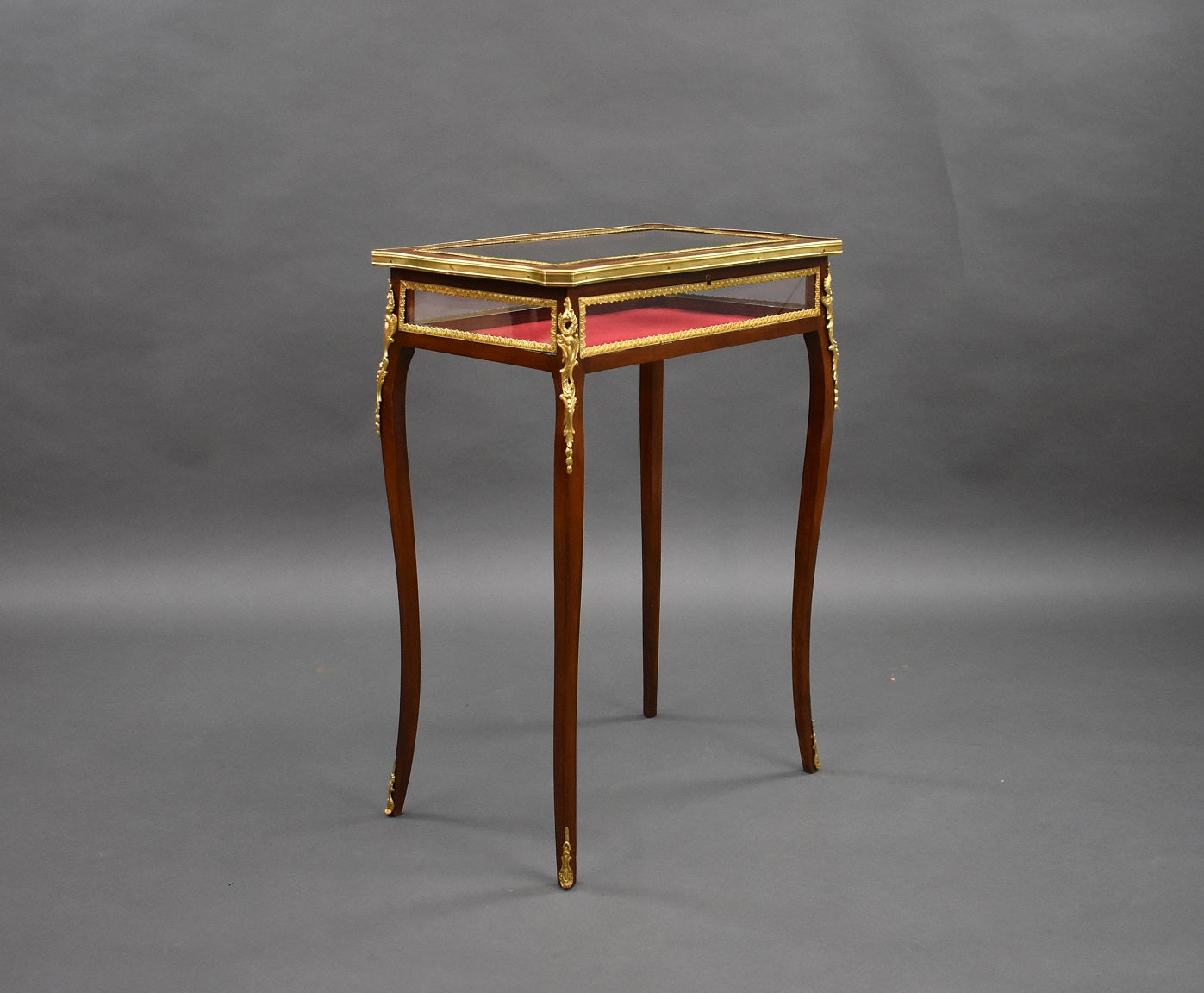Edwardian French Mahogany Bijouterie/treasure table in good condition. The Table has bevelled glass to the top and glass to the sides with a red velvet lining. The table has ormolu mounts on each corner and each leg.