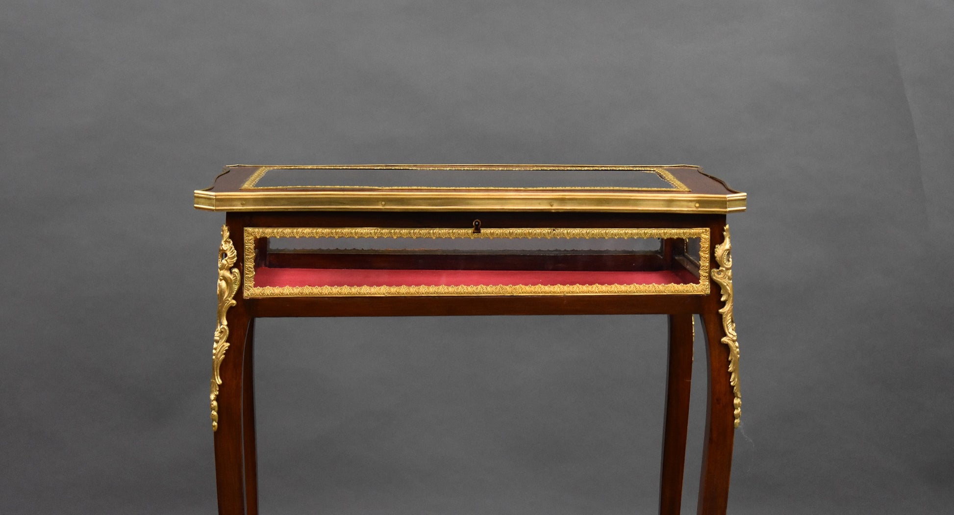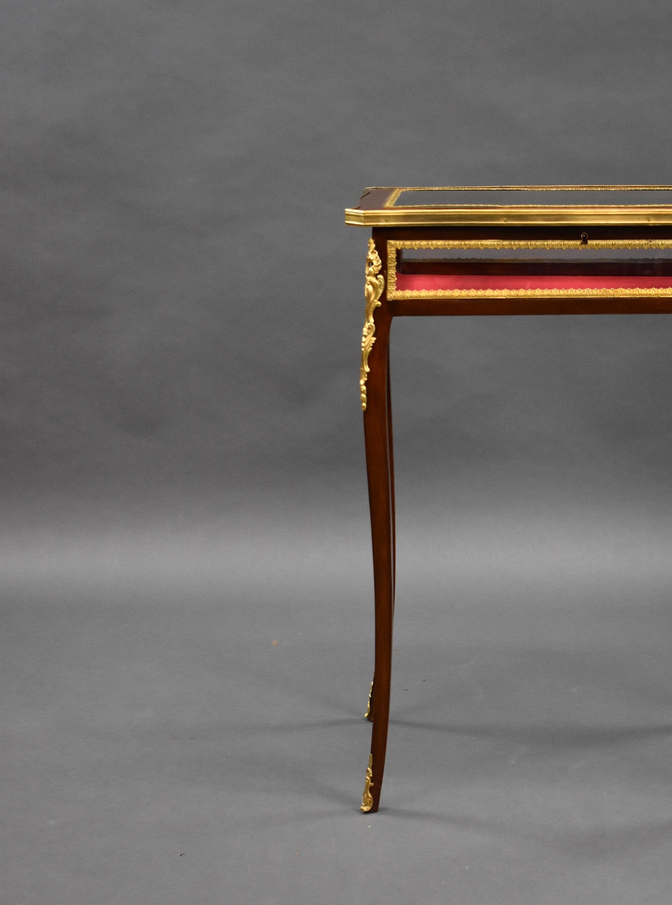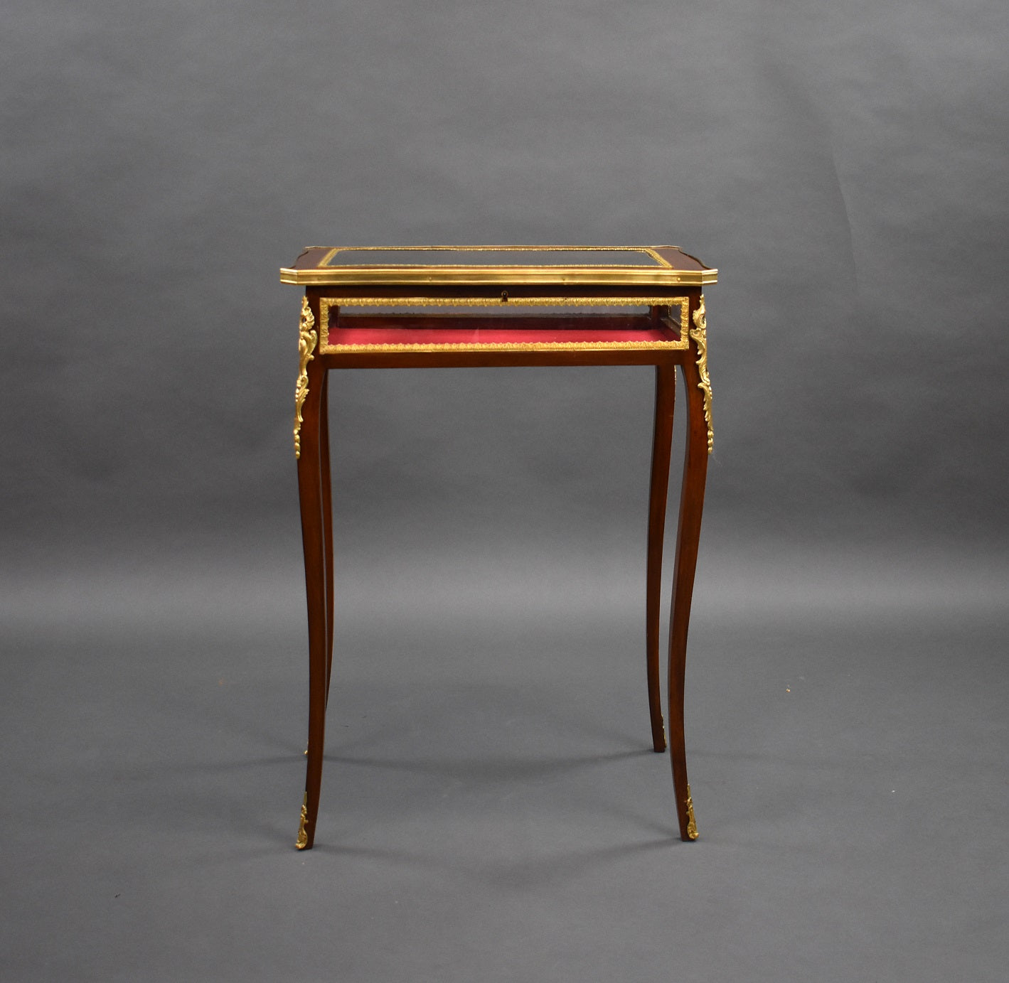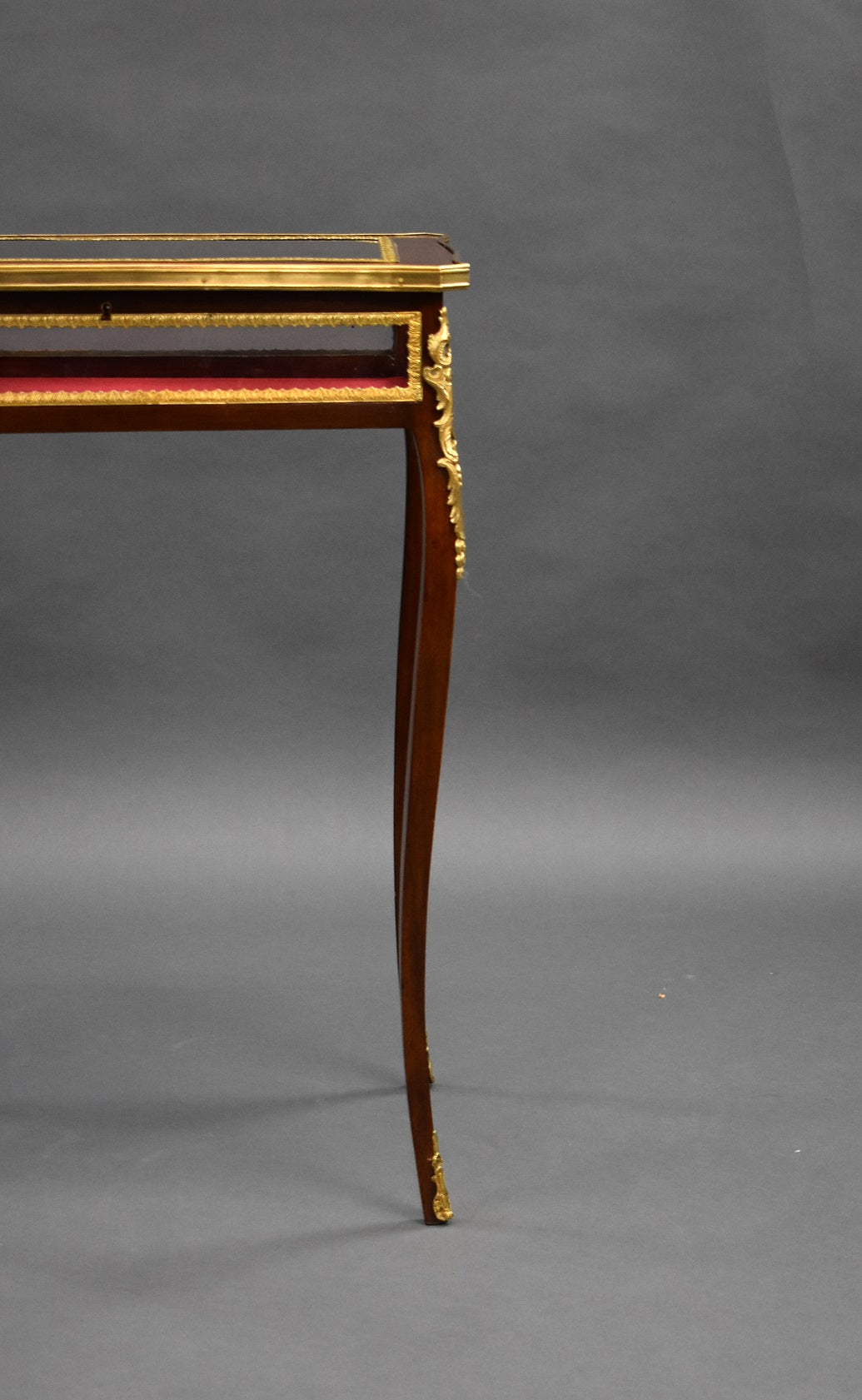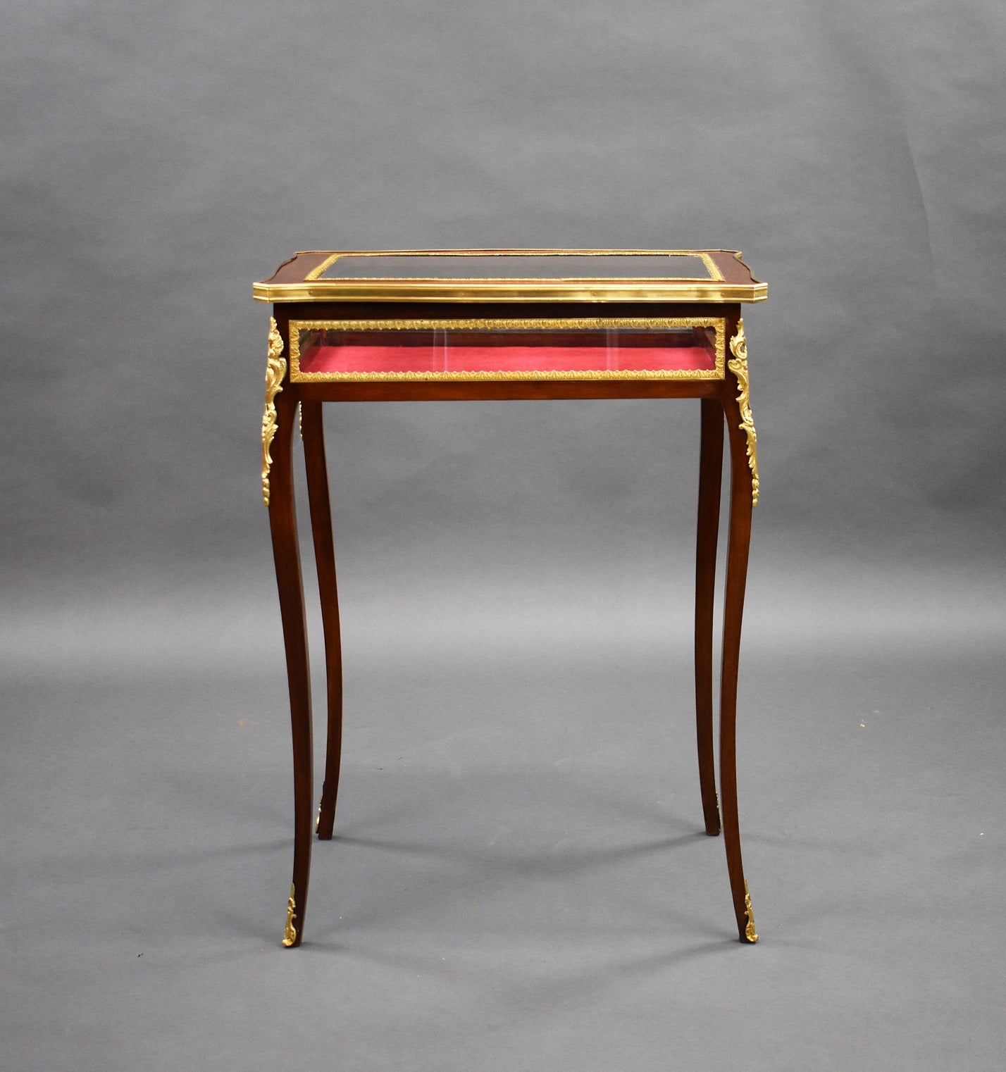 Edwardian French Mahogany Bijouterie/treasure table in good condition. The Table has bevelled glass to the top and glass to the sides with a red velvet lining. The table has ormolu mounts on each corner and each leg.
