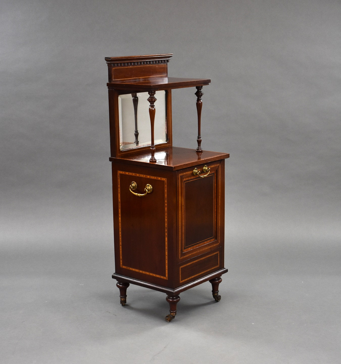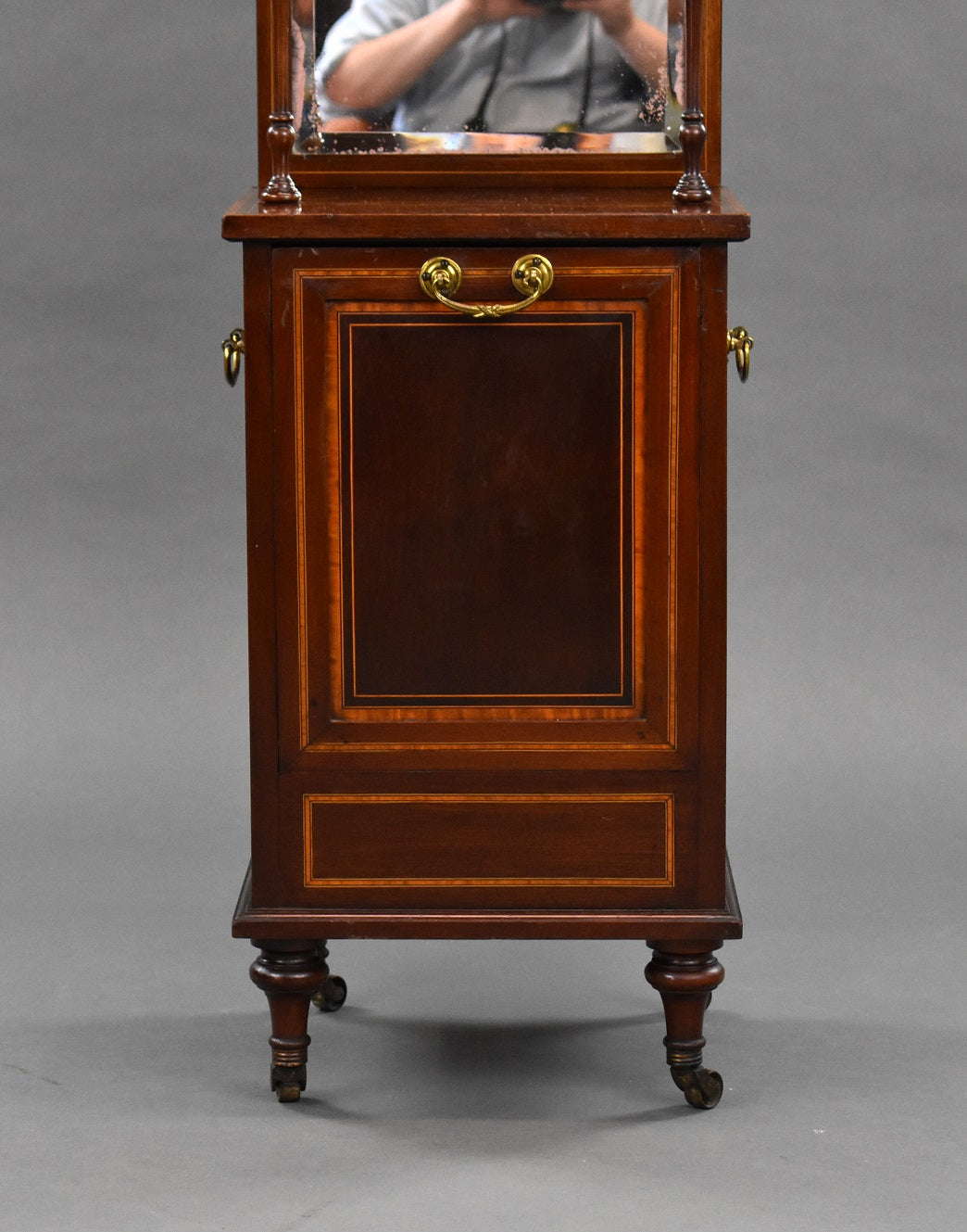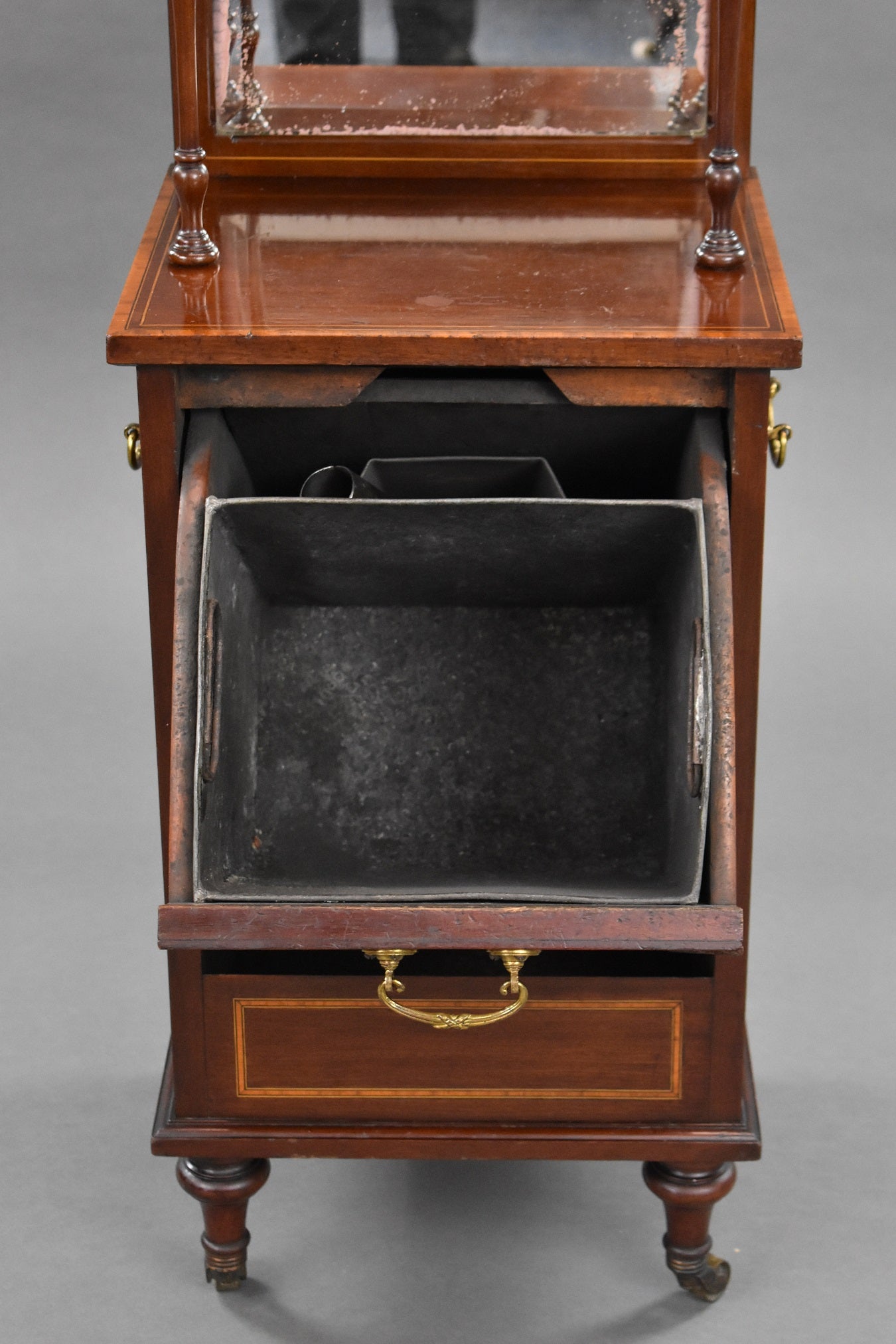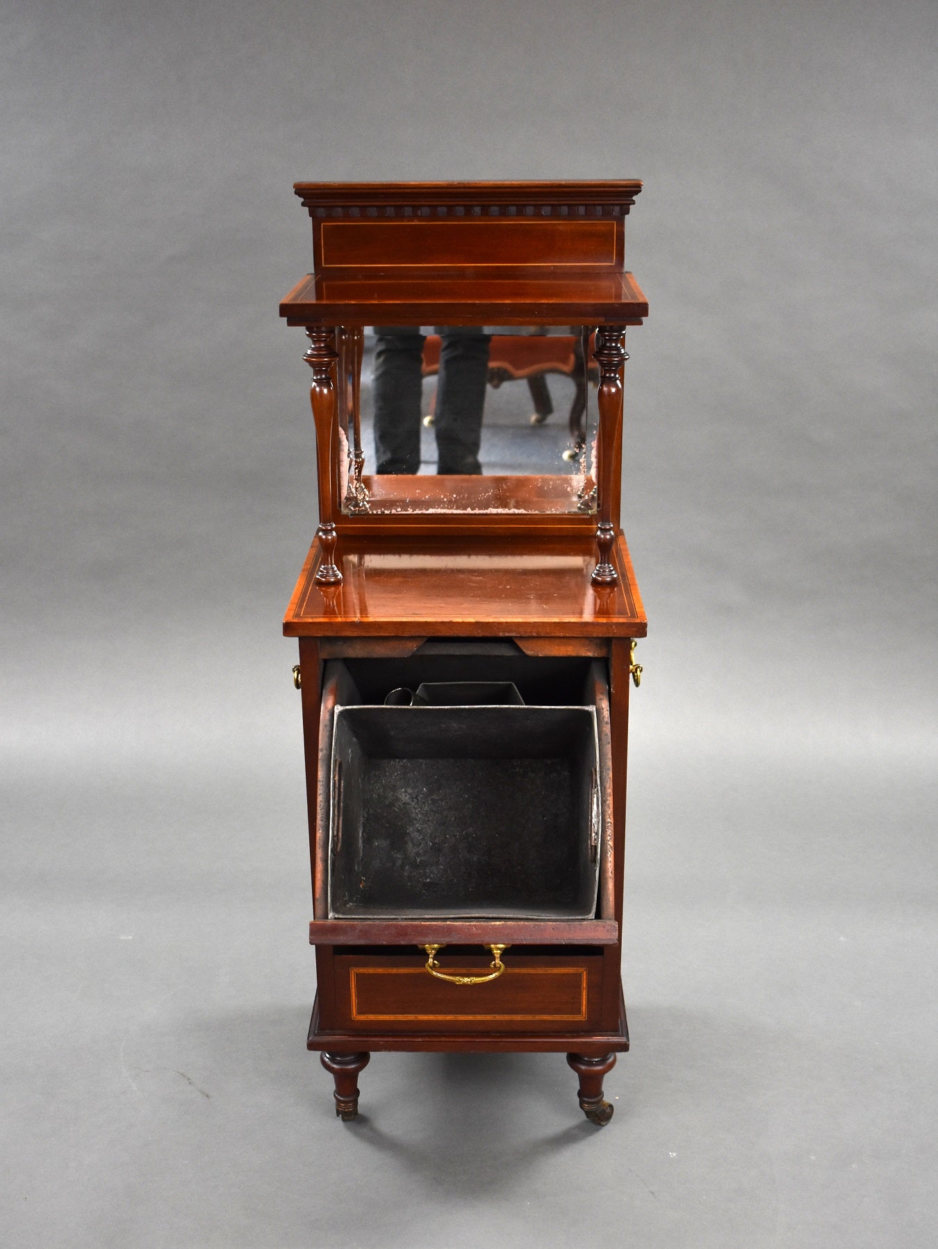 Edwardian antique mahogany coal purdonium in good condition with mirror back to the top with elegant spindles to the front and banded inlay to the front and sides, with carrying handles to each side. The front pulls down to reveal the original coal box and shovel, stands on turned feet on castors.