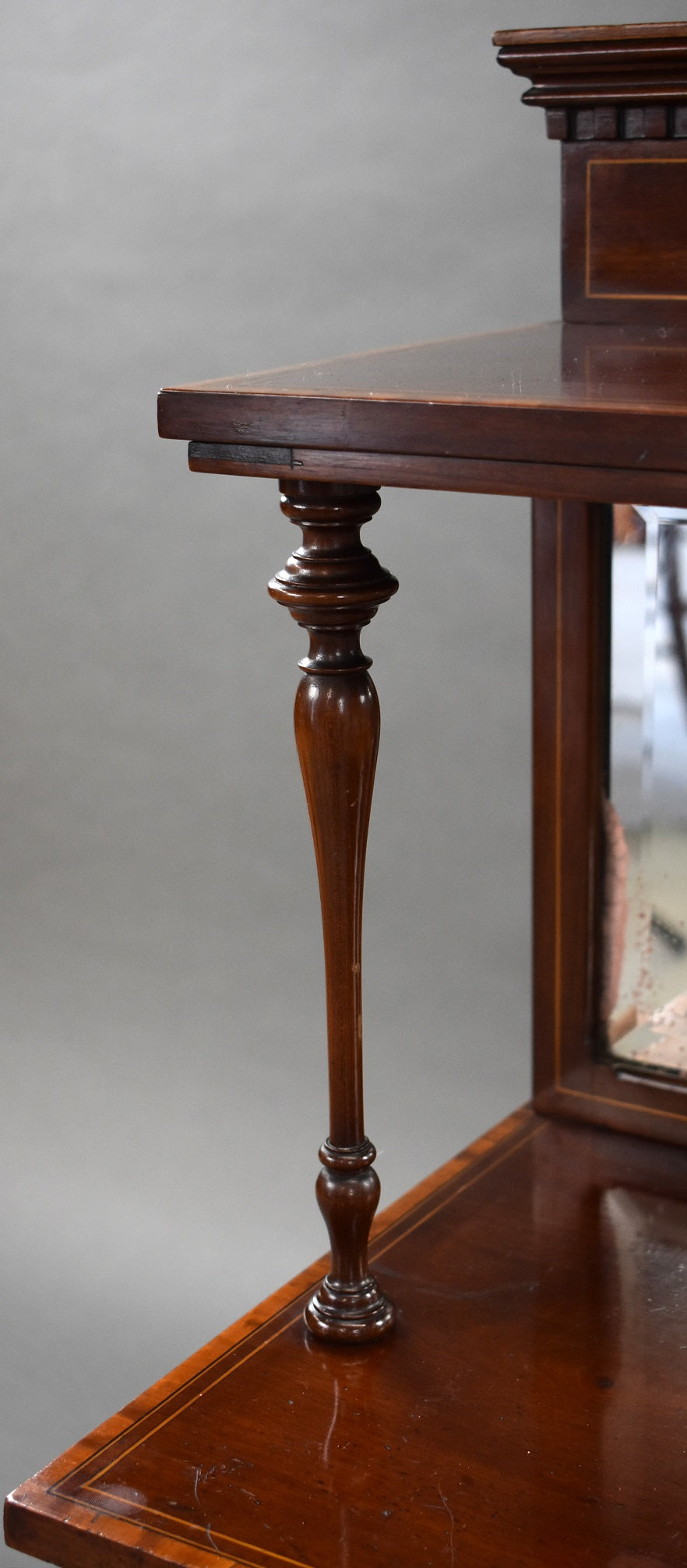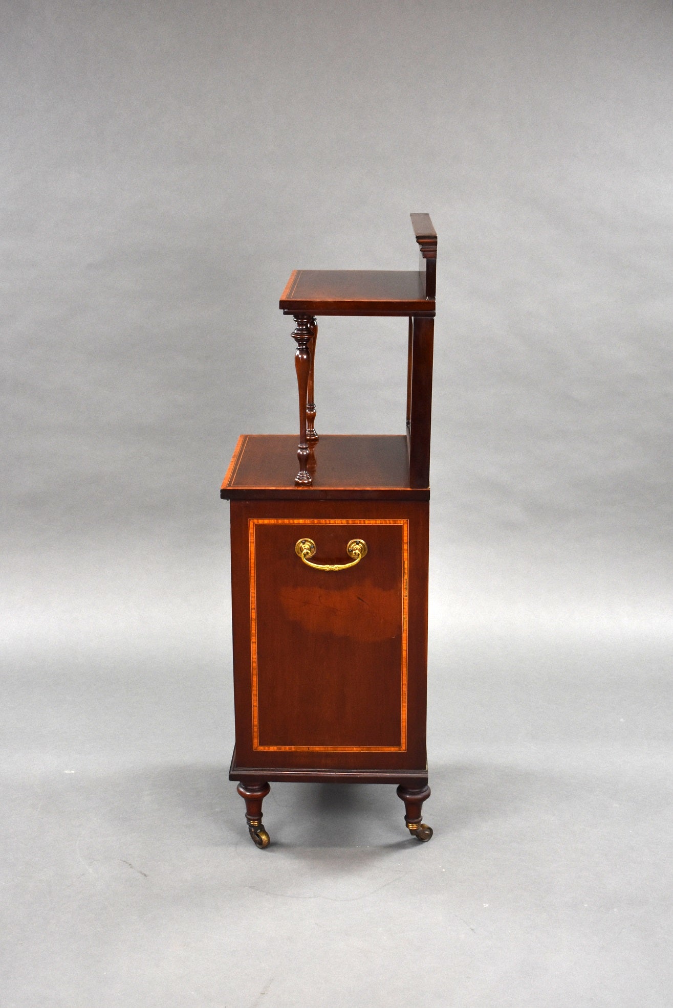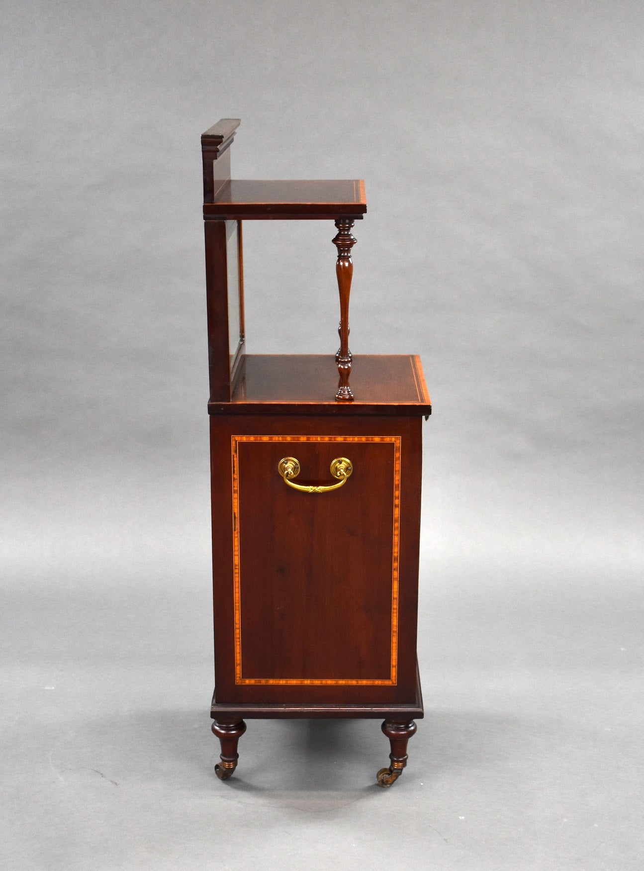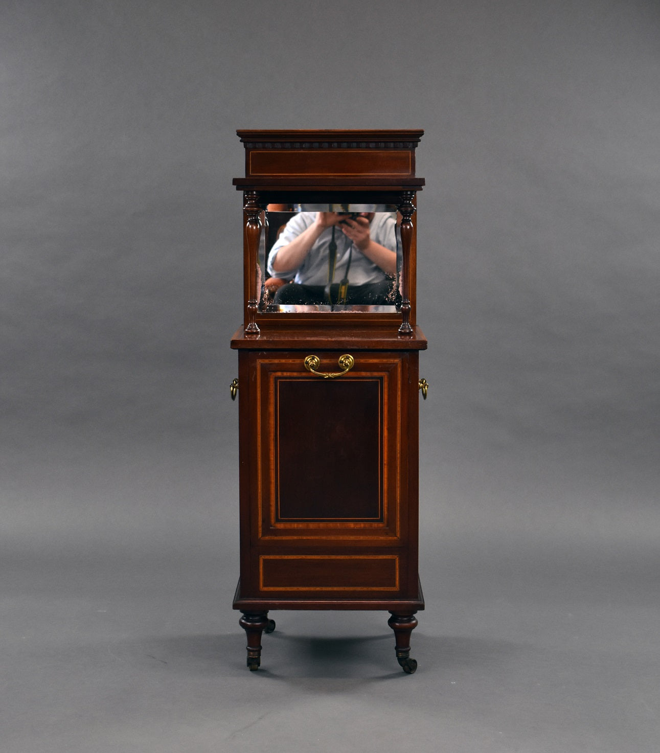 Edwardian antique mahogany coal purdonium in good condition with mirror back to the top with elegant spindles to the front and banded inlay to the front and sides, with carrying handles to each side. The front pulls down to reveal the original coal box and shovel, stands on turned feet on castors.
