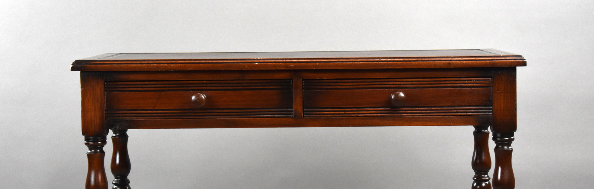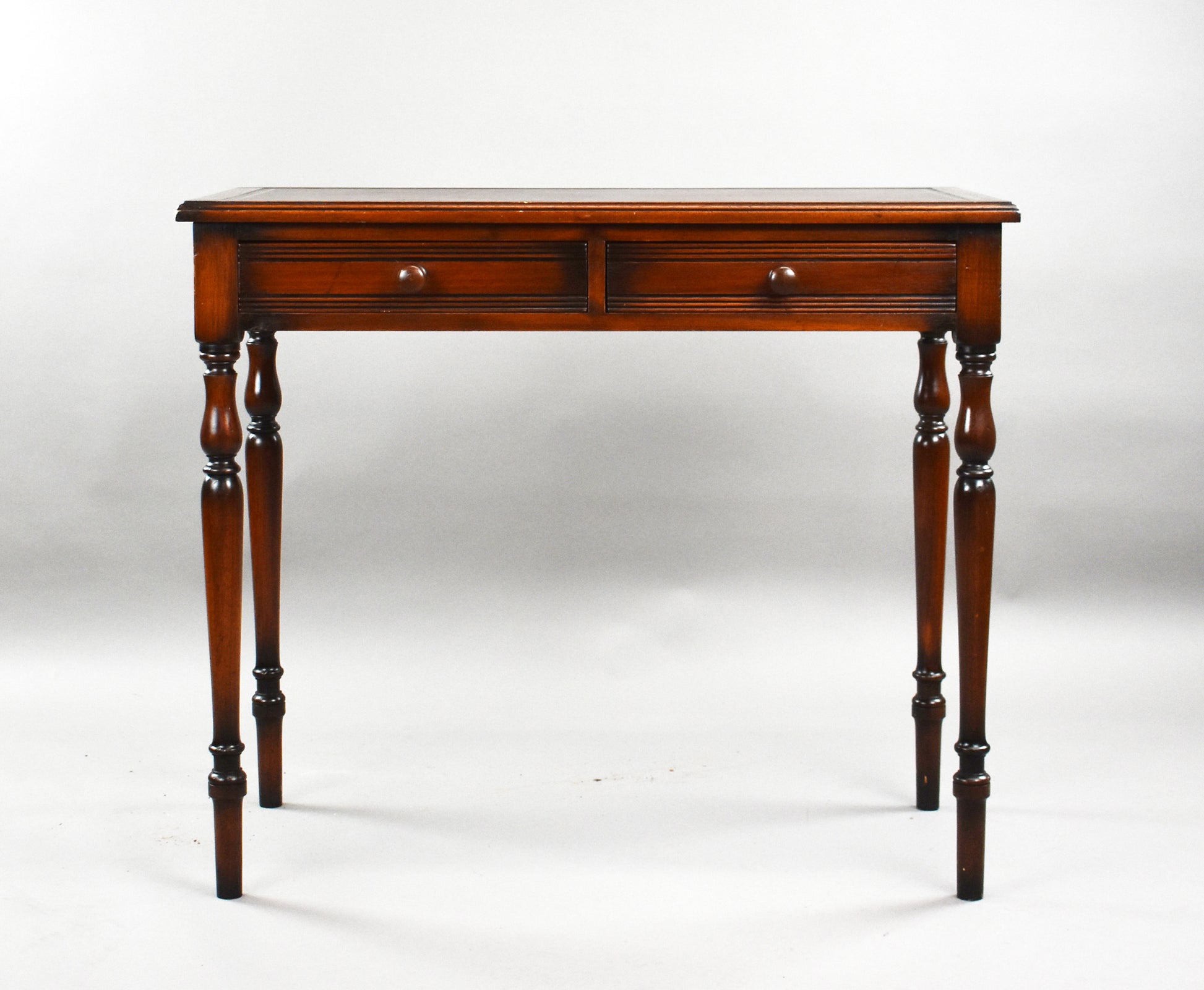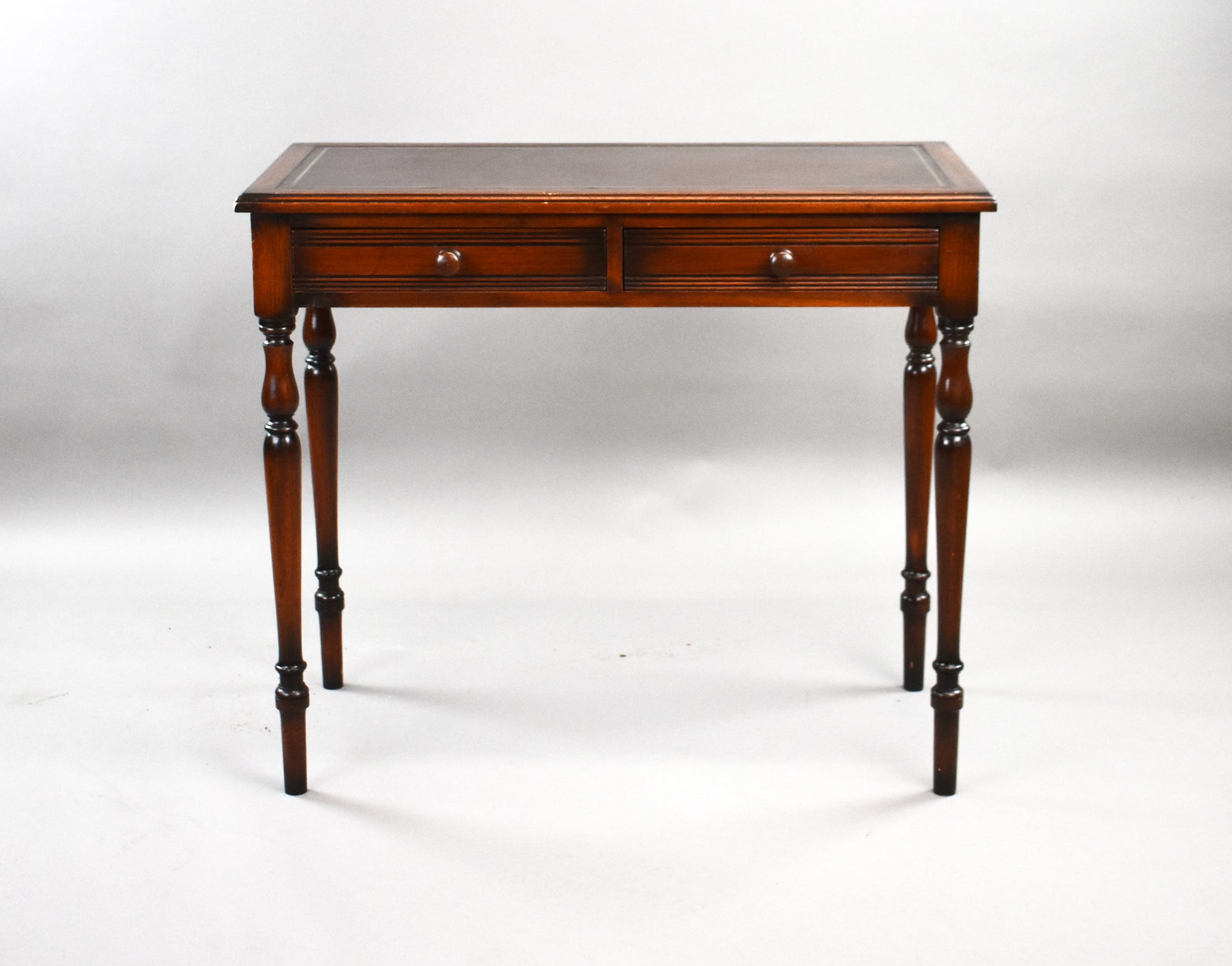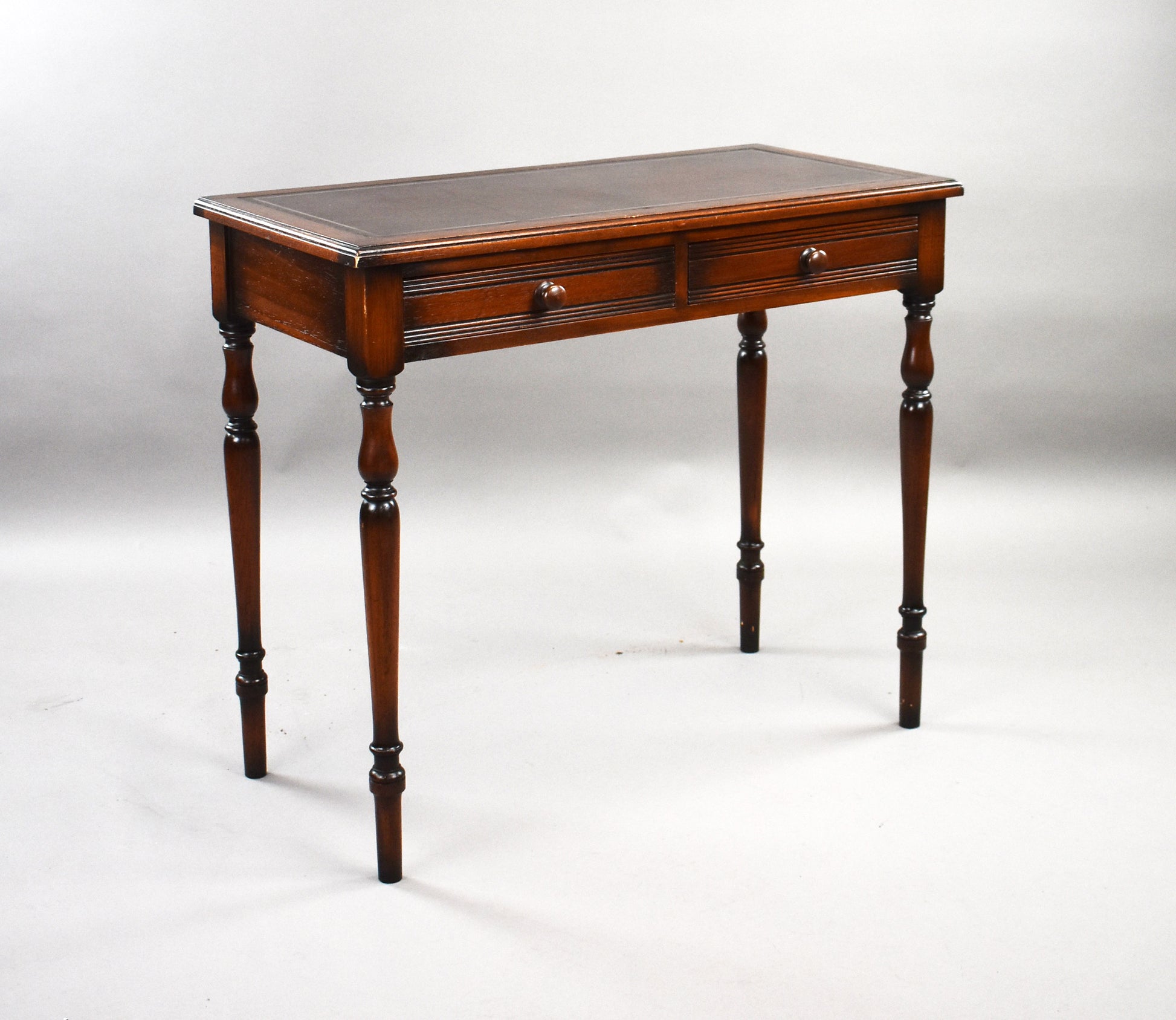 An Edwardian mahogany writing table in the Georgian revival taste, having a rectangular leather top above a pair of opposing drawers fitted with turned wooden knobs. Raised on finely turned tapering legs united by excellent proportions and balance.