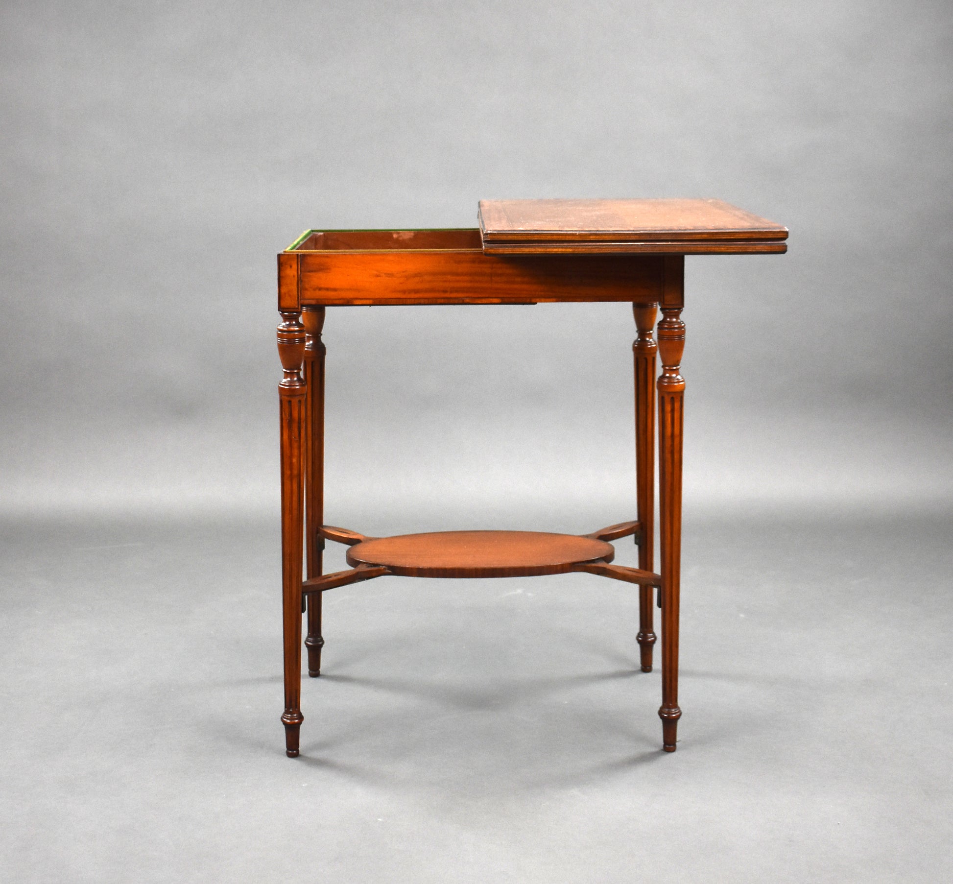 Edwardian antique satinwood card table. The table top swivels and opens to reveal a green baize and