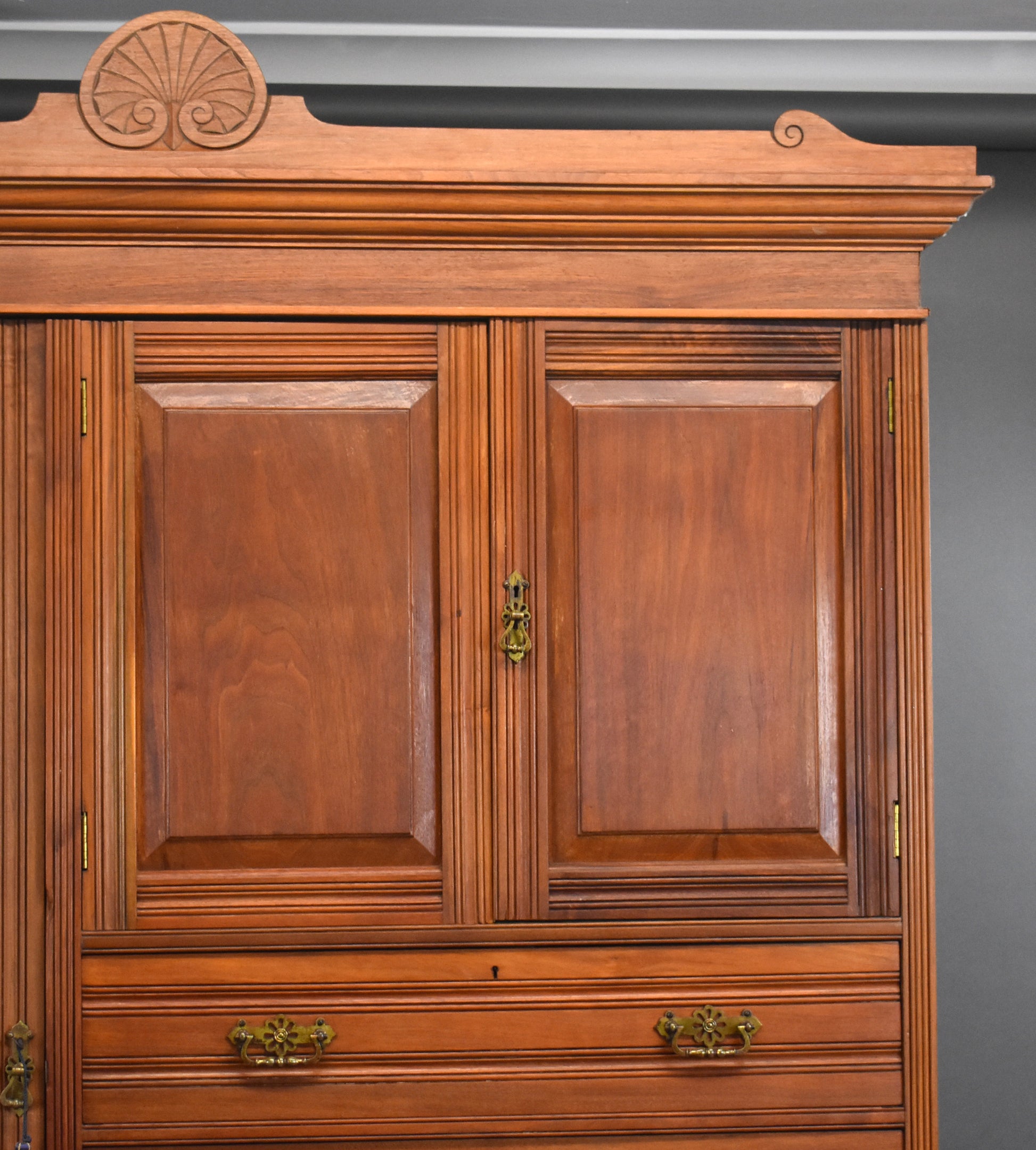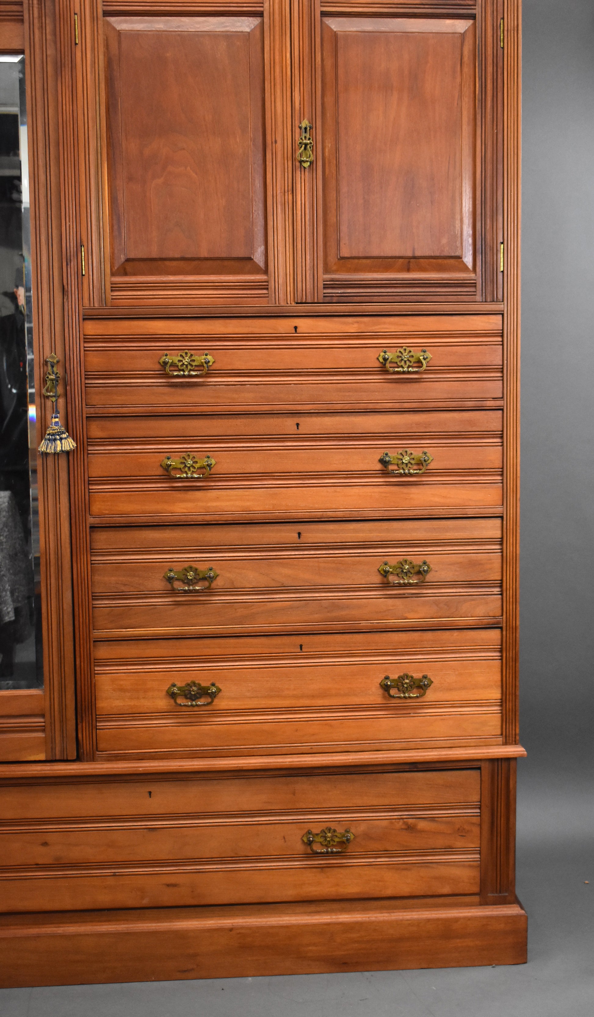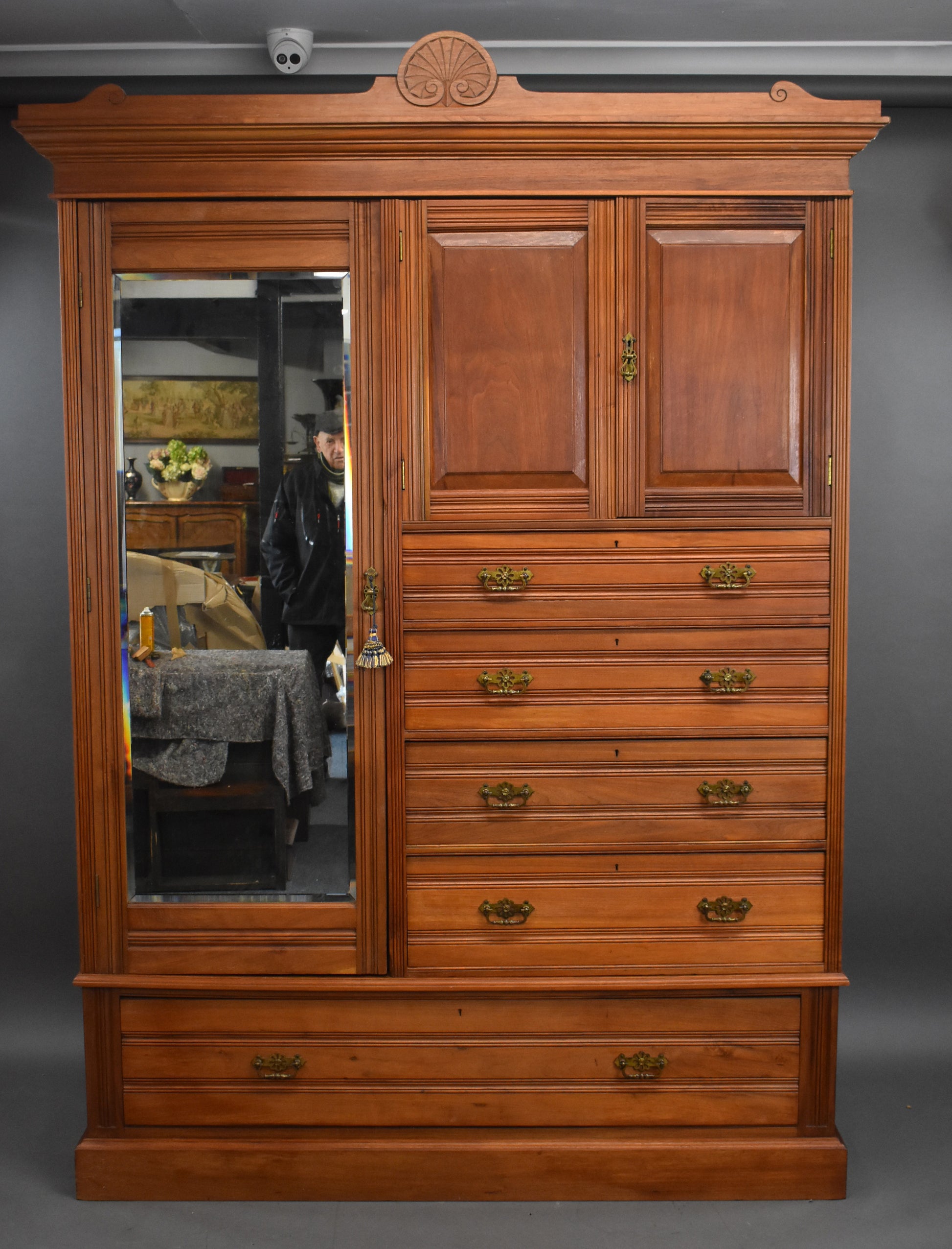 For sale is a good quality Edwardian wardrobe, having a single mirror door, opening to hanging space, with a cupboard to the right handside, above an arrangement of graduated drawers, over the base which has another large drawer, raised on a plinth. The wardrobe remains in good condition, showing minor signs of wear commensurate with age and use. The wardrobe breaks down into multiple sections for ease of transport.