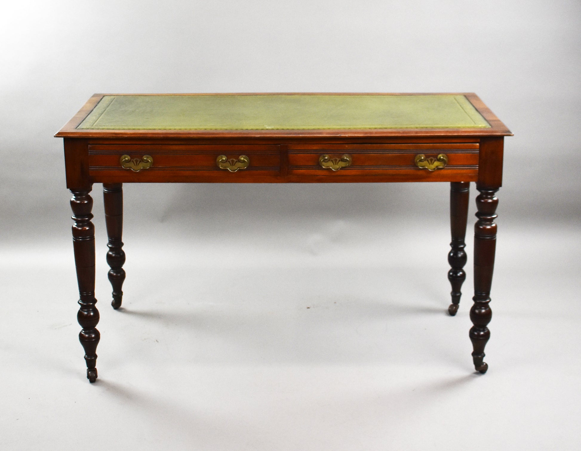 An Edwardian mahogany writing table in the Georgian revival taste, having a rectangular green leather top above a pair of opposing drawers fitted with turned wooden knobs. Raised on finely turned tapering legs united by excellent proportions and balance.