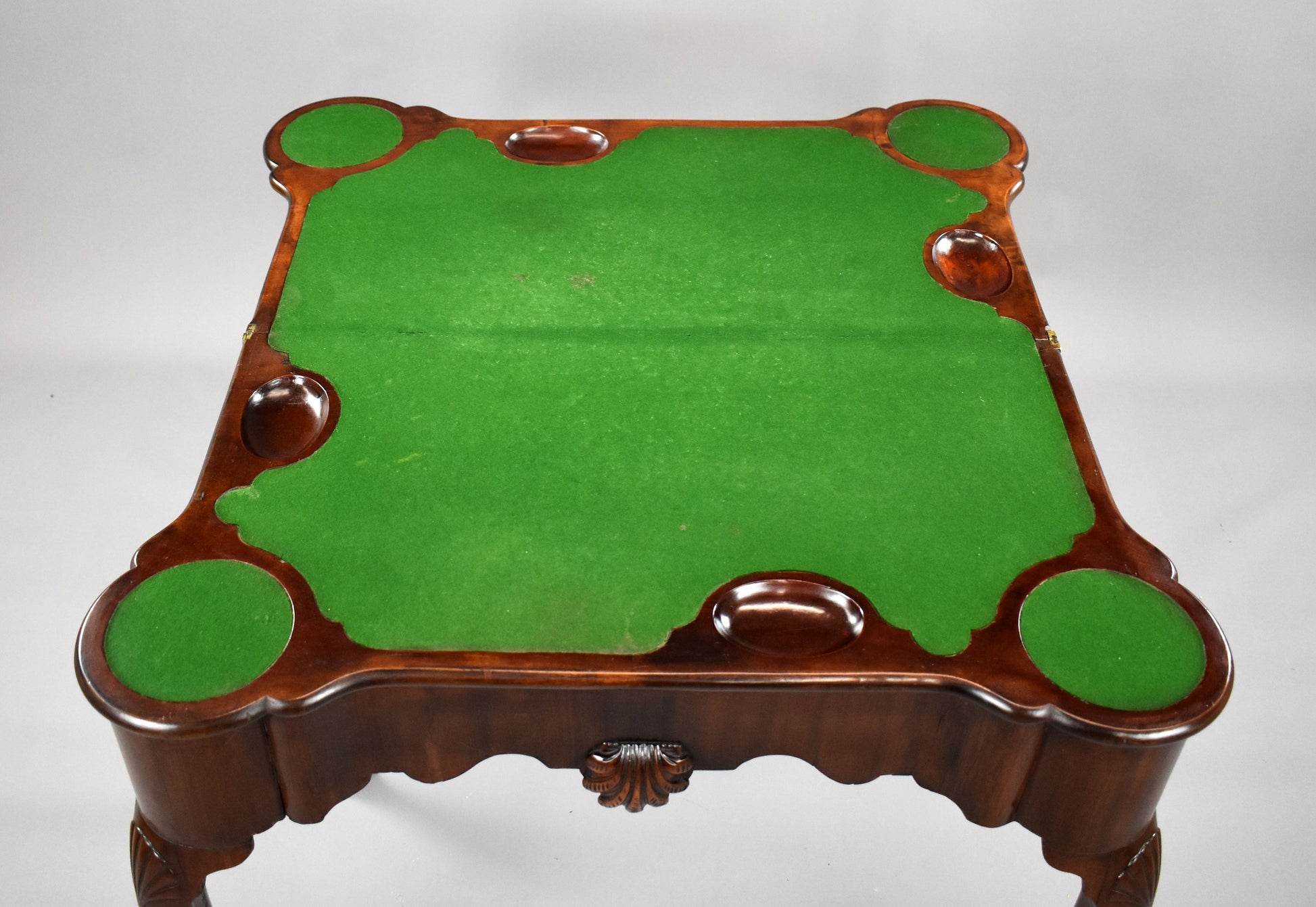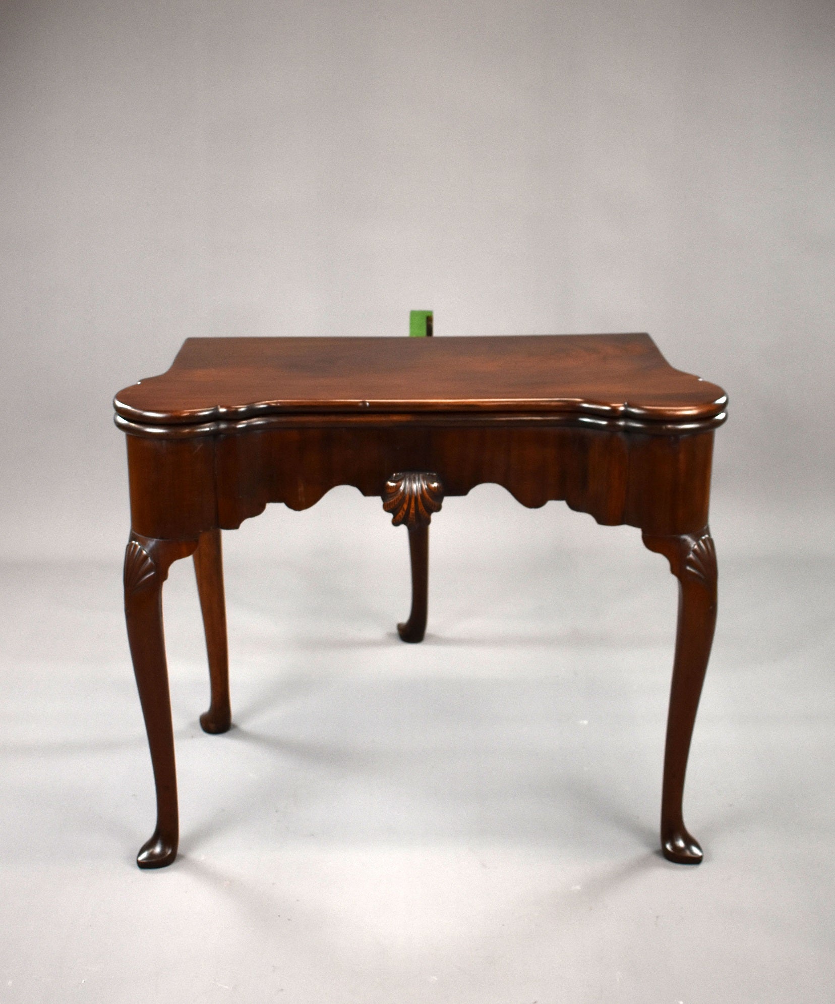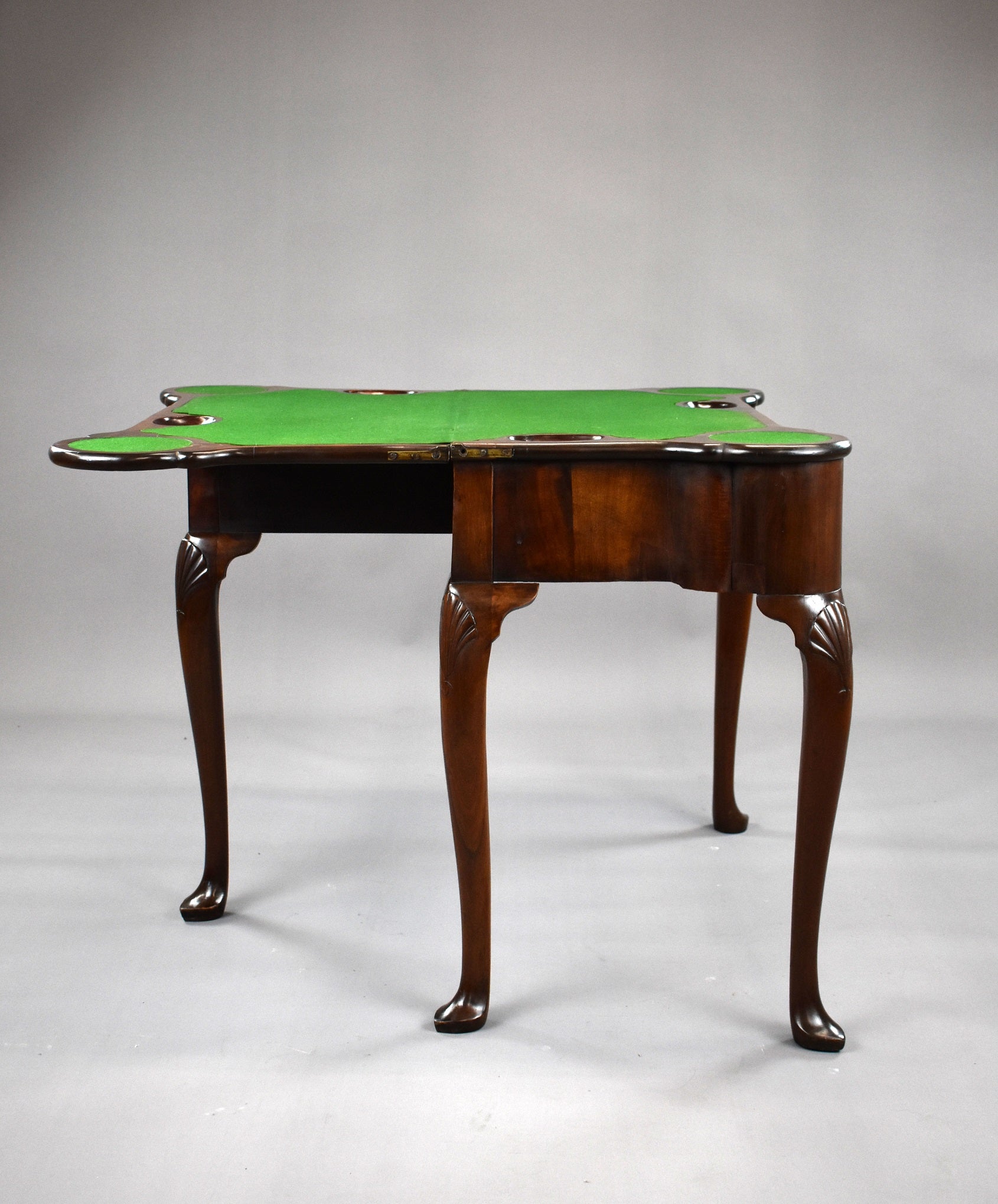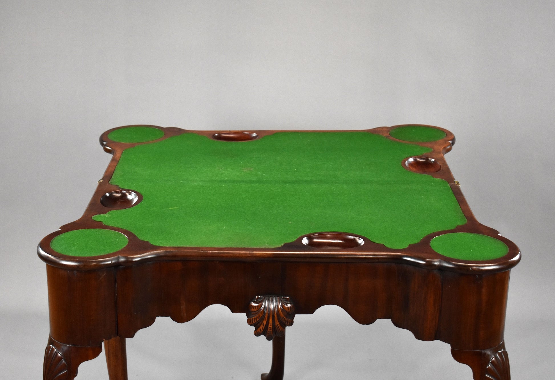 George II Irish Mahogany Card Table with carved scalloped shell on frieze, raised on shell carved cabriole legs on pad feet. The table opens to reveal a green baize lined playing surface inset with counter wells.