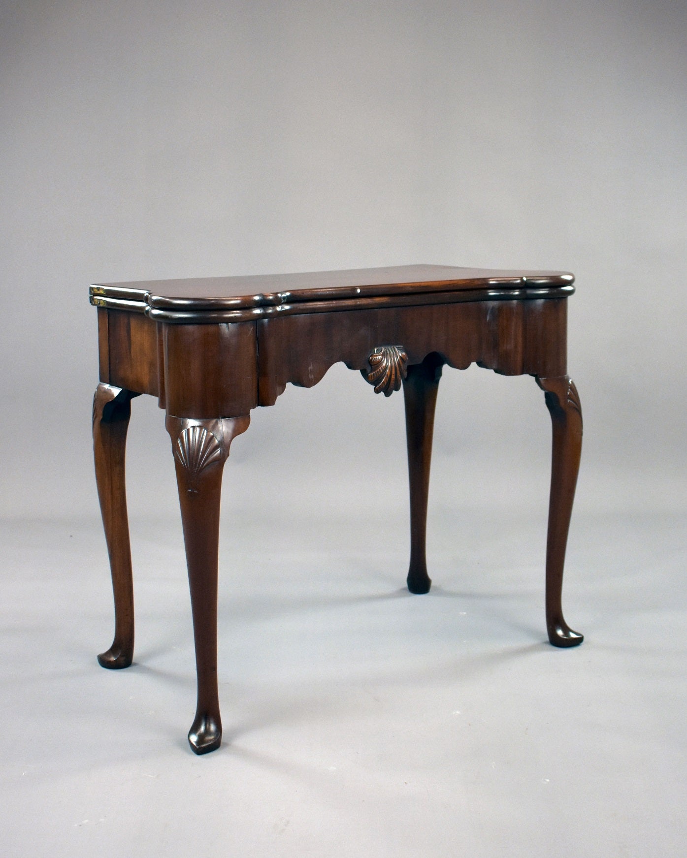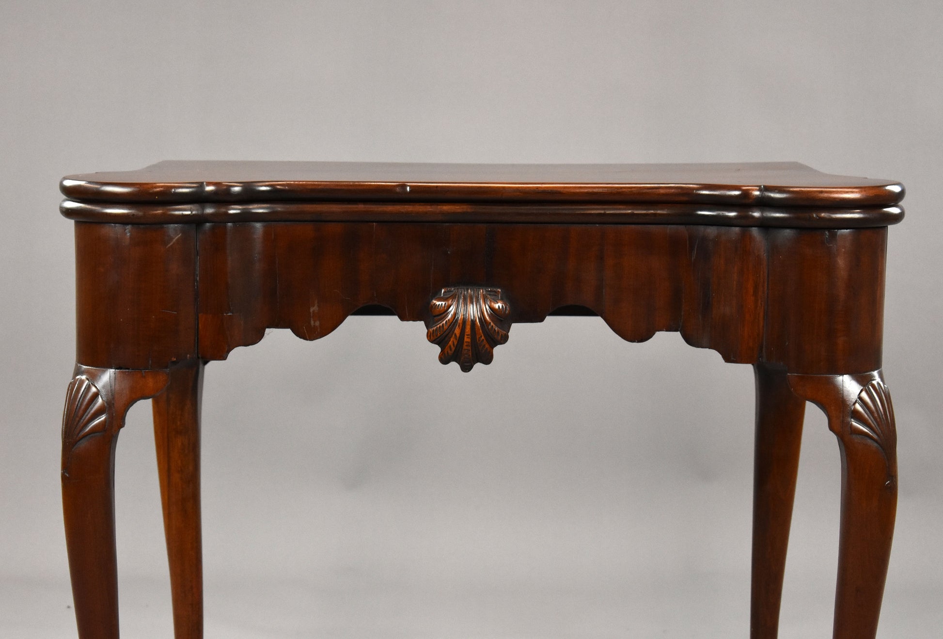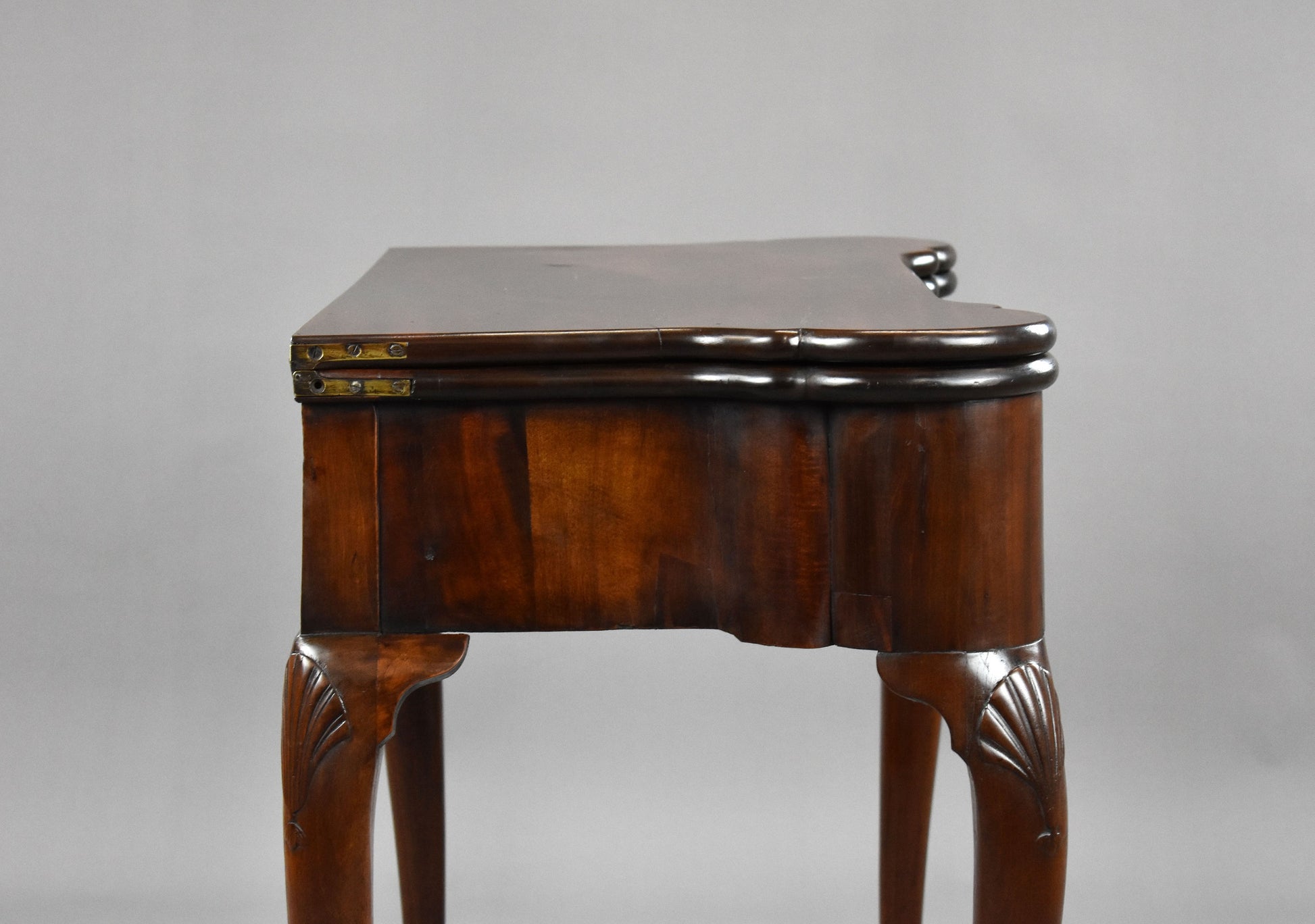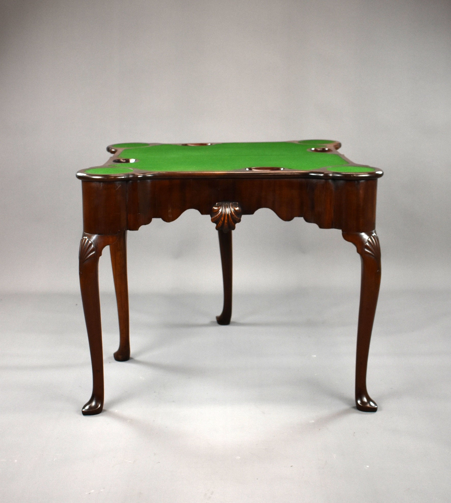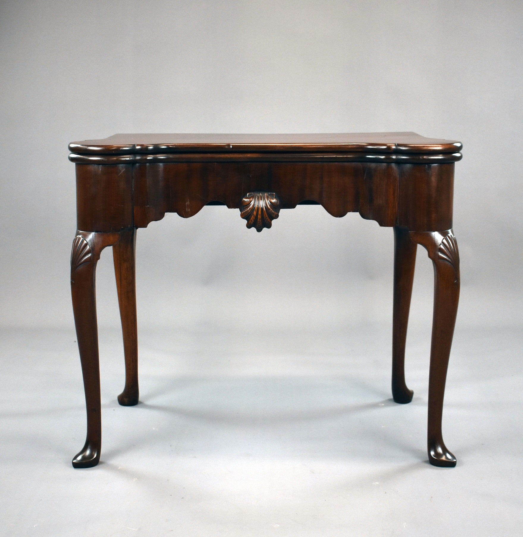 George II Irish Mahogany Card Table with carved scalloped shell on frieze, raised on shell carved cabriole legs on pad feet. The table opens to reveal a green baize lined playing surface inset with counter wells.