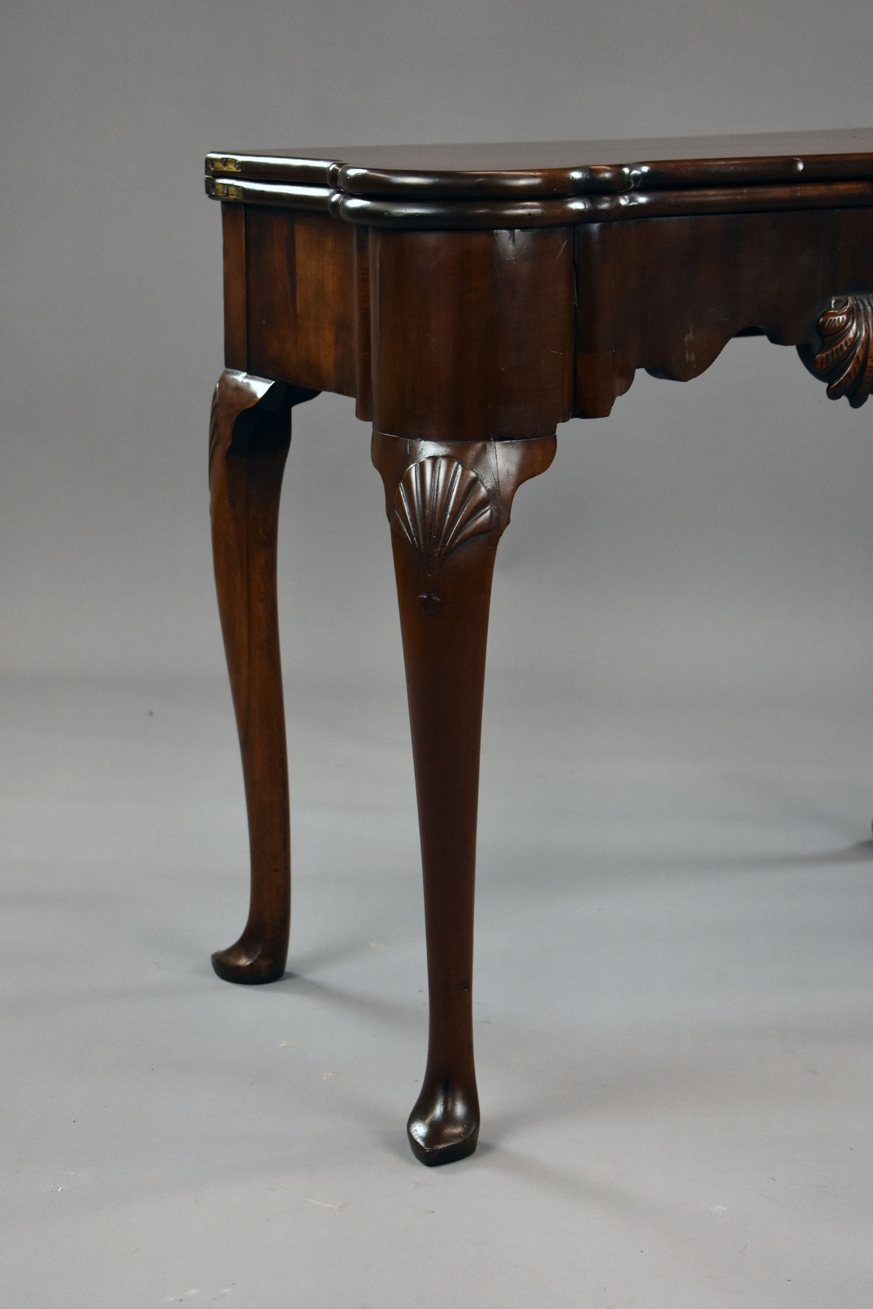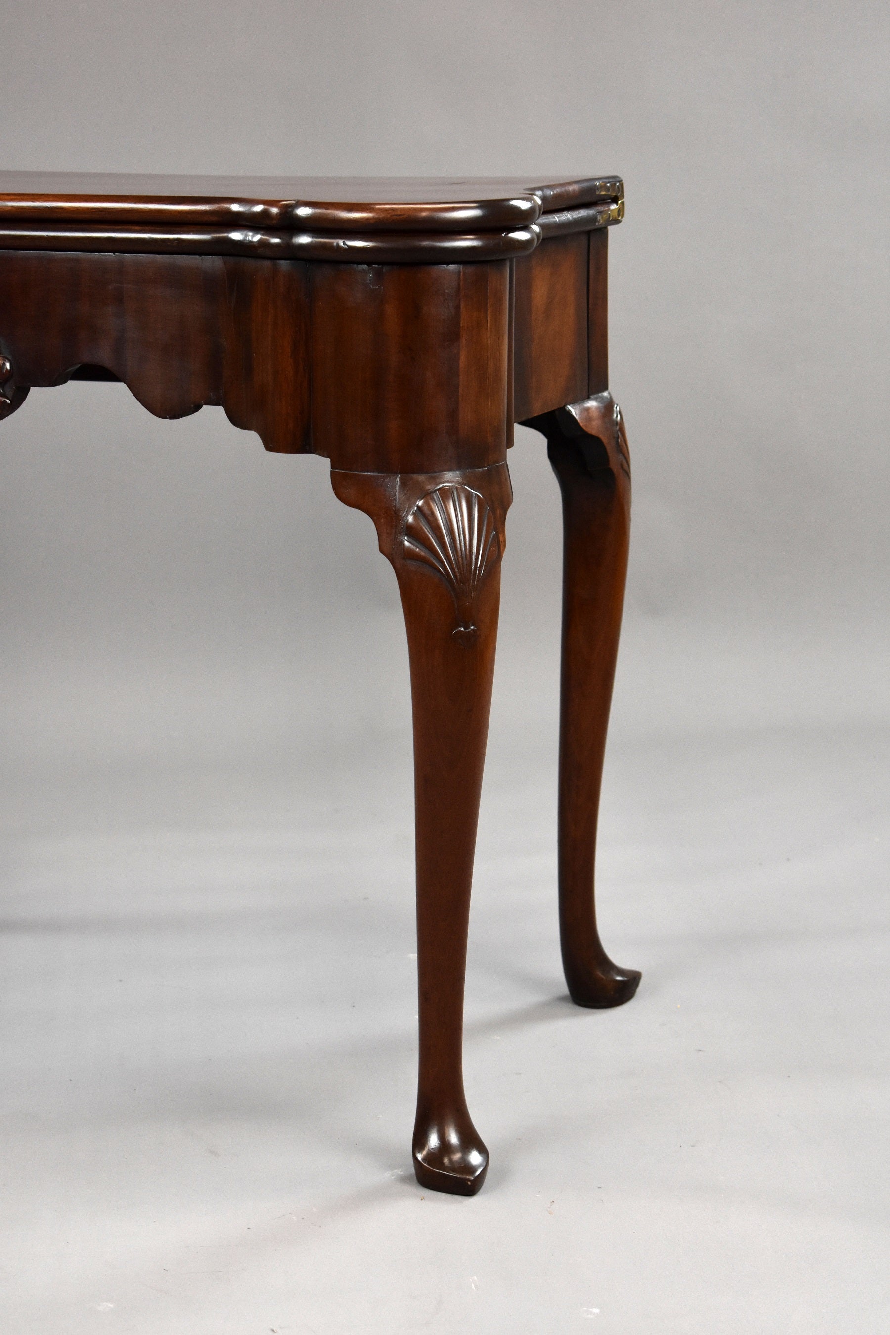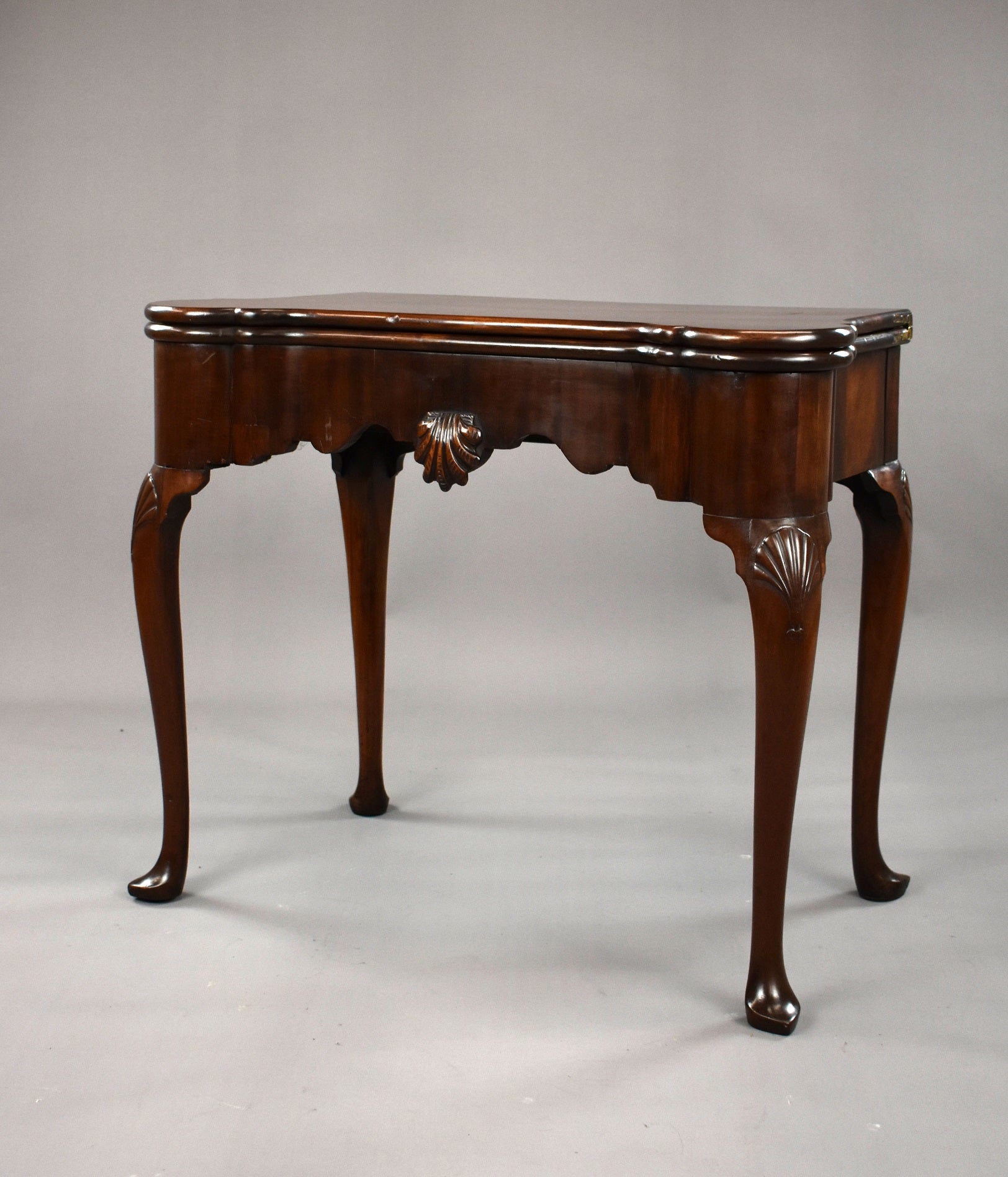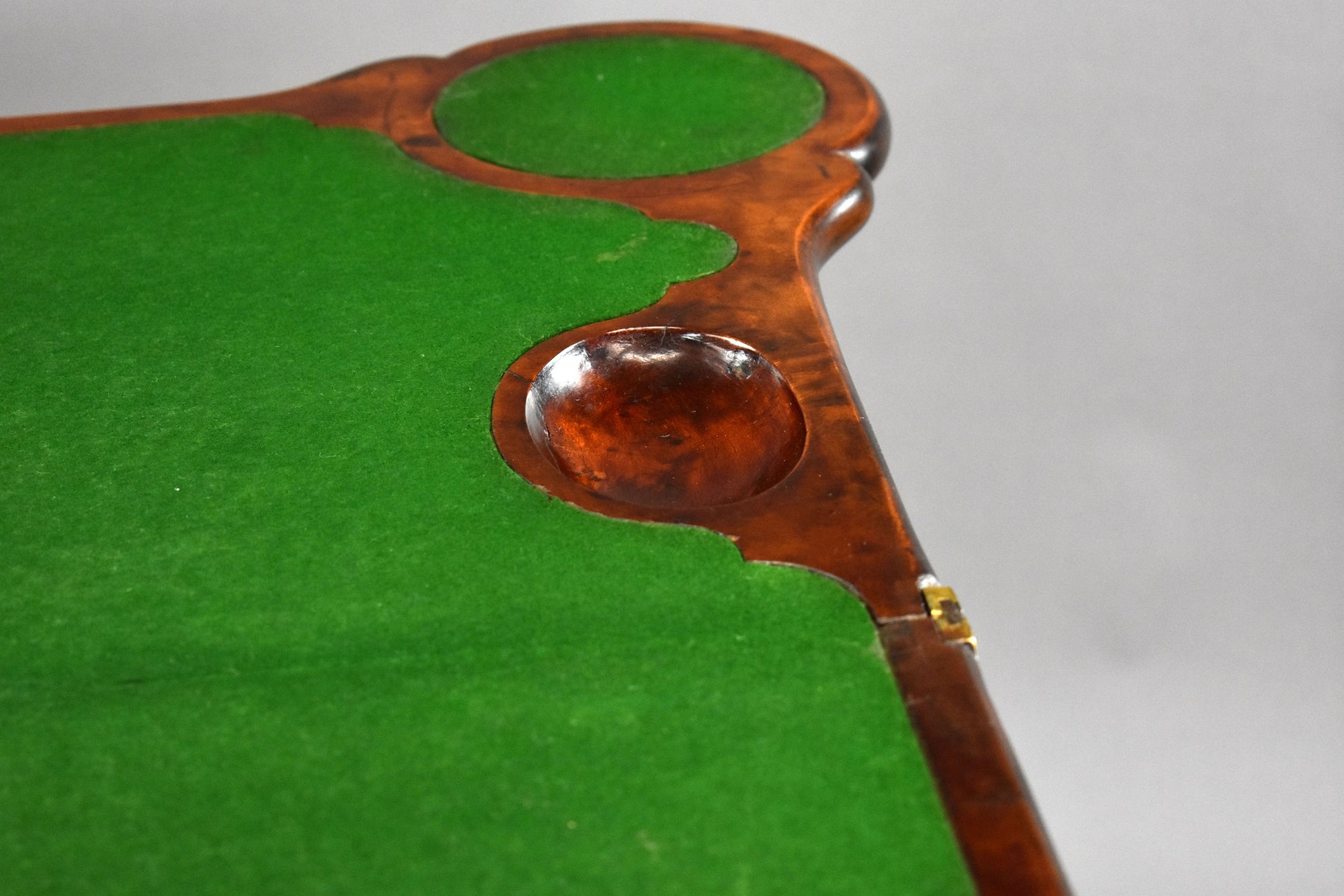 George II Irish Mahogany Card Table with carved scalloped shell on frieze, raised on shell carved cabriole legs on pad feet. The table opens to reveal a green baize lined playing surface inset with counter wells.