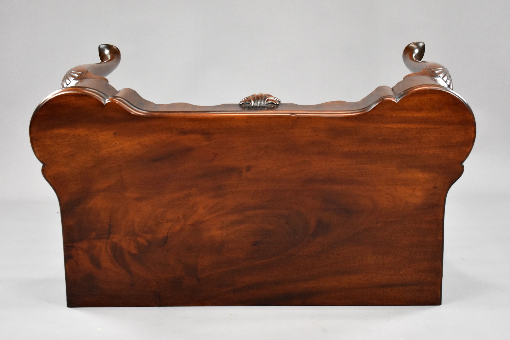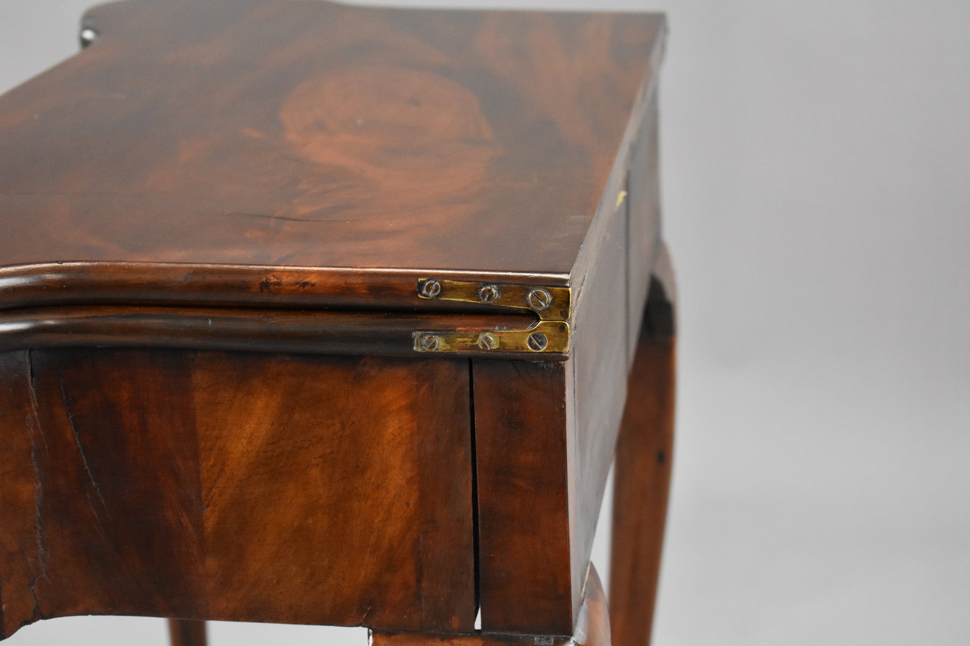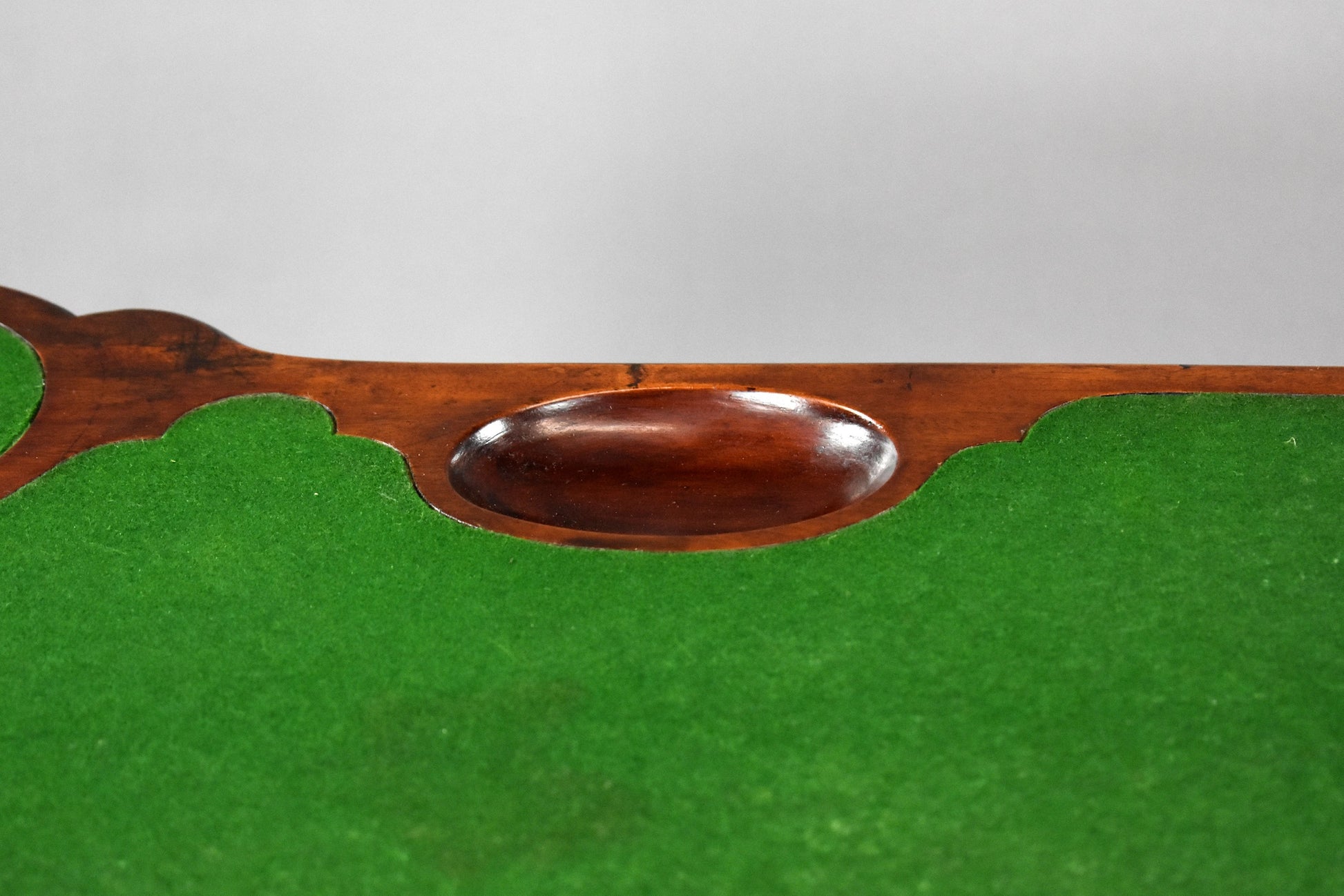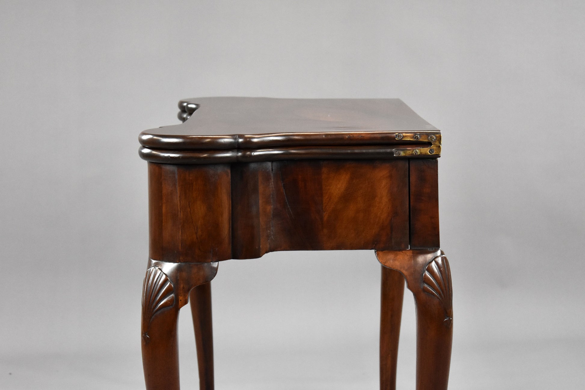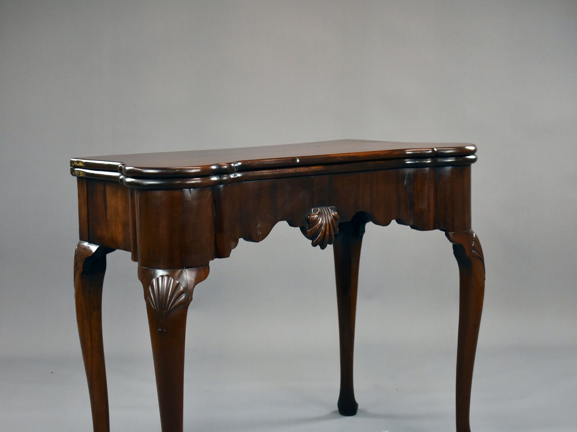 George II Irish Mahogany Card Table with carved scalloped shell on frieze, raised on shell carved cabriole legs on pad feet. The table opens to reveal a green baize lined playing surface inset with counter wells.