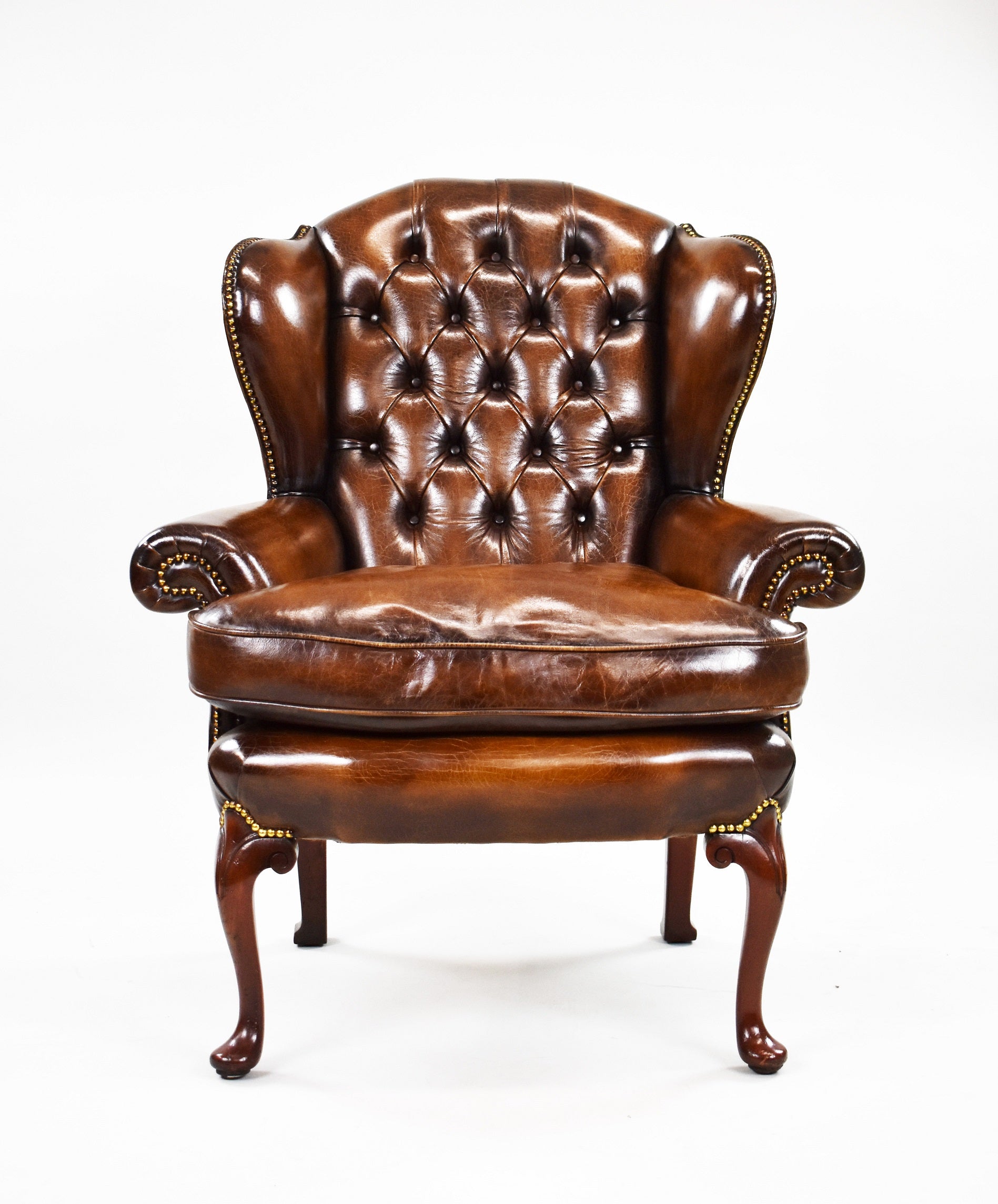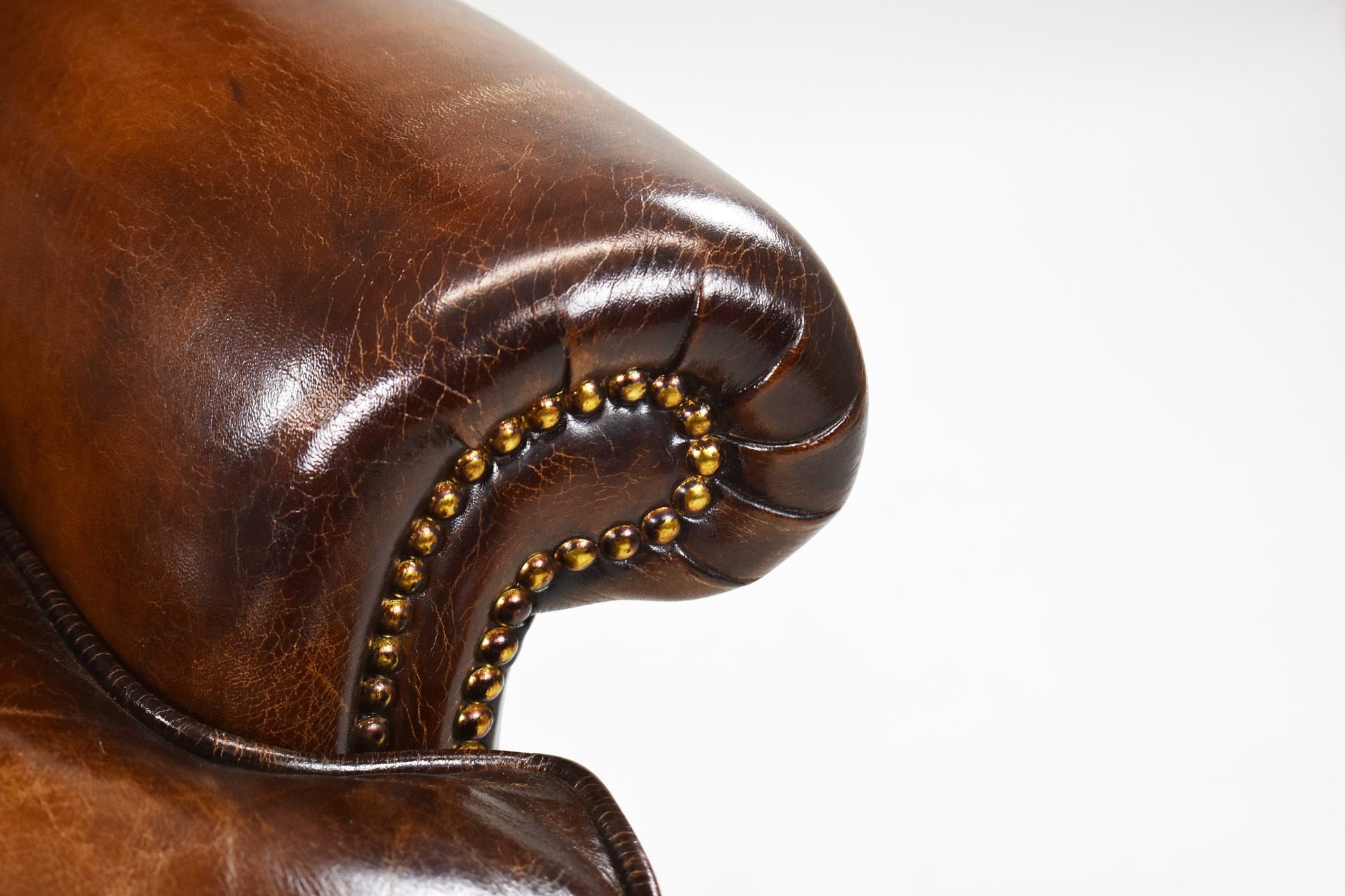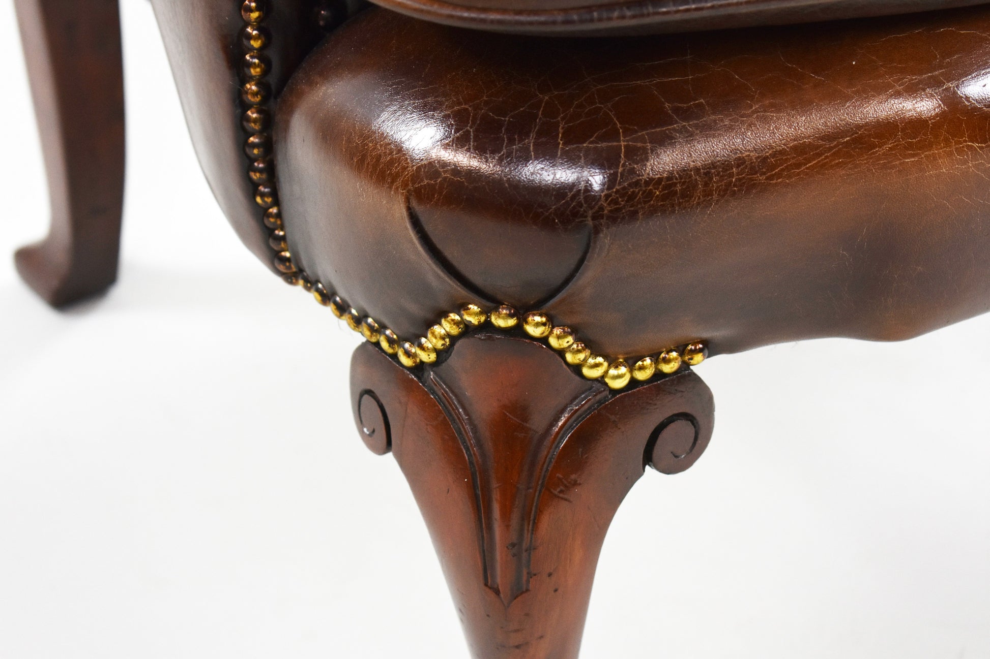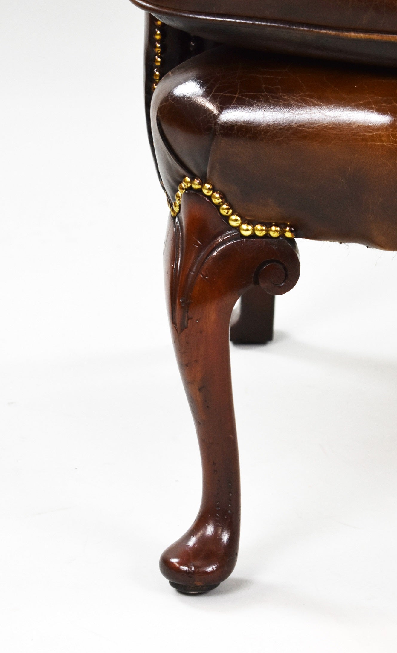 George II style antique mahogany armchair upholstered in a hand dyed brown leather with a buttoned back with scroll over arms, the chair has close studding to the top, sides and arms. Stands on cabriole legs.