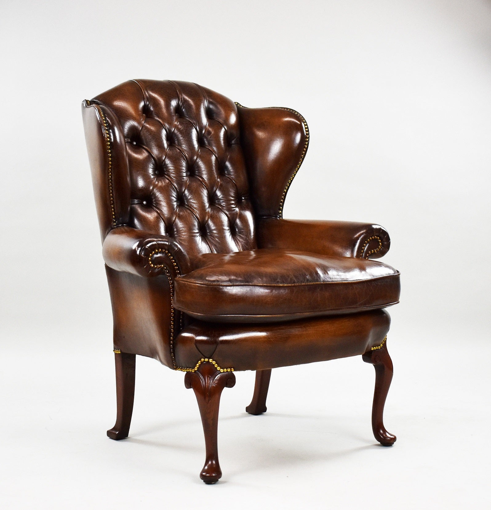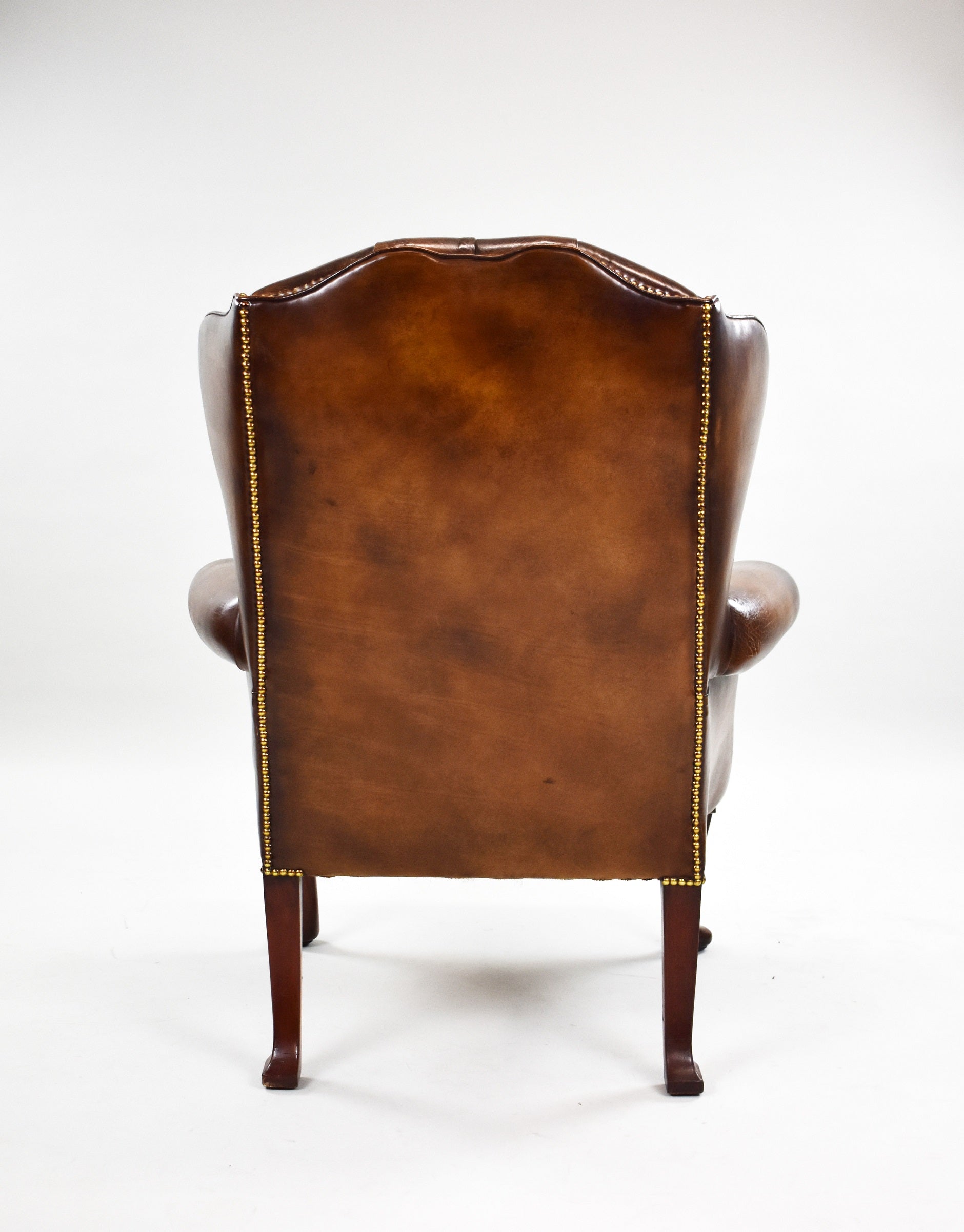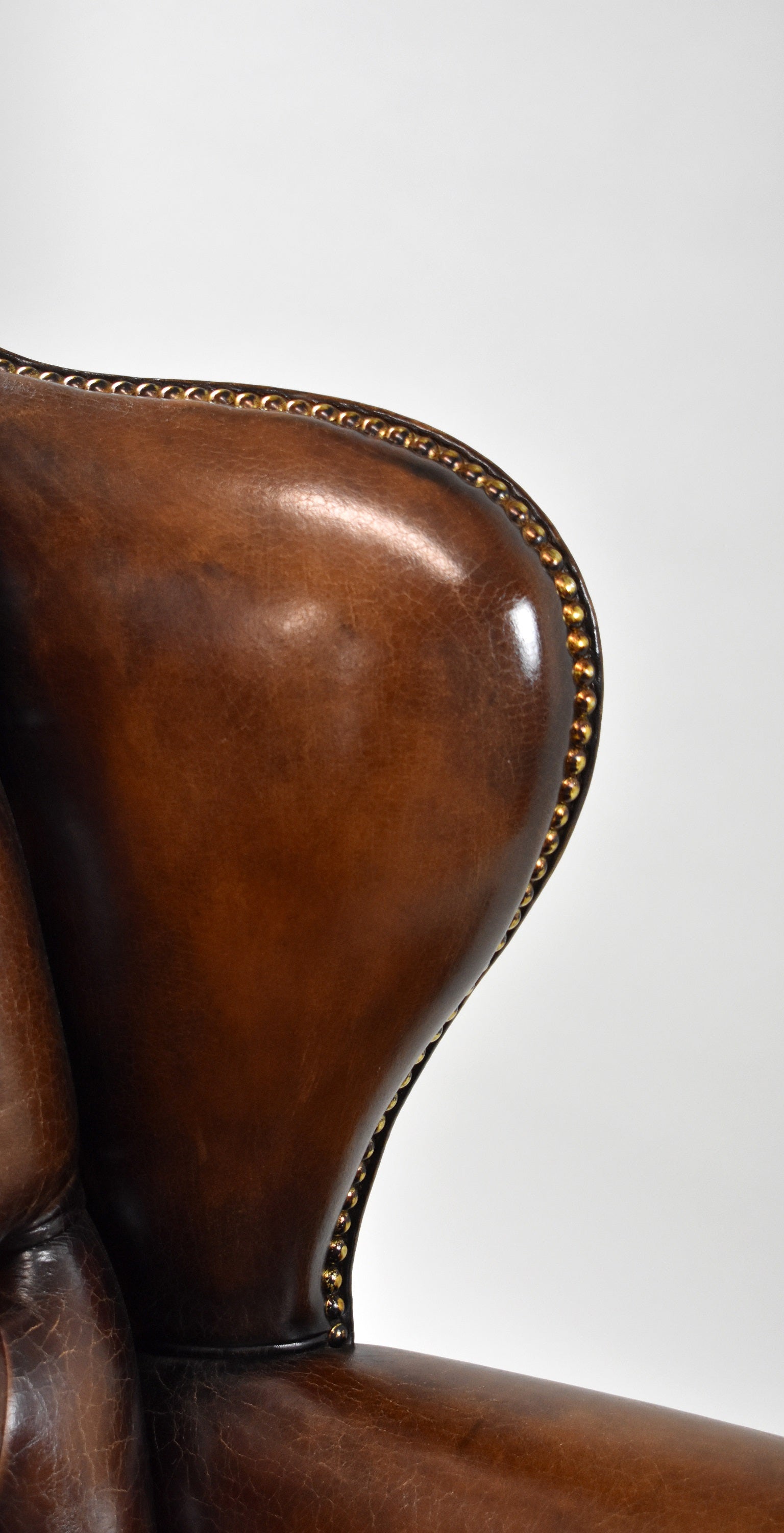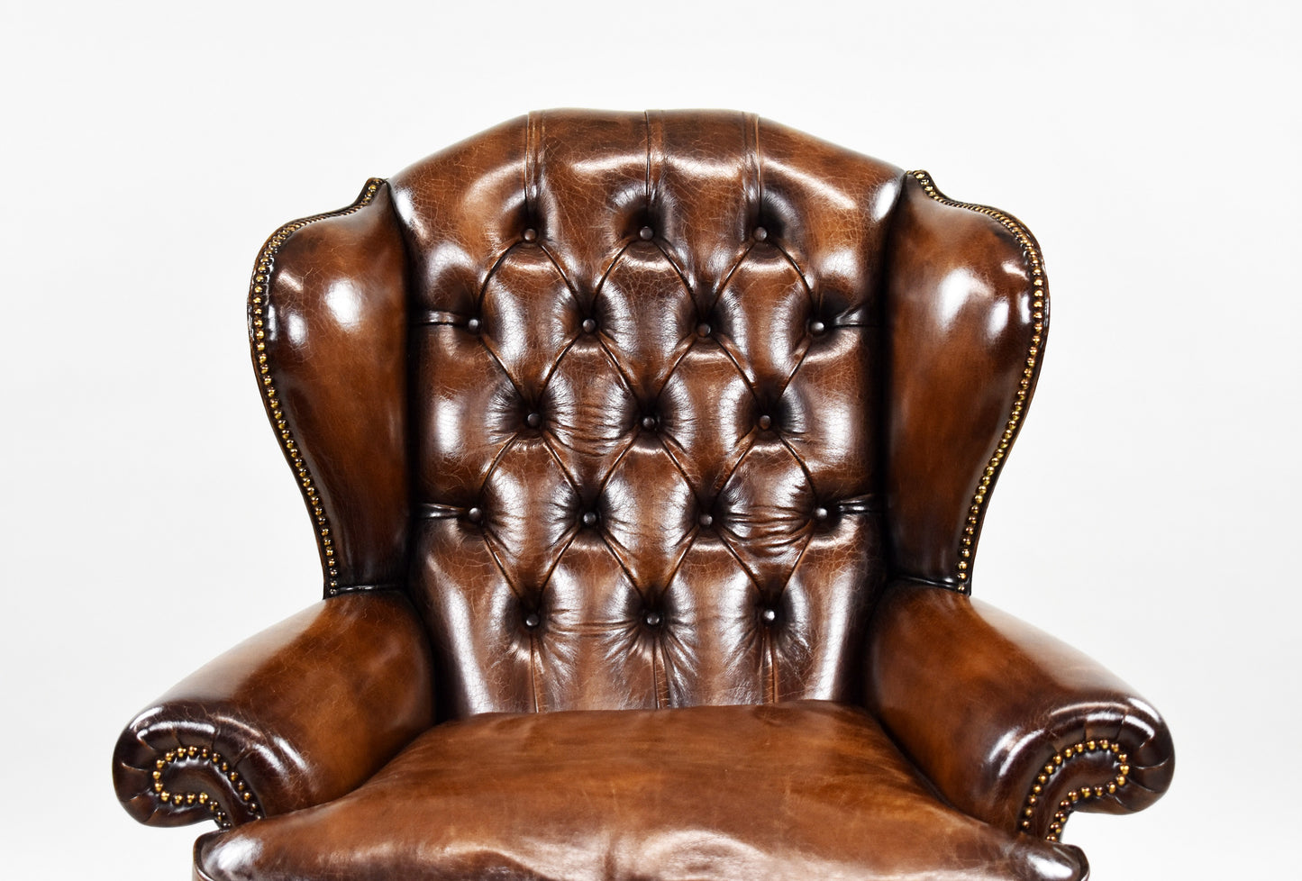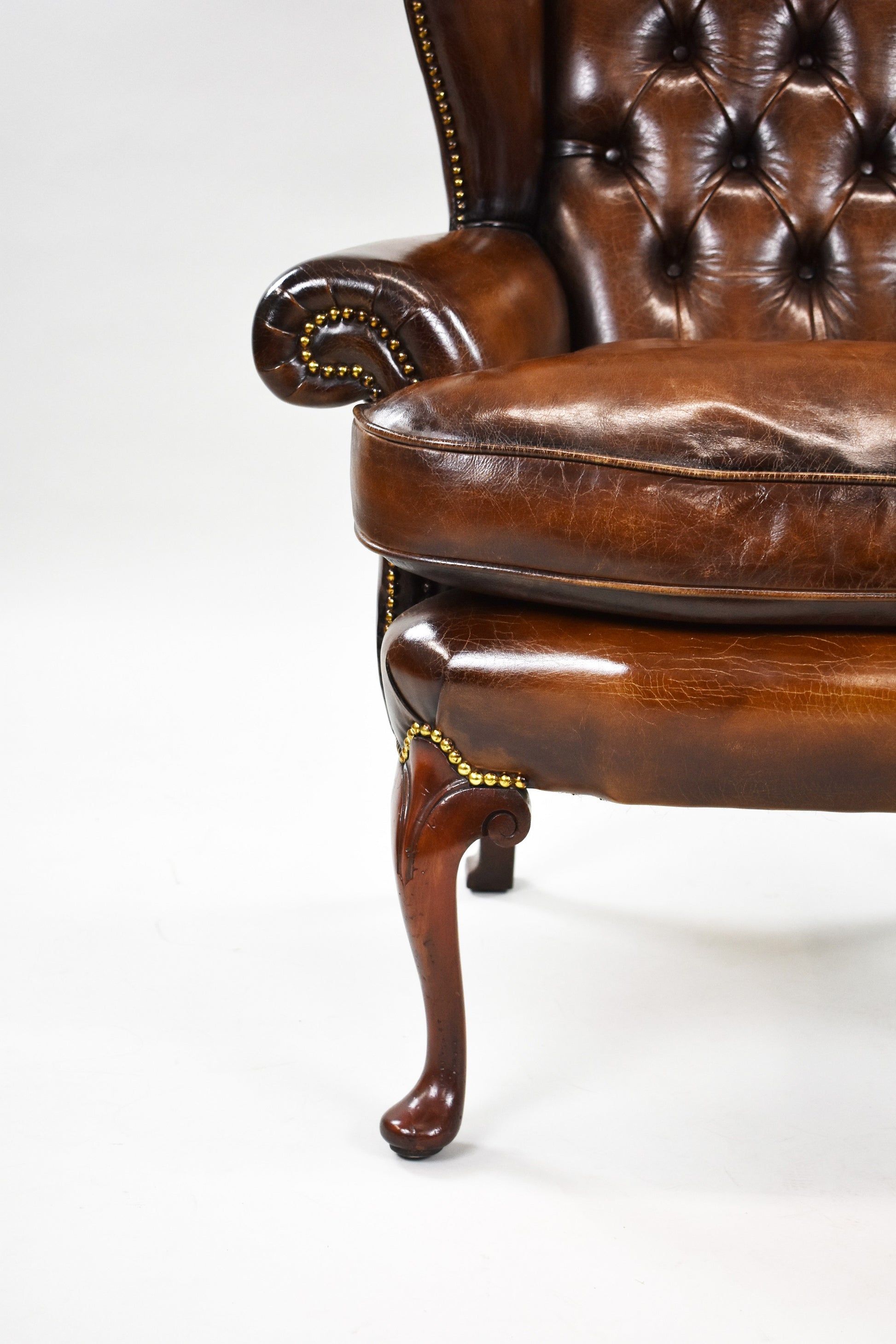 George II style antique mahogany armchair upholstered in a hand dyed brown leather with a buttoned back with scroll over arms, the chair has close studding to the top, sides and arms. Stands on cabriole legs.