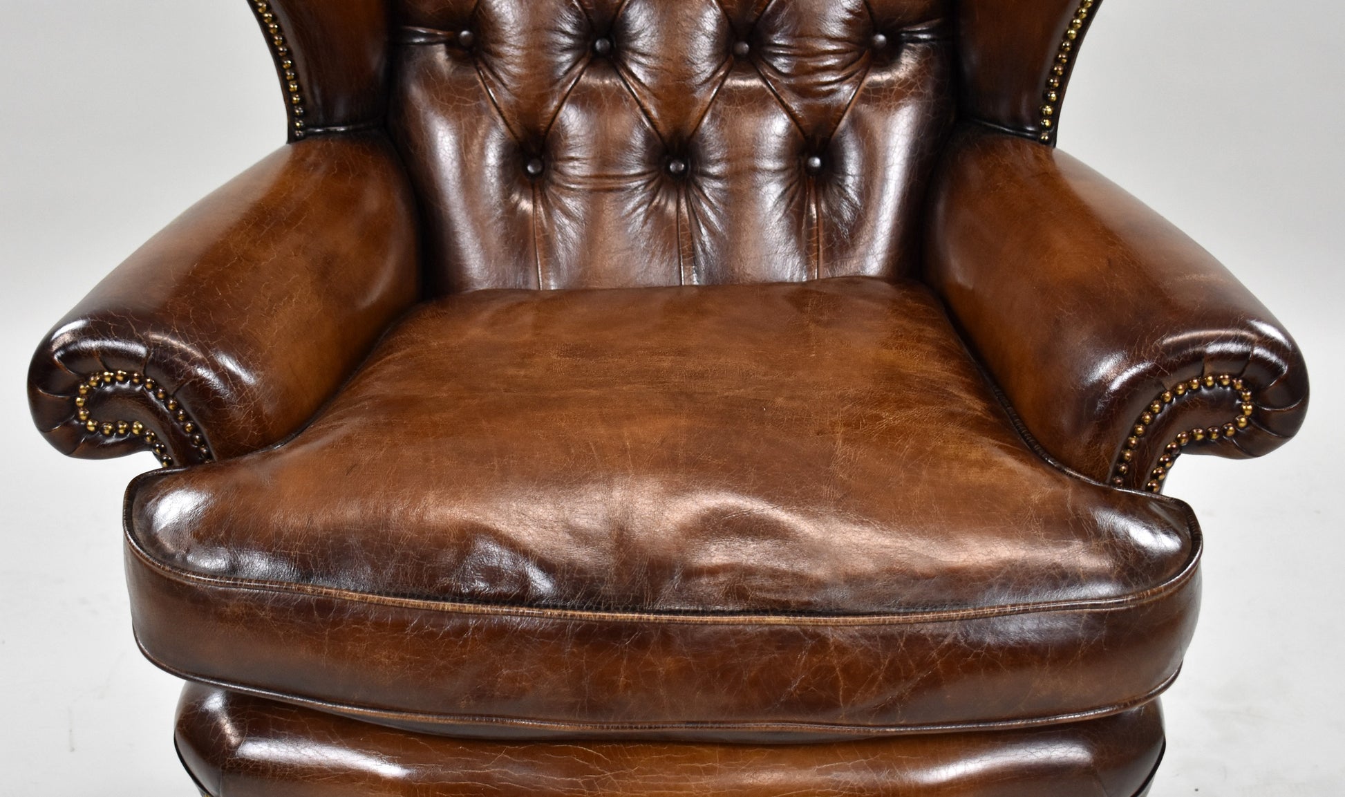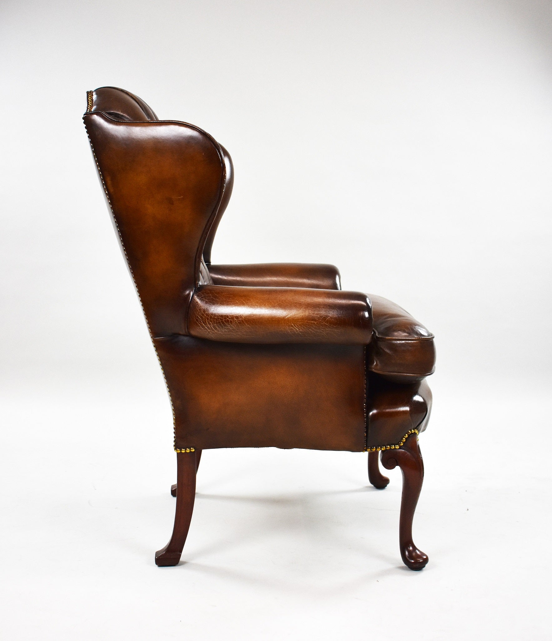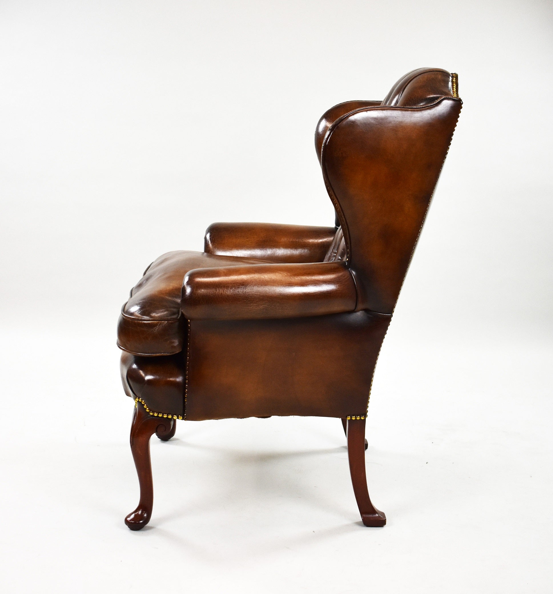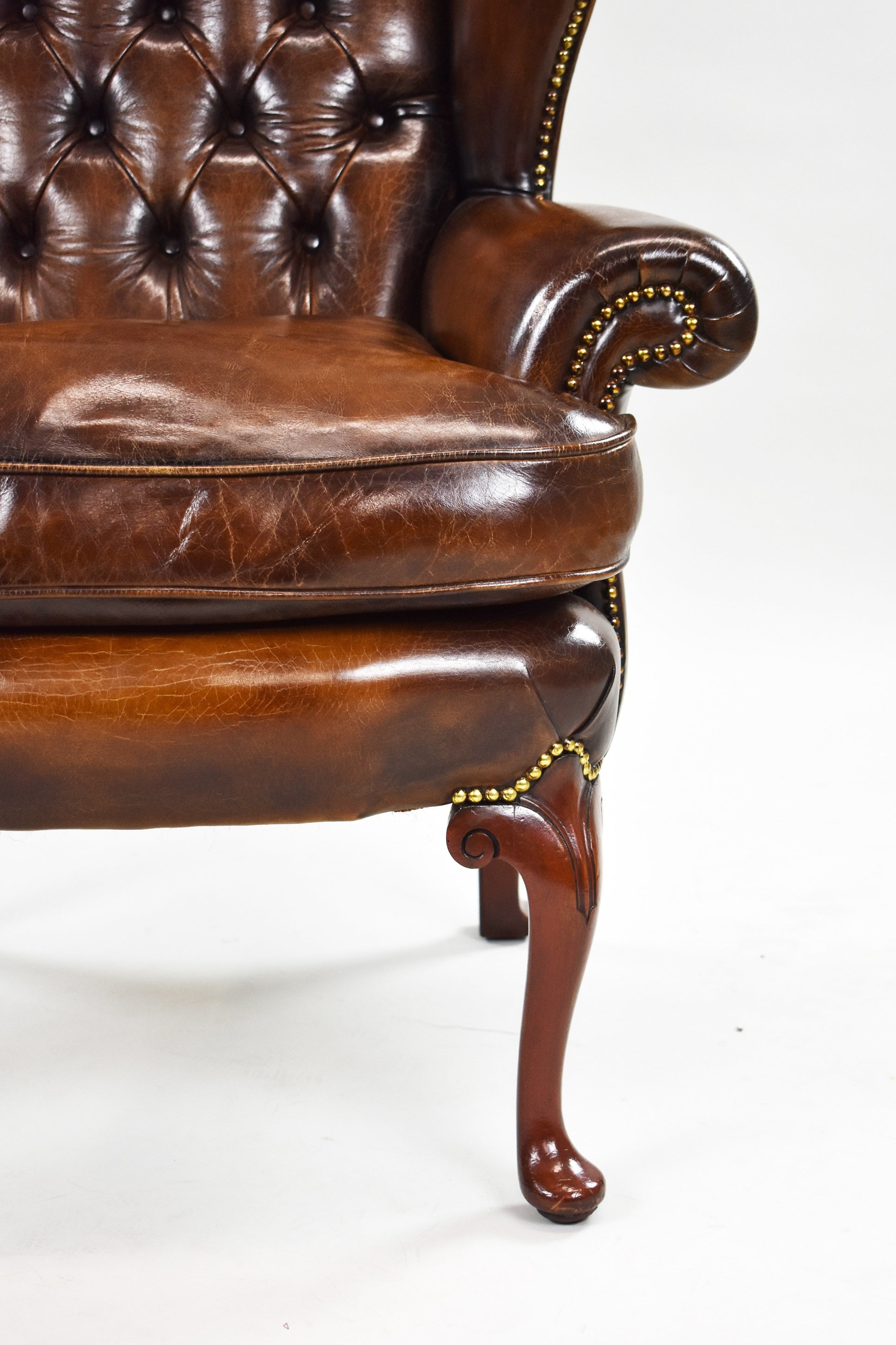 George II style antique mahogany armchair upholstered in a hand dyed brown leather with a buttoned back with scroll over arms, the chair has close studding to the top, sides and arms. Stands on cabriole legs.