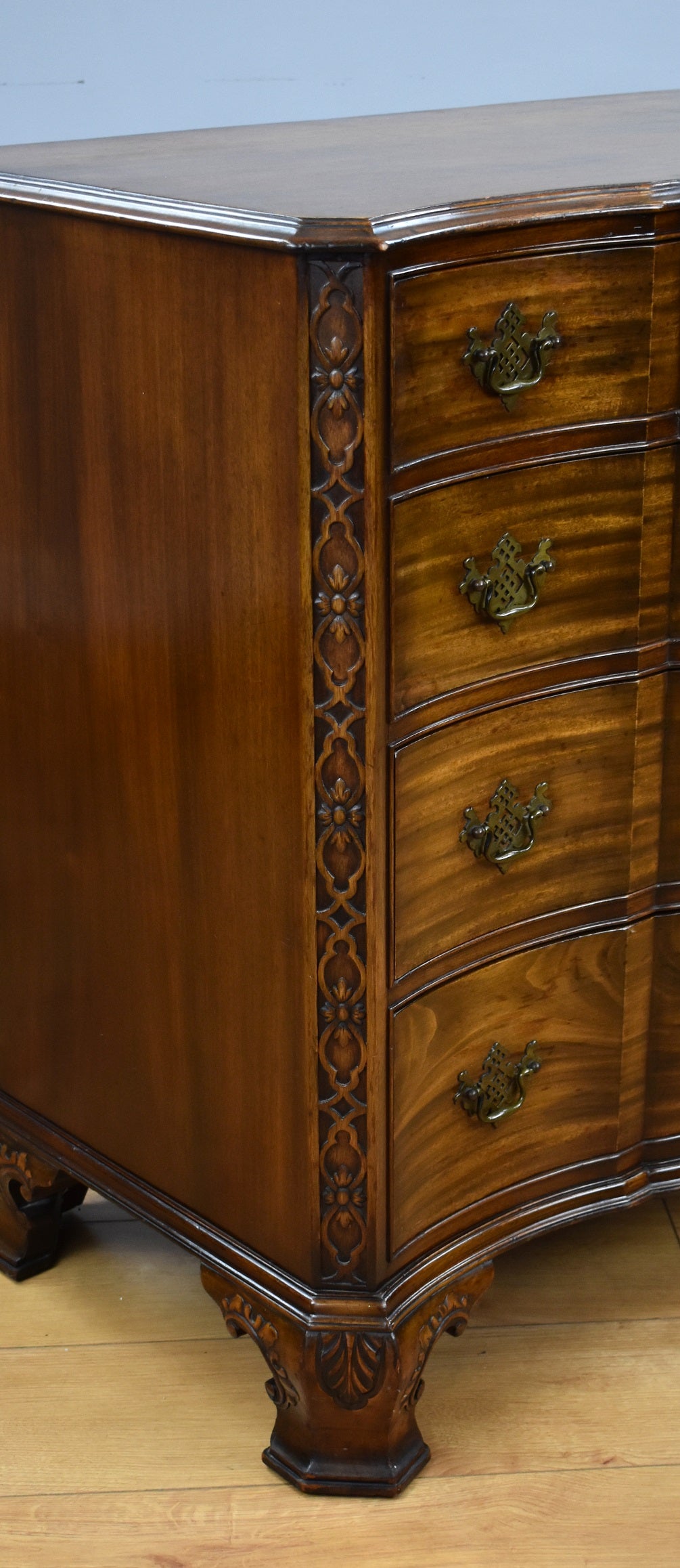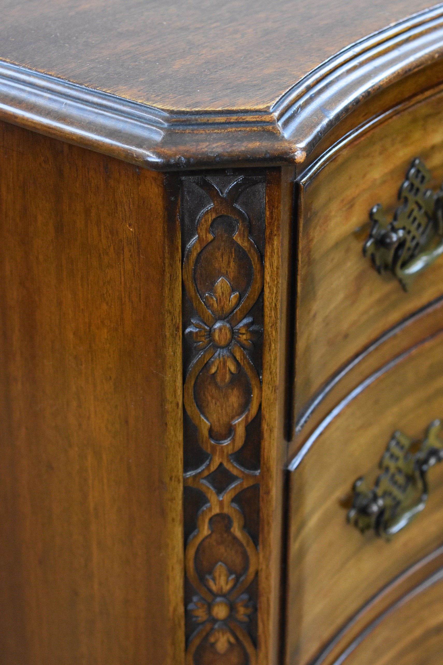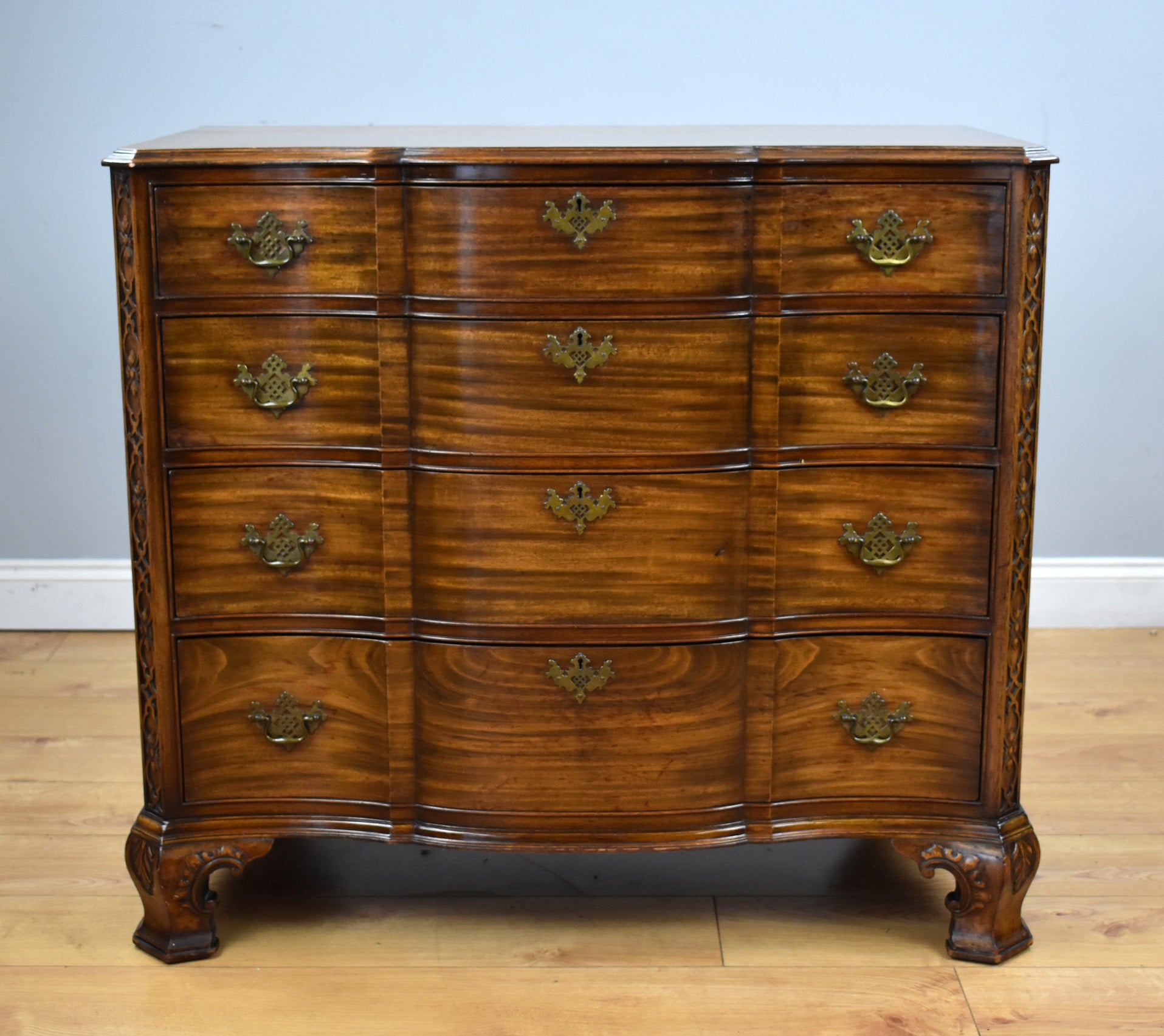 George iii Style "Waring and Gillow Ltd" mahogany serpentine chest of drawers in good condition with four oak lined drawers with drop handles, with decorative canted corners and stands on shaped carved feet.