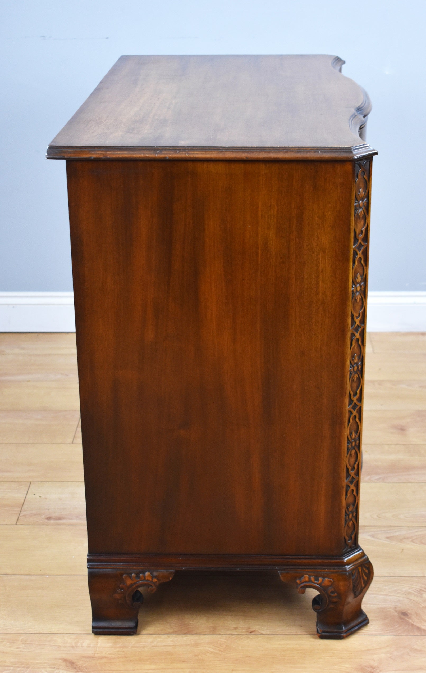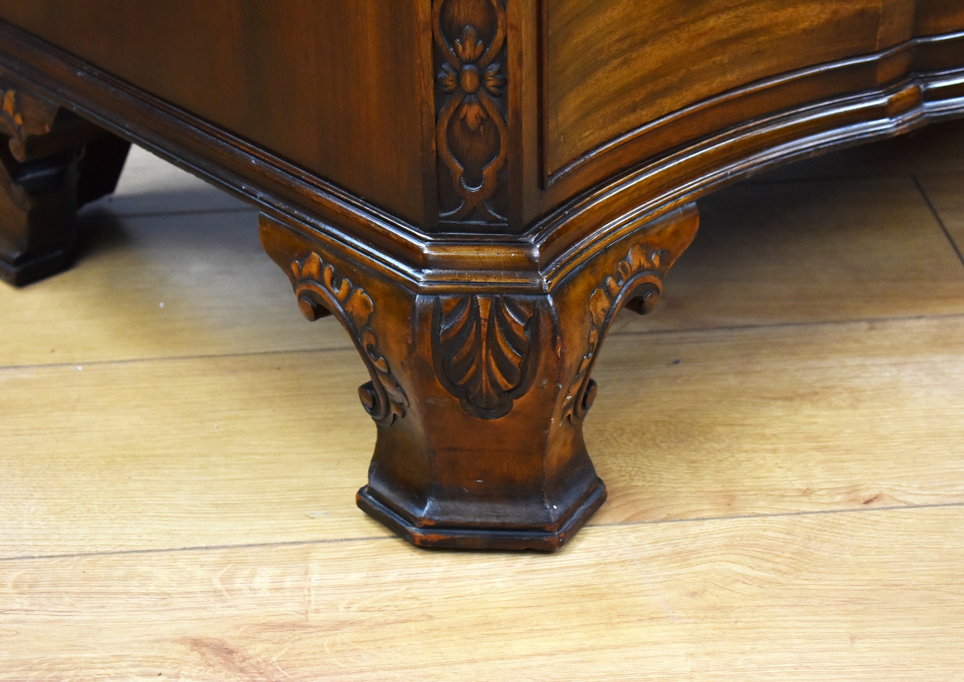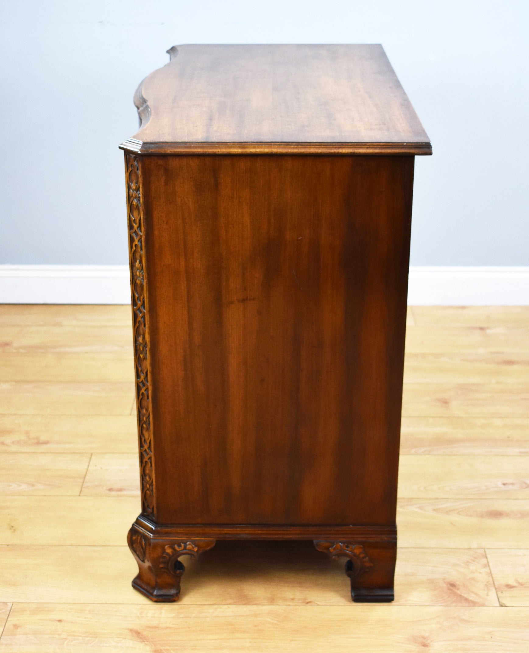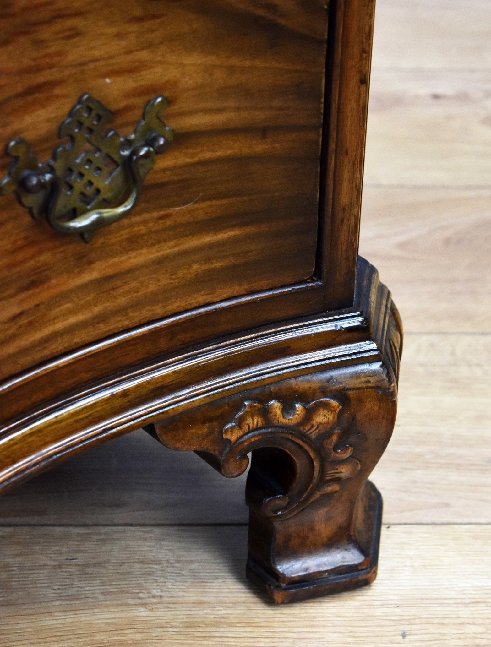 George iii Style "Waring and Gillow Ltd" mahogany serpentine chest of drawers in good condition with four oak lined drawers with drop handles, with decorative canted corners and stands on shaped carved feet.