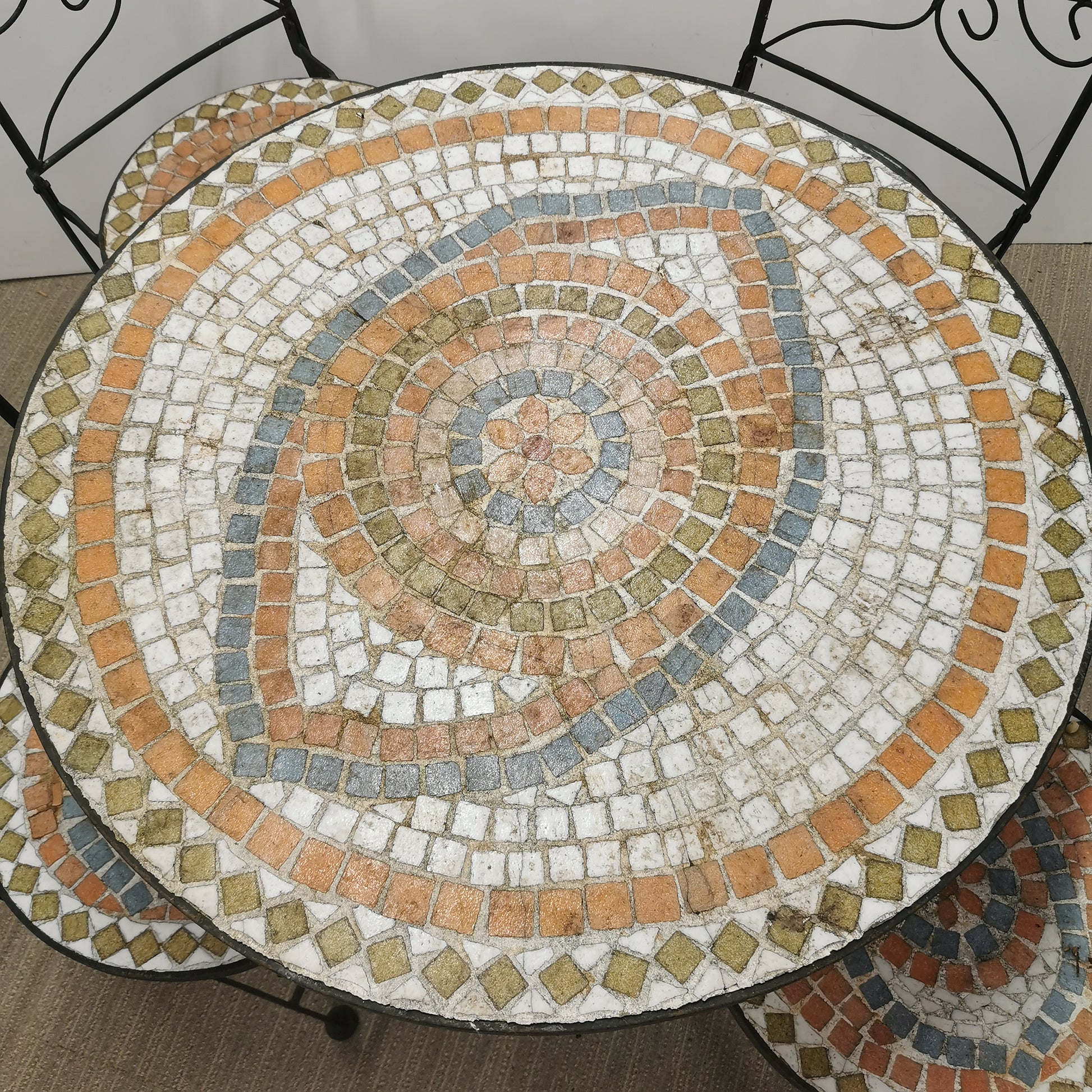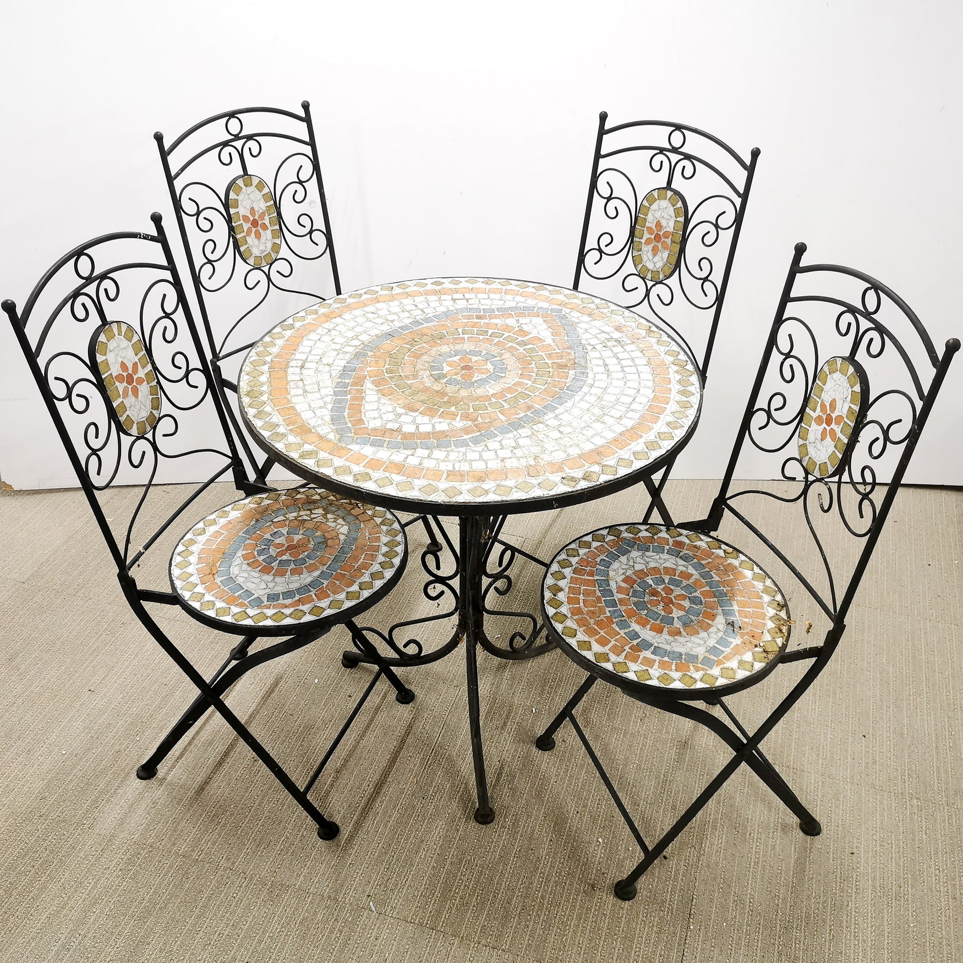 Iron and Mosaic Garden Table and Four chairs, the table and chairs do need a clean and the chairs are folding chairs and the table can lift of the base for transport. One chair has two small pieces mosaic missing and another chair has one piece missing. The table top has a slight chip mosaic missing.