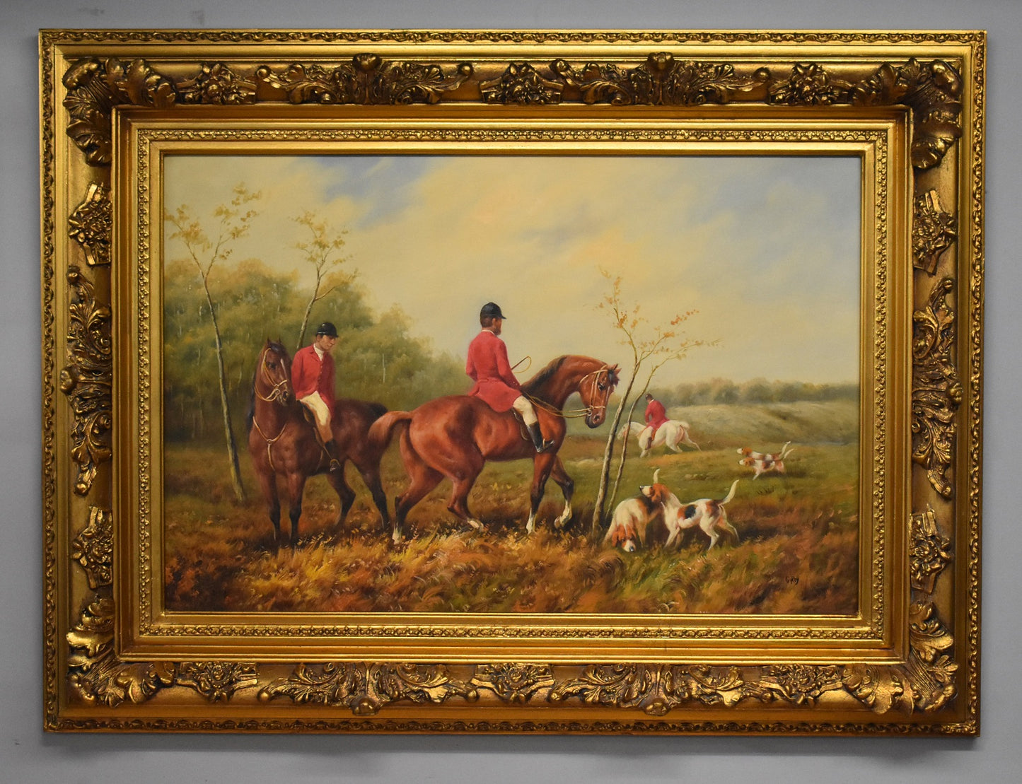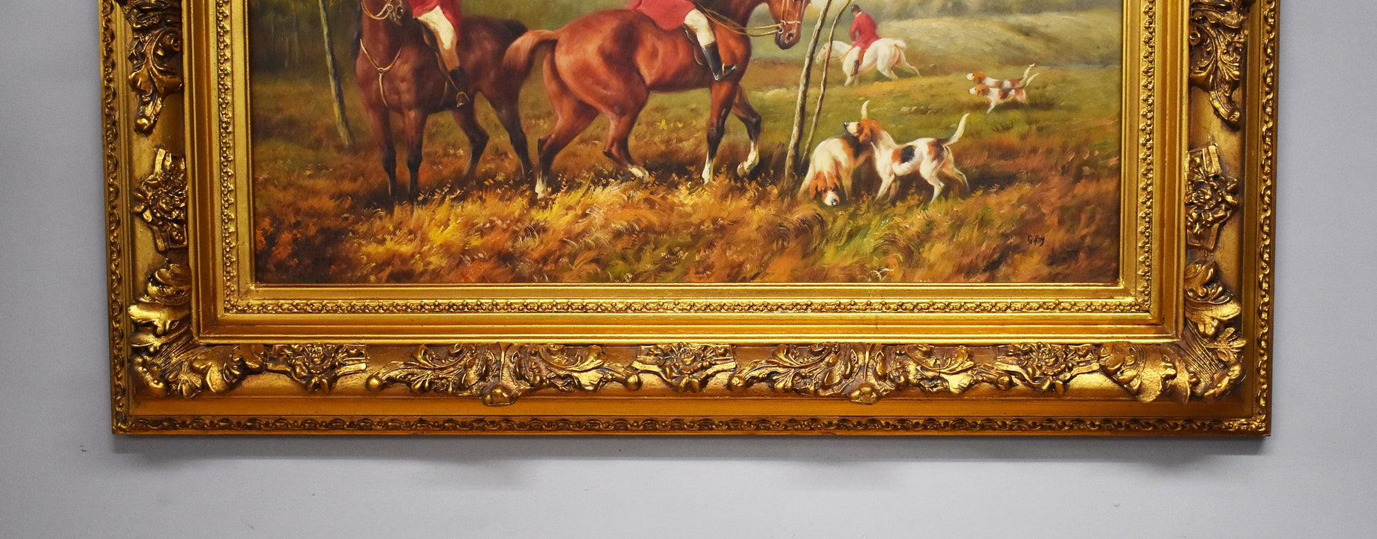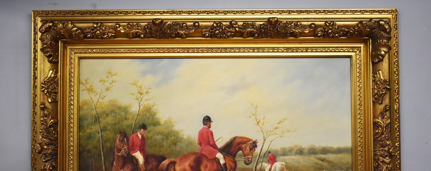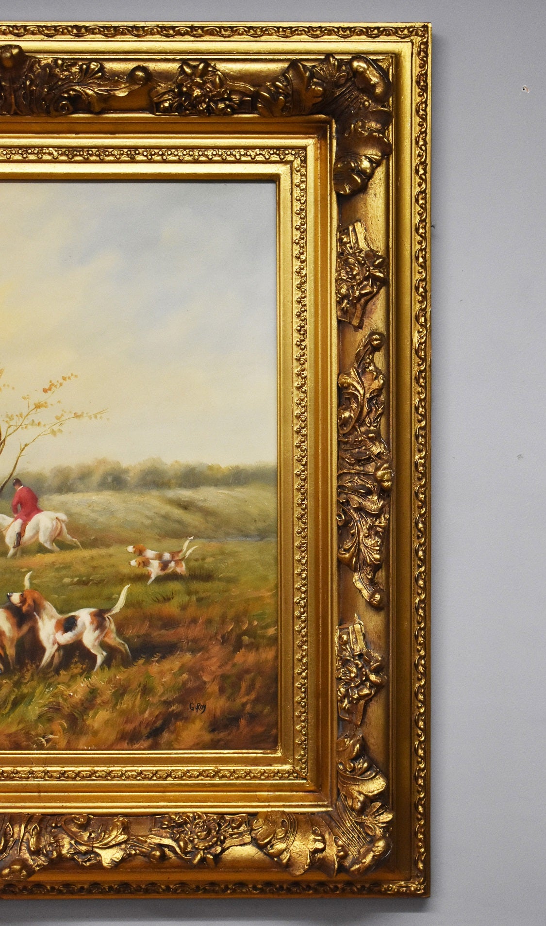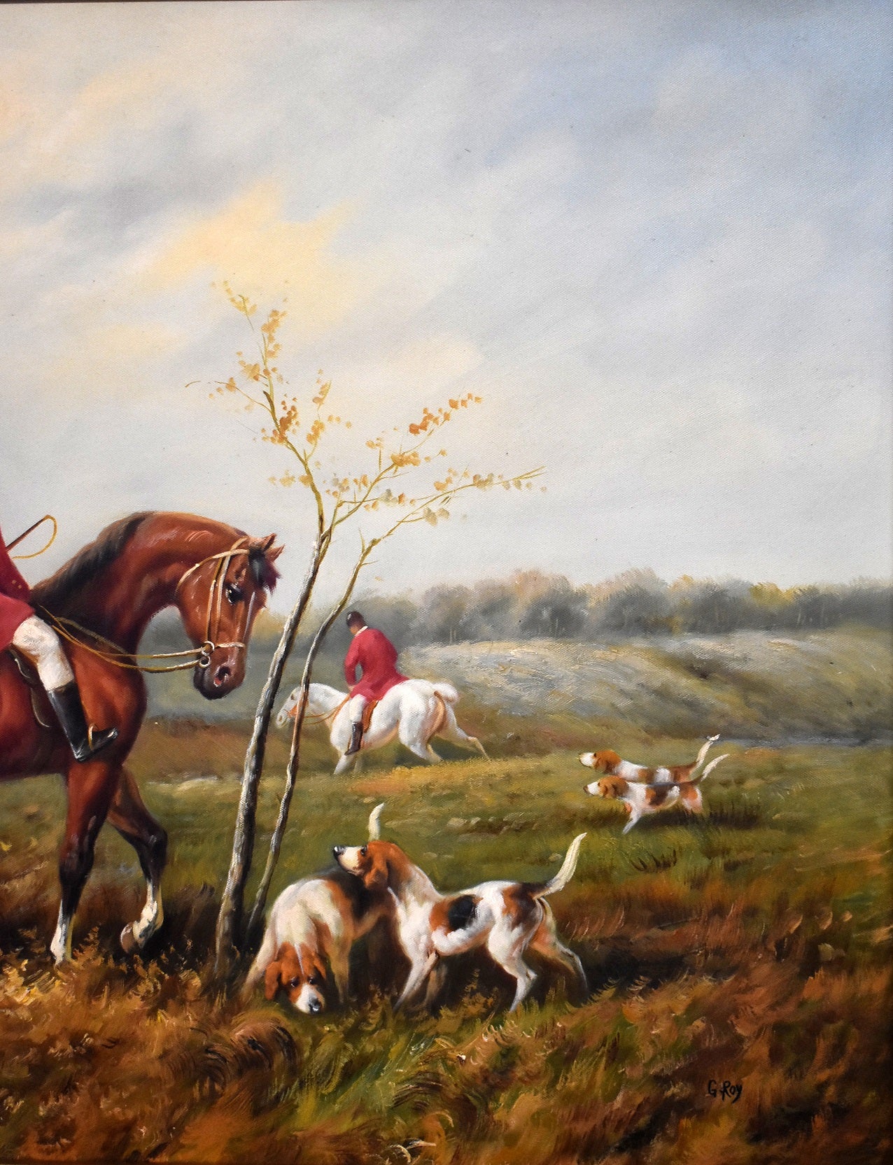 Large Huntsman and Hounds canvas painting by G.Roy signature in bottom righthand corner. The painting is in good condition with an ornate frame.