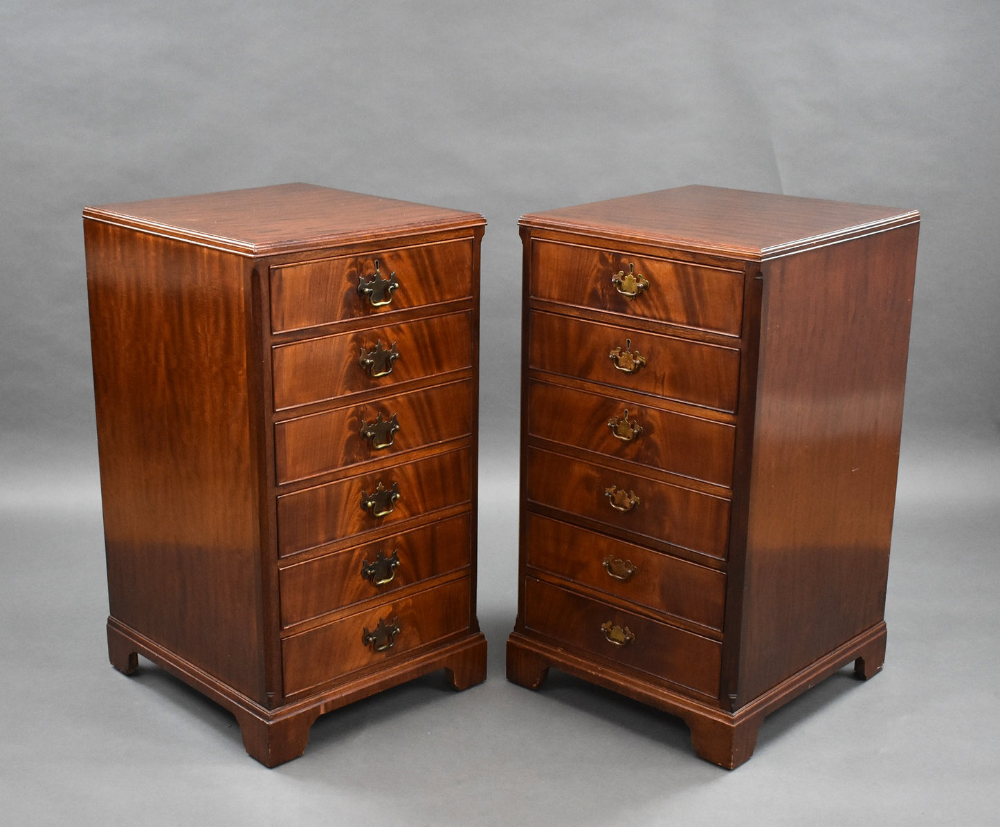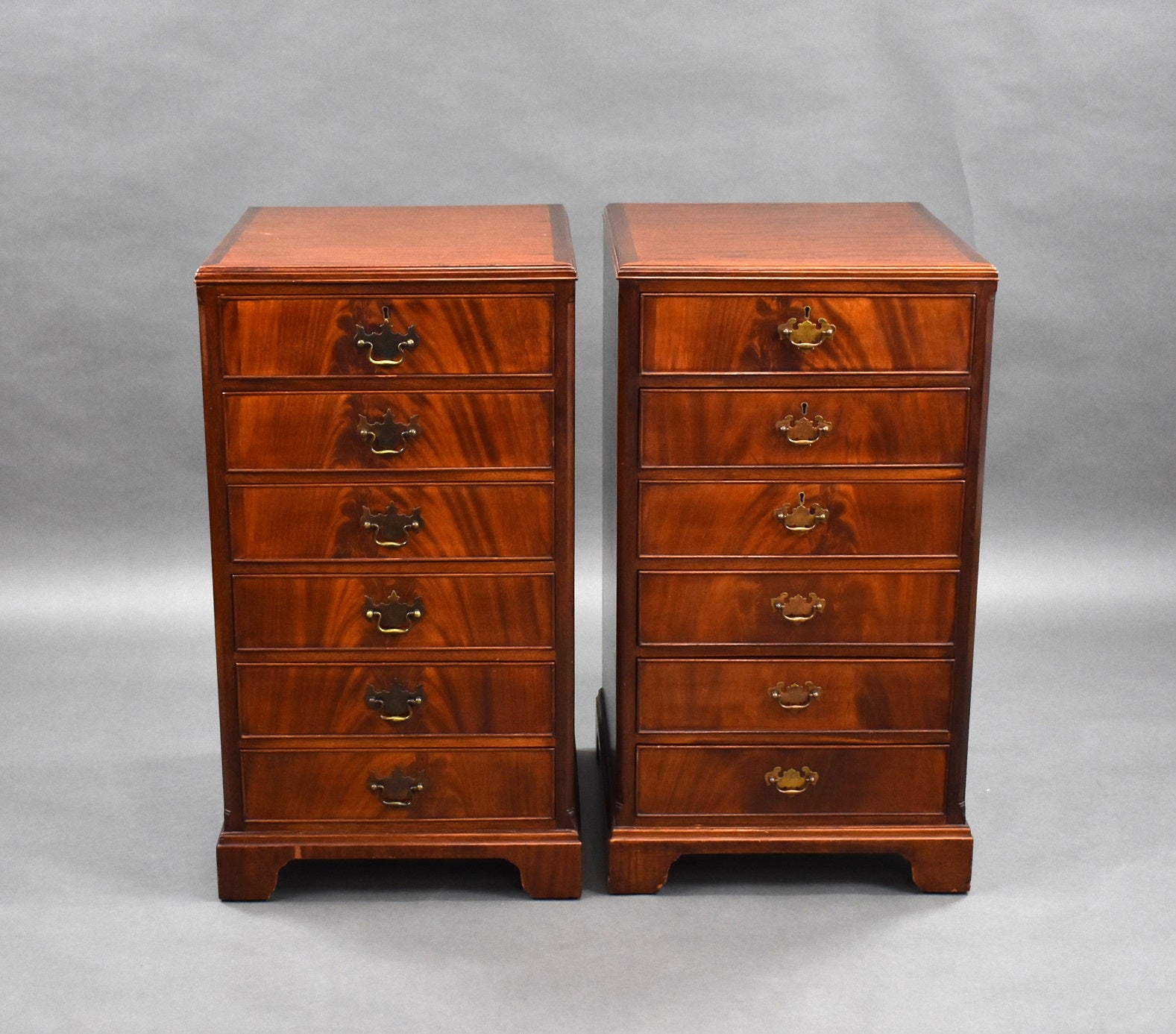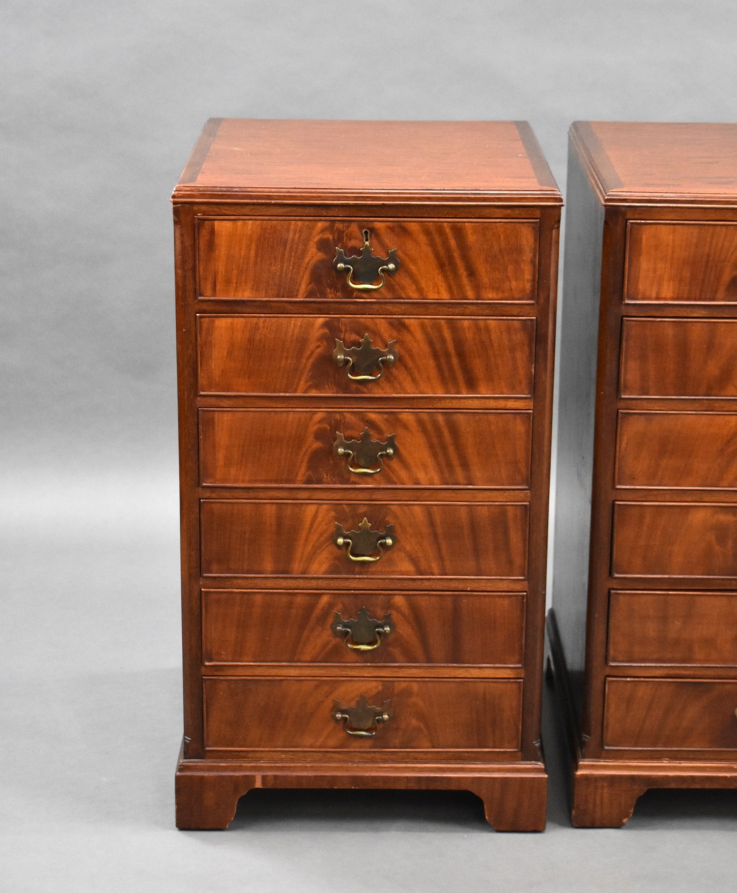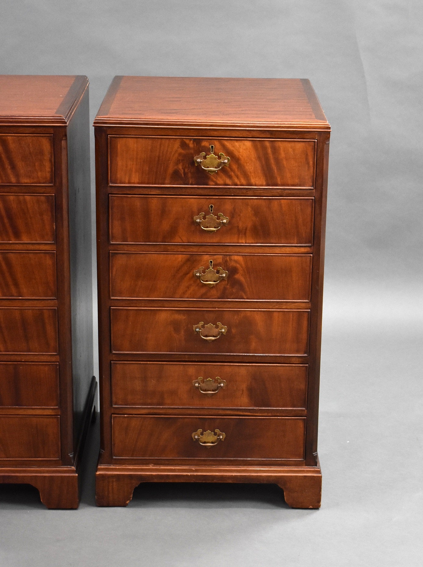 Near pair of large mahogany bedside chests with six drawers with drop handles, one chest has larger handles than the other.