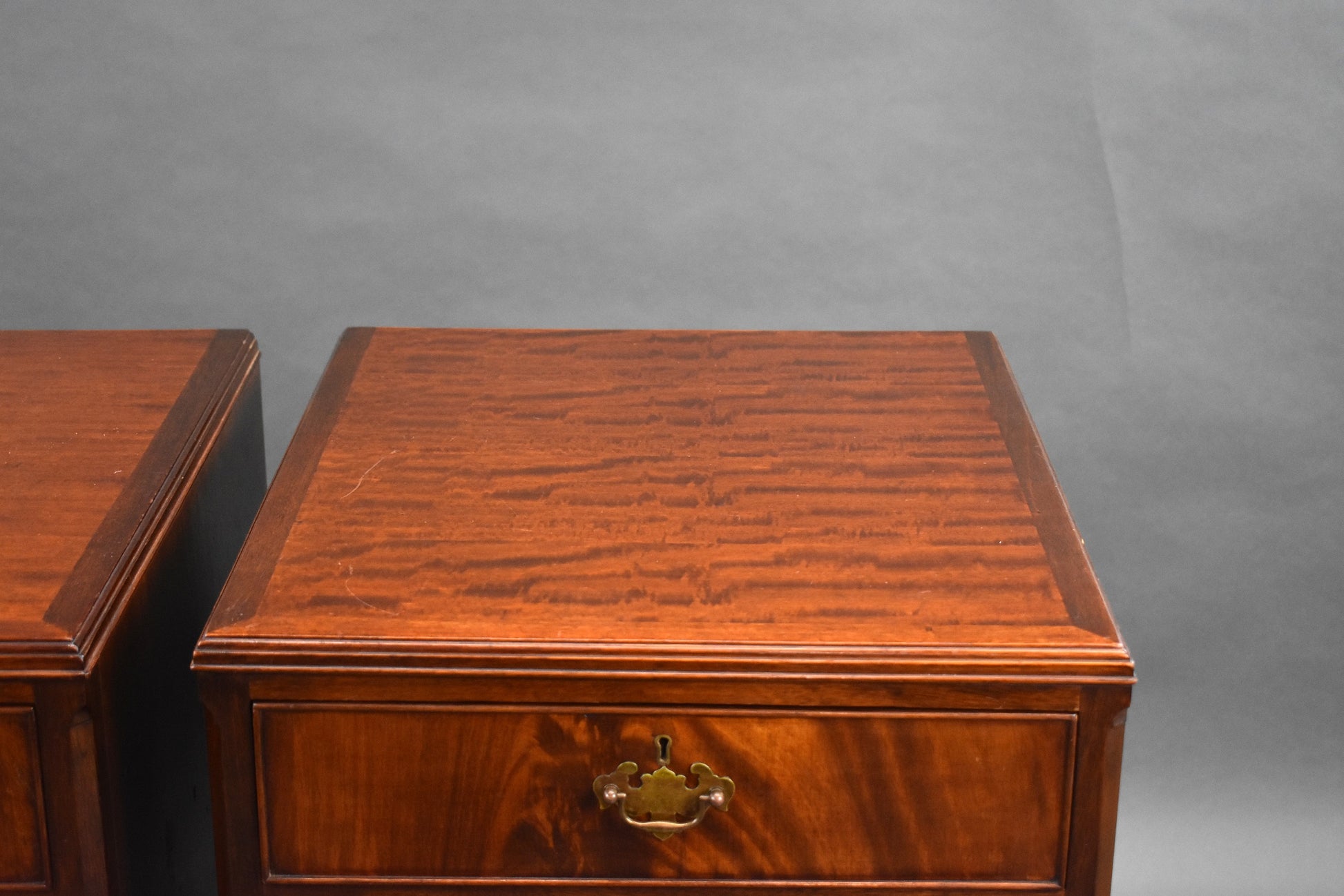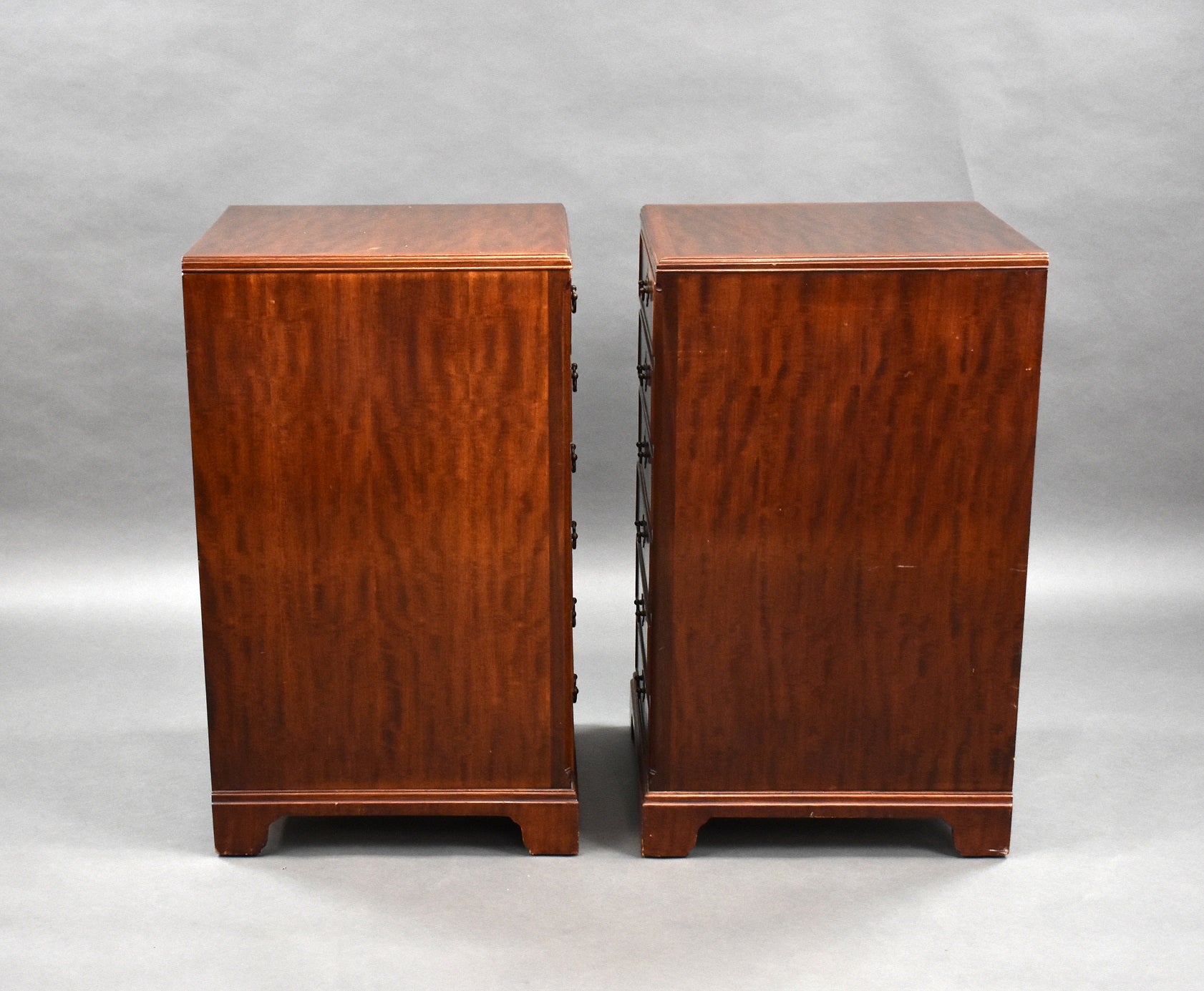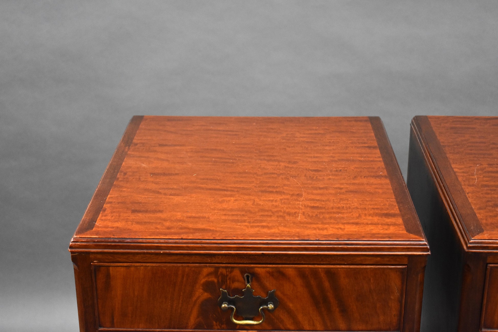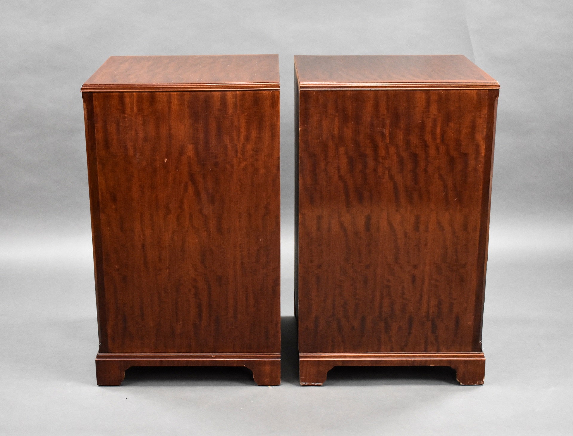 Near pair of large mahogany bedside chests with six drawers with drop handles, one chest has larger handles than the other.