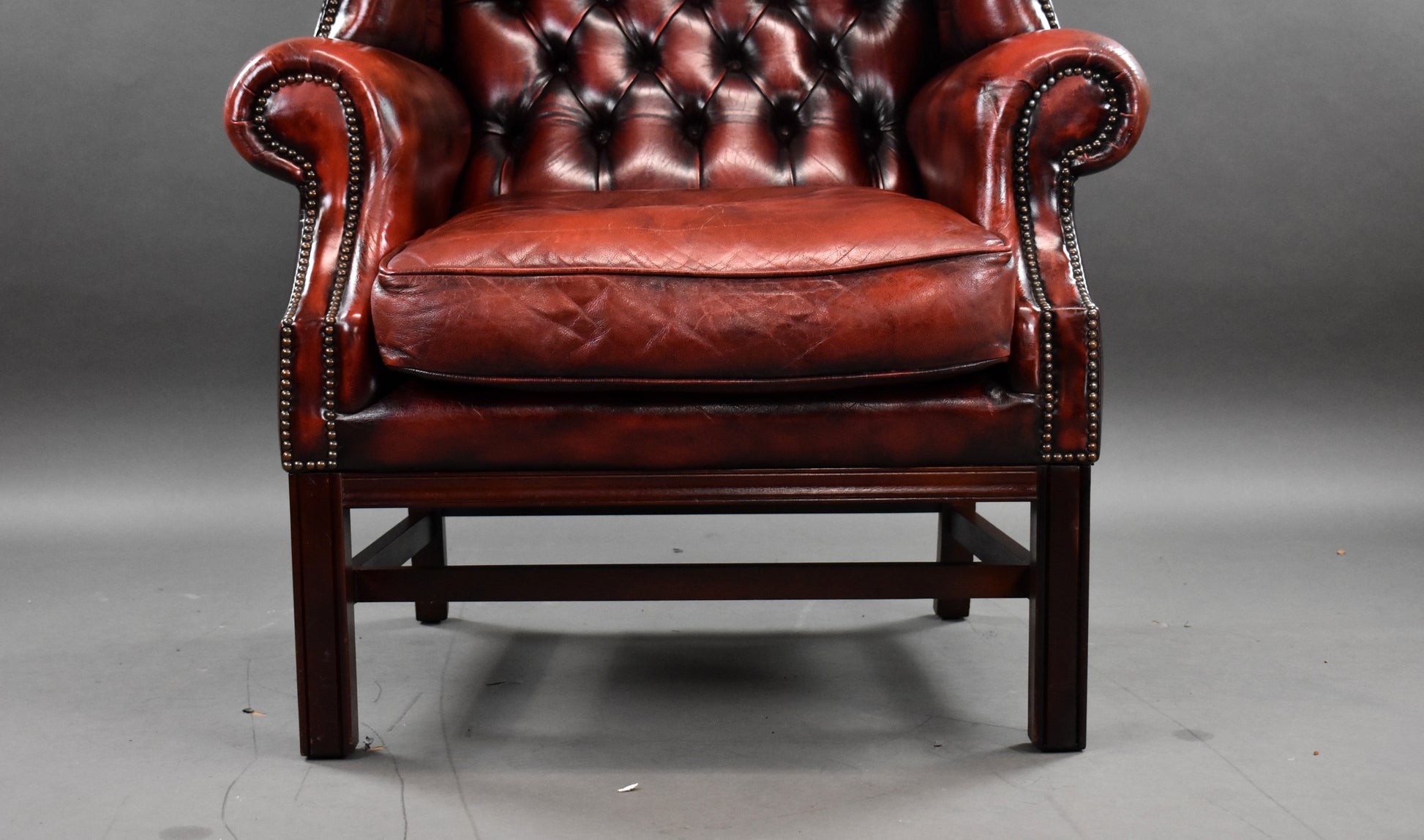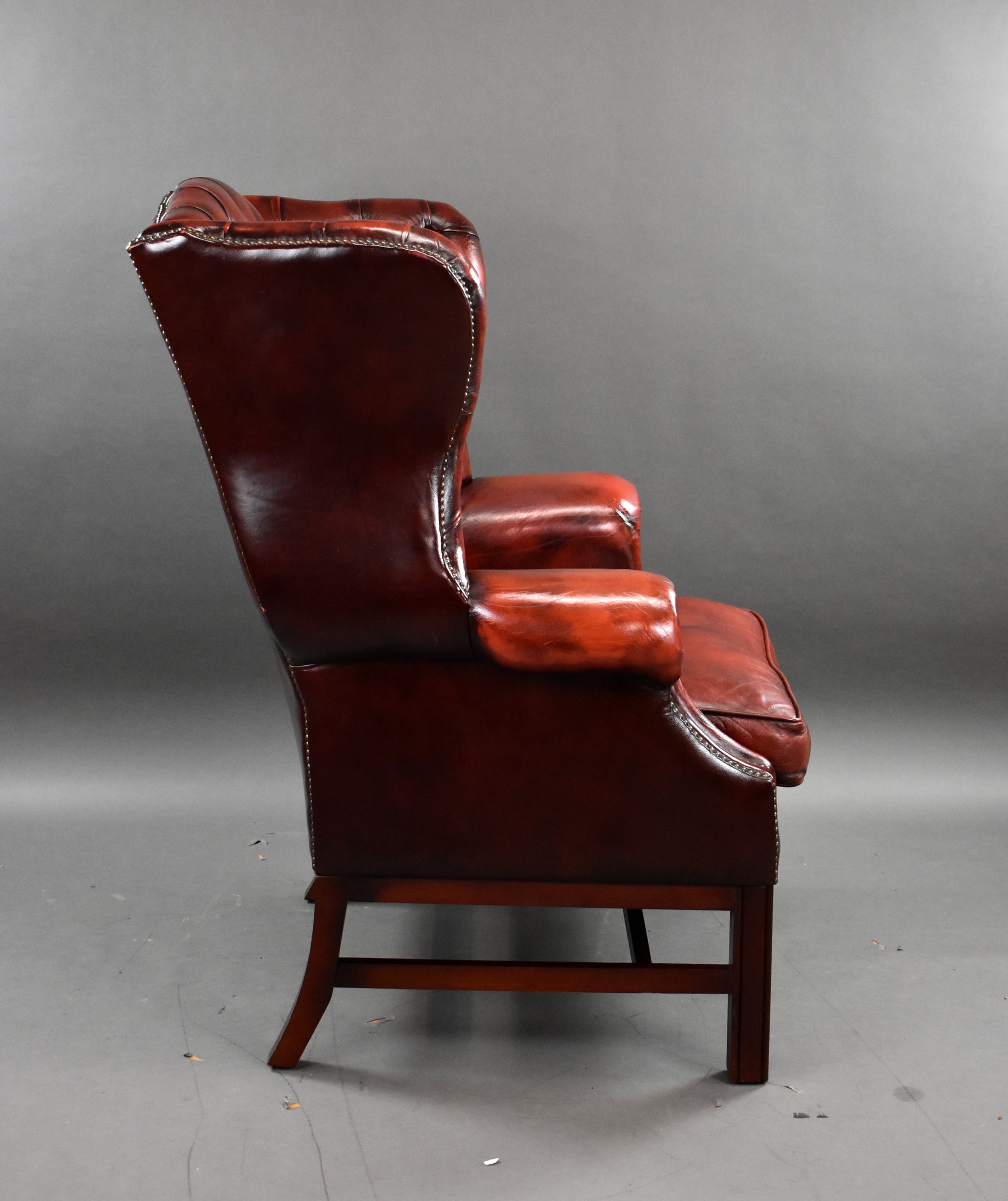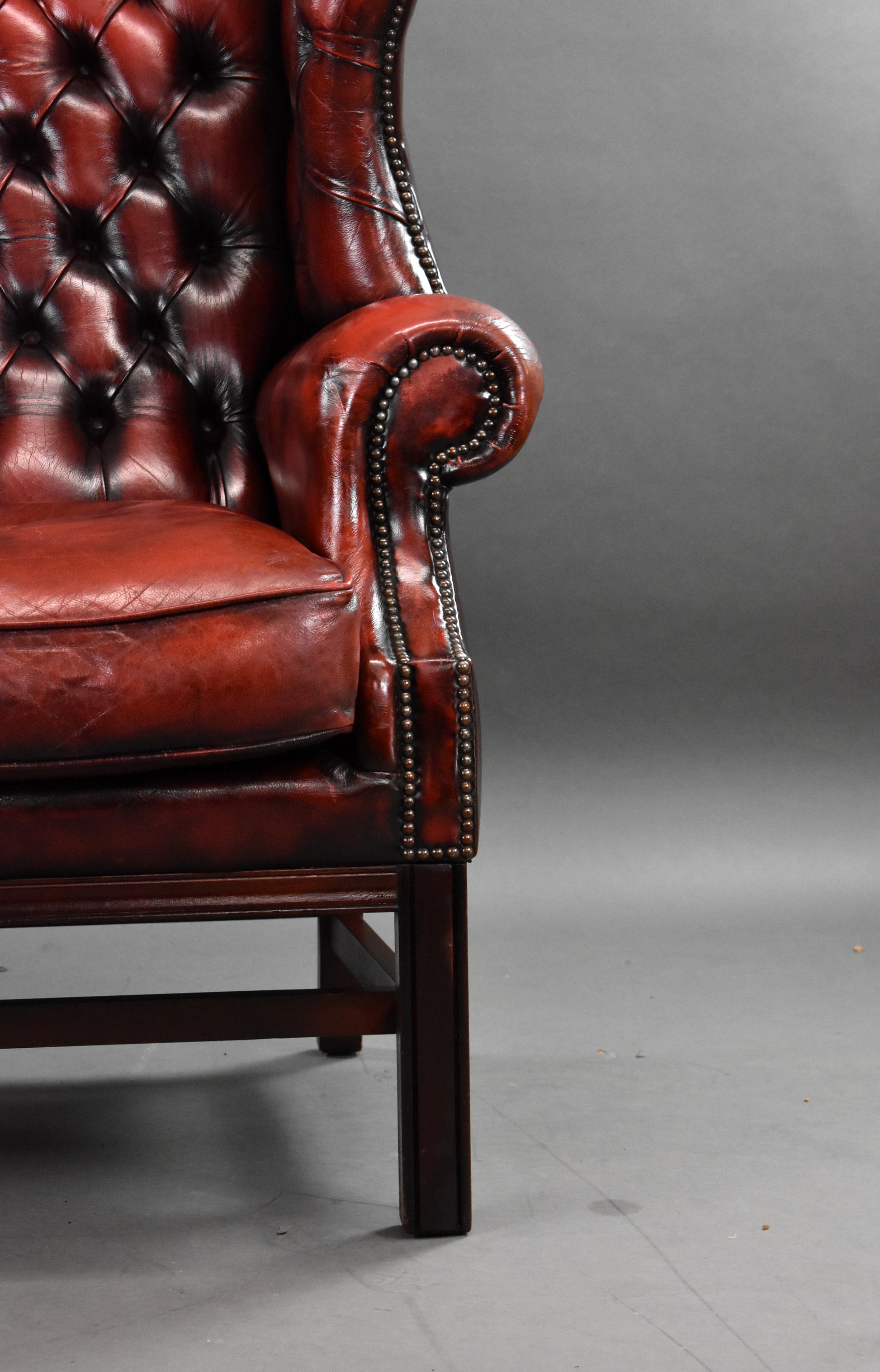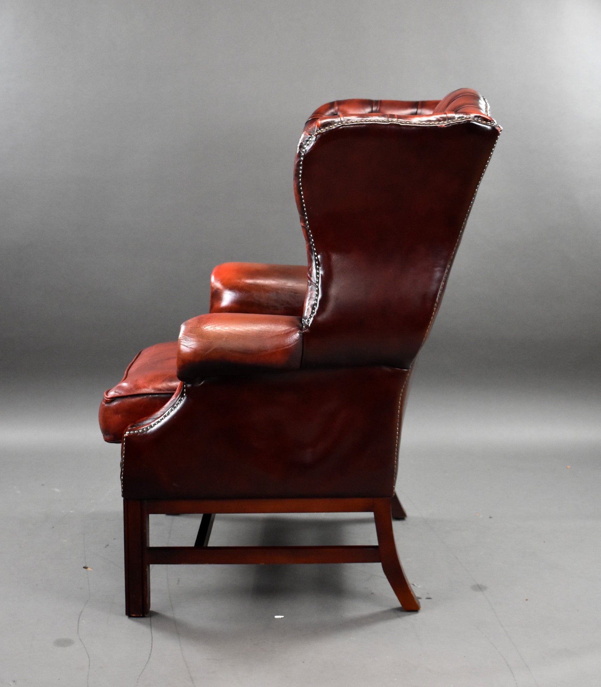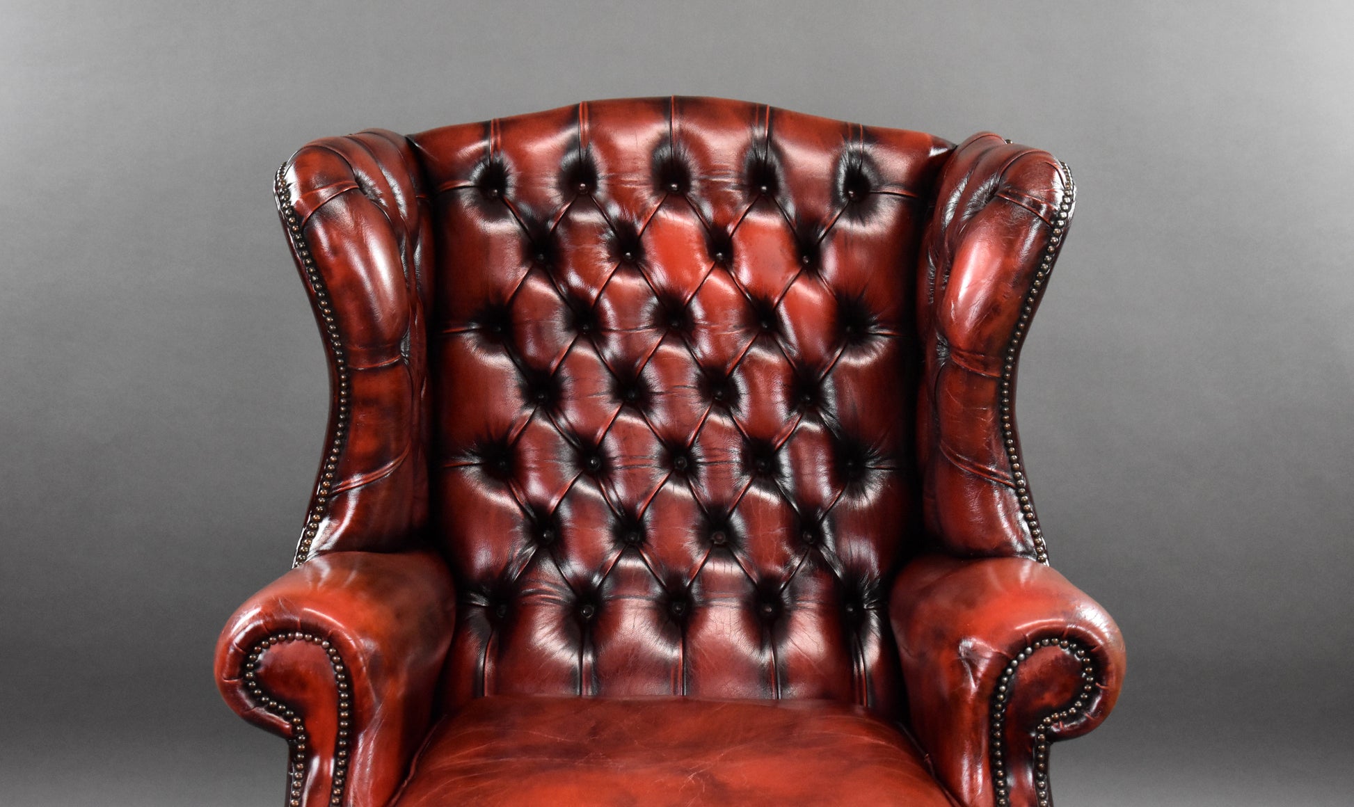 Add a touch of timeless elegance to your living space with this vintage Chesterfield leather wingback chair. Upholstered in rich ox blood leather, this chair features the classic tufted backrest with button detailing that exemplifies traditional craftsmanship. The wingback design provides both comfort and style, while the rolled arms are accented with decorative nailhead trim, adding a sophisticated finish.