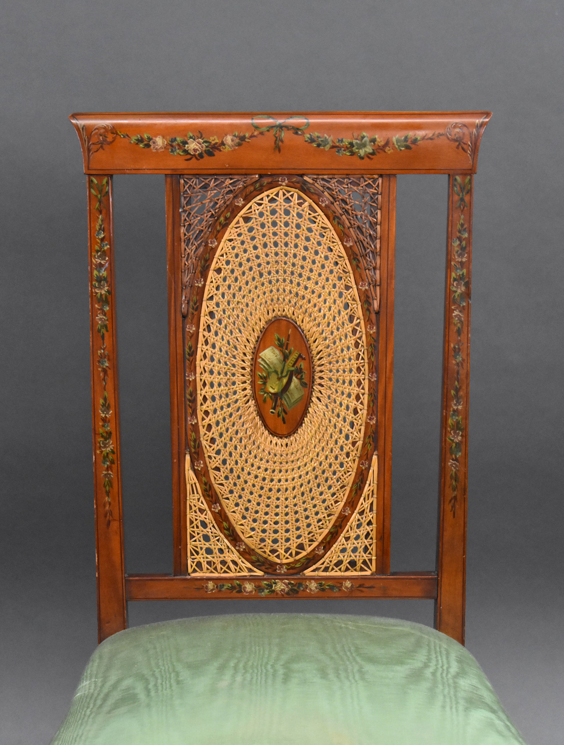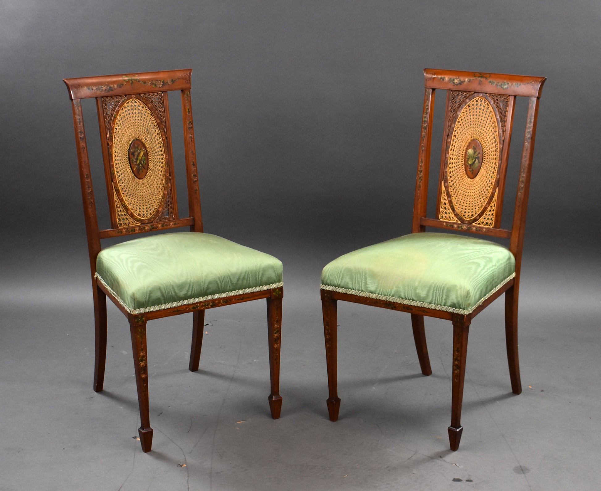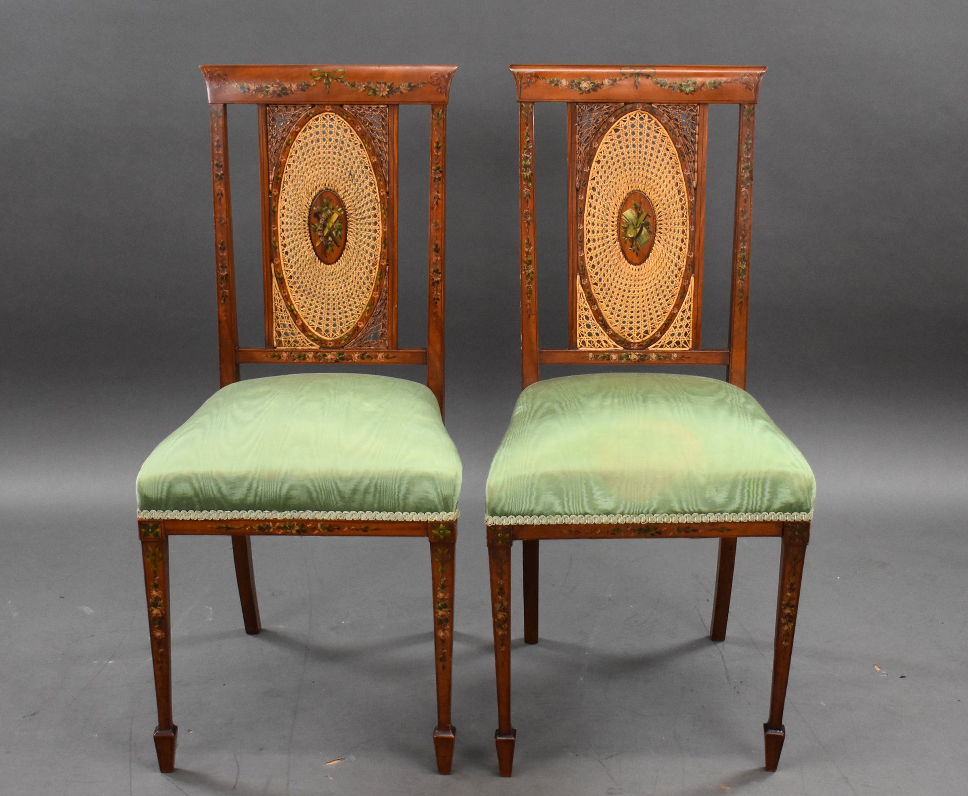 For sale is a good quality Pair of Edwardian hand painted satinwood chairs, having cane backs and painted decoration, above an upholstered seat, standing on painted tapered legs, terminating on spade feet. Each chair remains structurally sound and is in very good condition, showing light signs of wear commensurate with age and use.