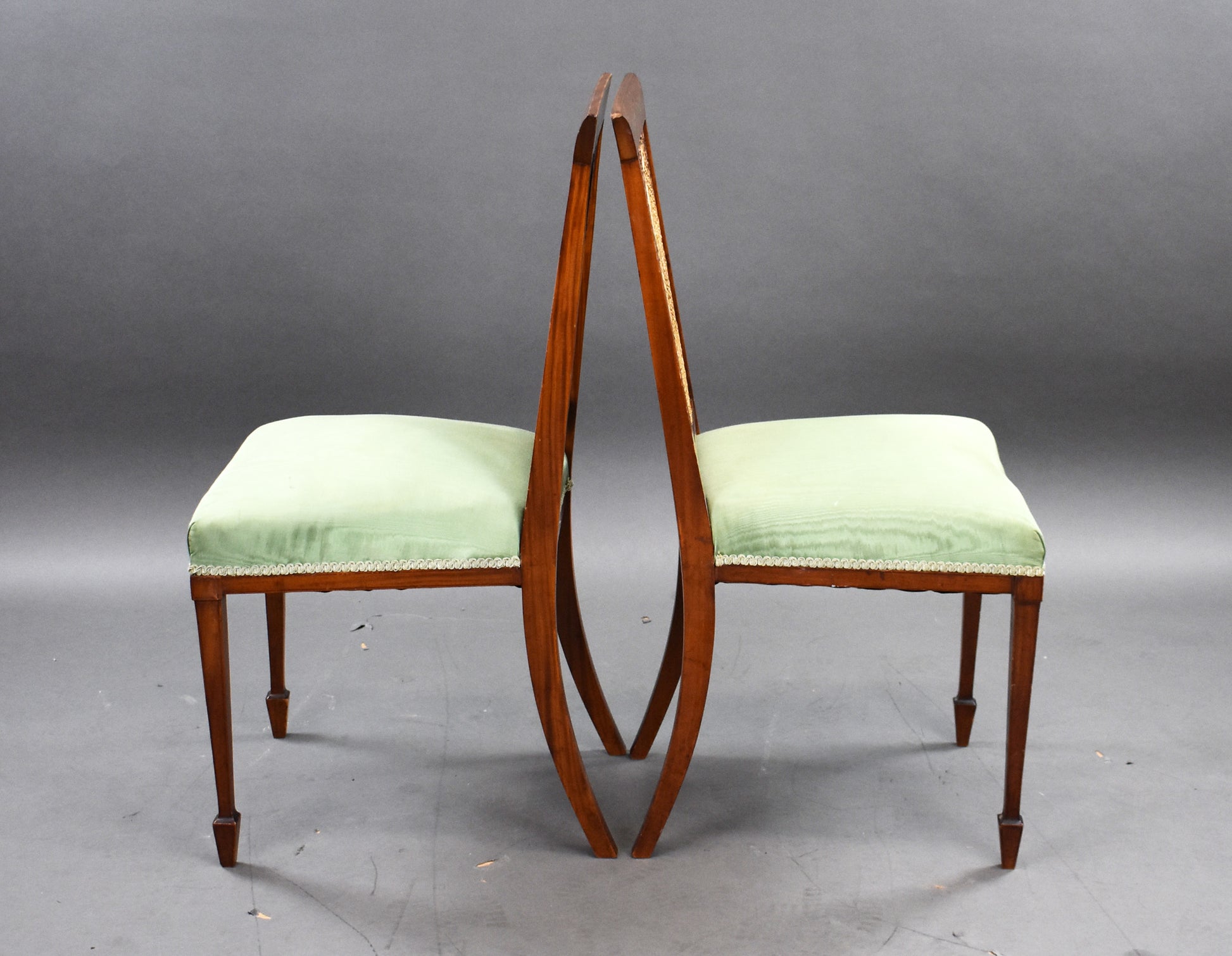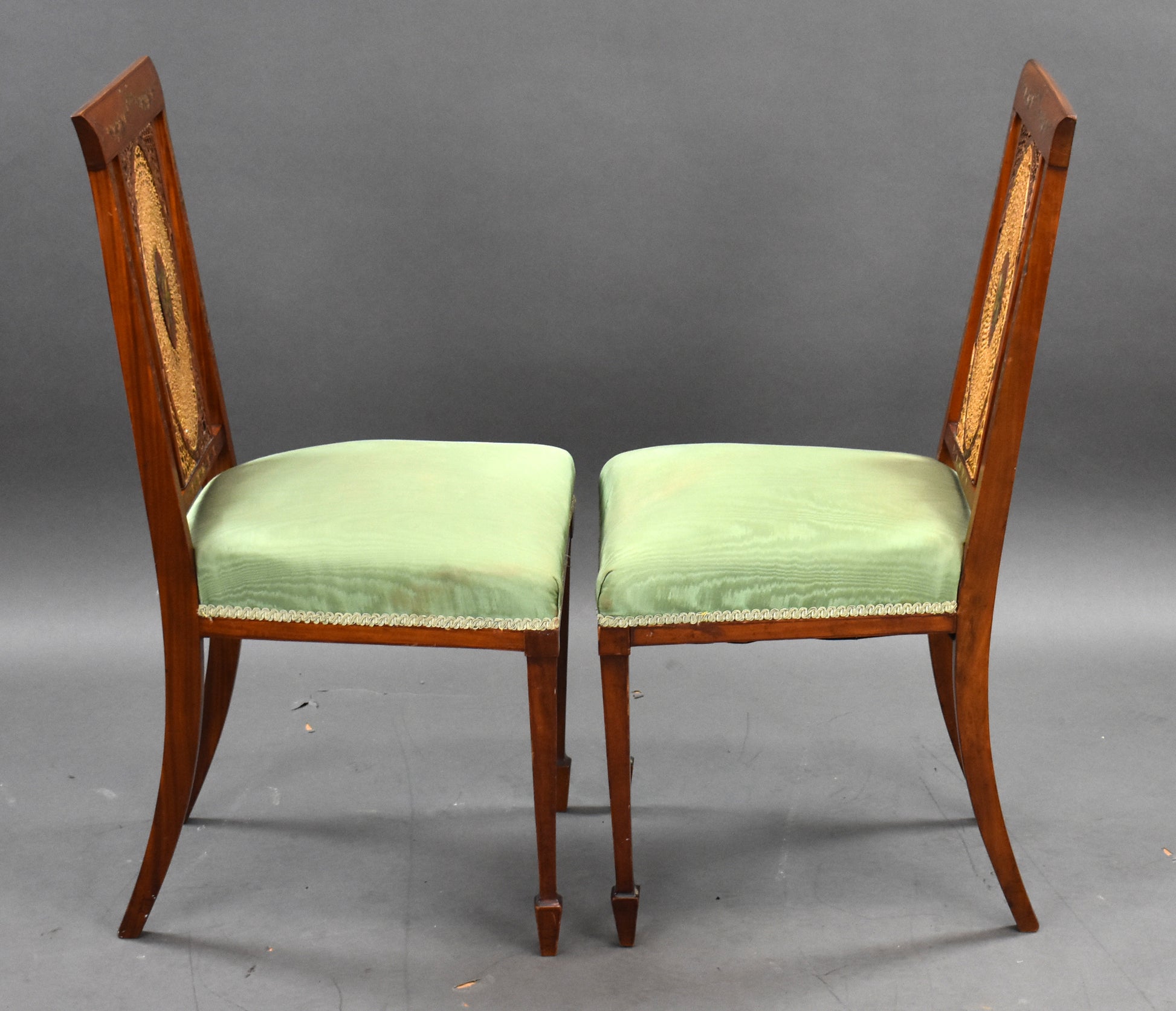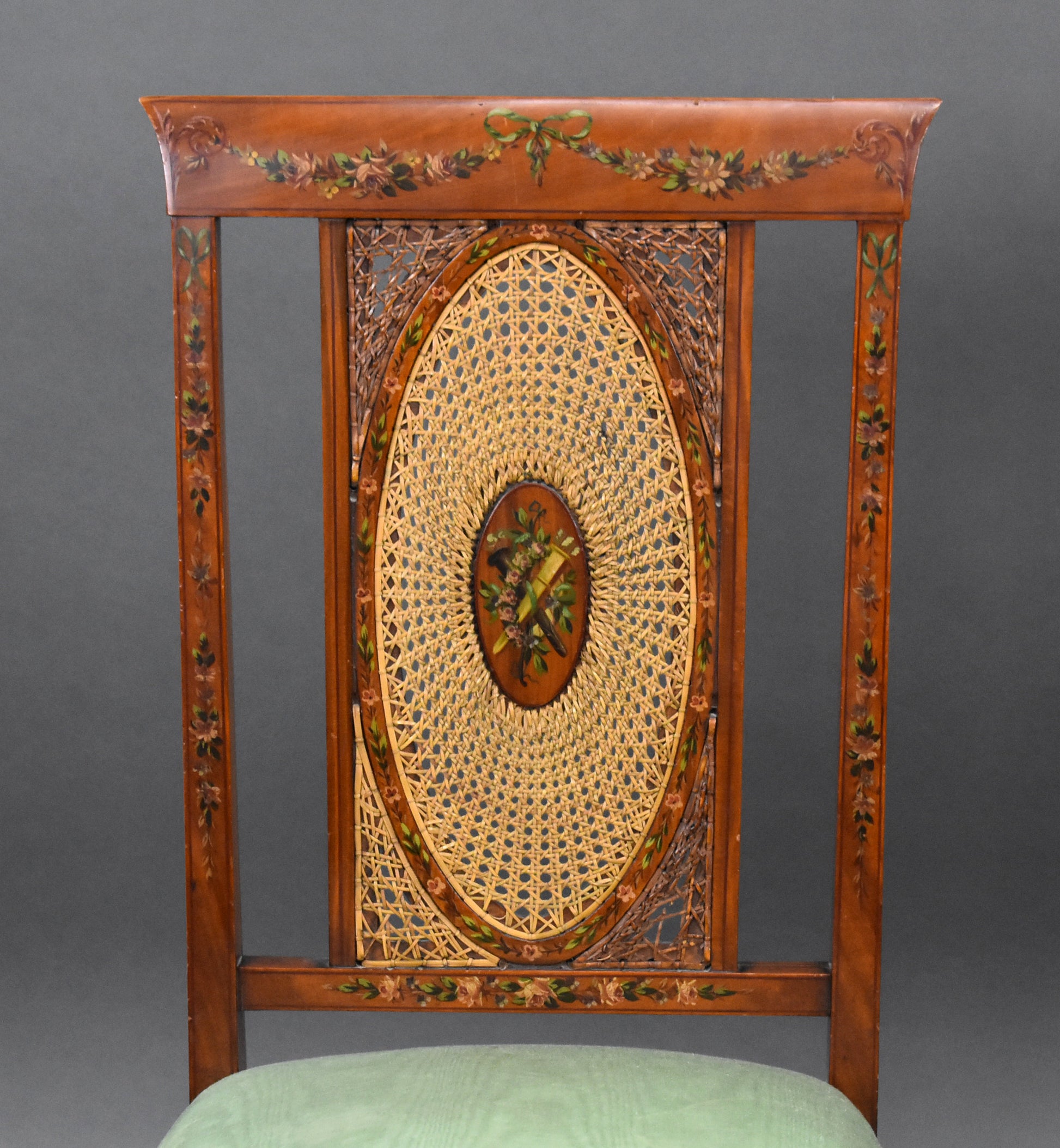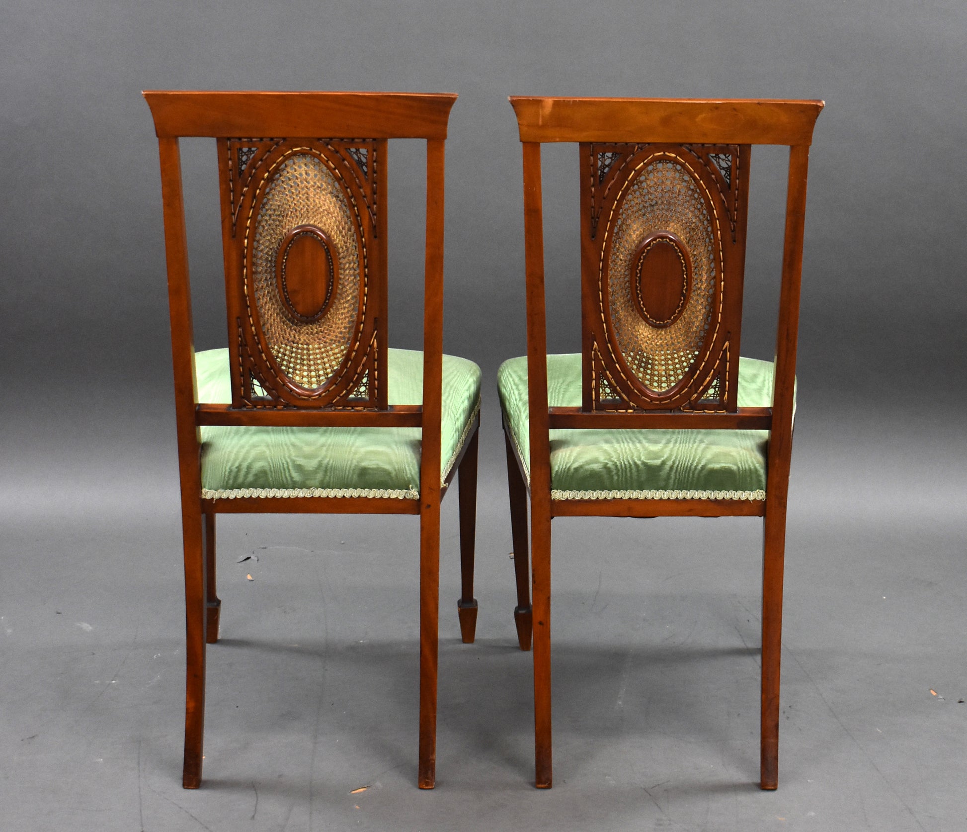 For sale is a good quality Pair of Edwardian hand painted satinwood chairs, having cane backs and painted decoration, above an upholstered seat, standing on painted tapered legs, terminating on spade feet. Each chair remains structurally sound and is in very good condition, showing light signs of wear commensurate with age and use.