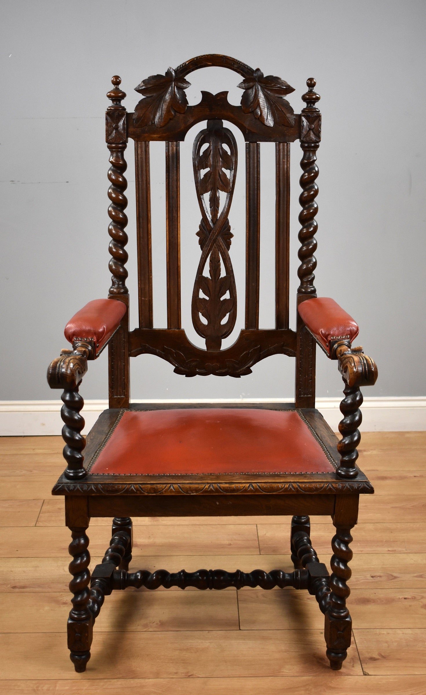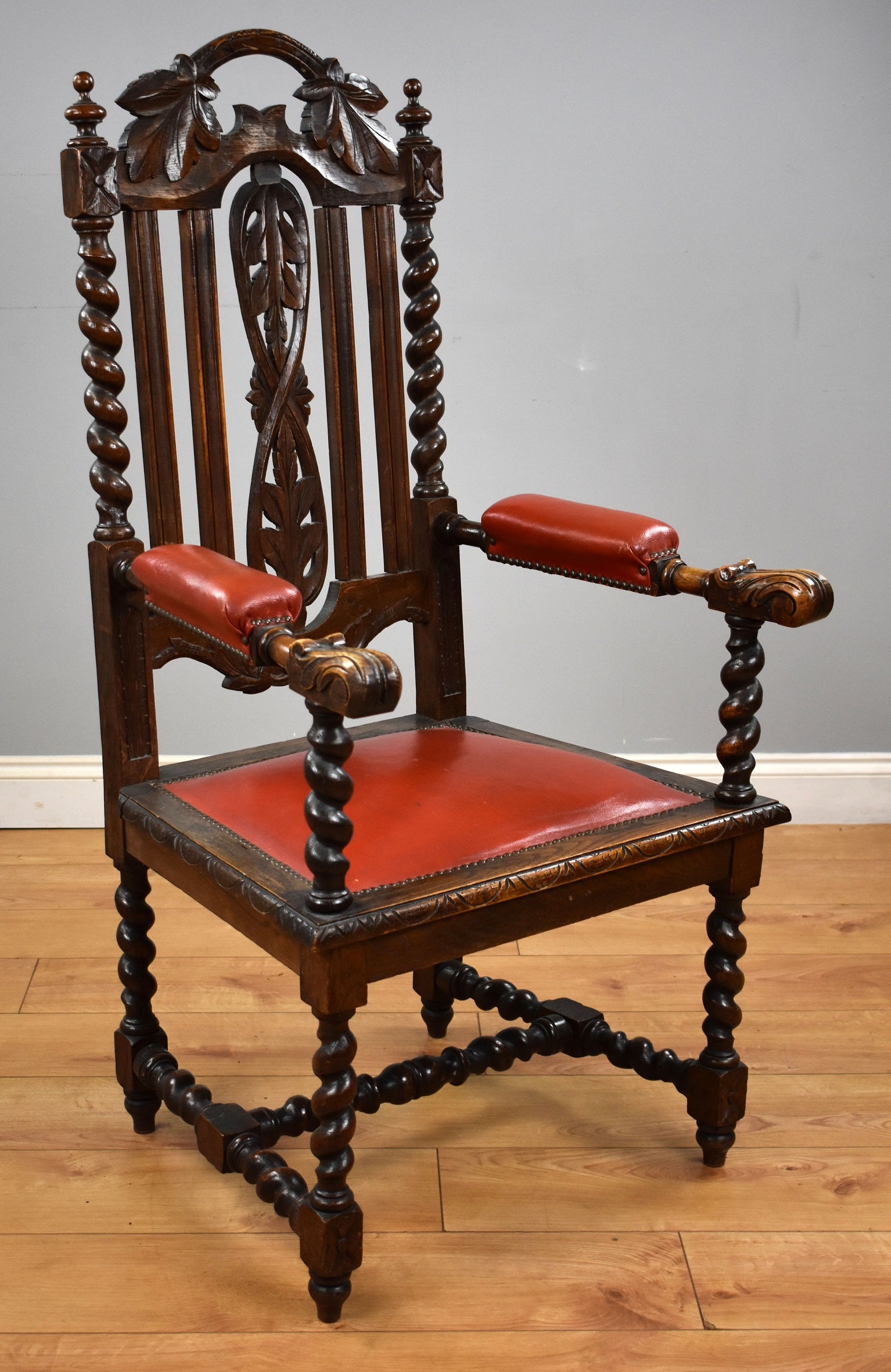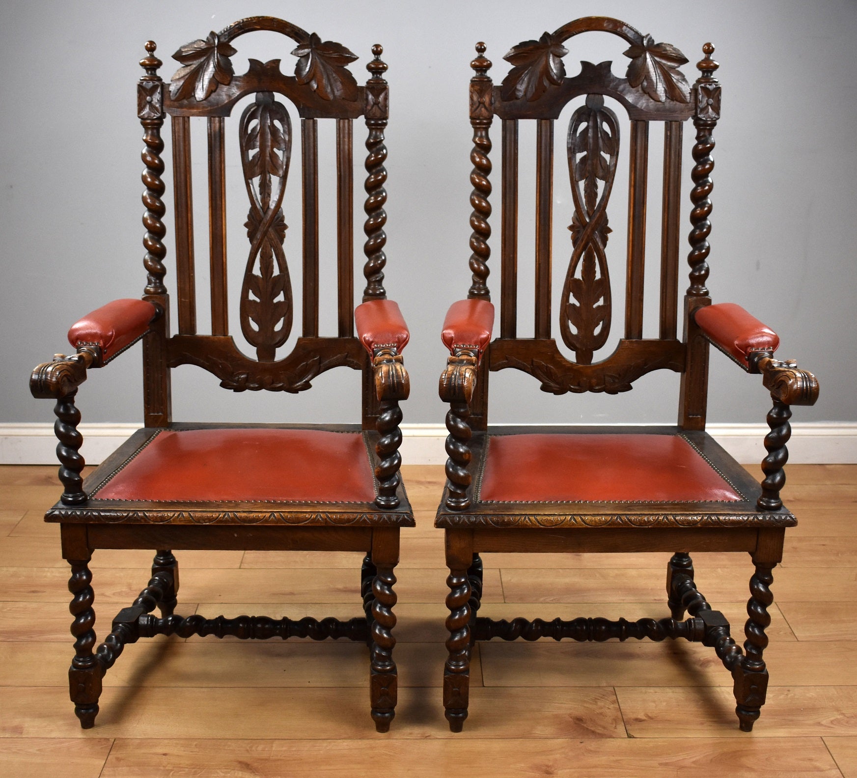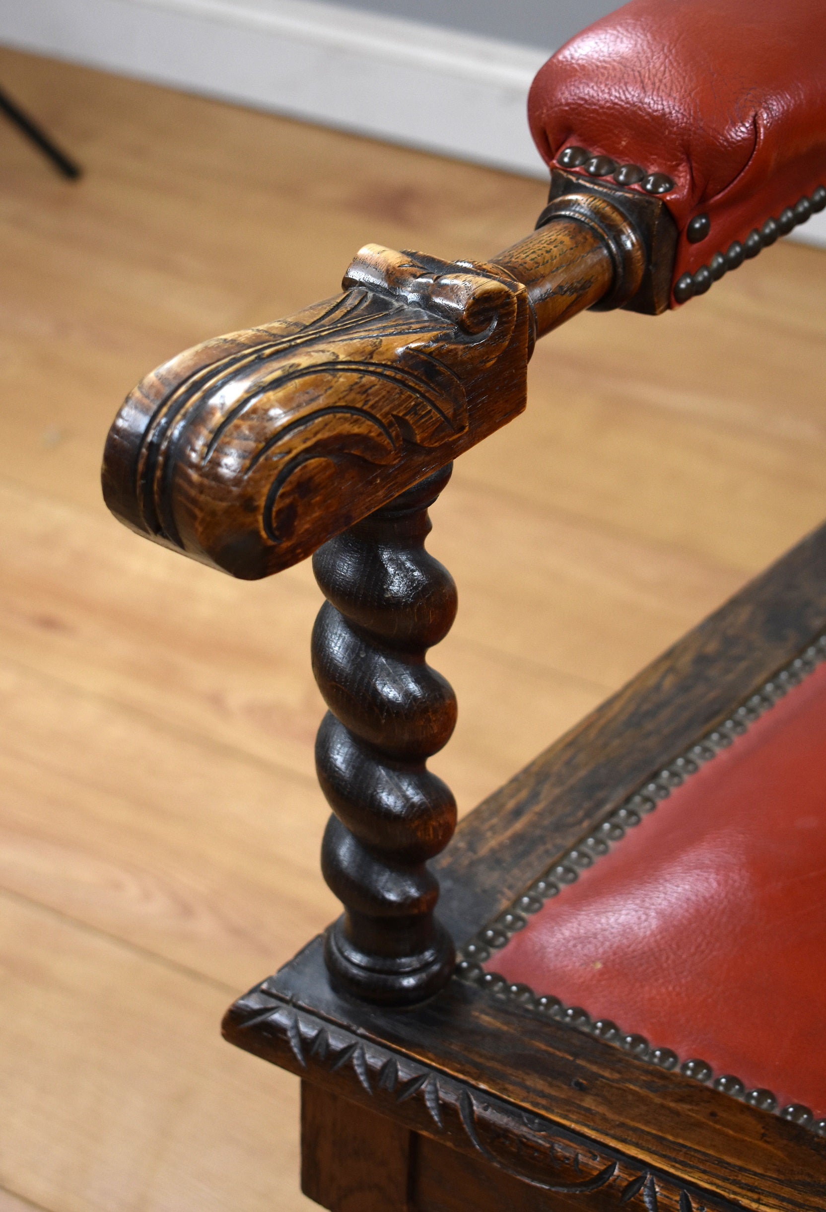 Pair of oak barley twist arm chairs in good condition. The chairs have carved leaves to the top and centre of the backs, each side has barley twist columns with red upholstered arms with close studding to the edge and over stuffed seats. The chairs stand on barley twist legs with barley twist stretchers.