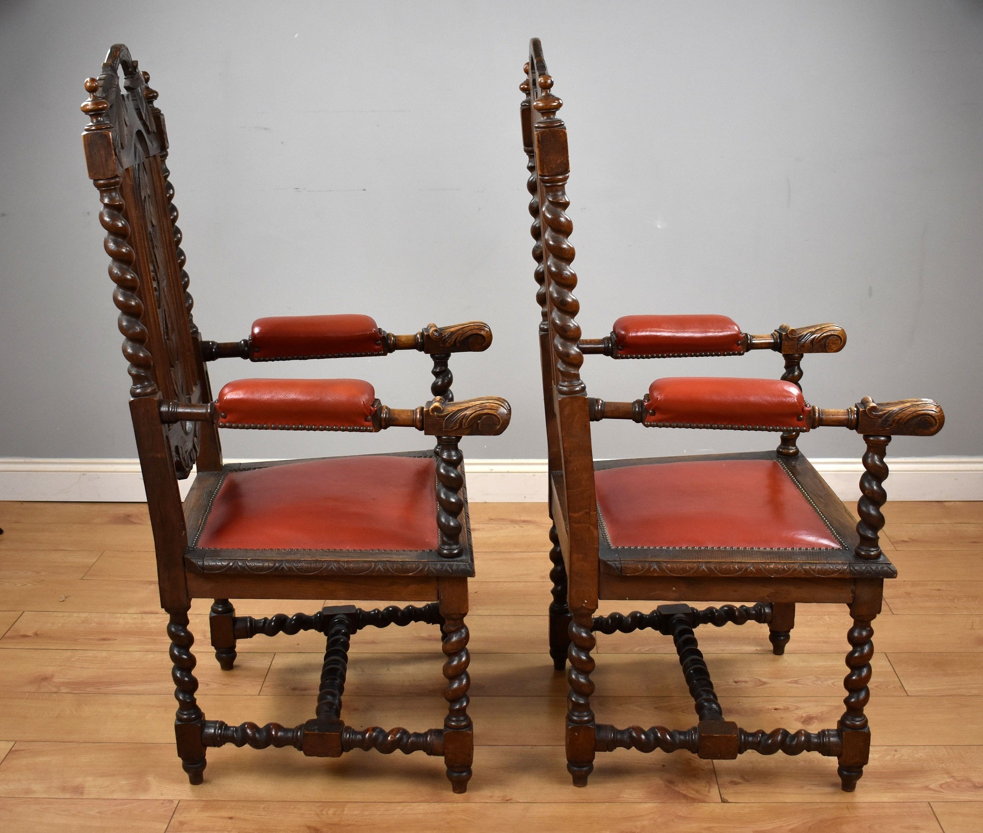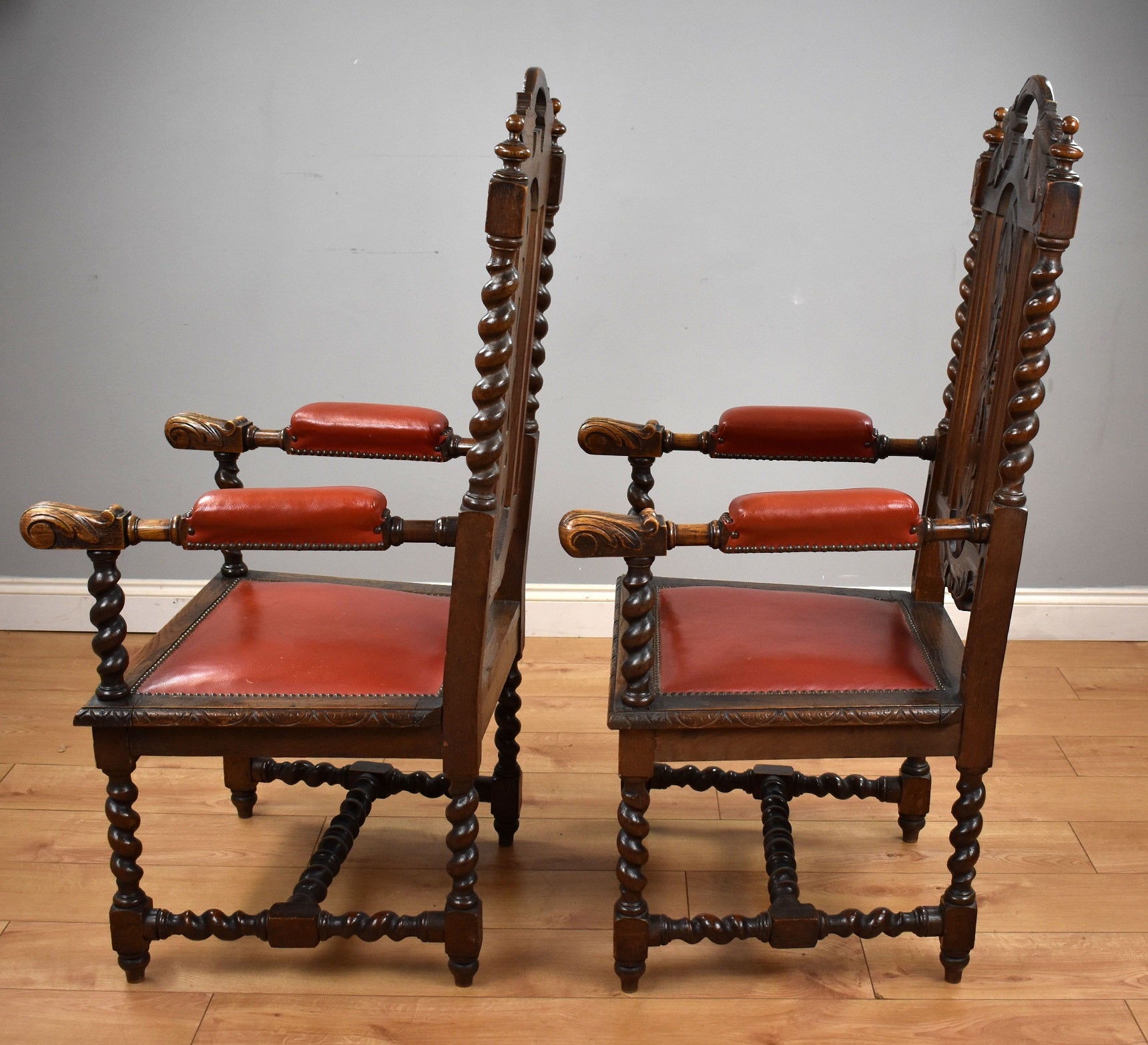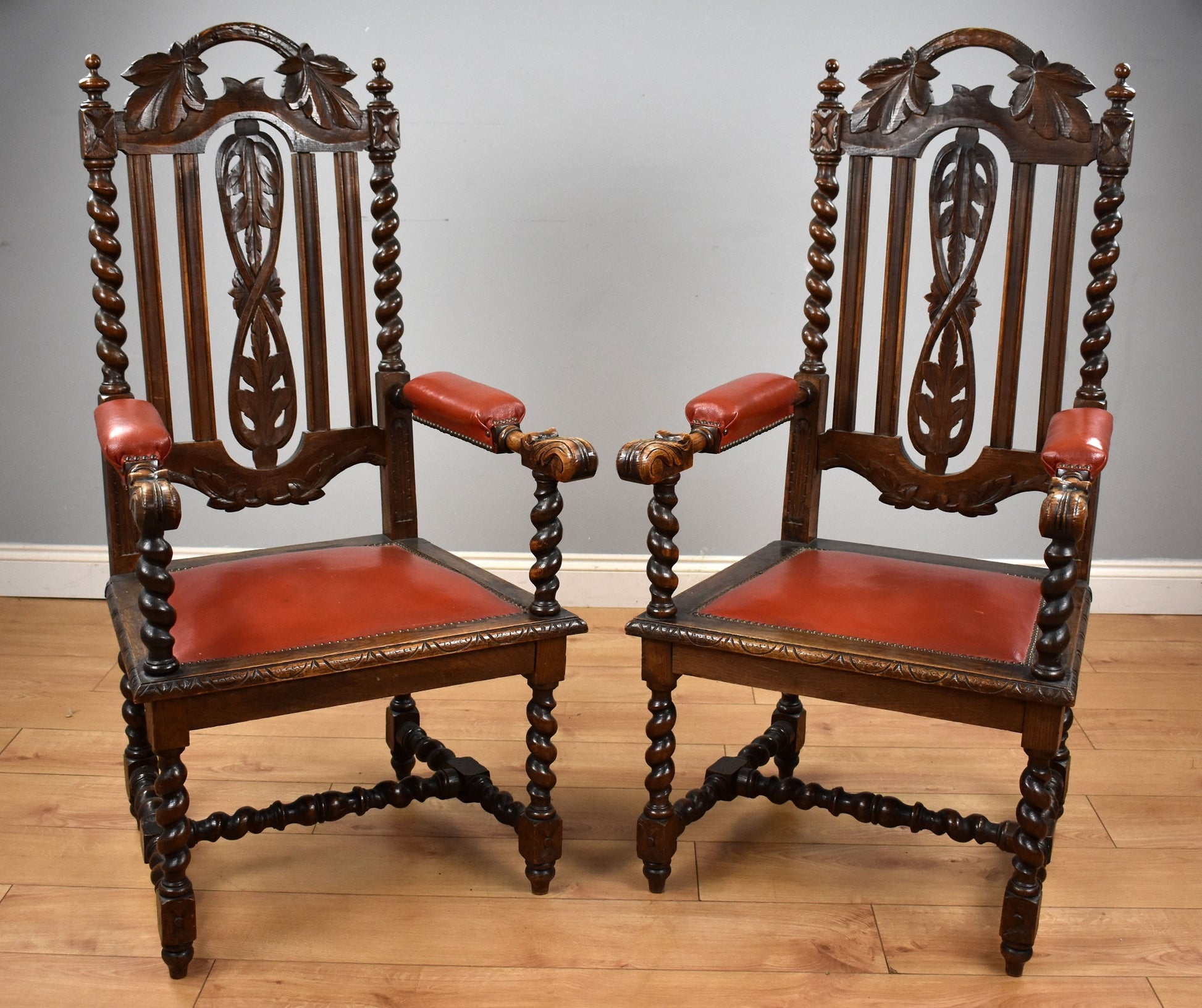 Pair of oak barley twist arm chairs in good condition. The chairs have carved leaves to the top and centre of the backs, each side has barley twist columns with red upholstered arms with close studding to the edge and over stuffed seats. The chairs stand on barley twist legs with barley twist stretchers.