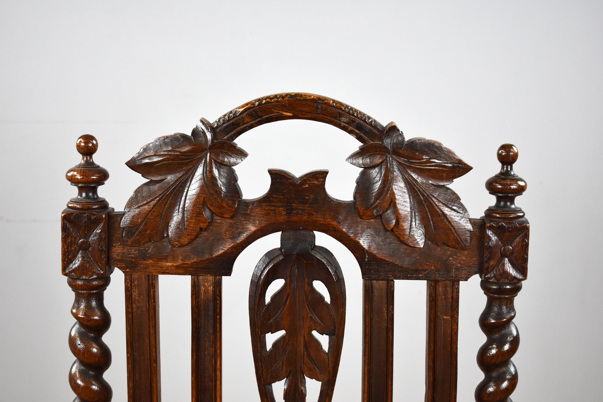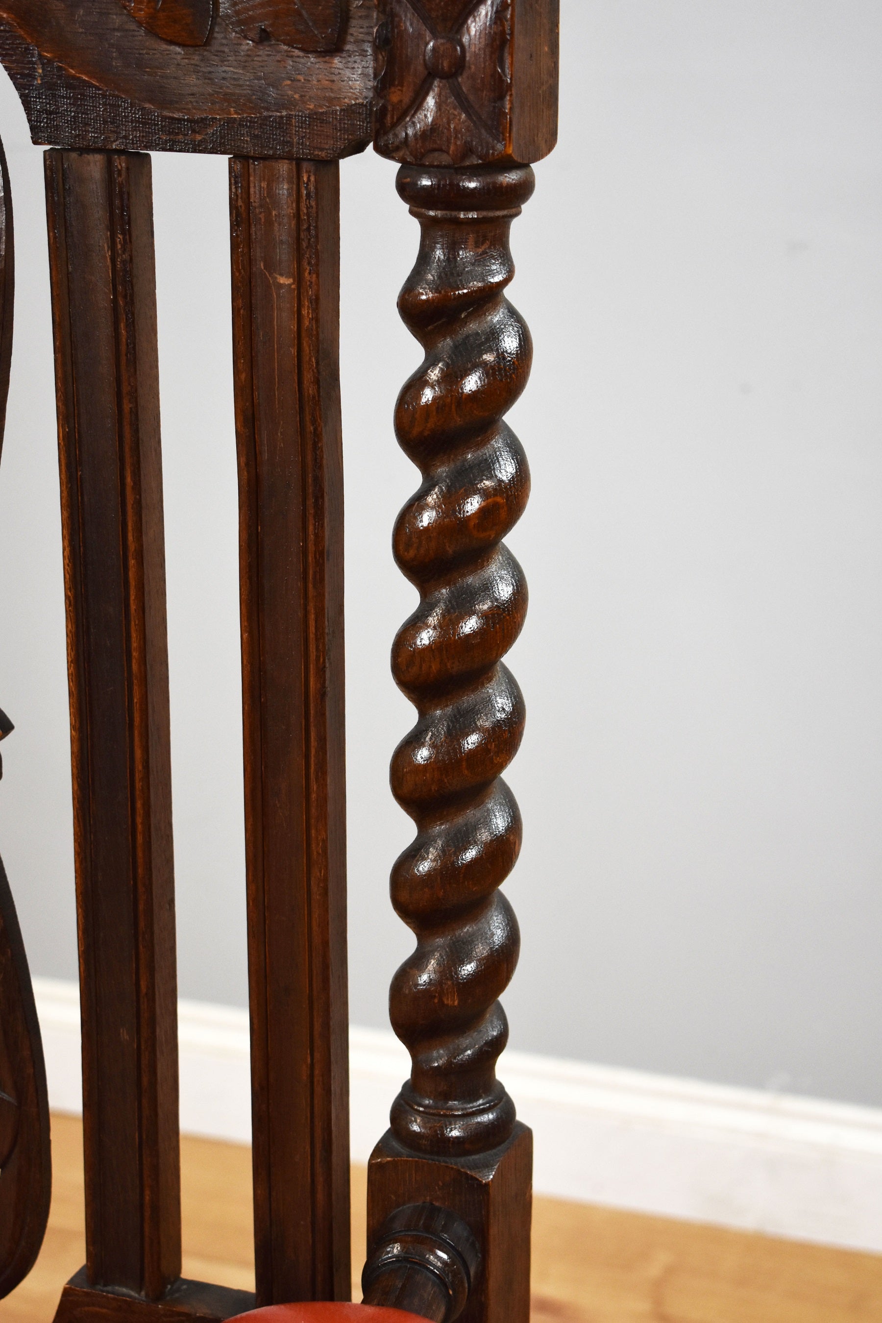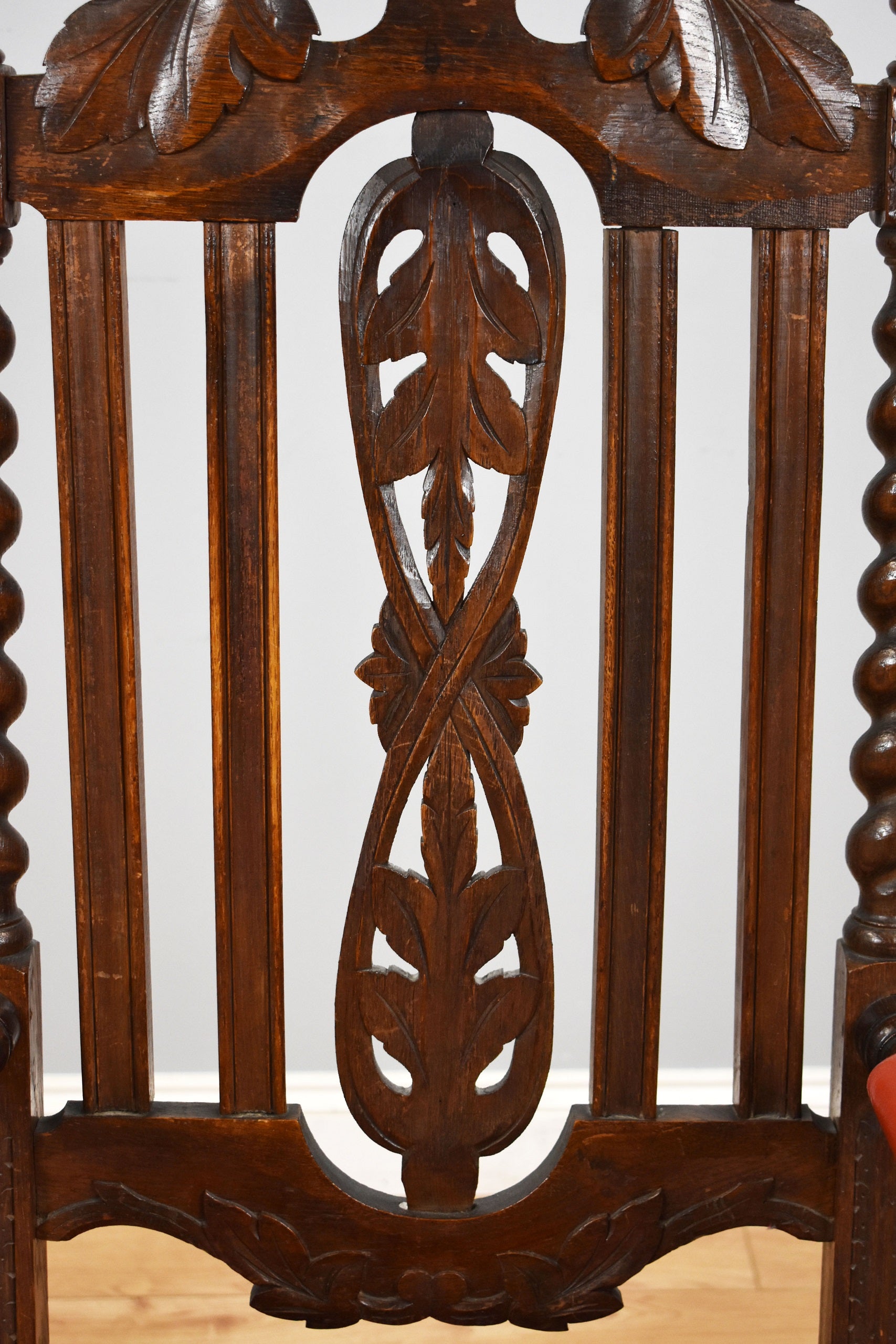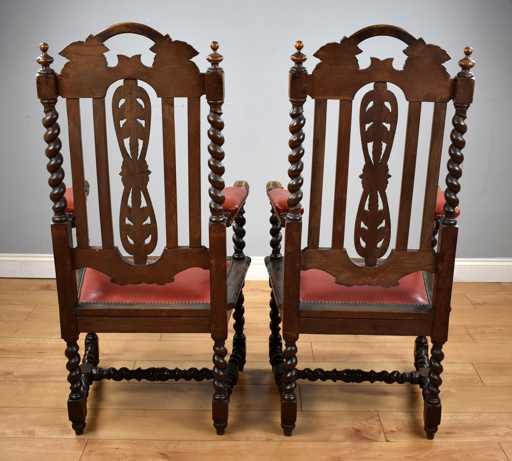 Pair of oak barley twist arm chairs in good condition. The chairs have carved leaves to the top and centre of the backs, each side has barley twist columns with red upholstered arms with close studding to the edge and over stuffed seats. The chairs stand on barley twist legs with barley twist stretchers.
