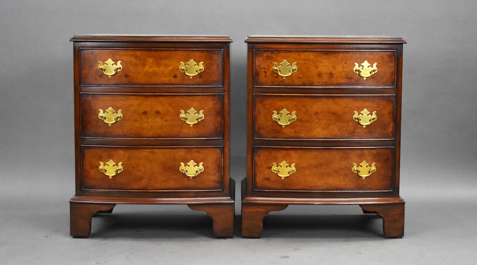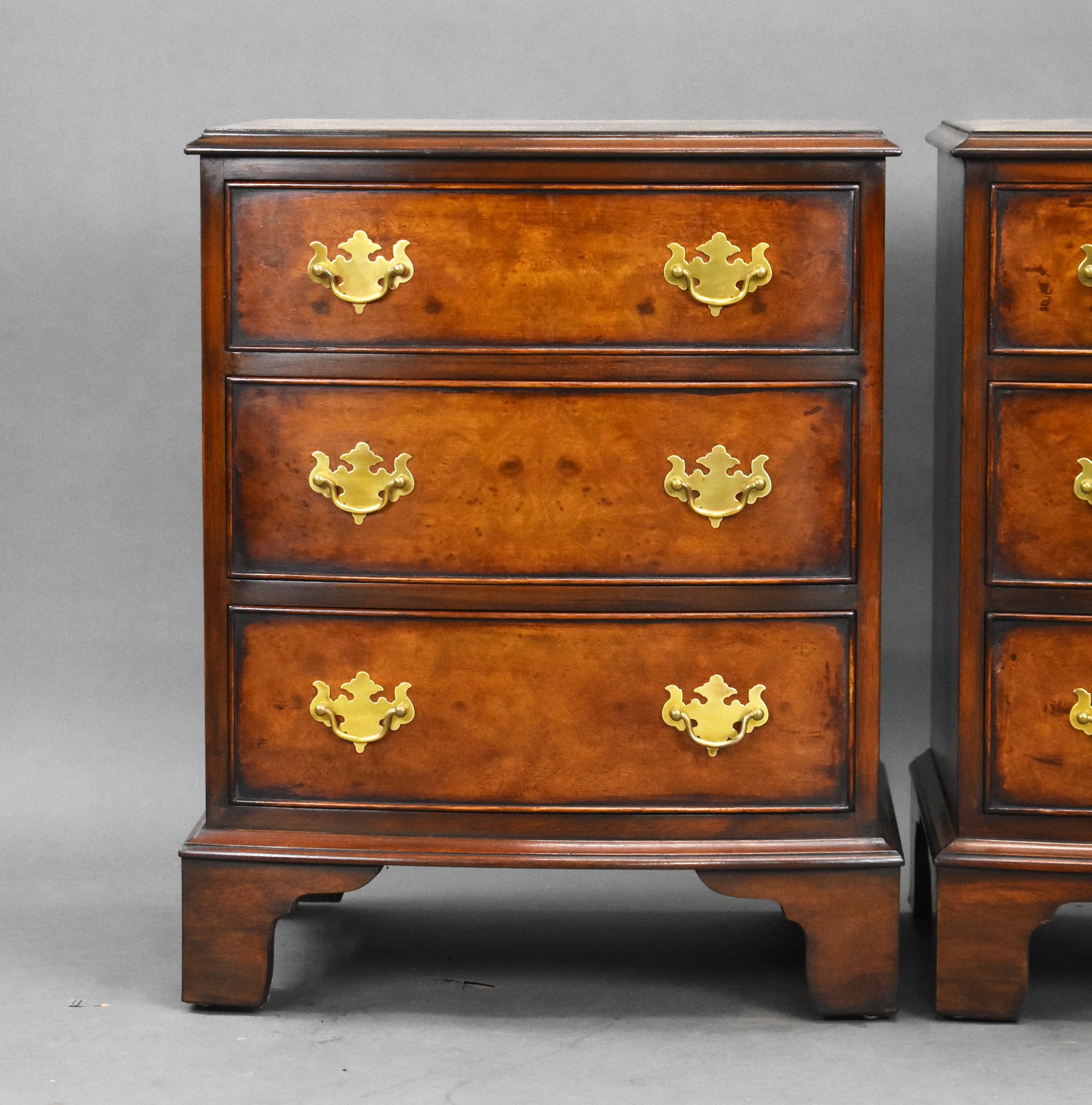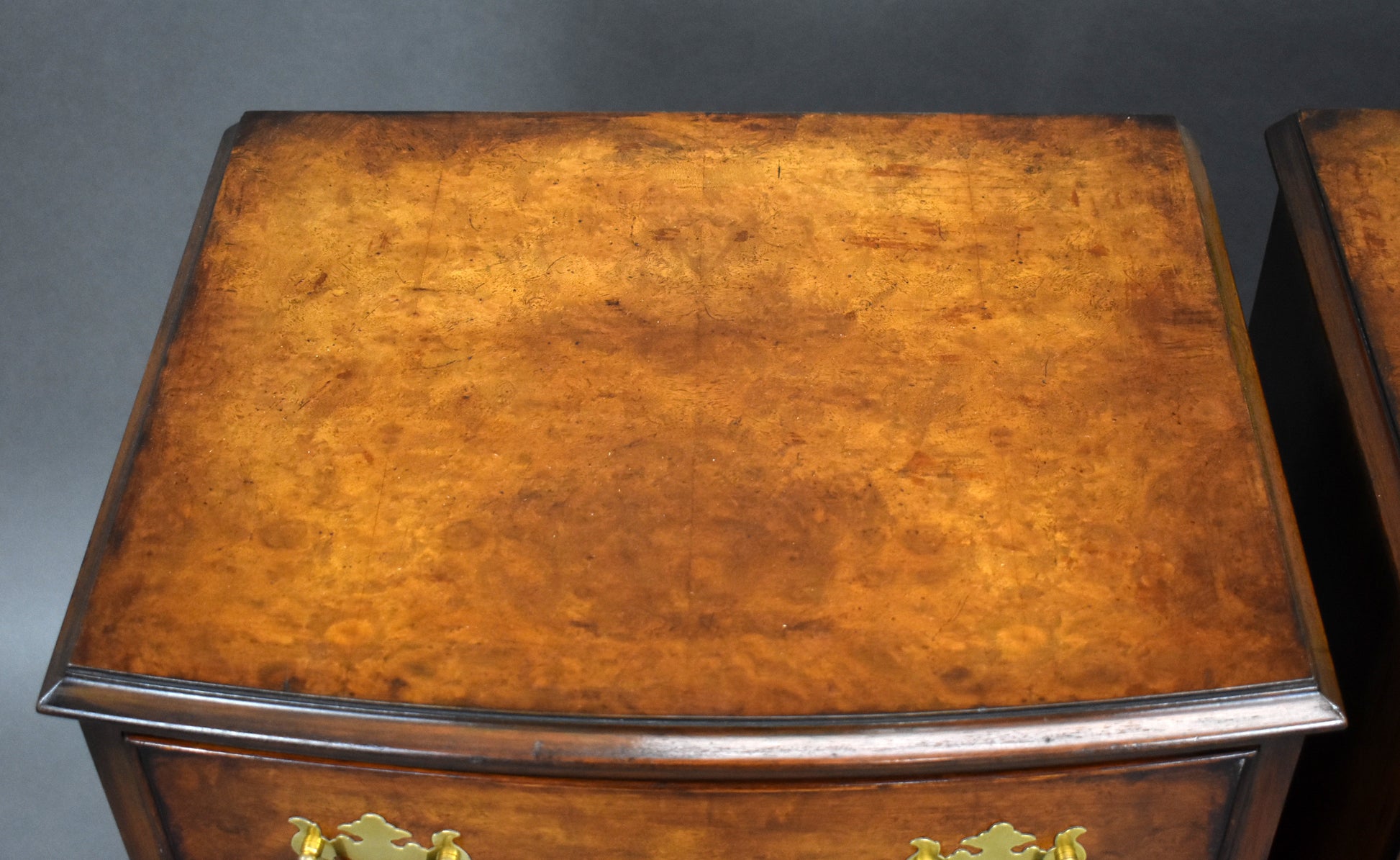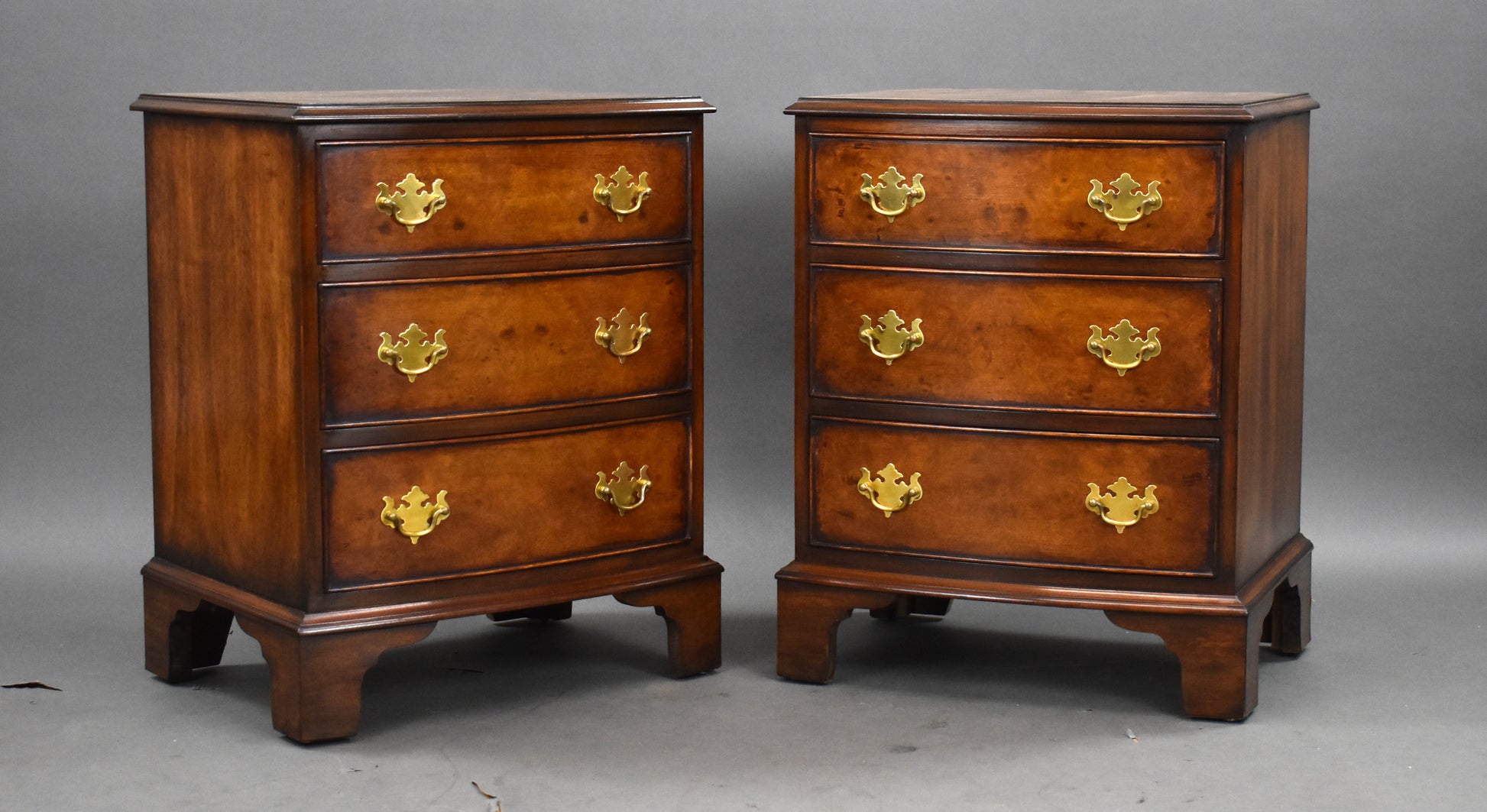 The chests are constructed with serpentine fronts, beaded drawer surrounds, and stand on classic bracket feet, offering a sturdy yet elegant profile. Their compact form and symmetrical design make them a perfect pair for flanking a bed or sofa.