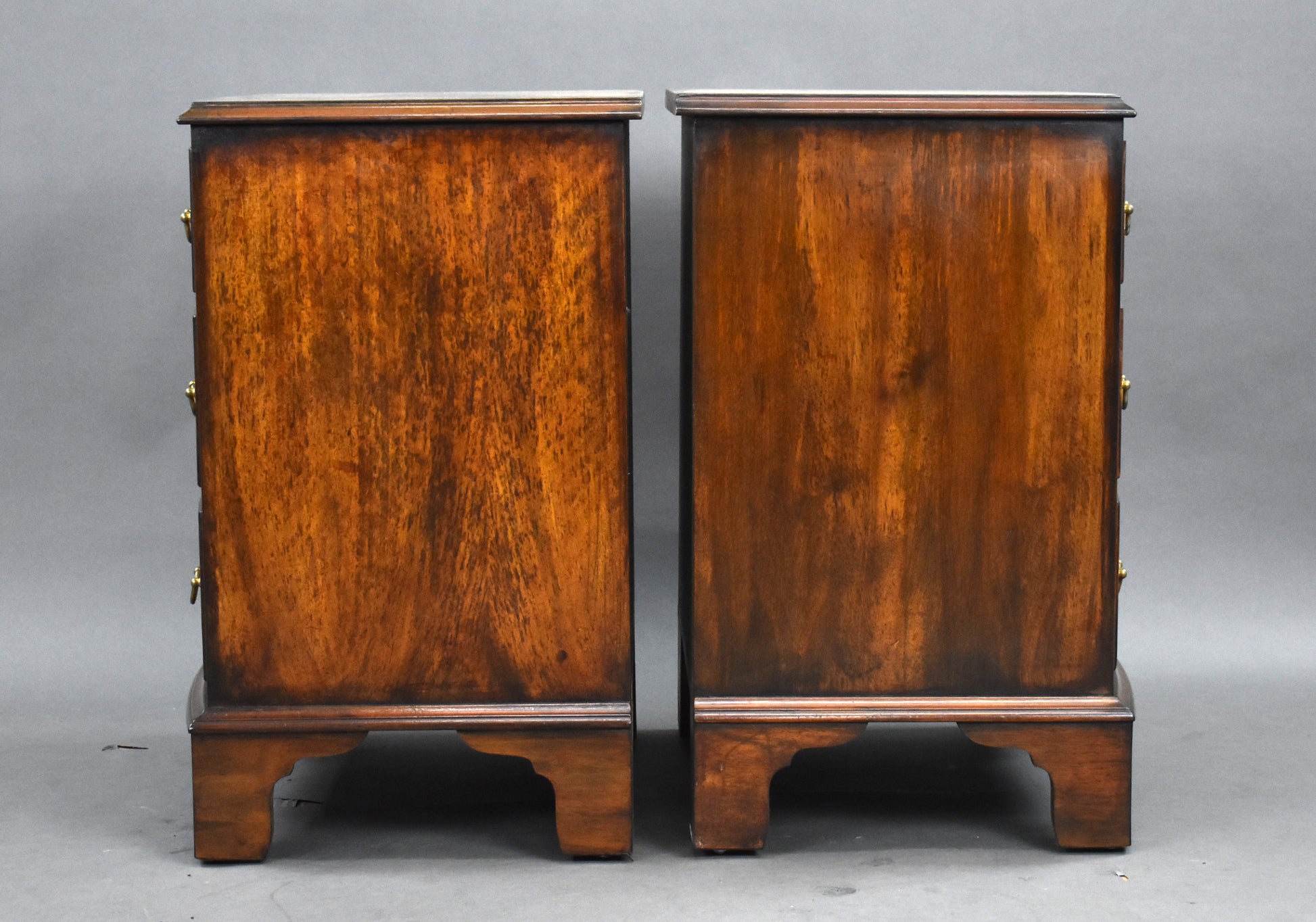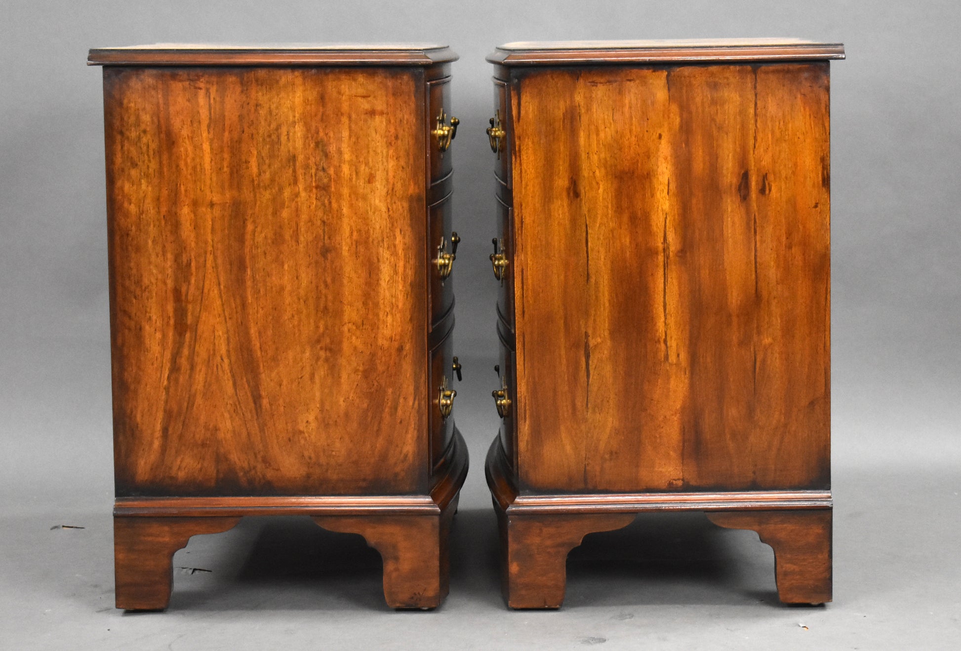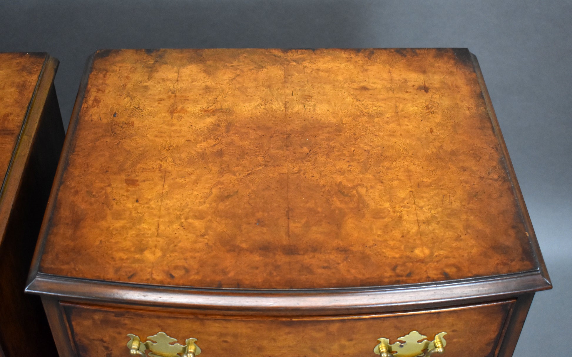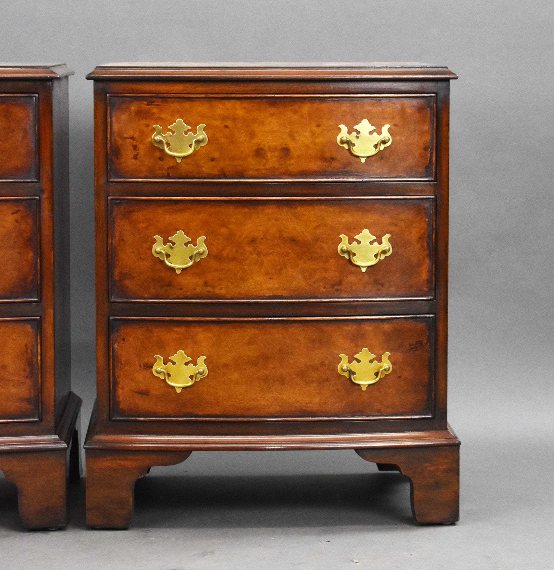 The chests are constructed with serpentine fronts, beaded drawer surrounds, and stand on classic bracket feet, offering a sturdy yet elegant profile. Their compact form and symmetrical design make them a perfect pair for flanking a bed or sofa.