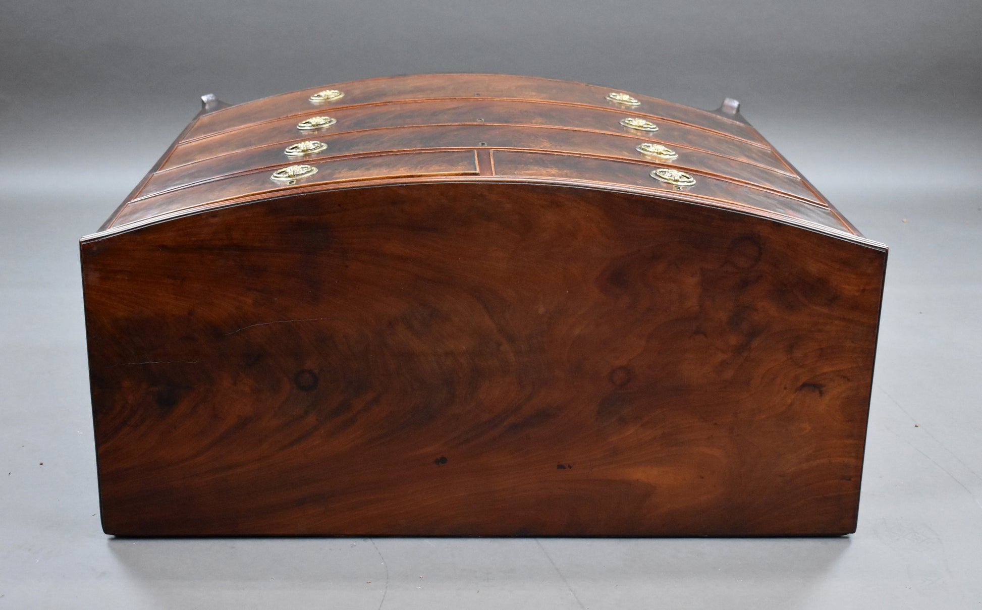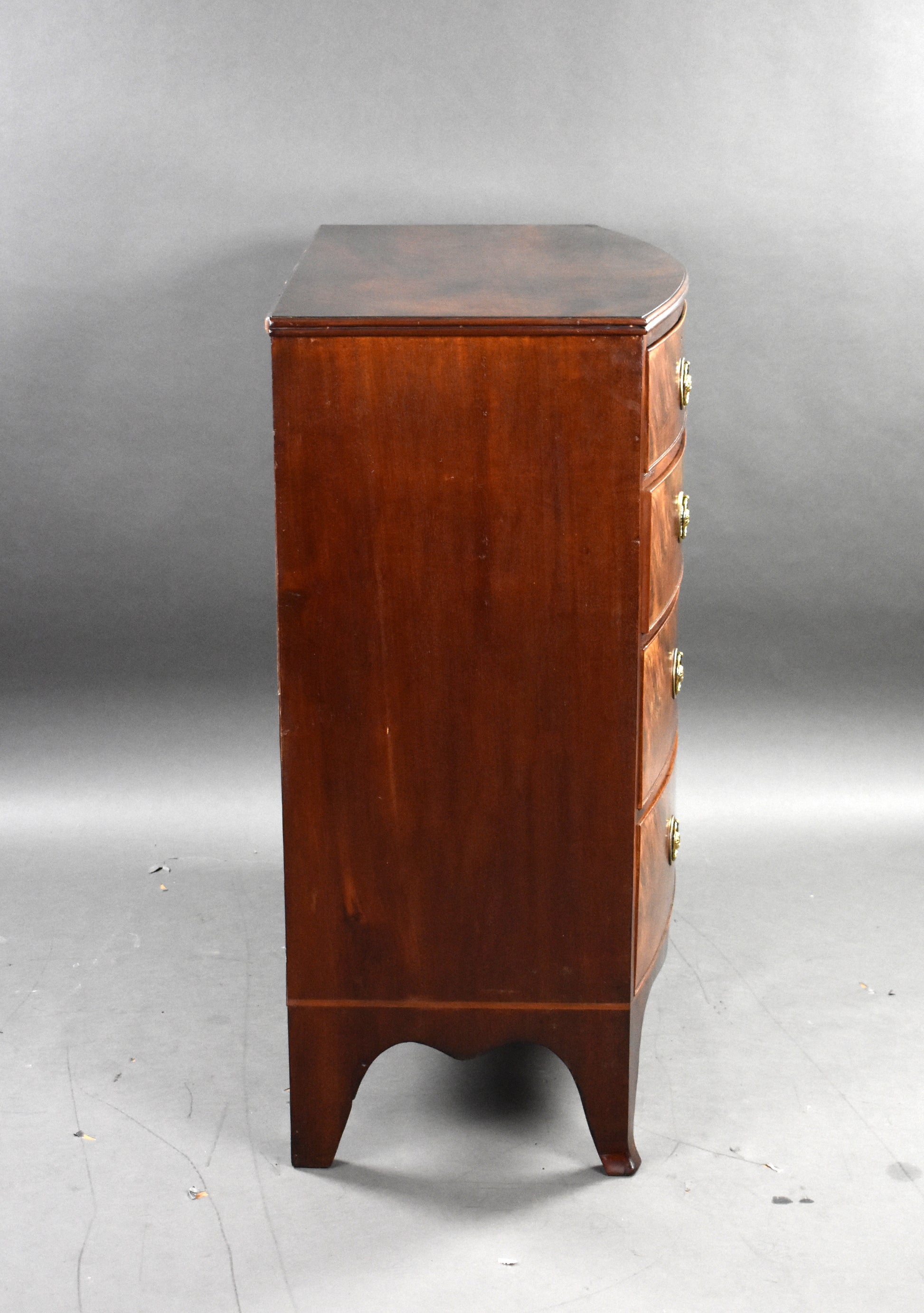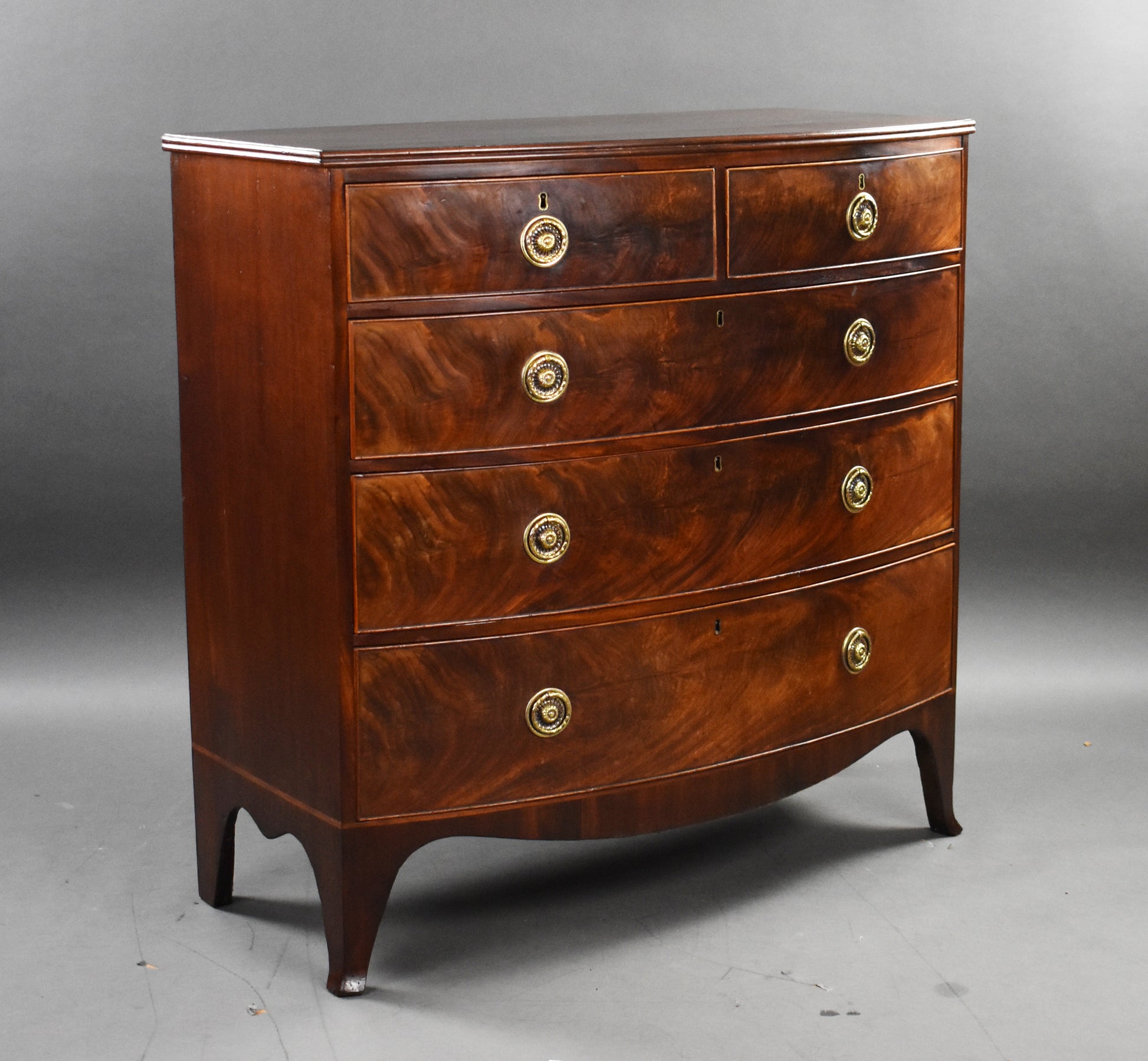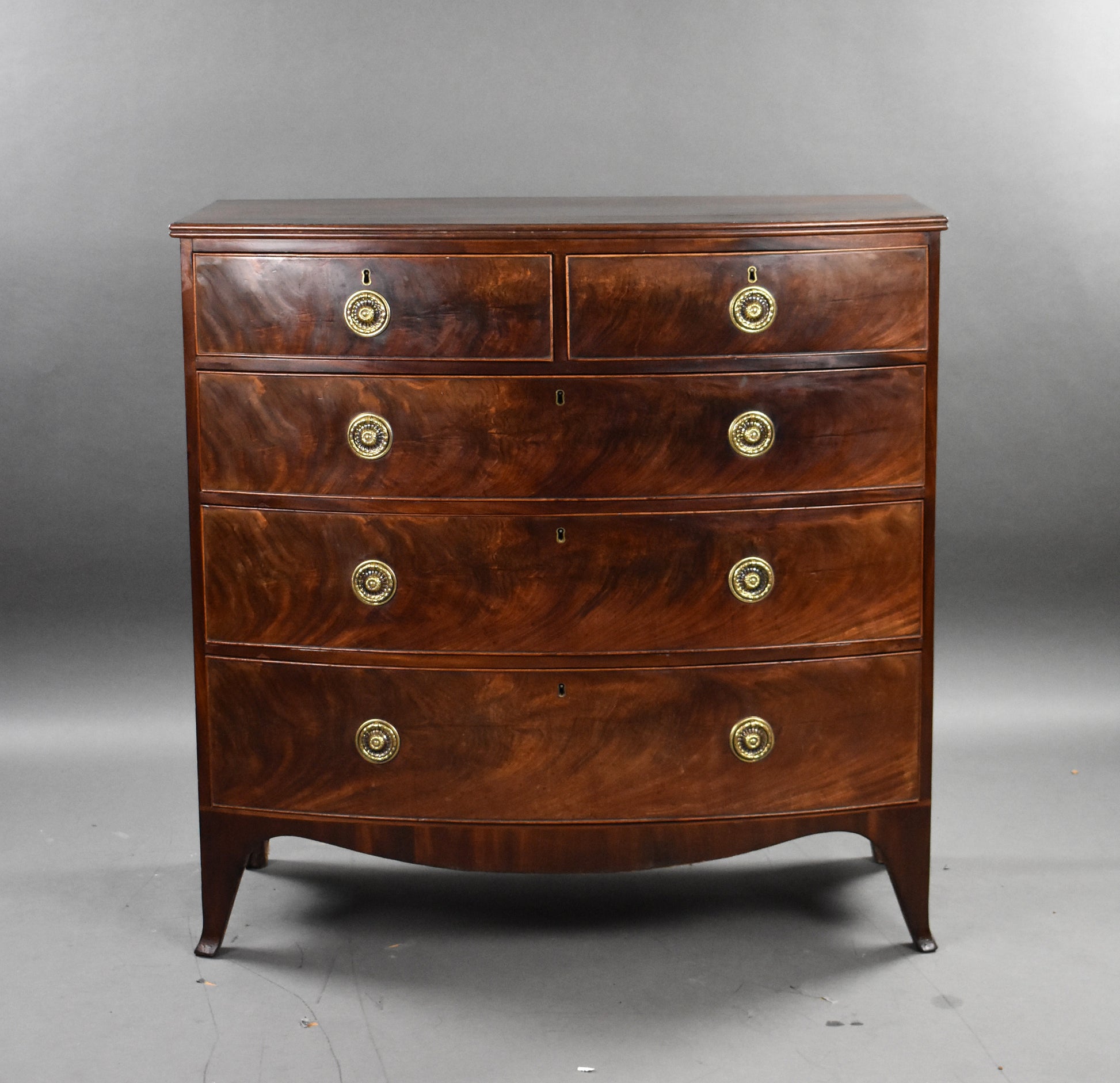 For sale is a fine quality Regency mahogany bow front chest, having an arrangement of two short over three long drawers, each with fell figured fronts and brass handles, the chest stands on elegant splayed feet and remains in very good condition for its age.