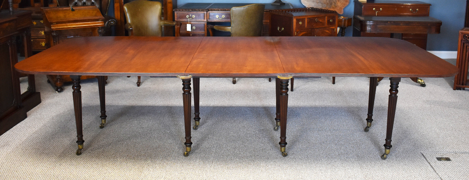 Regency mahogany dining table in good condition, stands on eight elegant reeded legs all fitted with brass castors. The centre turns on its base and the two large leaves are held in place by brass clips. When the leaves are not added the table has two side rails to finish the edge. The table would seat 10-14 people.