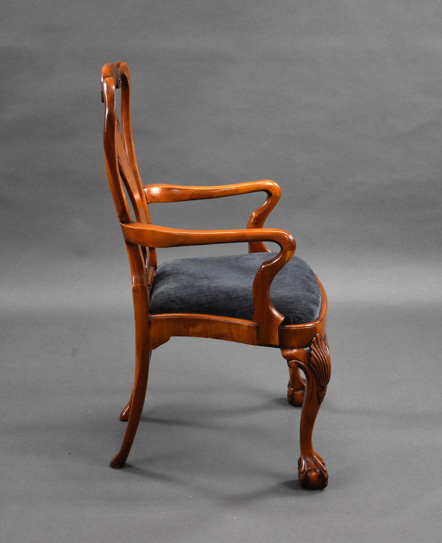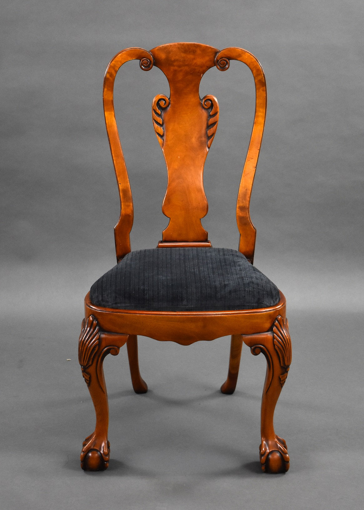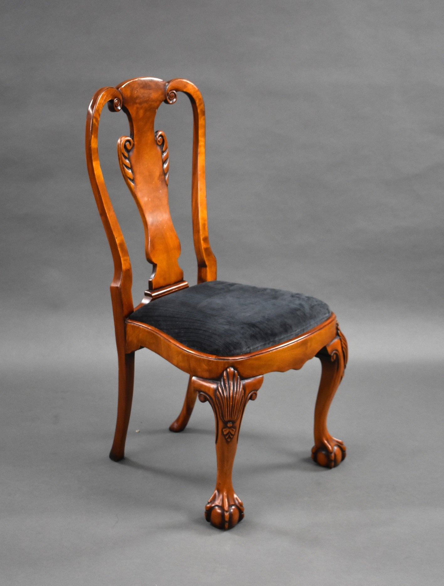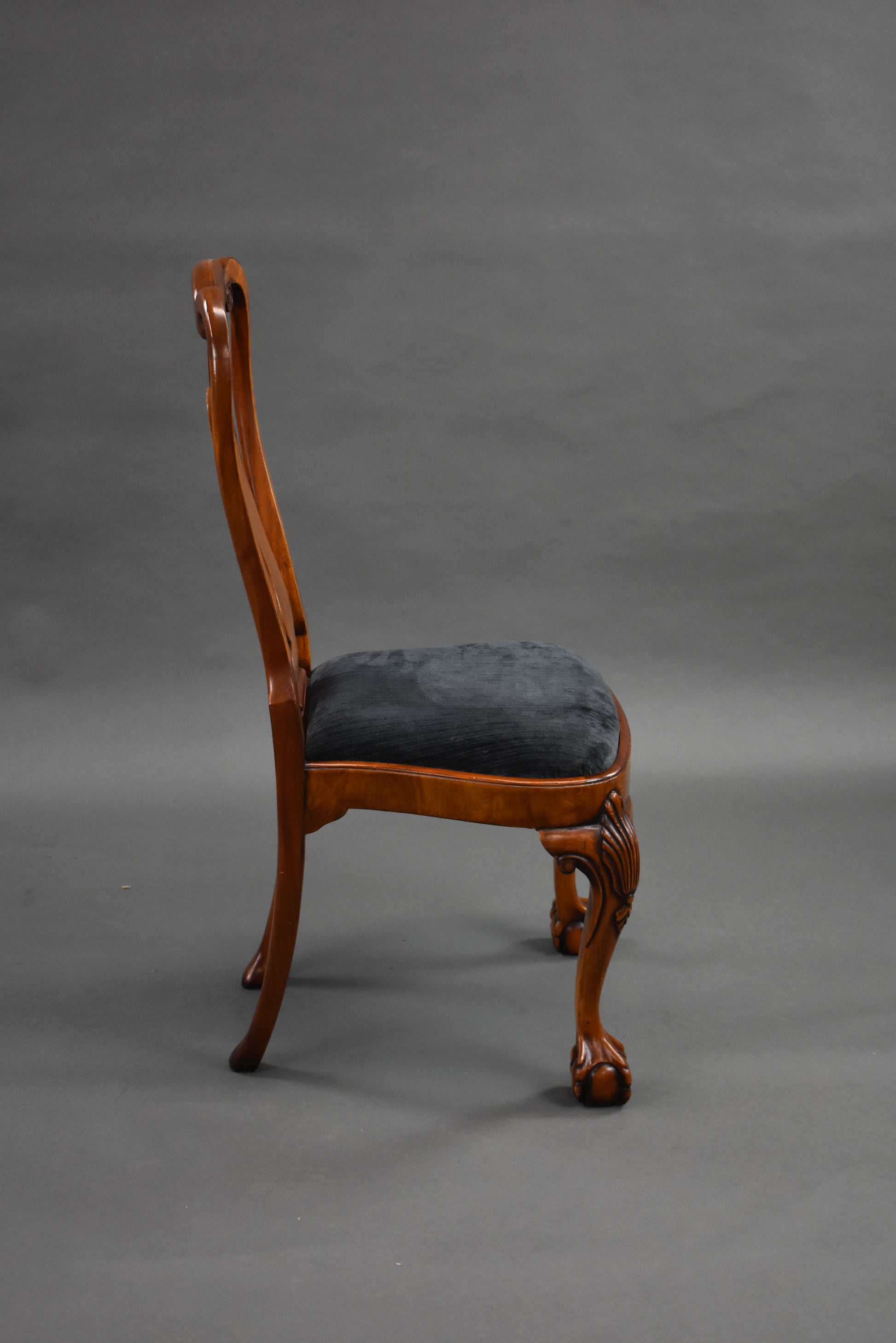 Set of ten George II style walnut dining chairs comprising of eight single chairs and two carvers with drop in seats, all upholstery in very good condition. The chairs have nicely shaped backs with carved shell on each cabriol leg terminating to claw and ball feet.
