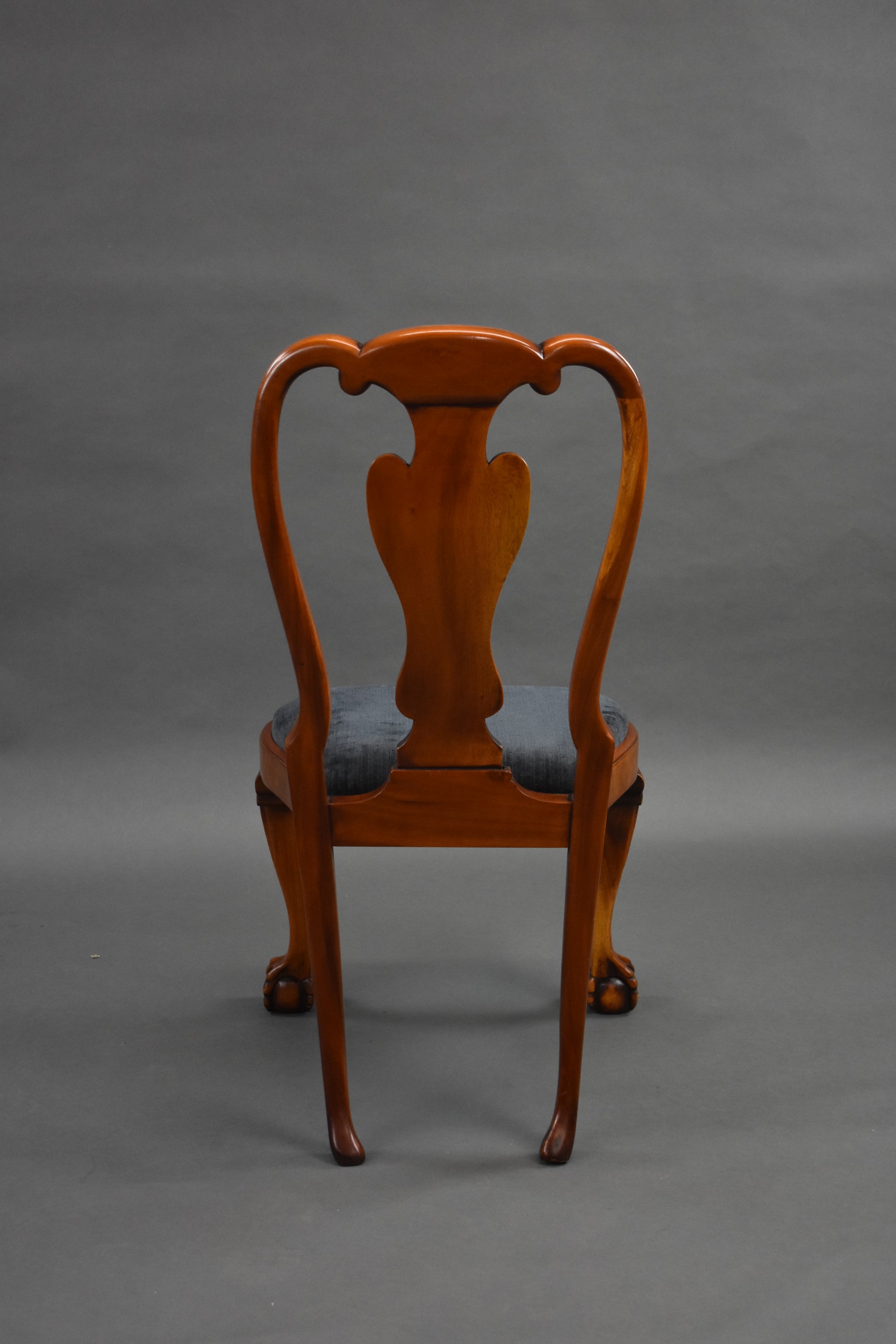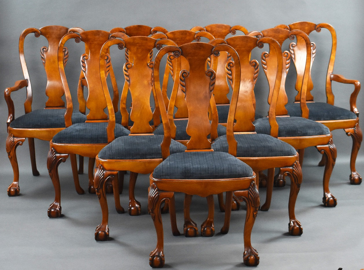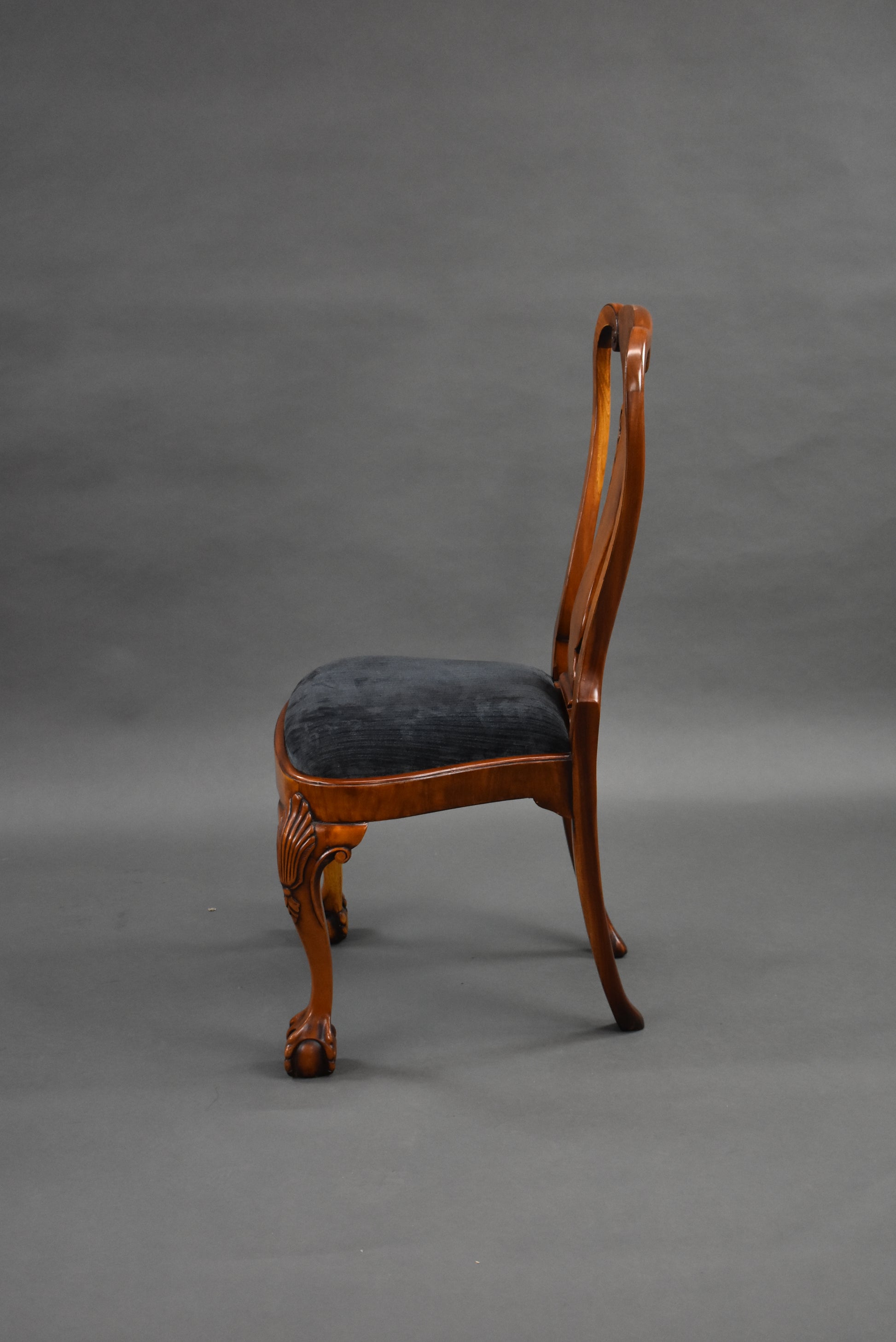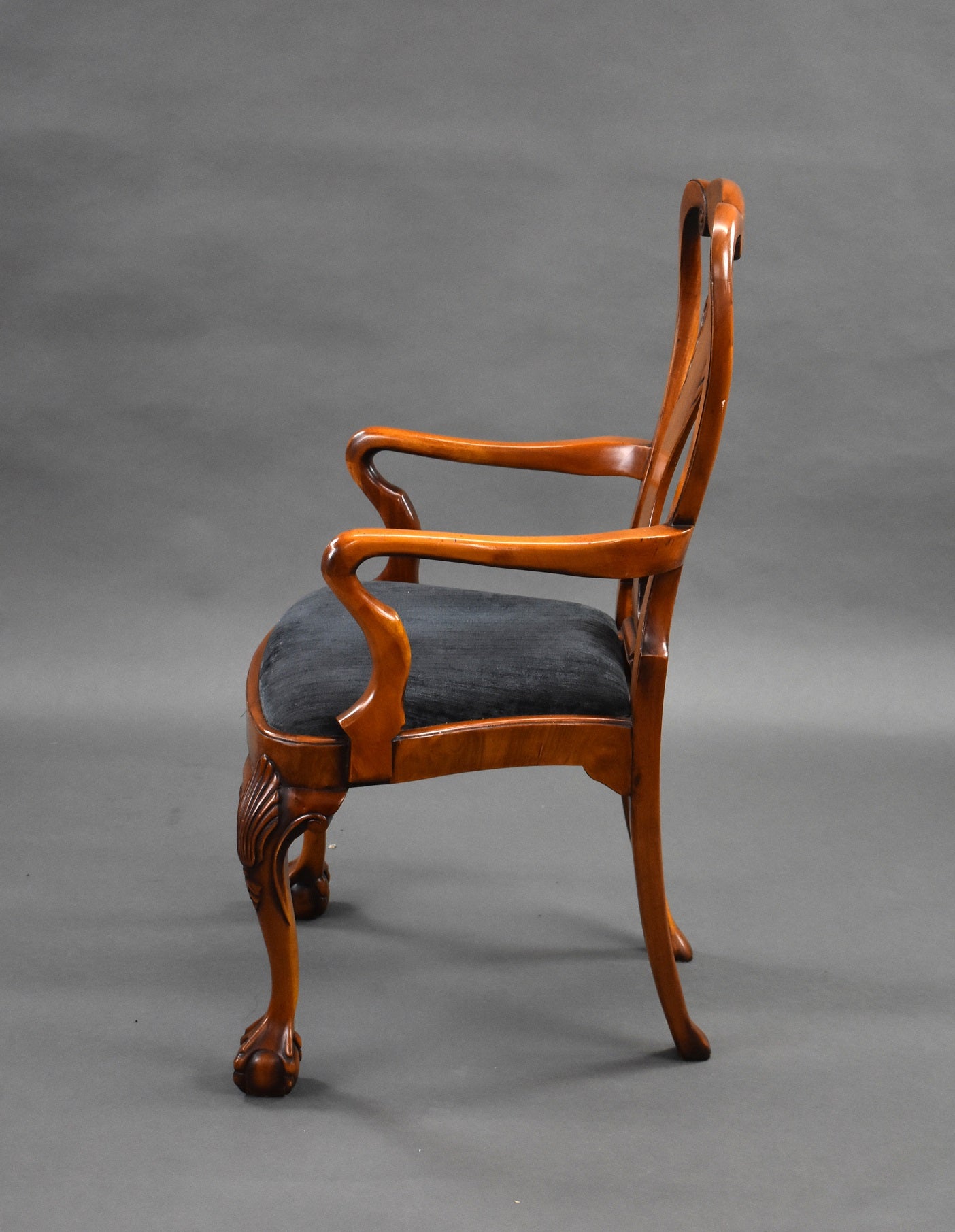 Set of ten George II style walnut dining chairs comprising of eight single chairs and two carvers with drop in seats, all upholstery in very good condition. The chairs have nicely shaped backs with carved shell on each cabriol leg terminating to claw and ball feet.