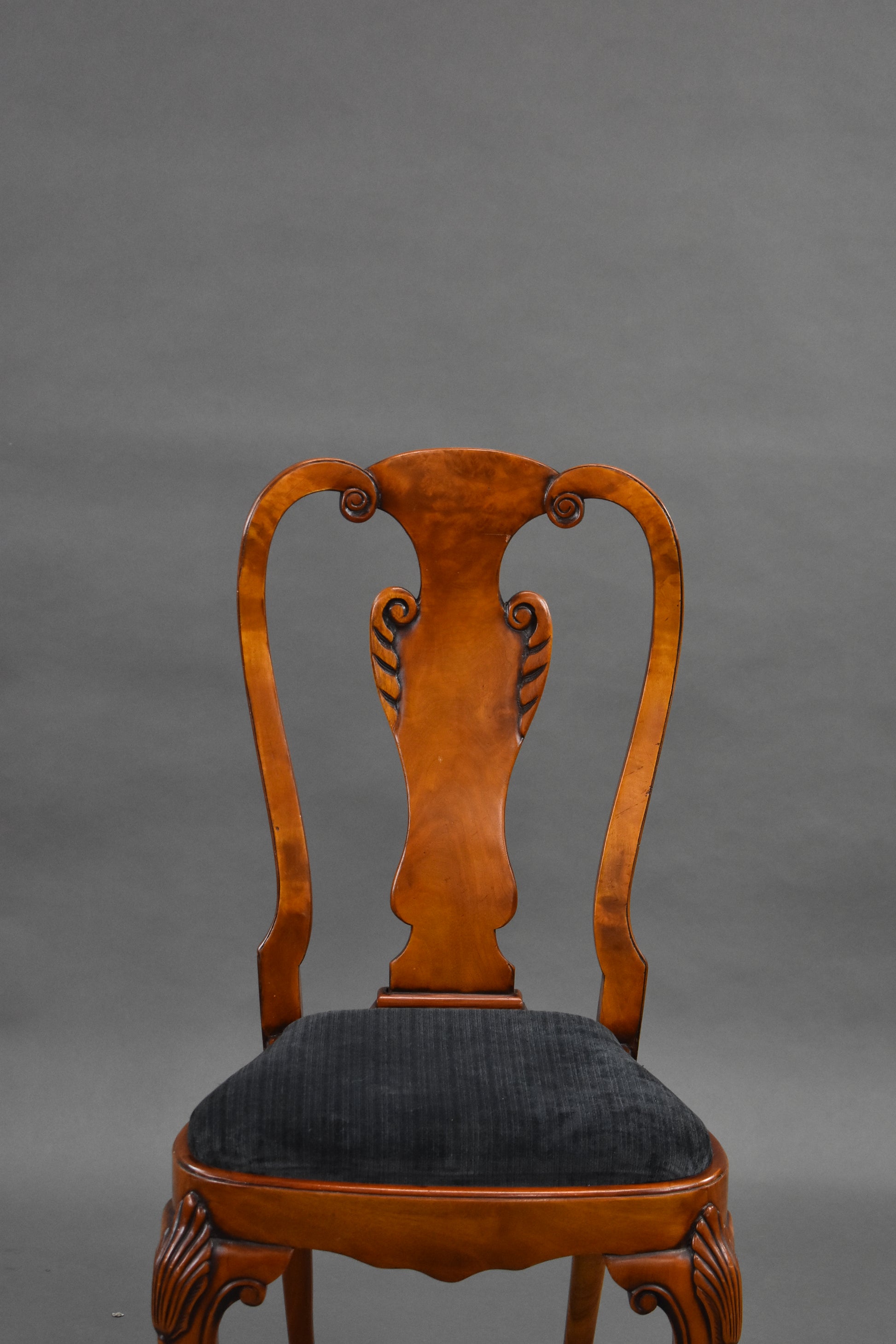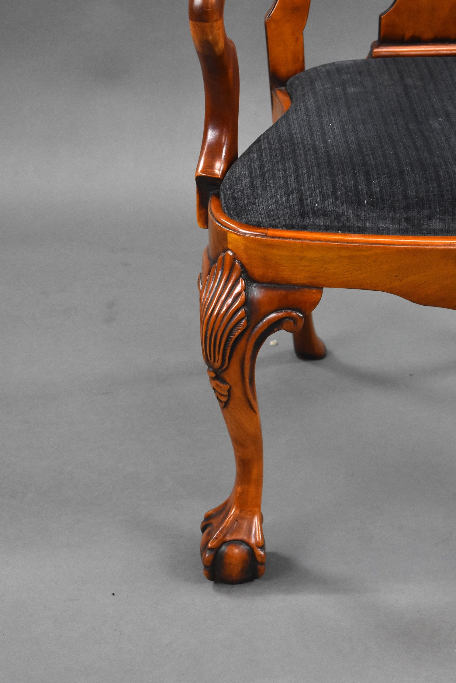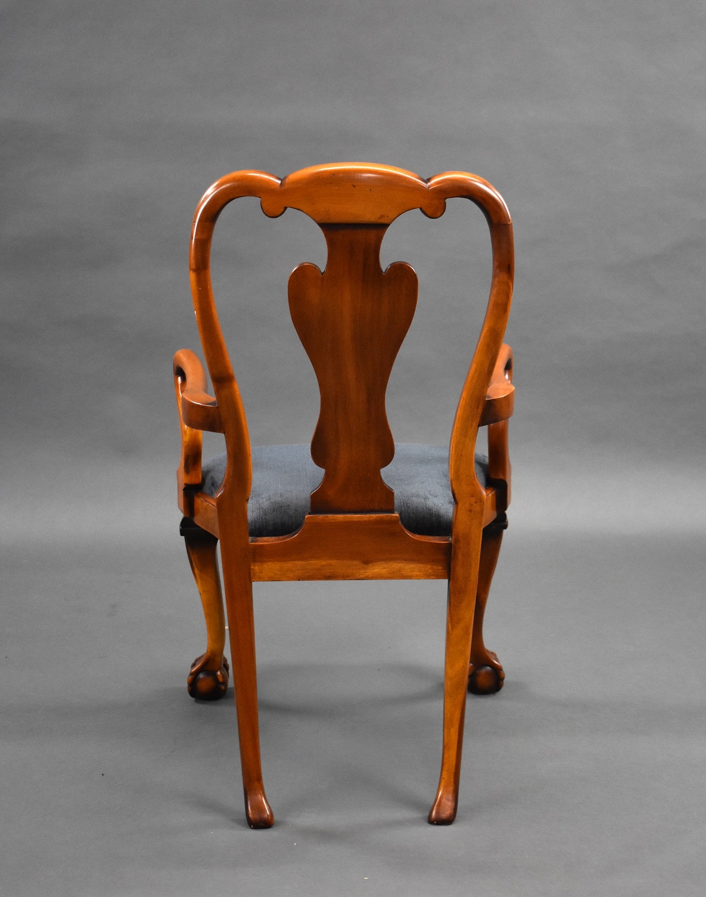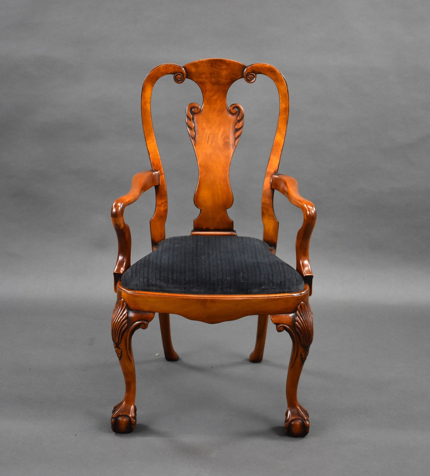 Set of ten George II style walnut dining chairs comprising of eight single chairs and two carvers with drop in seats, all upholstery in very good condition. The chairs have nicely shaped backs with carved shell on each cabriol leg terminating to claw and ball feet.