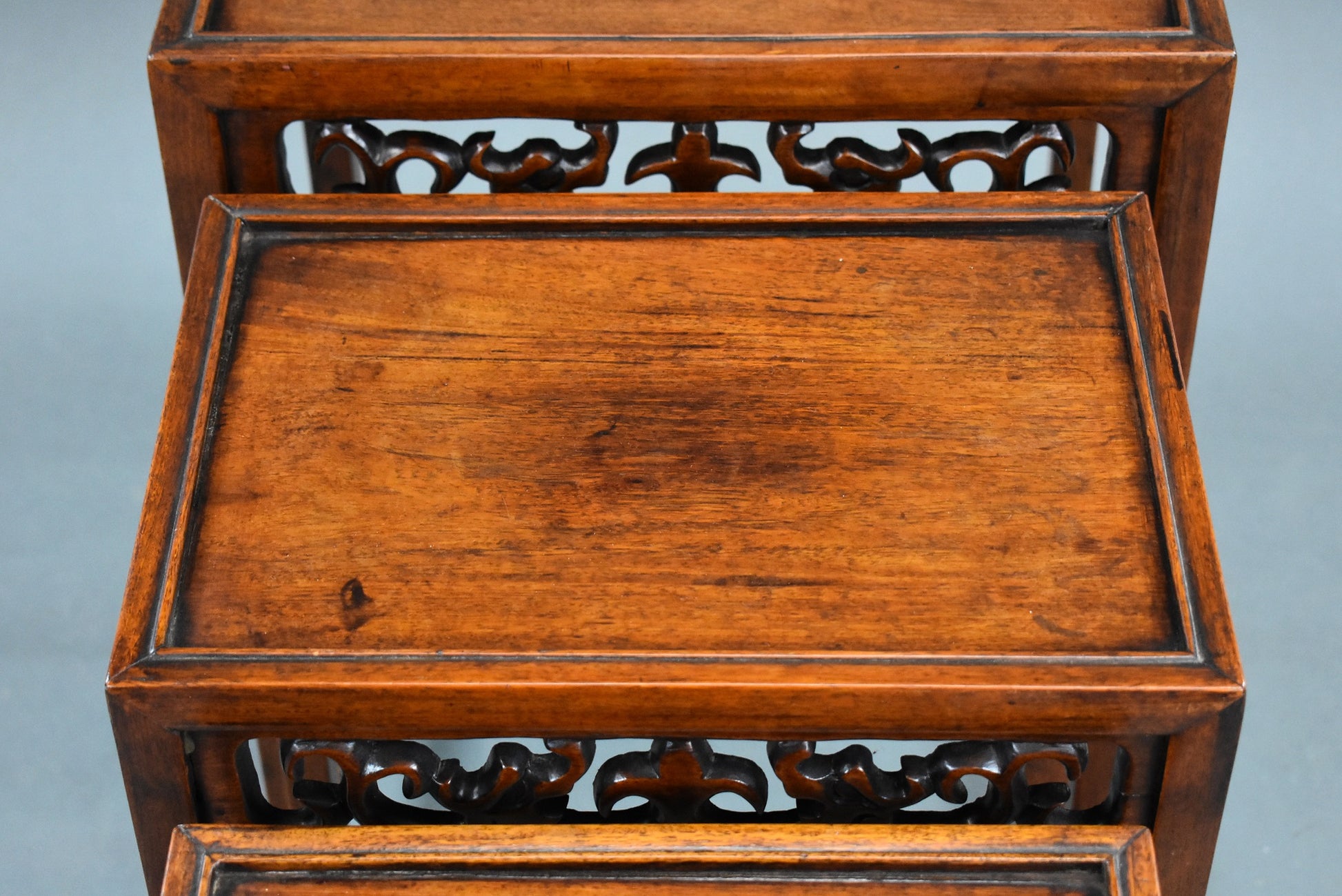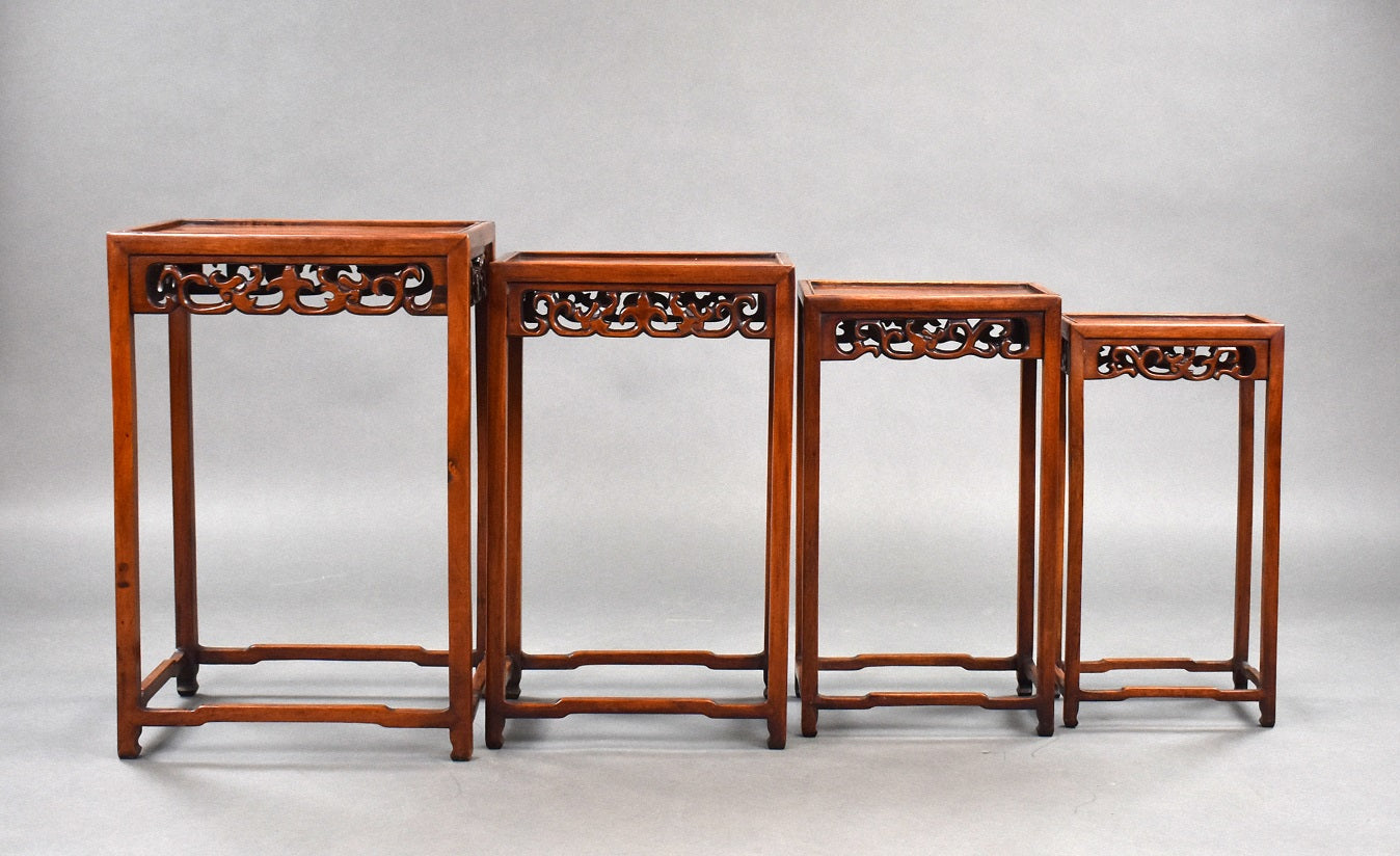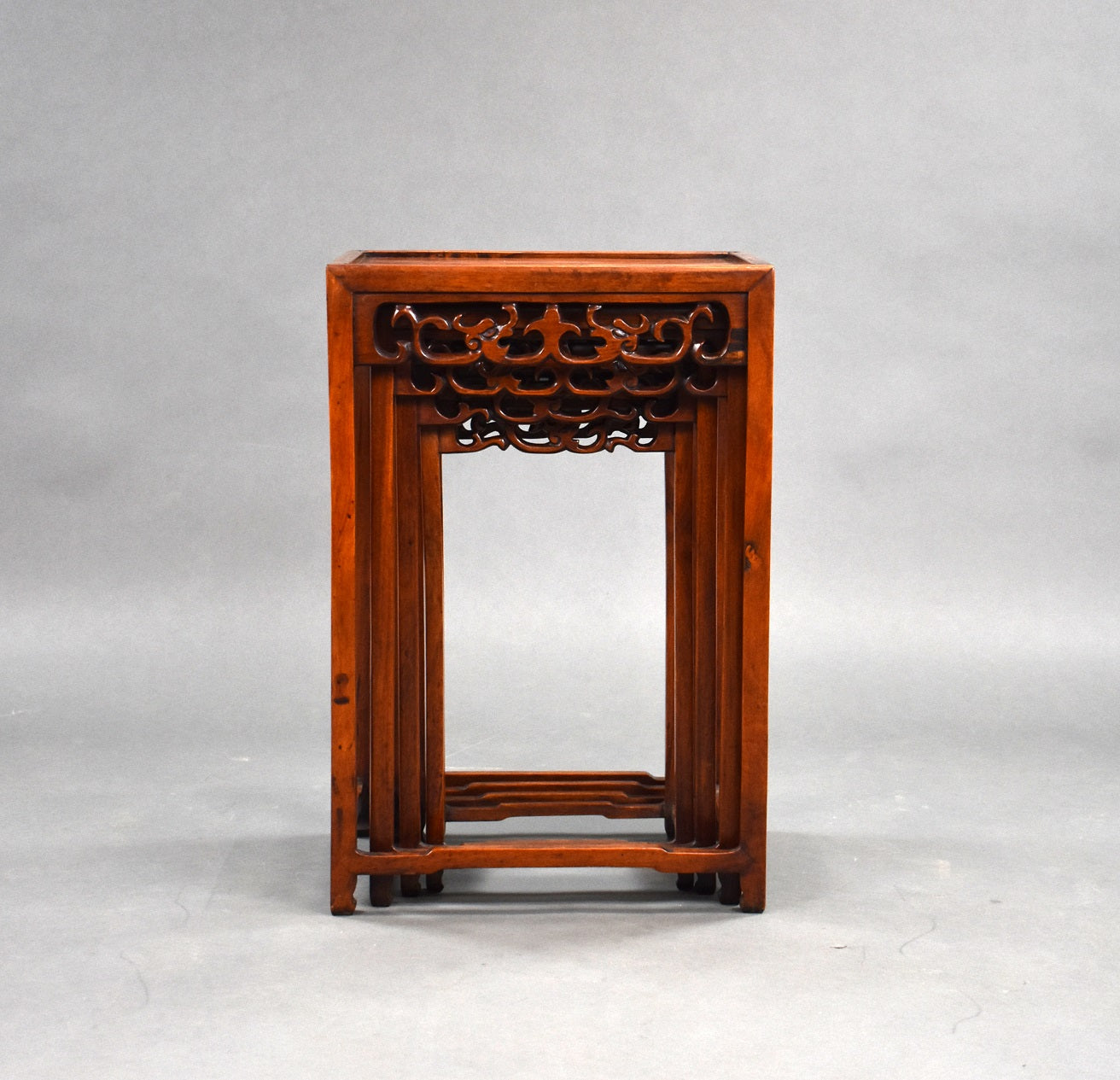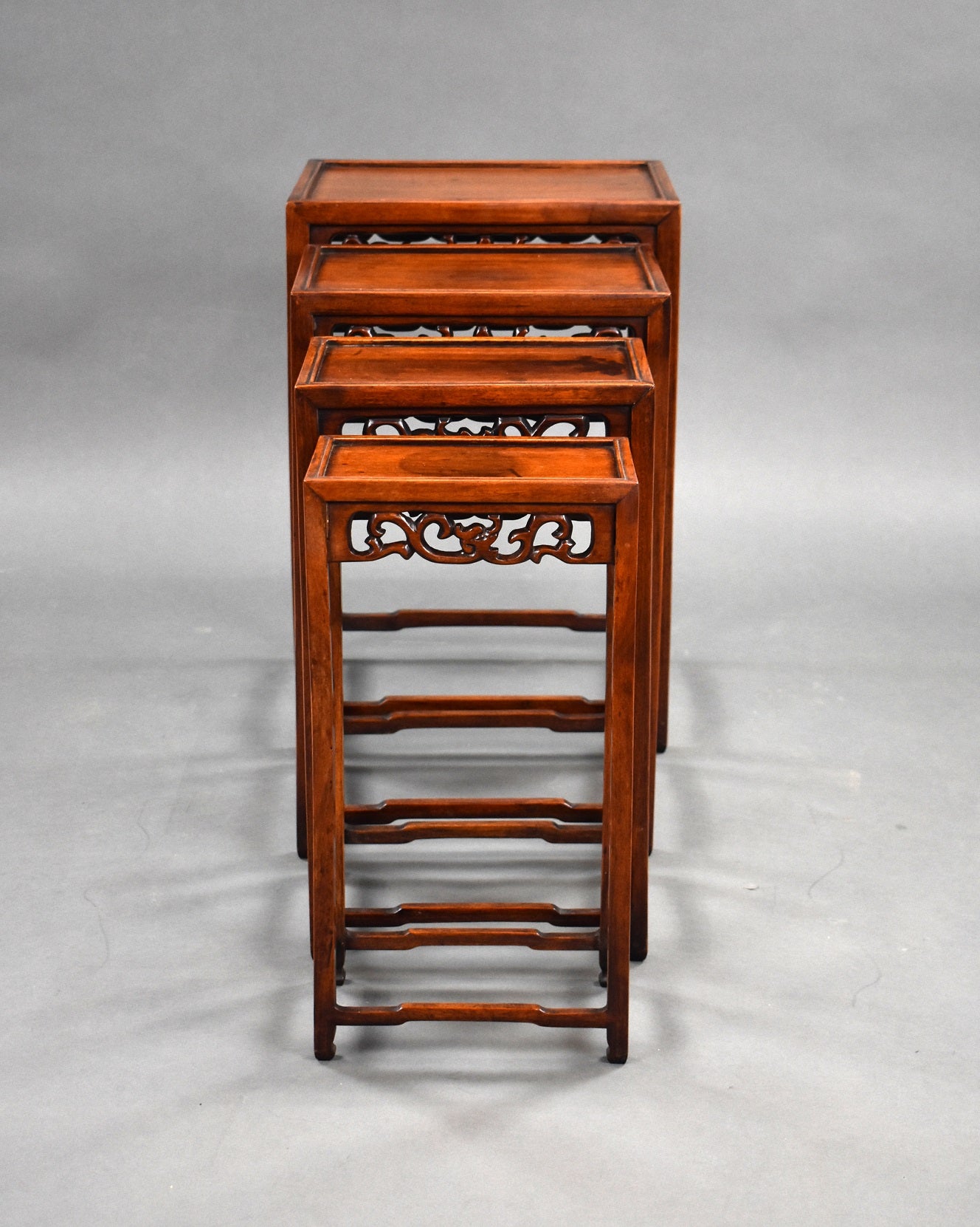 Set of four late 19th Century (c.1890) Chinese antique graduated hardwood nest tables in good condition with intricate carvings to the front and sides.