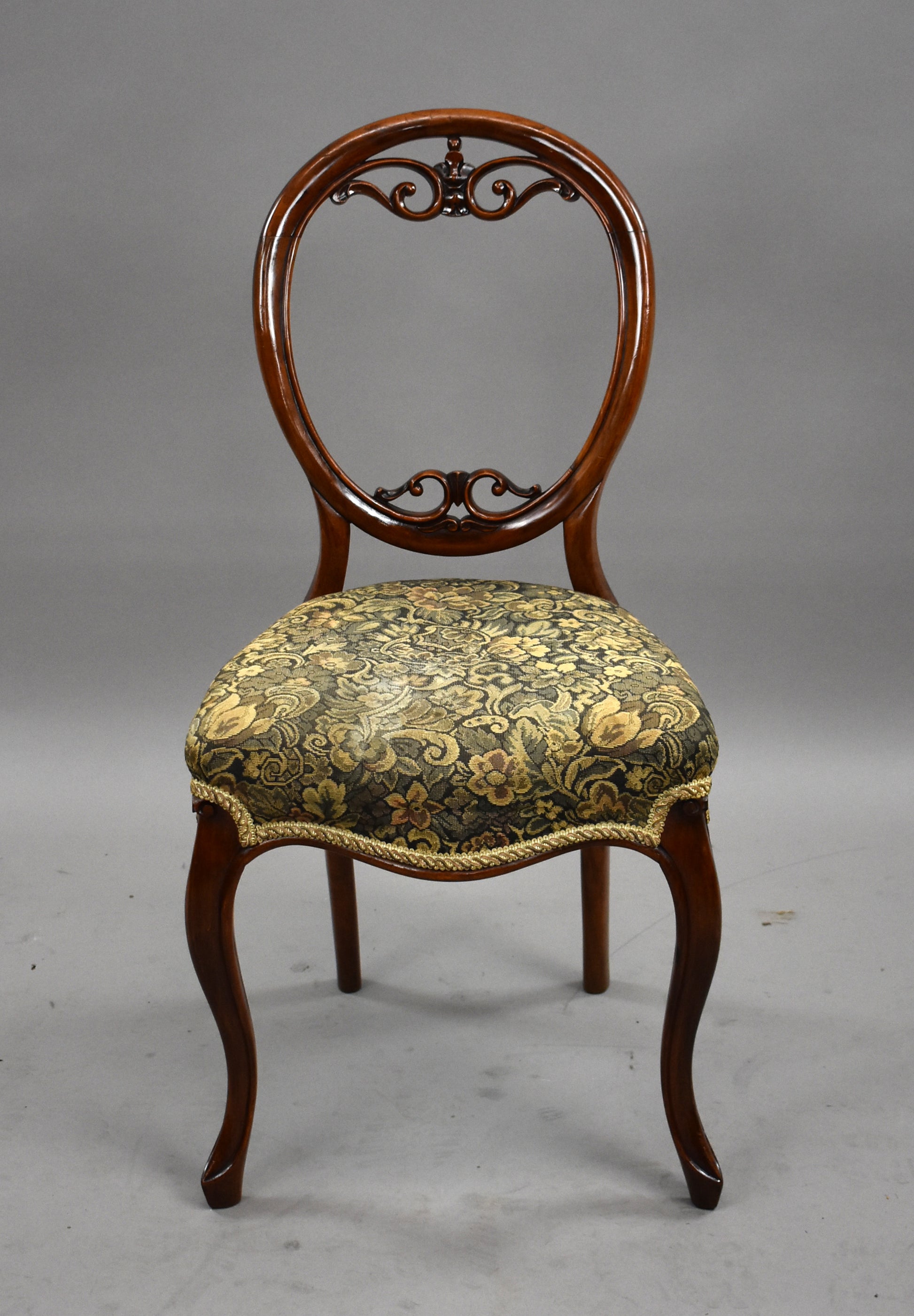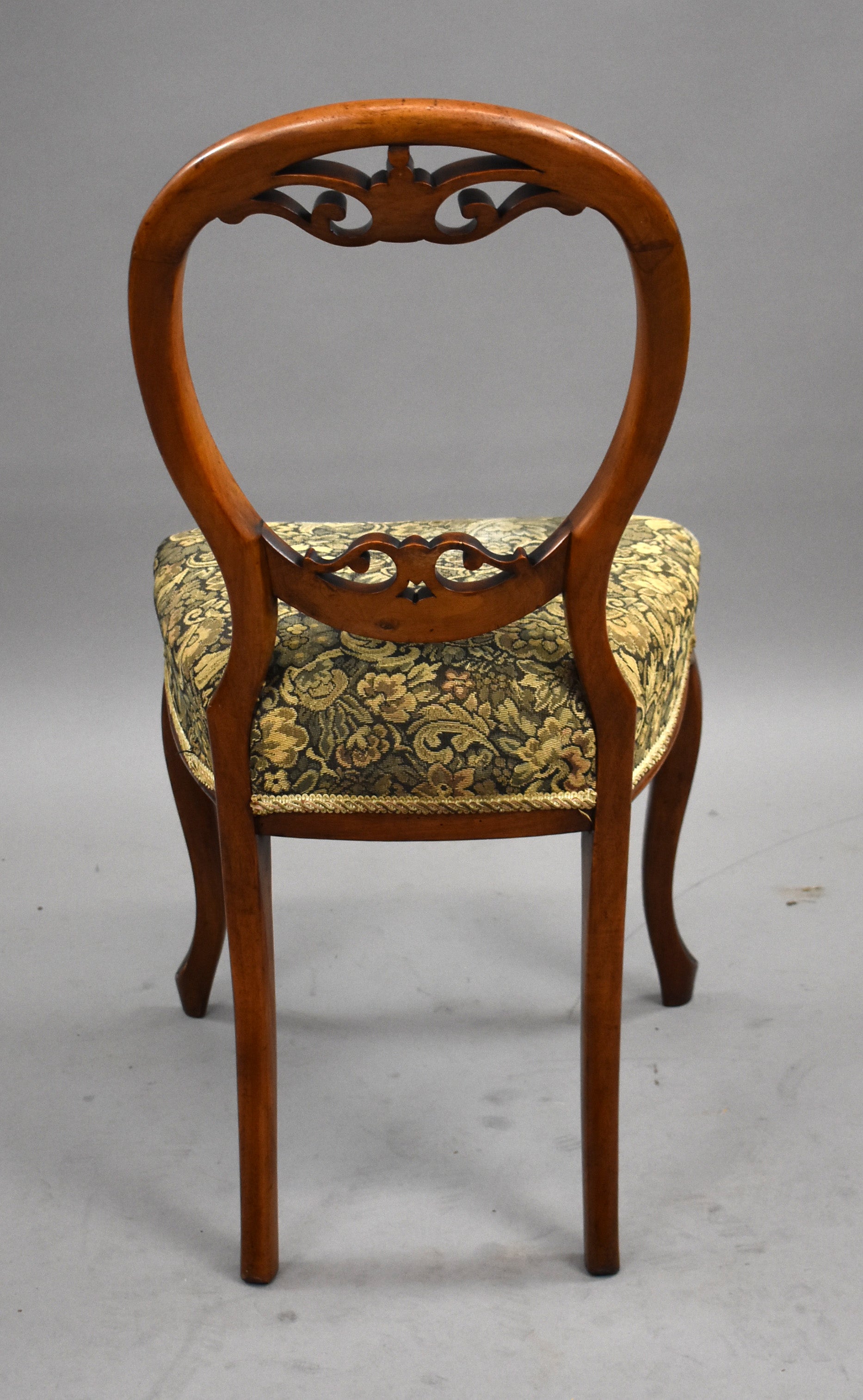 Set of four Victorian dining chairs. Crafted from rich walnut wood, each chair features a distinctive balloon-back design with ornate carved scrollwork, an iconic hallmark of the period.