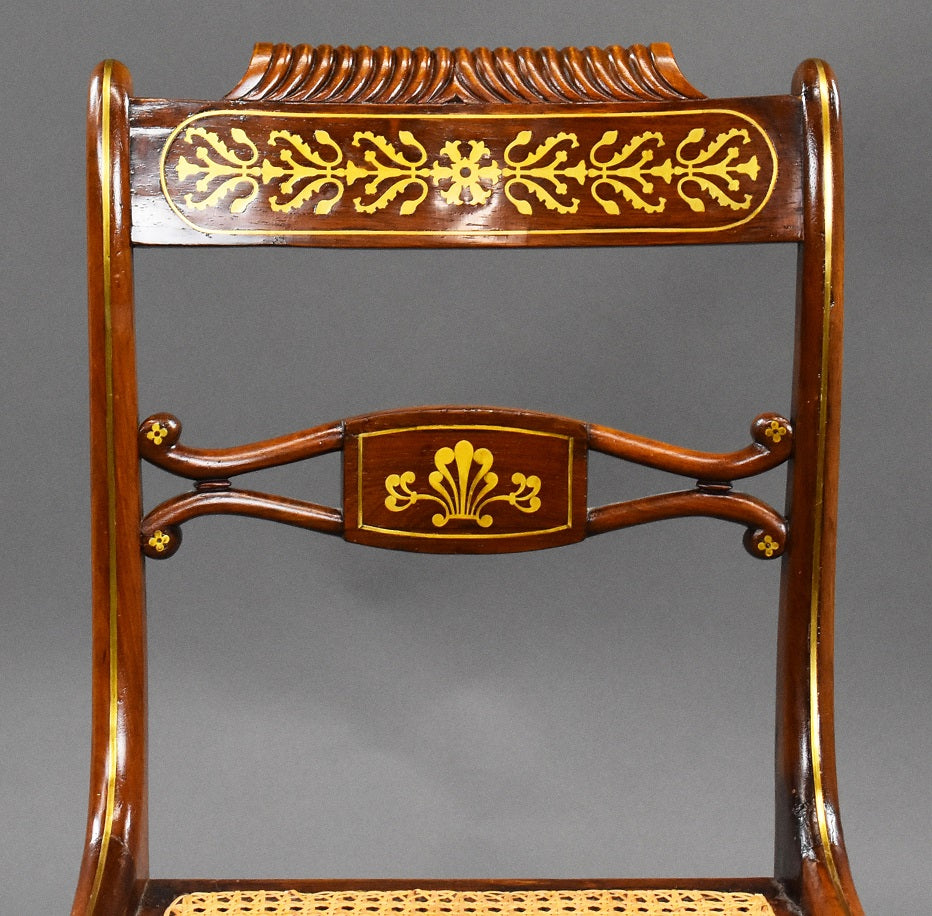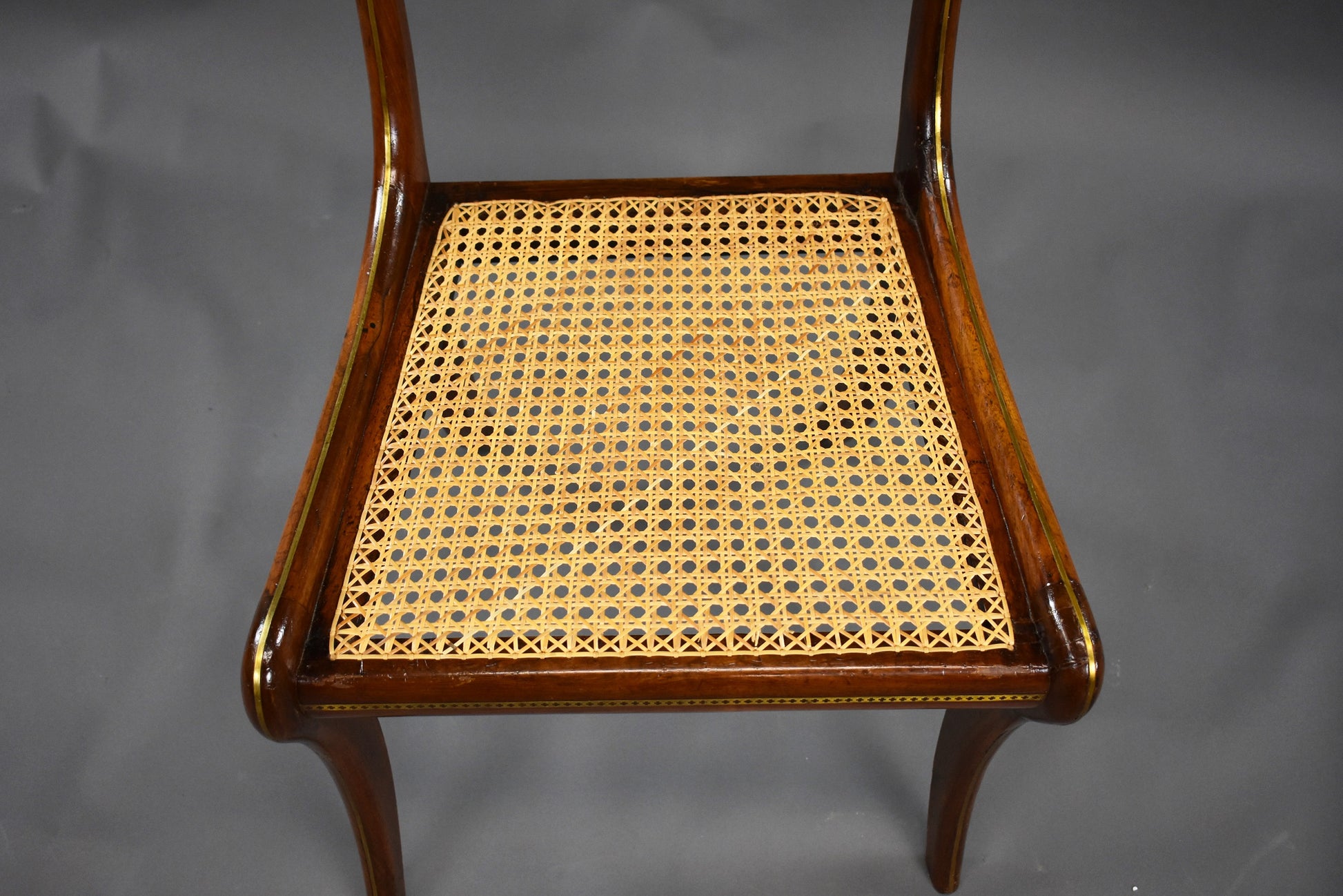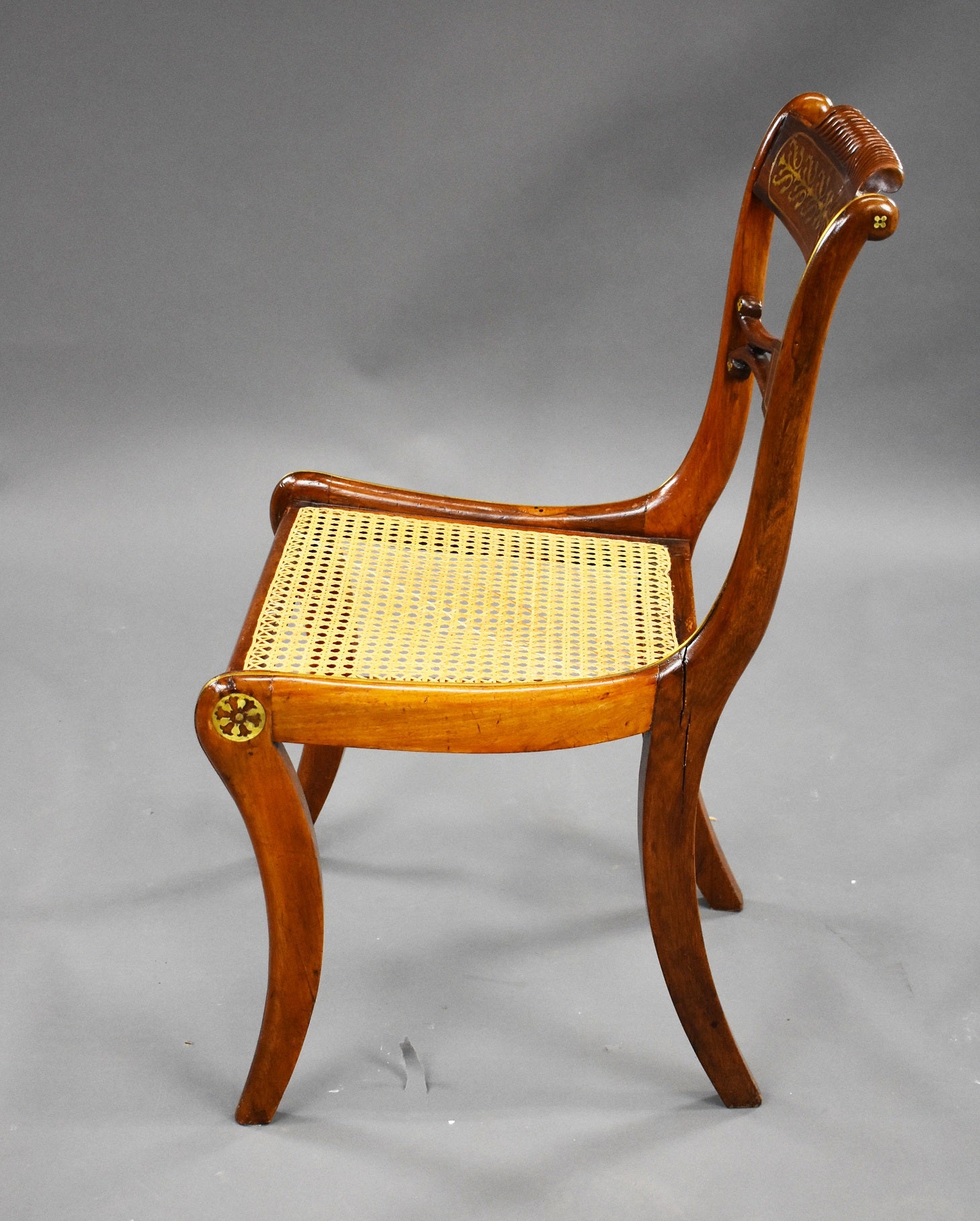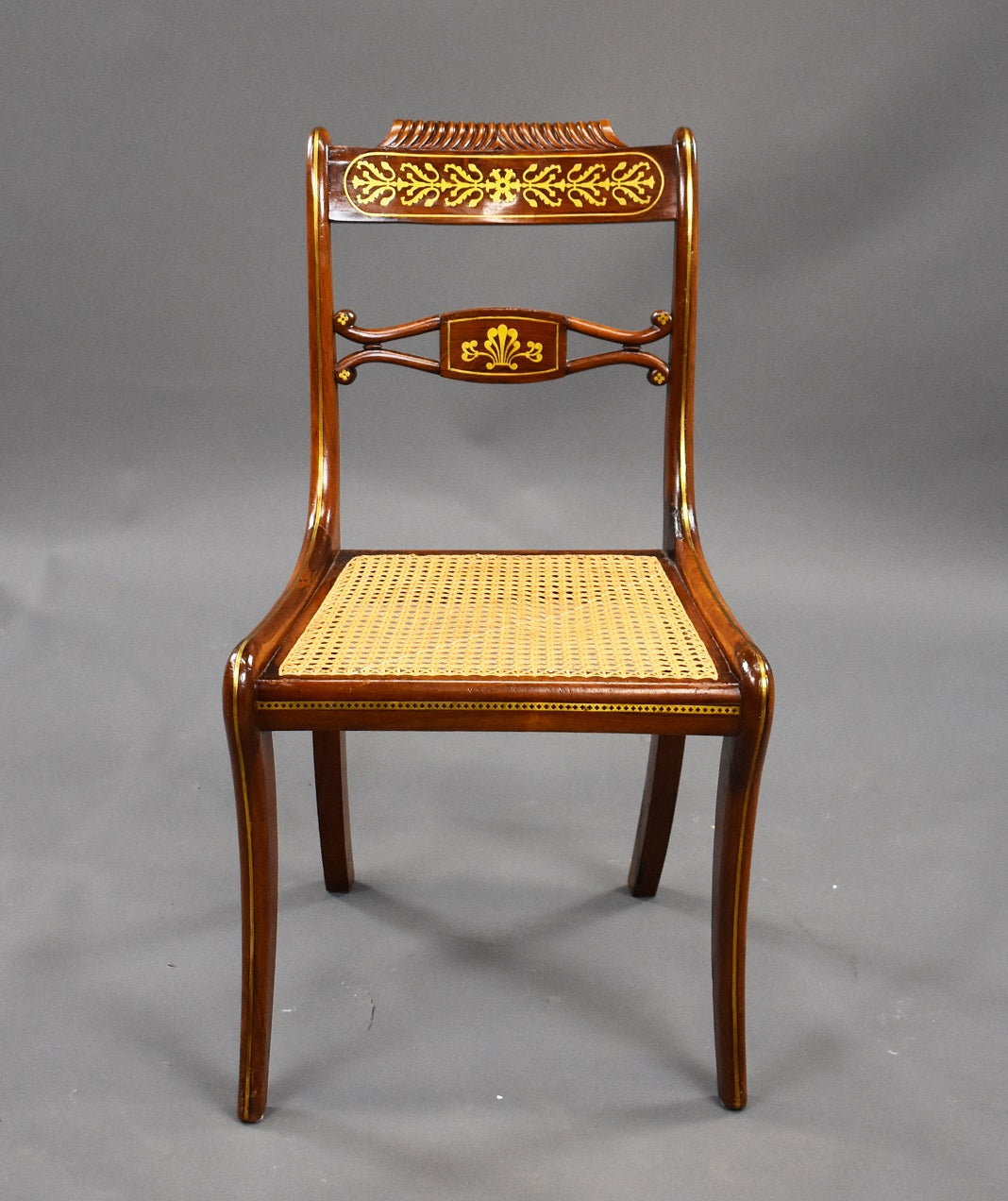 Set of six early 19th Century Georgian / Regency antique brass inlaid rosewood dining chairs with brass inlay to the back, sides and front with caned seats and raised on sabre legs.