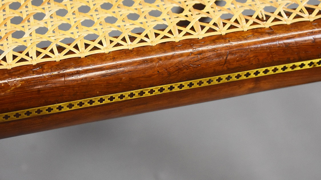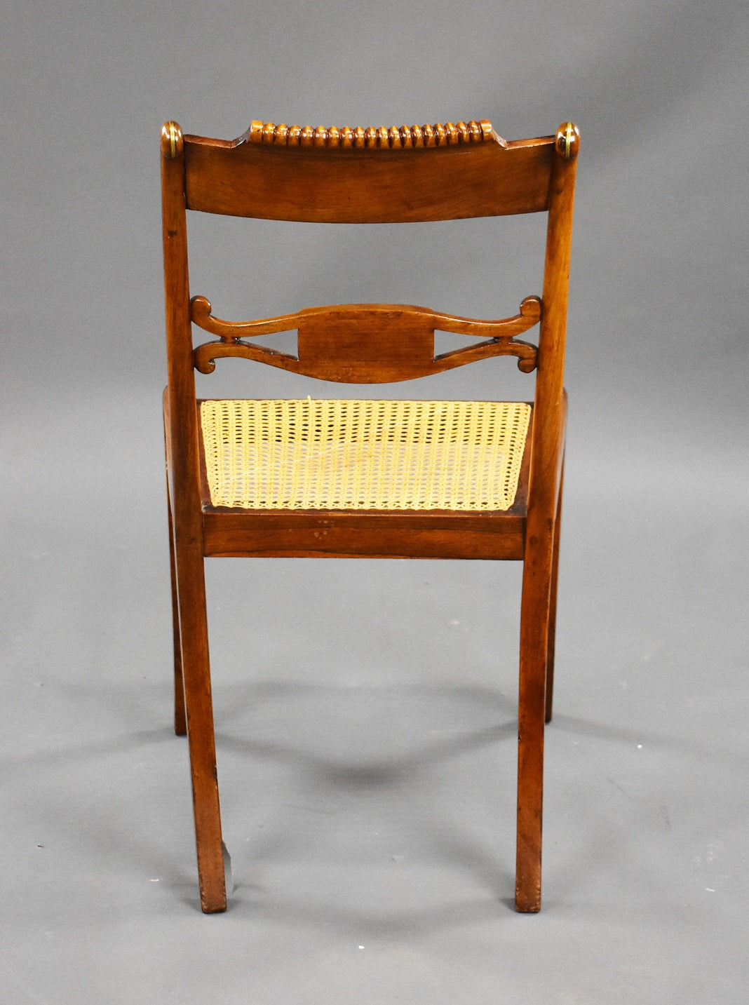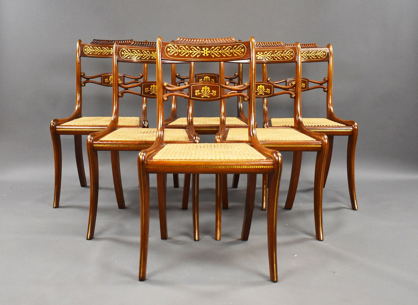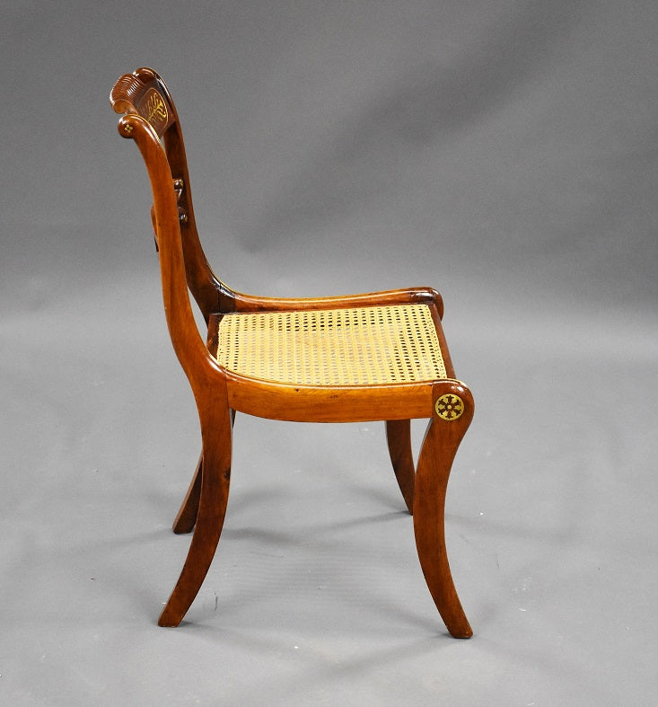 Set of six early 19th Century Georgian / Regency antique brass inlaid rosewood dining chairs with brass inlay to the back, sides and front with caned seats and raised on sabre legs.